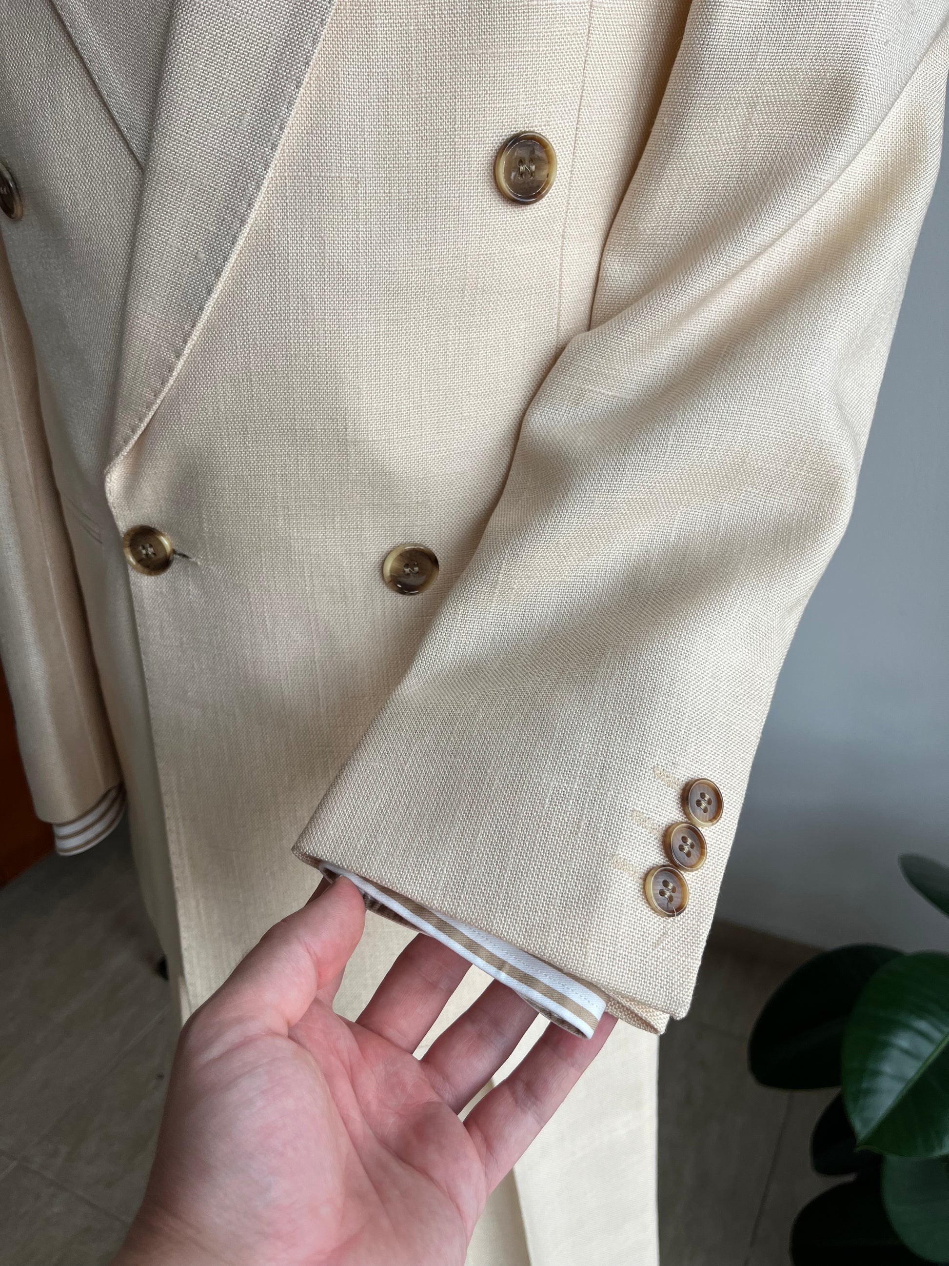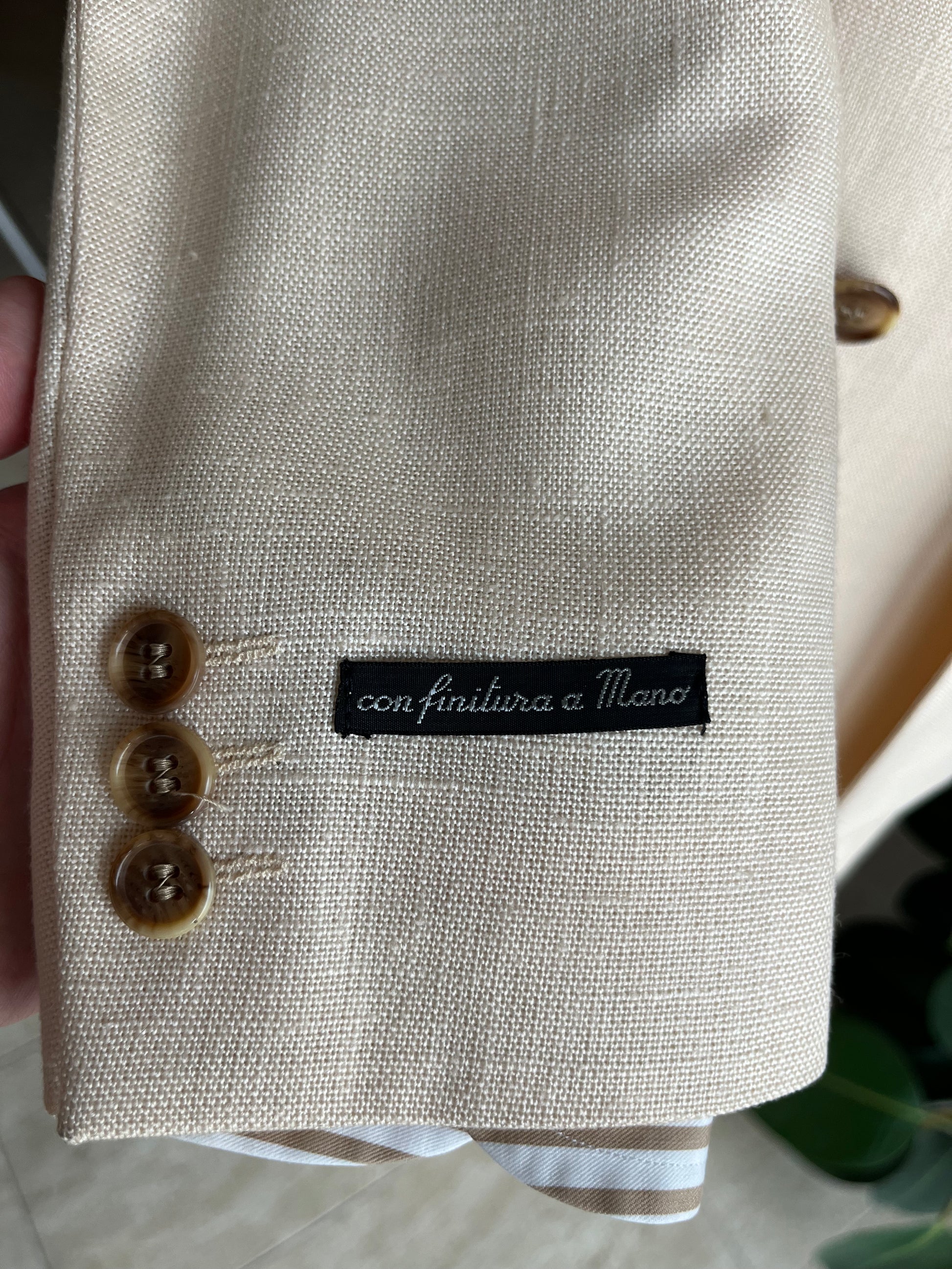 La giacca è un doppiopetto, con abbottonatura 4x1, baveri a dente, tasche a filetto e nessuno spacco sul retro. La giacca, inoltre, è sfoderata quindi ideale per l’estate.