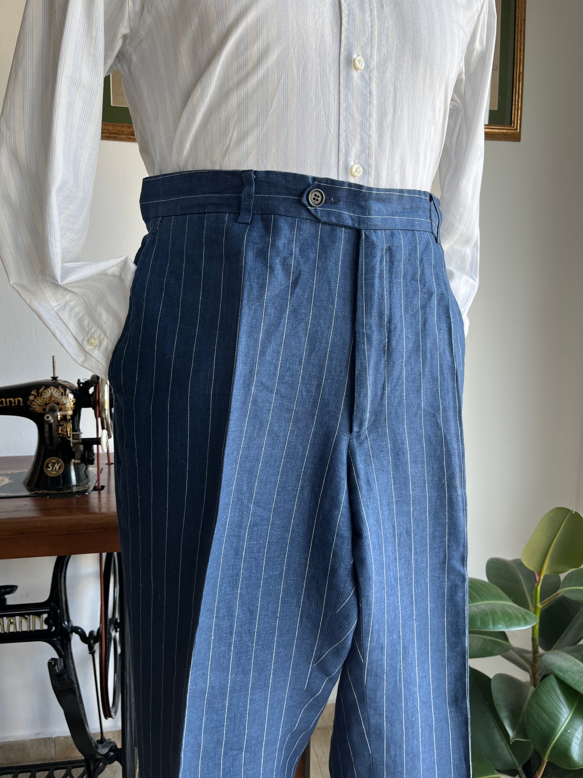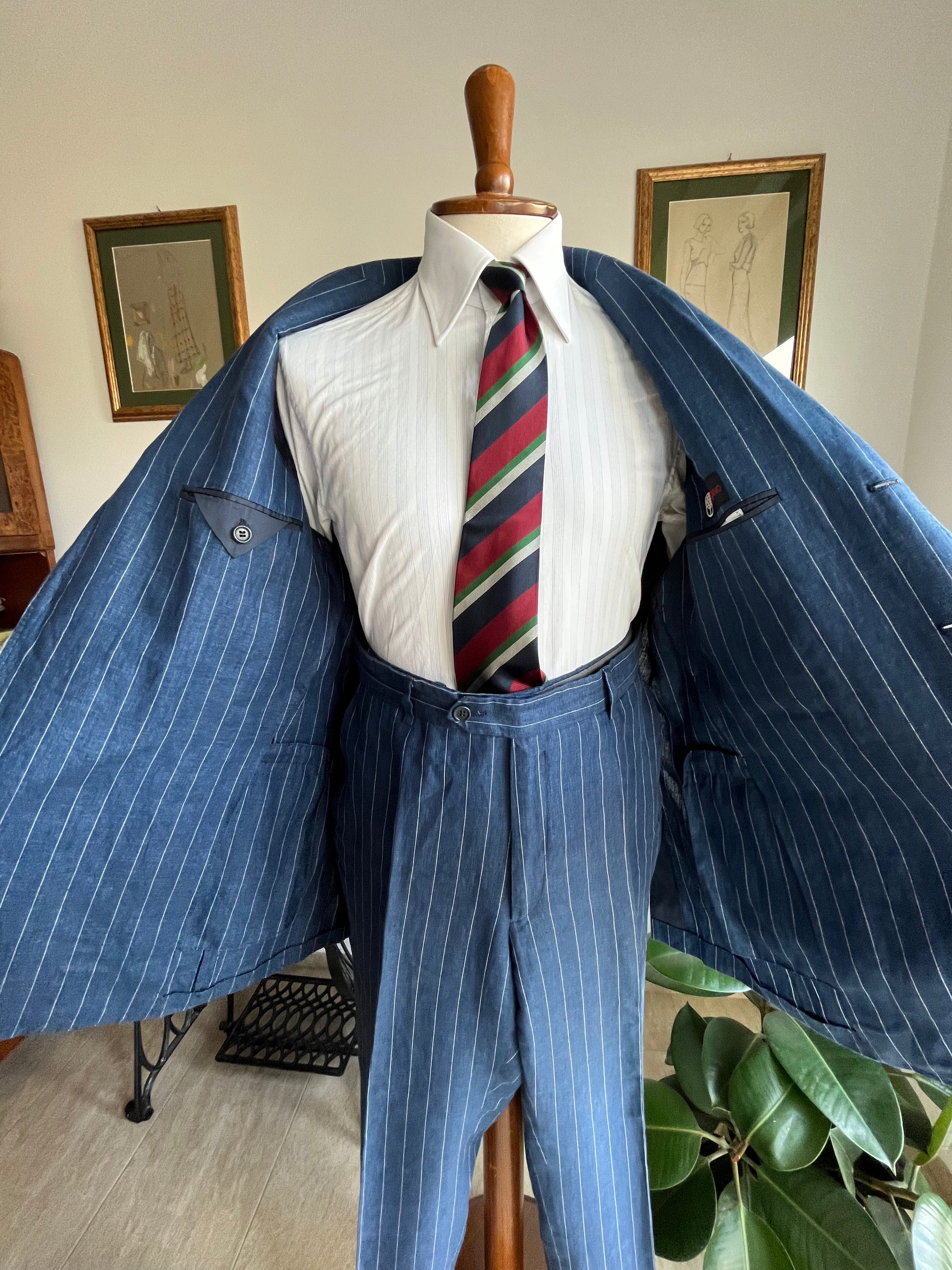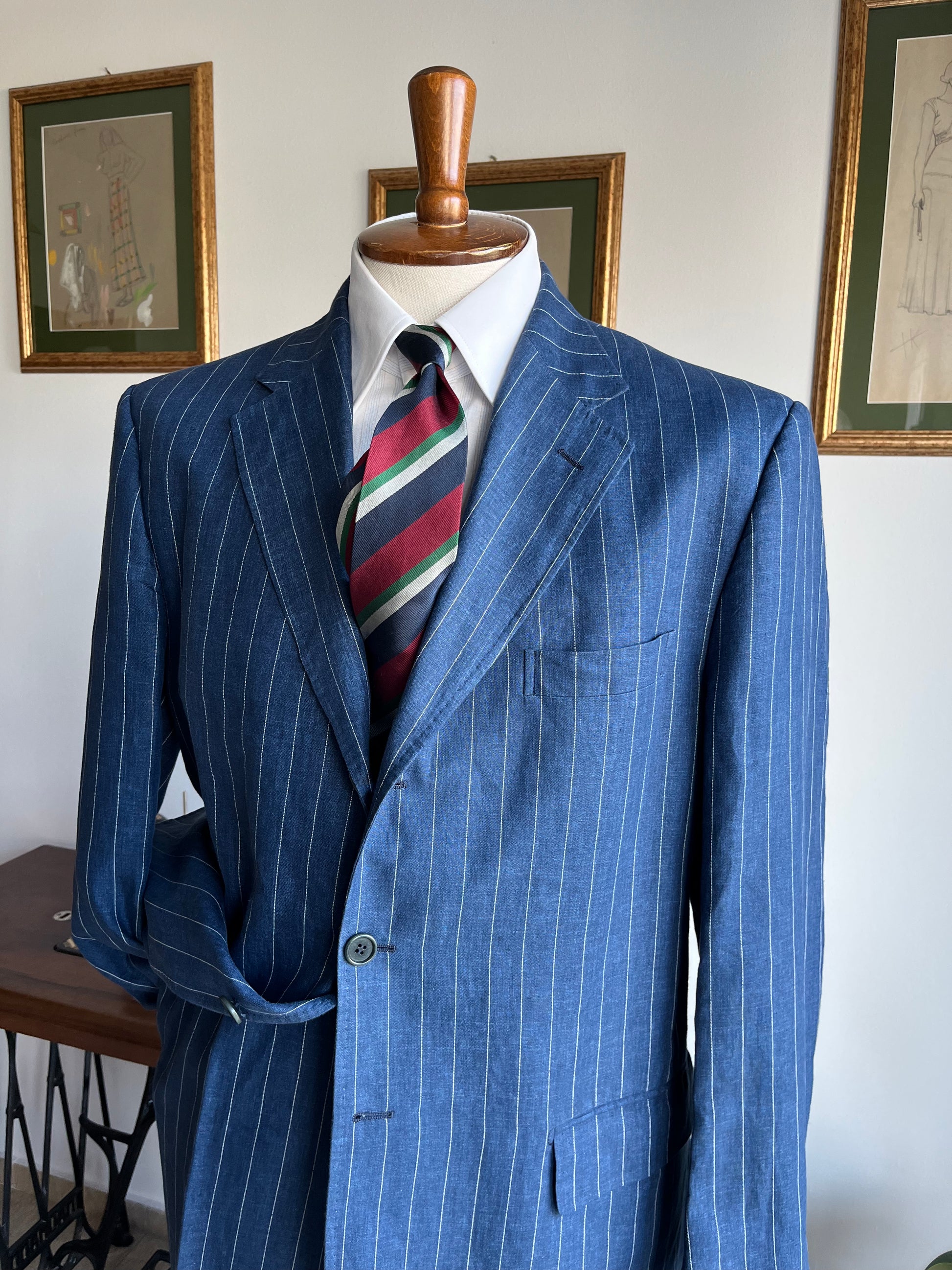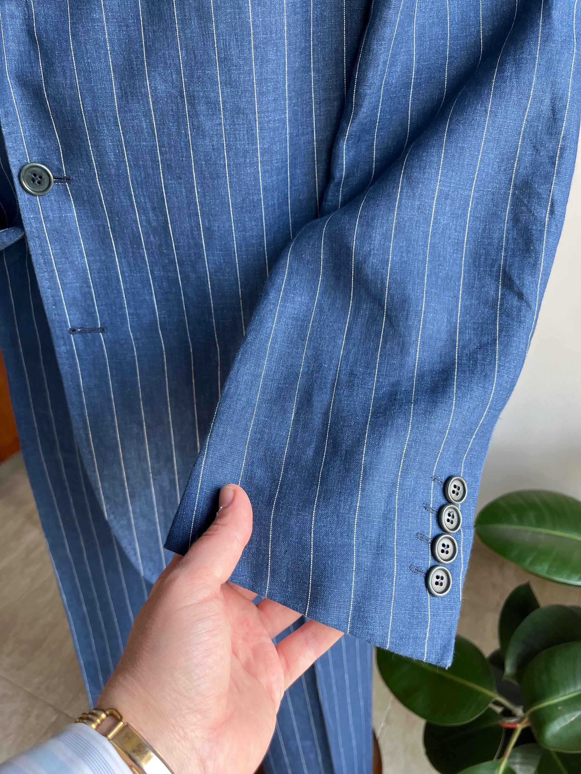 Il tessuto è 100% puro lino di colore blu gessato di bianco.