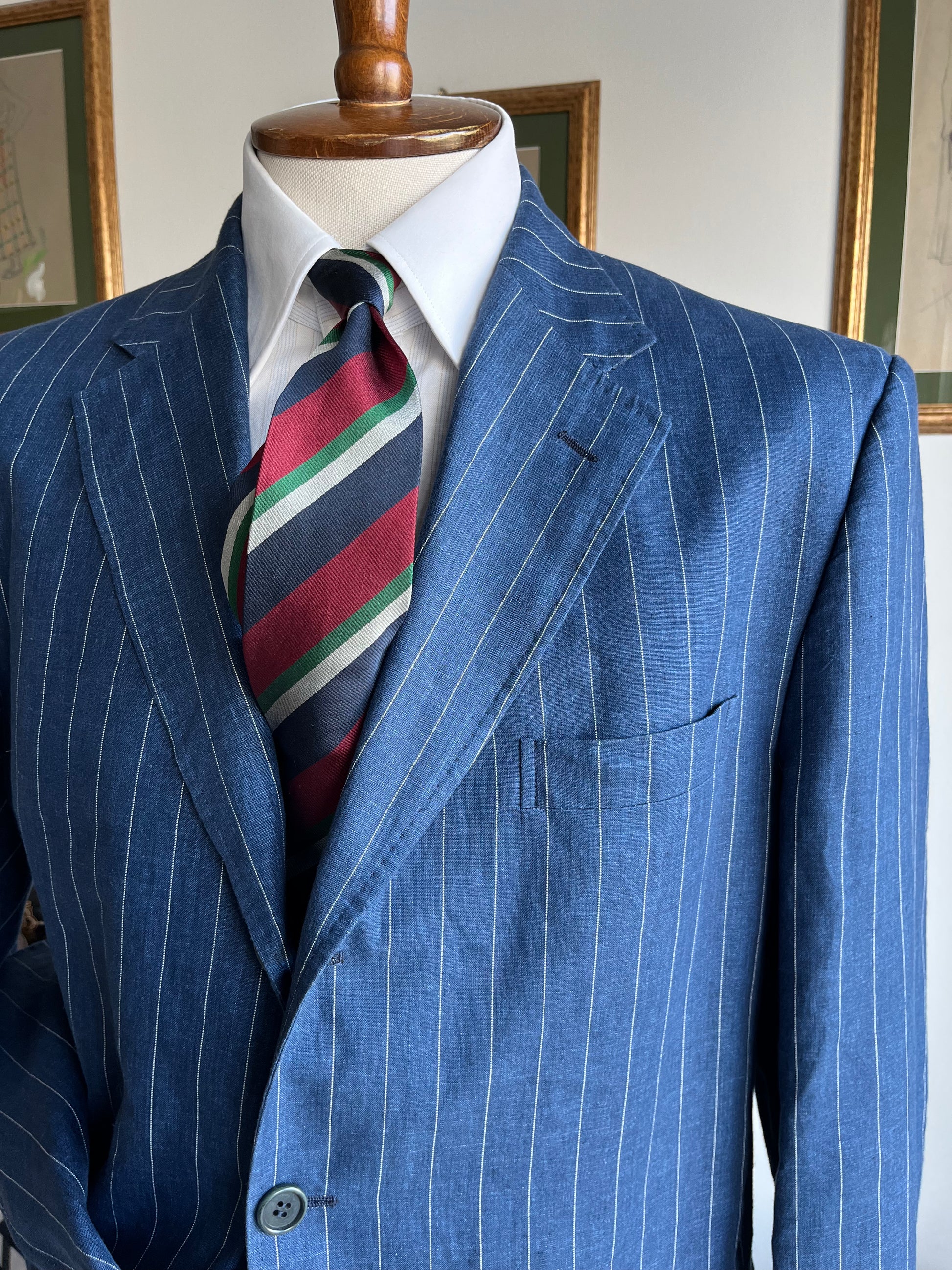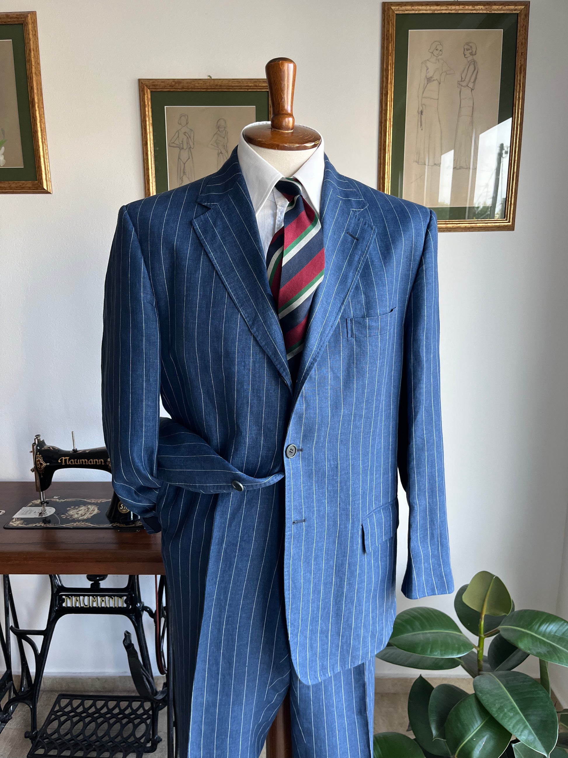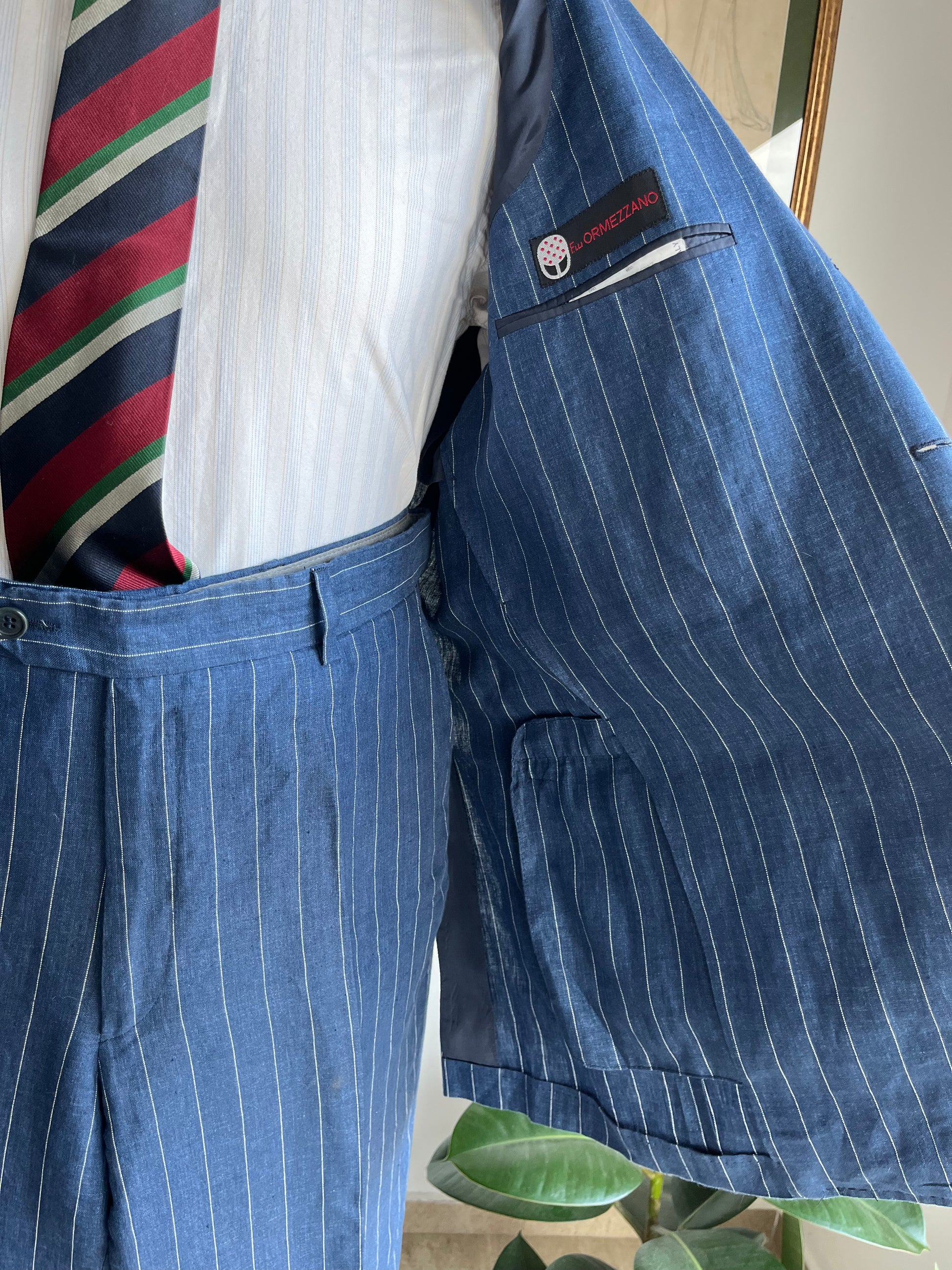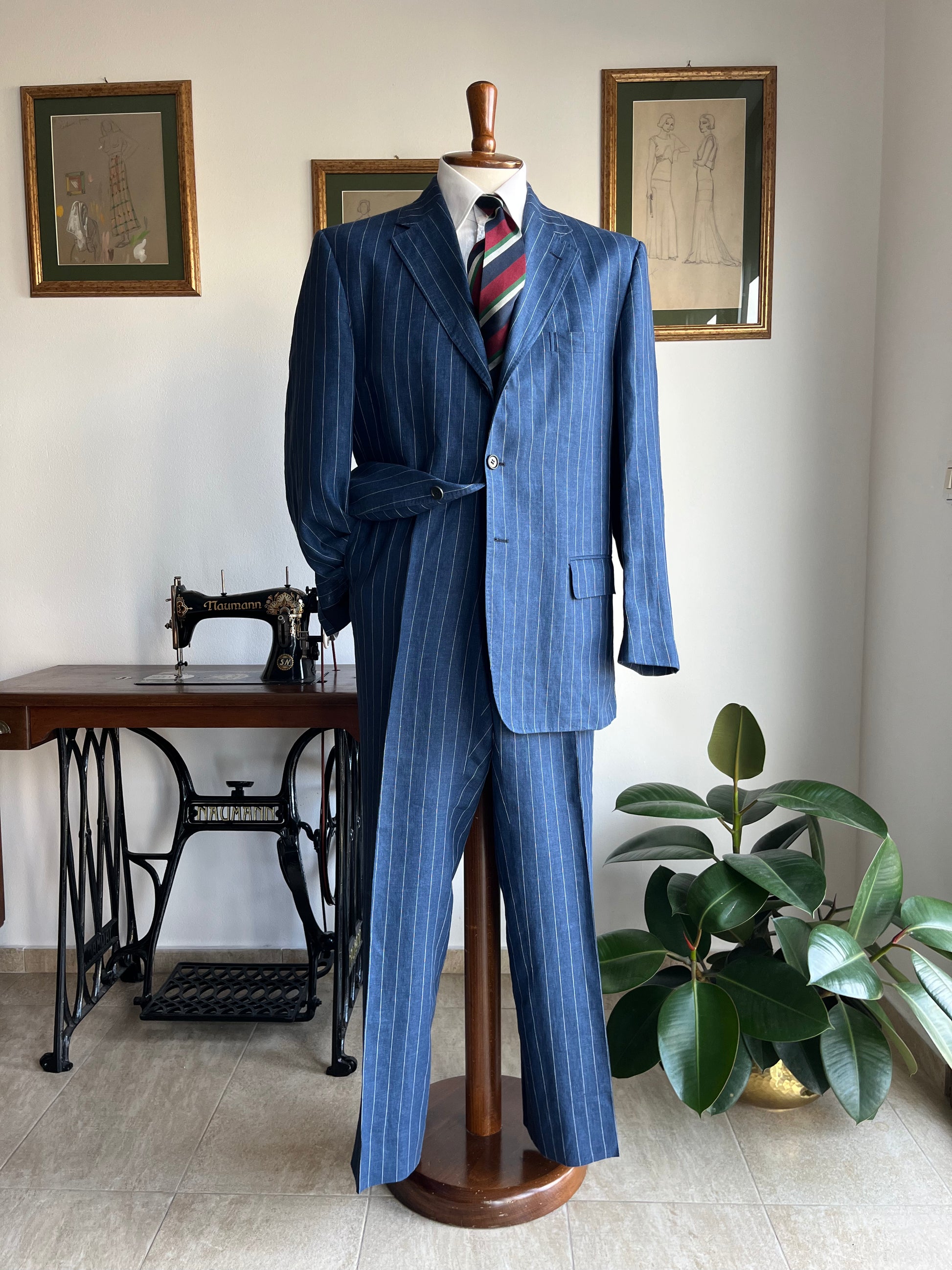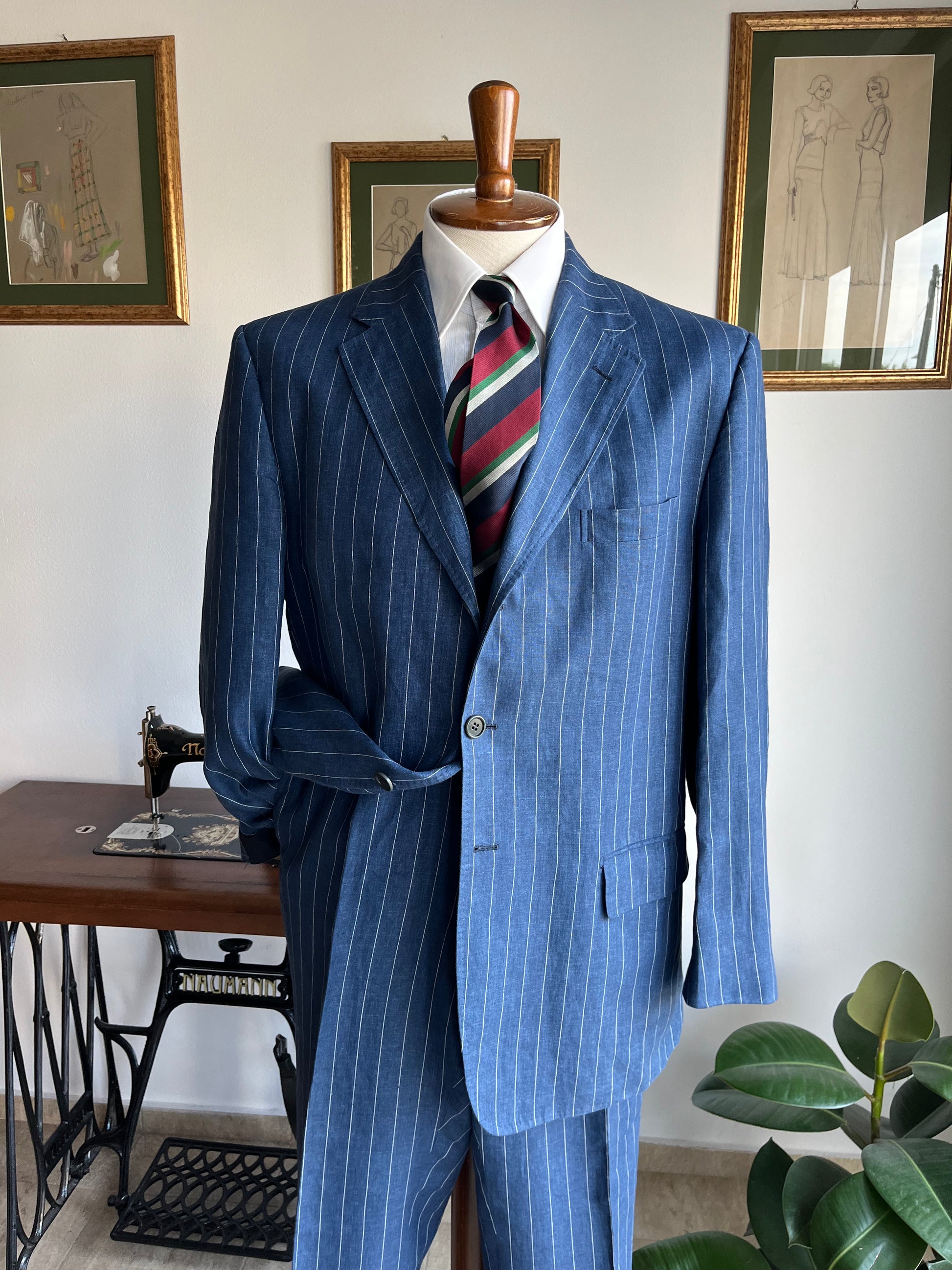 Il tessuto è 100% puro lino di colore blu gessato di bianco.