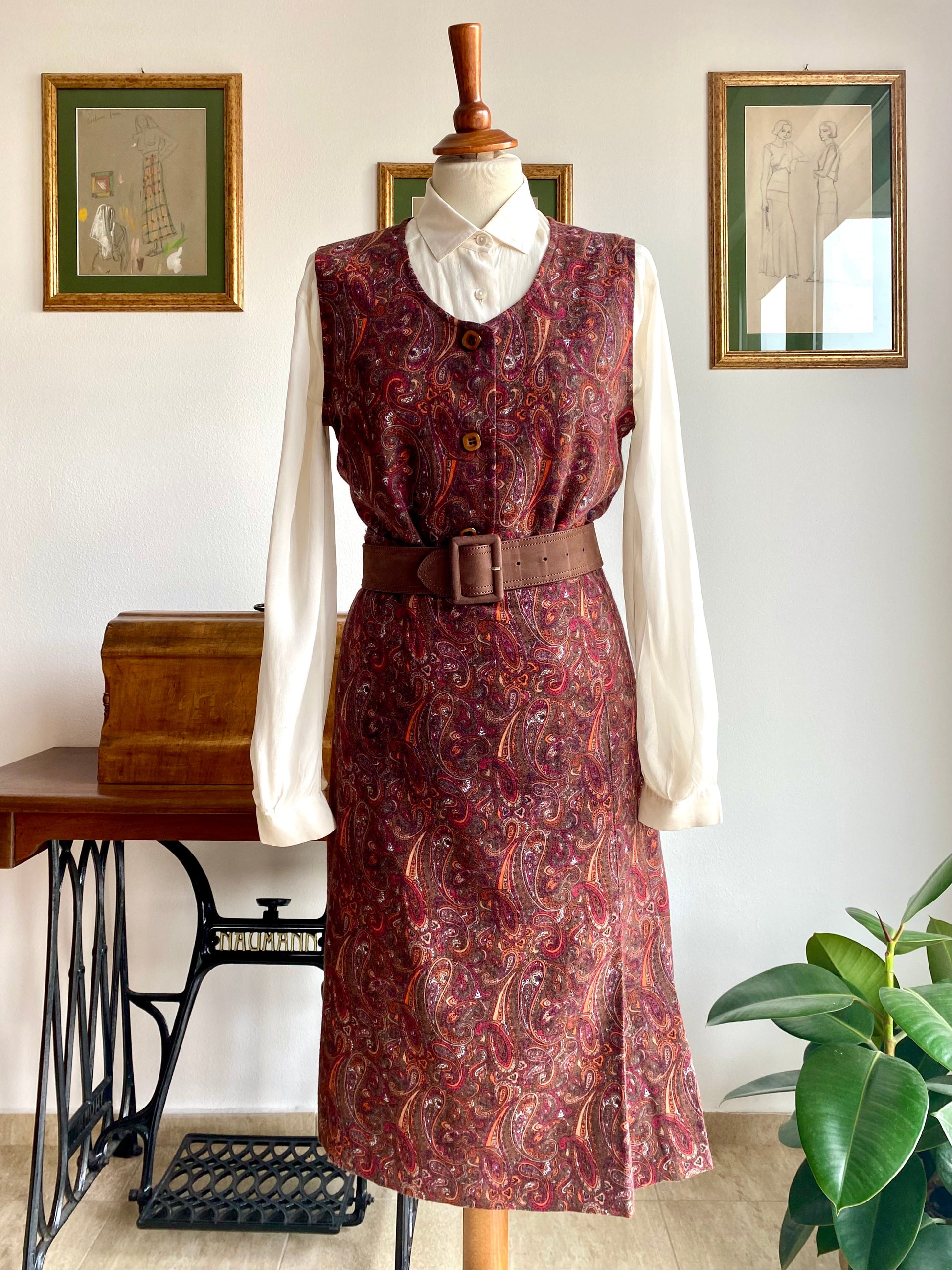 Completo gilet smanicato + gonna con pieghe laterali sartoriale, originale anni ‘70. Iconica fantasia paisley, molto in voga all’epoca. Bottoni del gilet originali e anch’essi molto iconici.