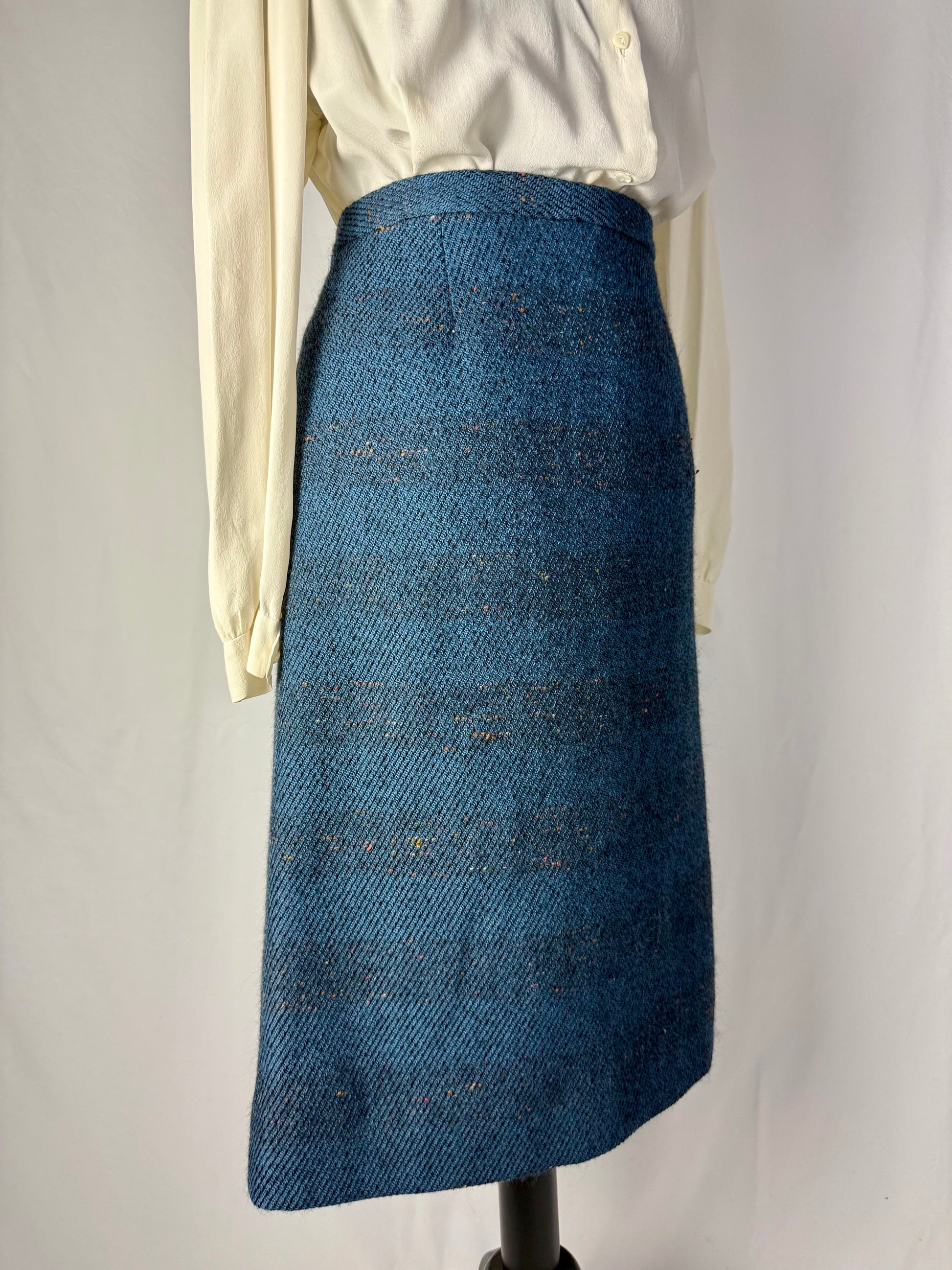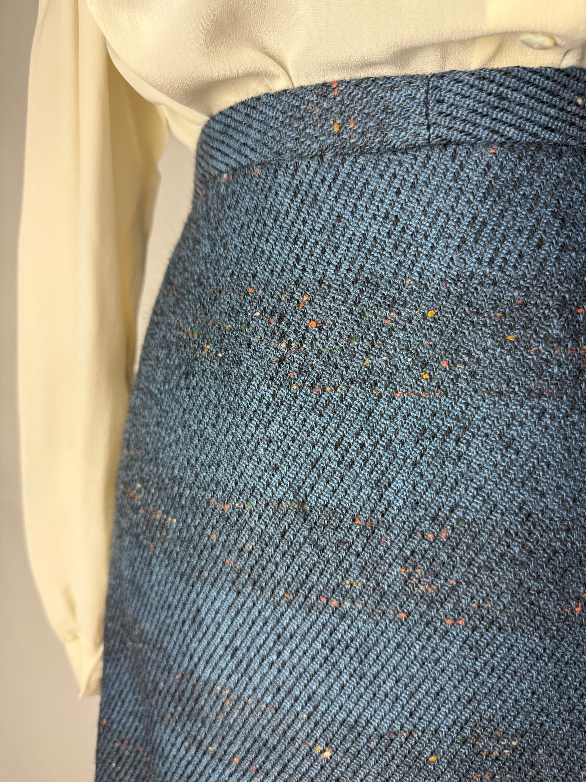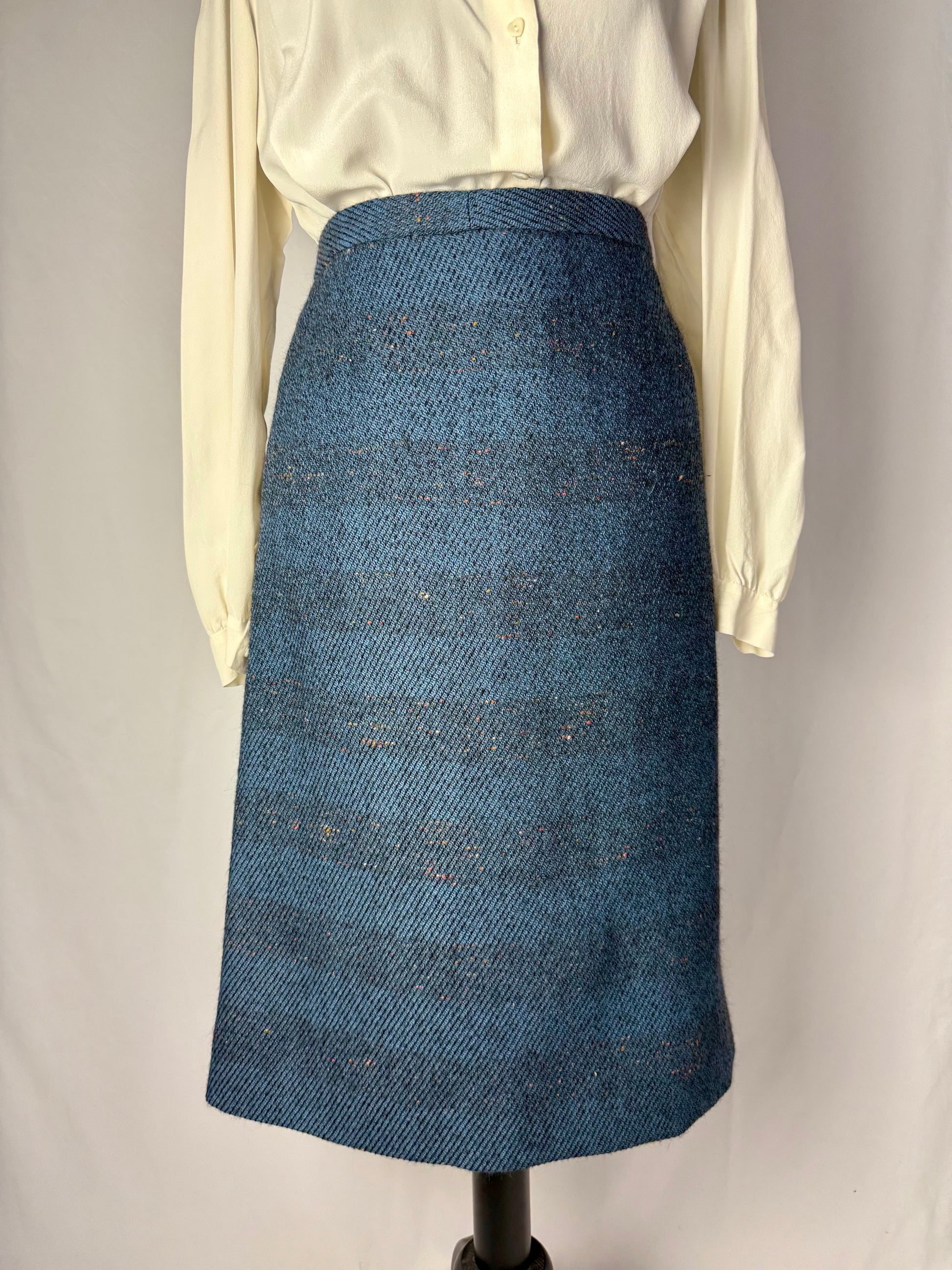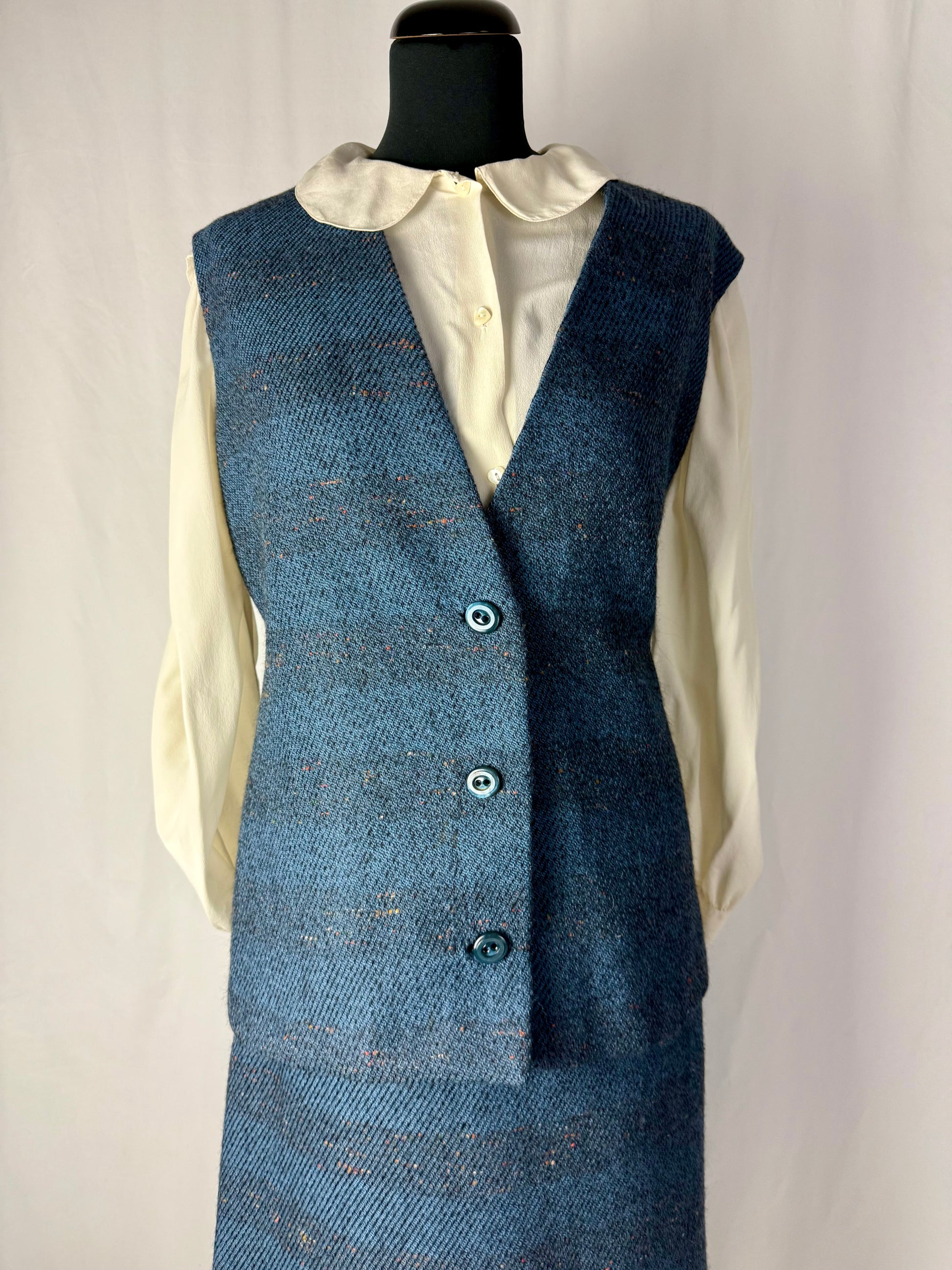 Elegante completo sartoriale anni ’70 composto da gilet e gonna coordinata, realizzati in pregiata lana misto cashmere. Il tessuto, di ottima qualità, presenta una raffinata lavorazione a piccoli quadri tono su tono su fondo blu, con lievi punte di colore che donano profondità e movimento. Il gilet, dalla linea pulita e scollo a V, si chiude con tre bottoni frontali, mentre la gonna ha un taglio classico. Cintura non inclusa (in foto come suggerimento di styling).