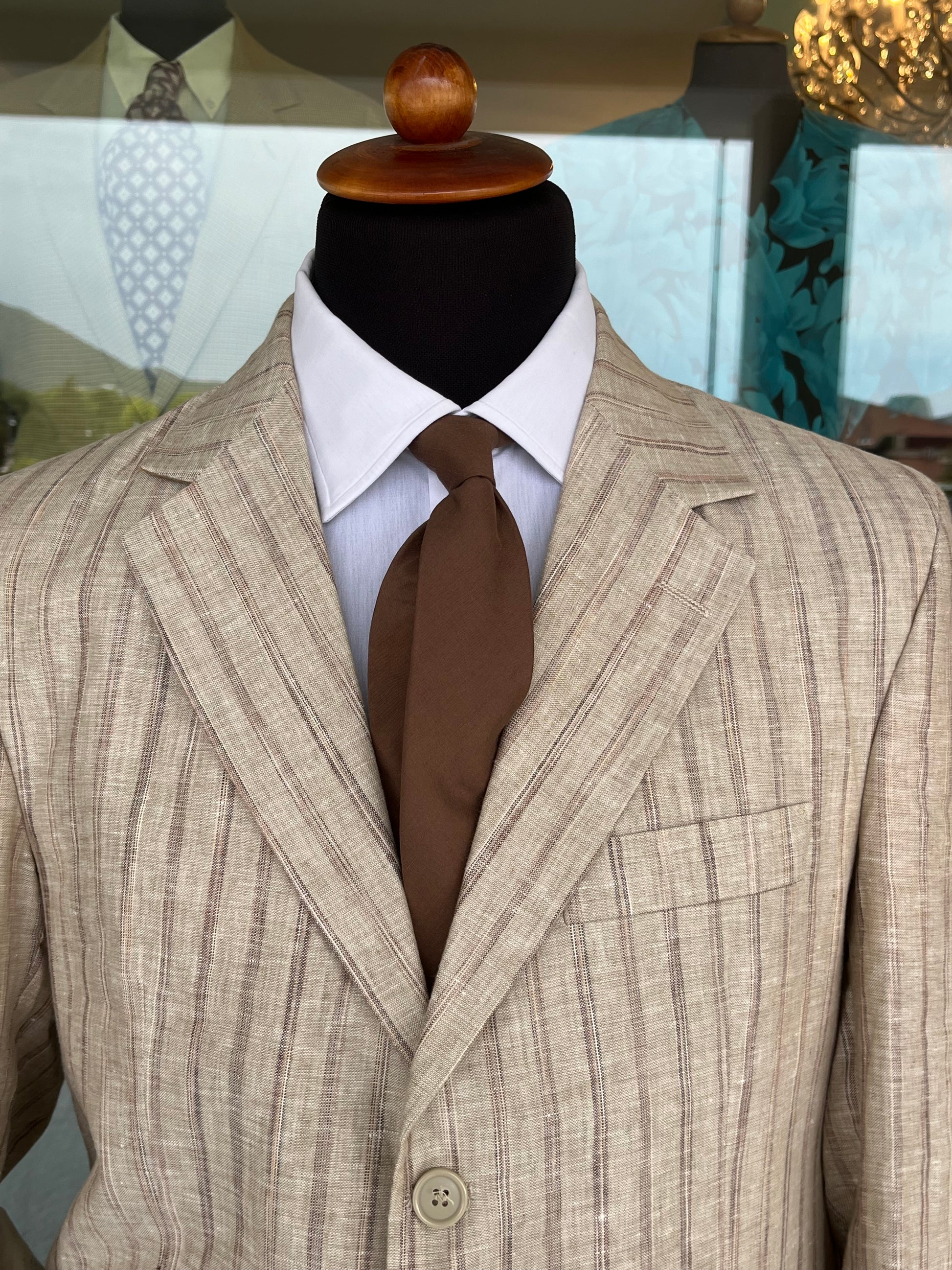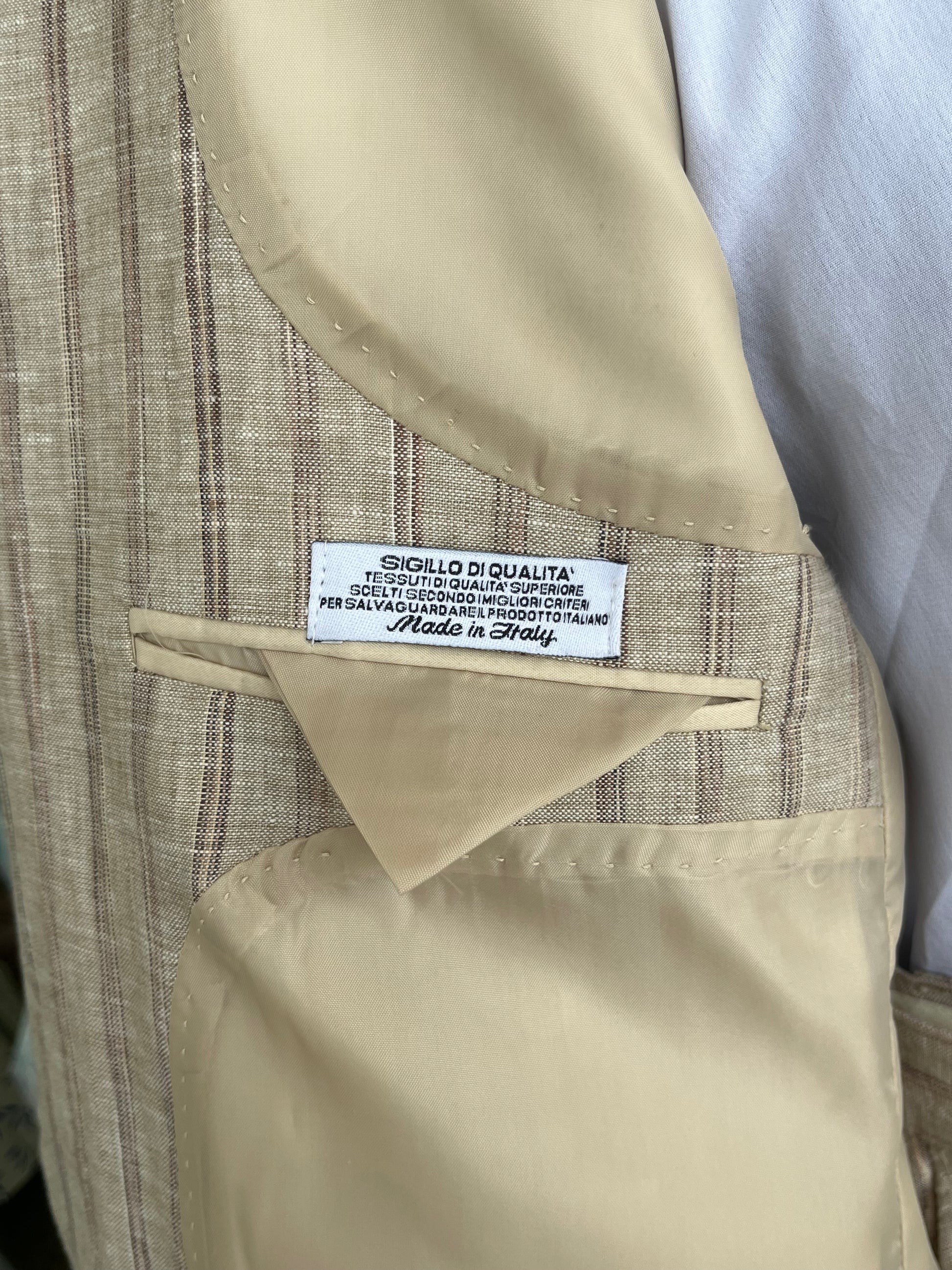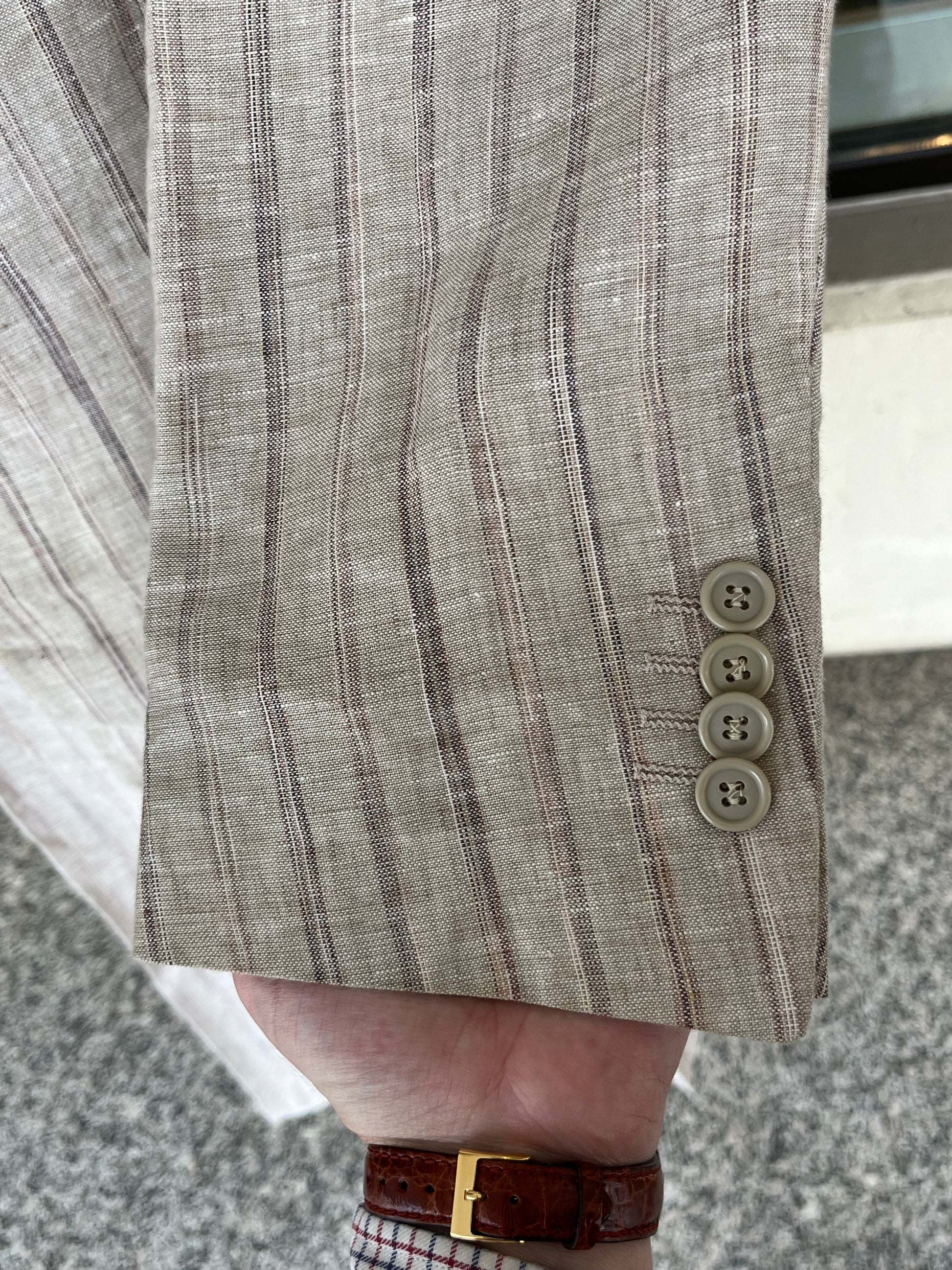 La giacca è un monopetto, tre bottoni, baveri a dente, tasche a pattina e doppio spacco sul retro. È inoltre semi-sfoderata, quindi ideale alla stagione calda.