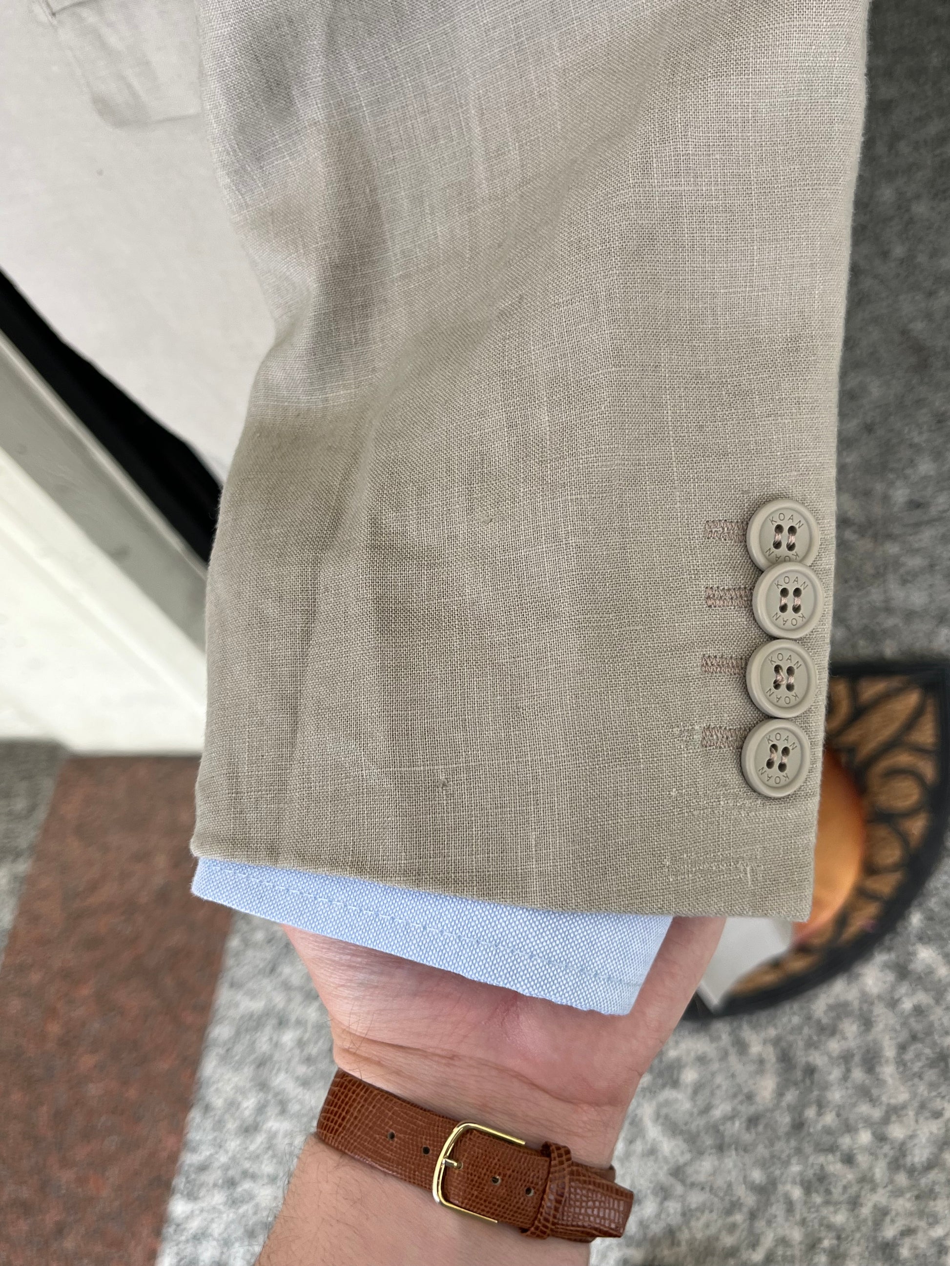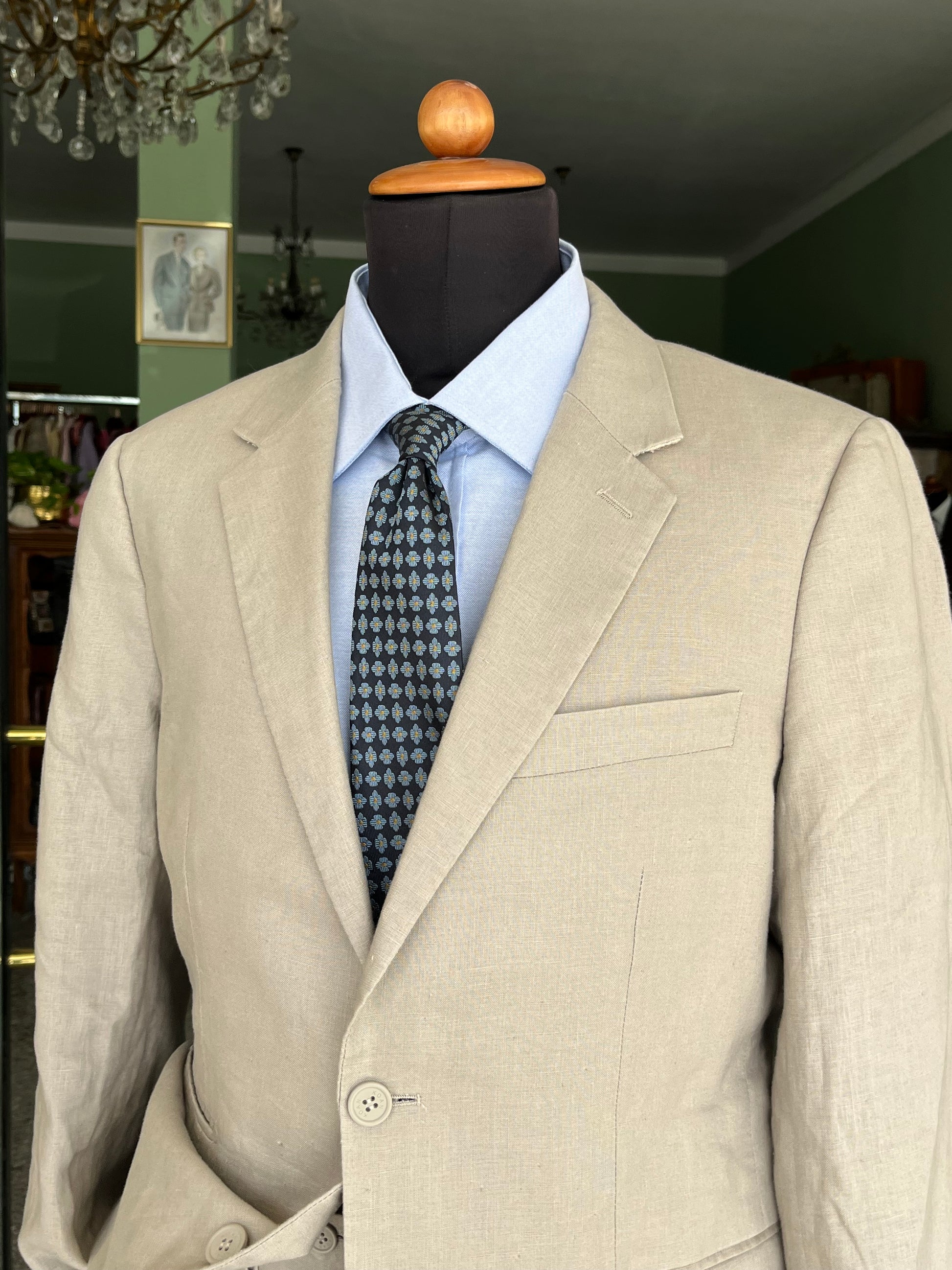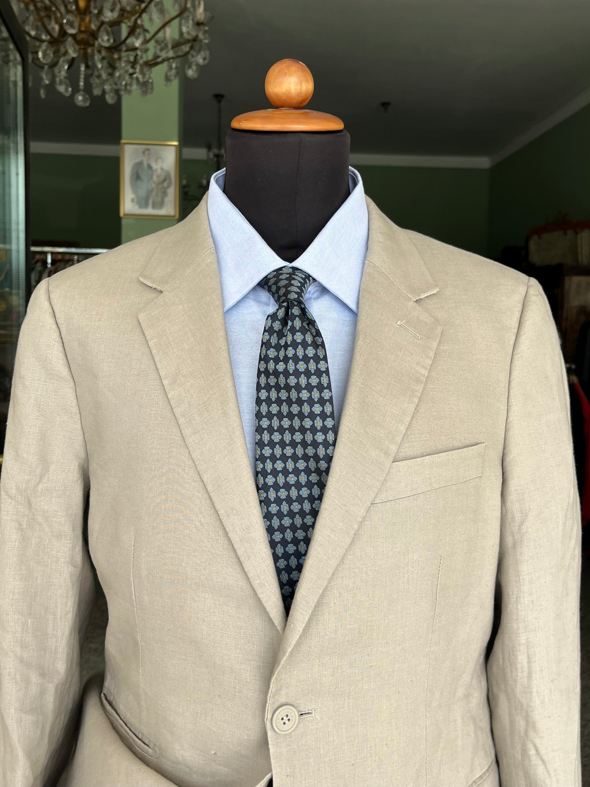 La giacca è un monopetto, due bottoni, baveri a dente, tasche a pattina ticket pocket e spacco sul retro.