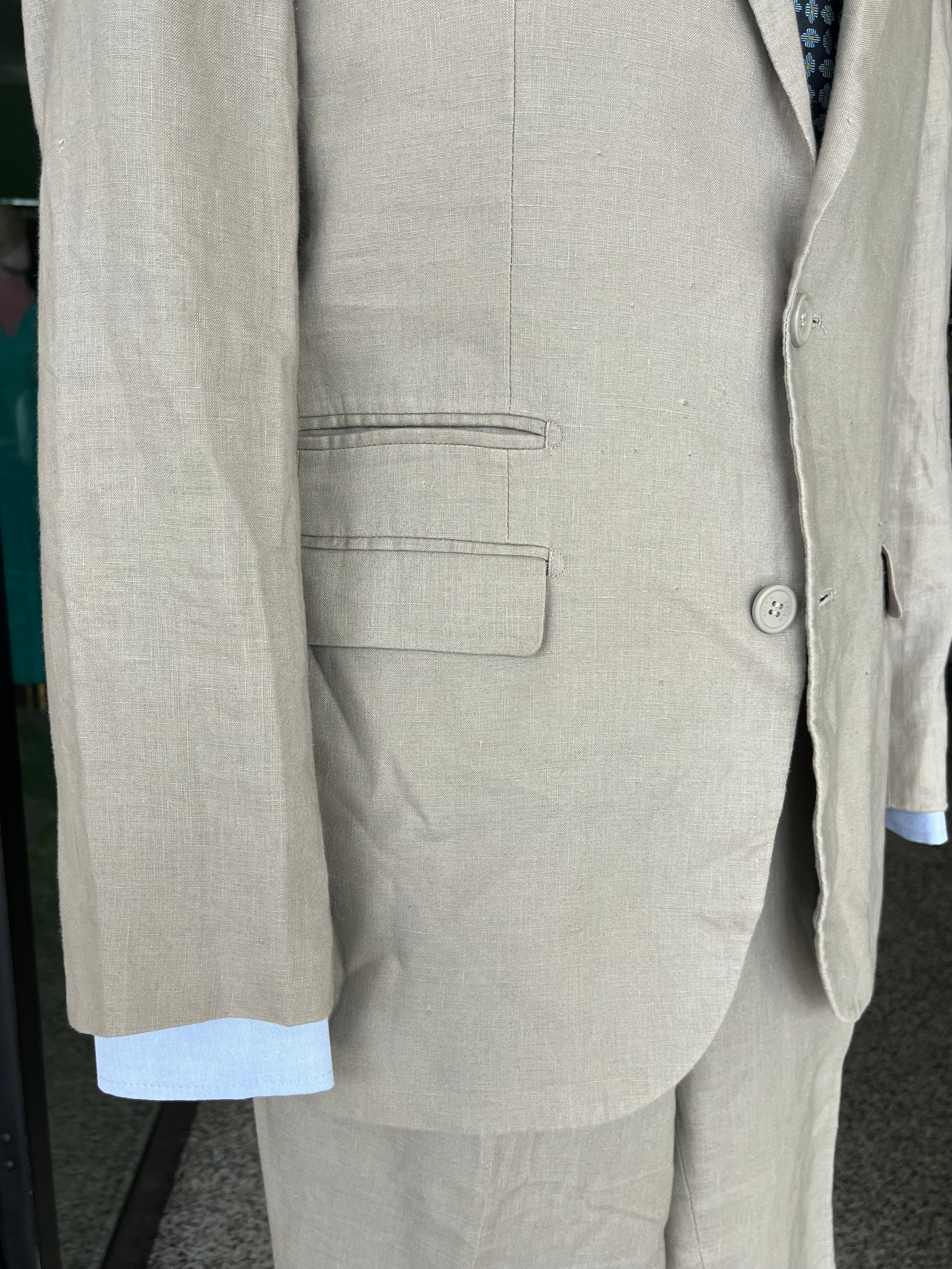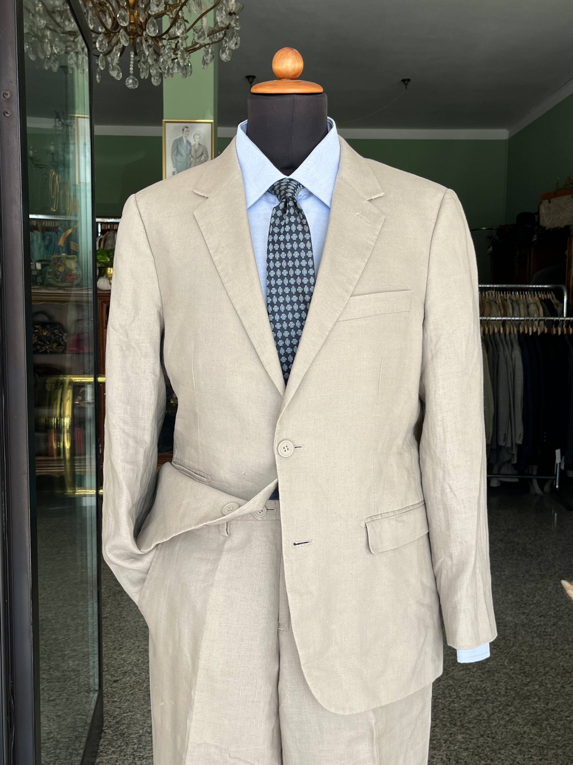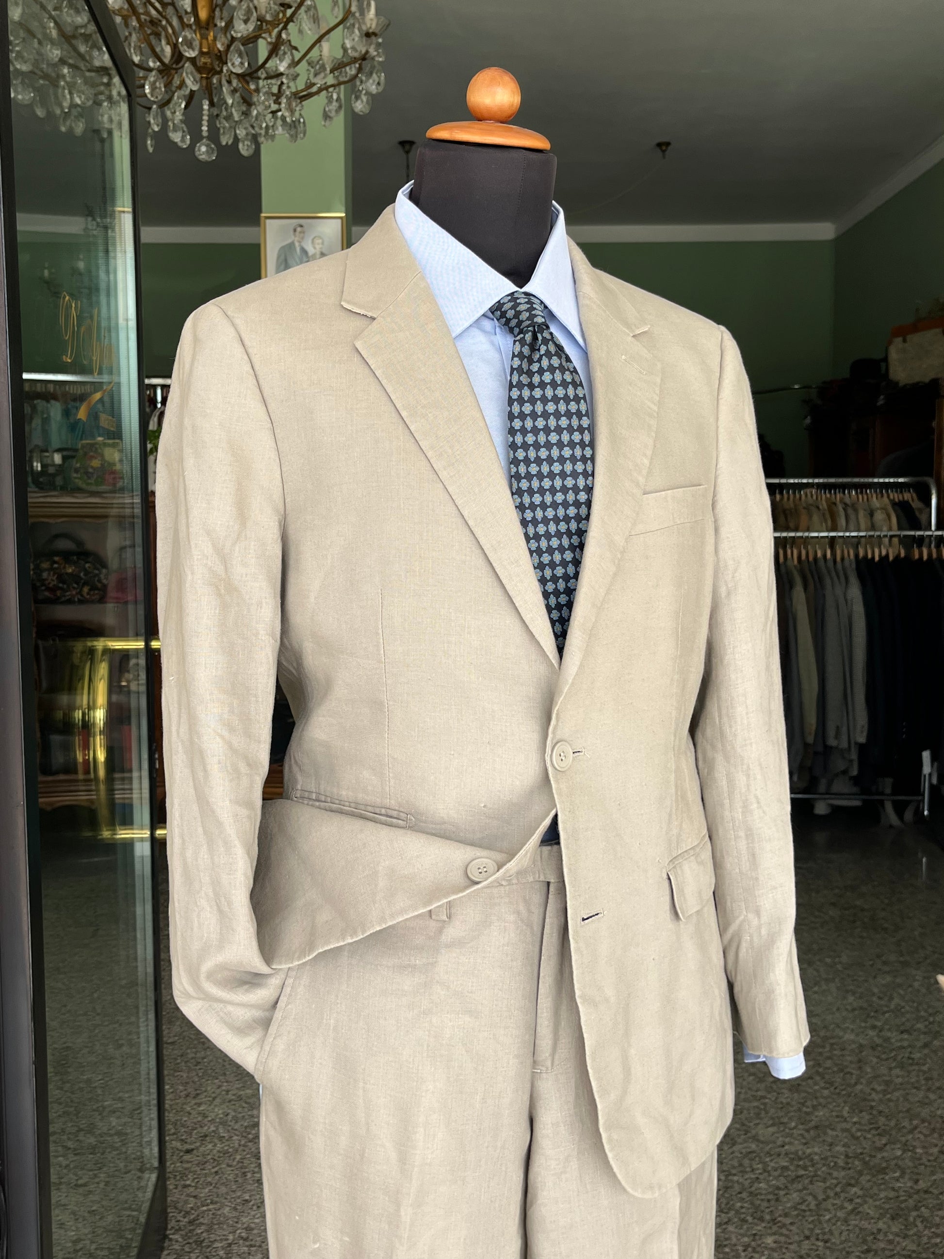 La giacca è un monopetto, due bottoni, baveri a dente, tasche a pattina ticket pocket e spacco sul retro.