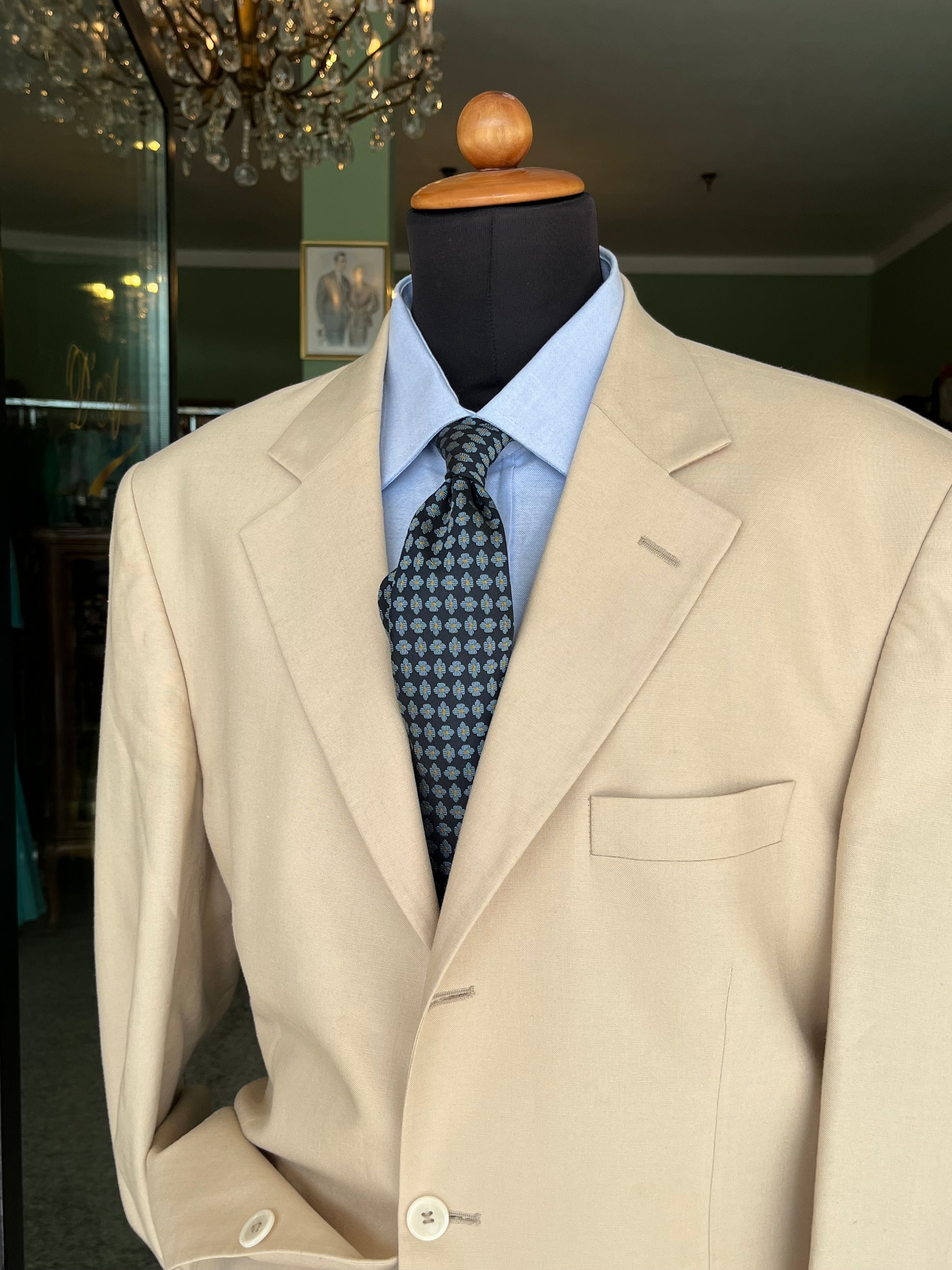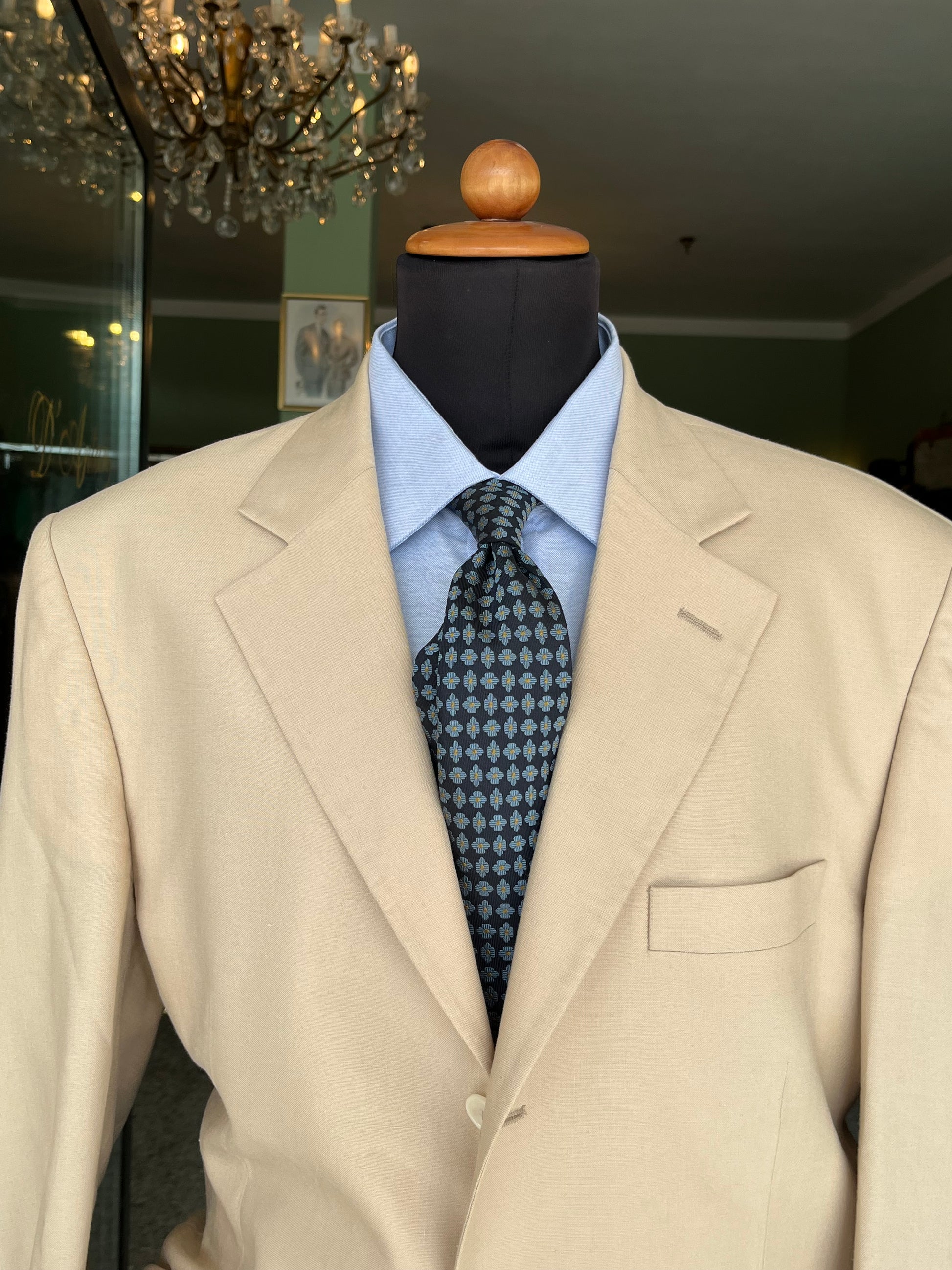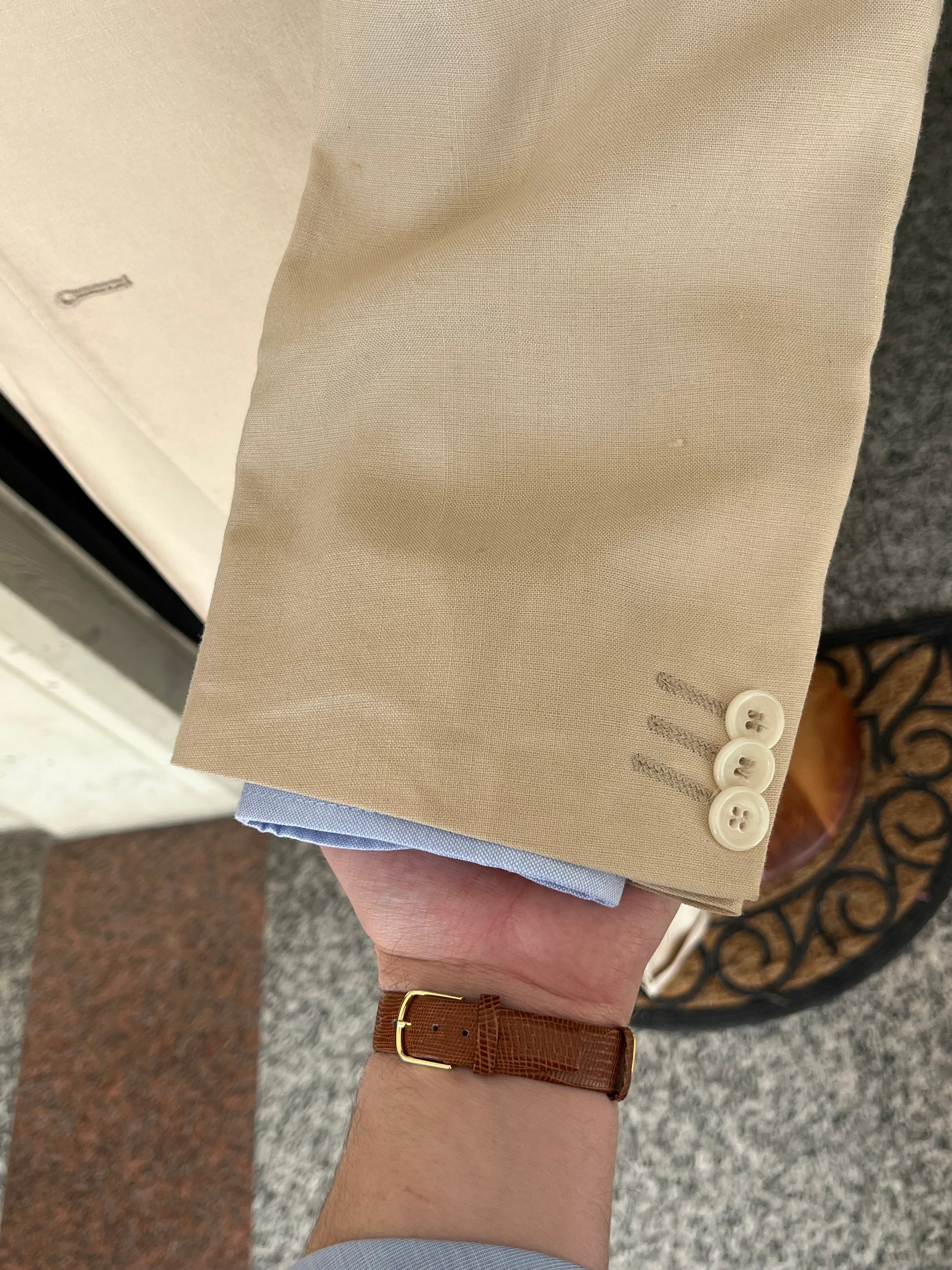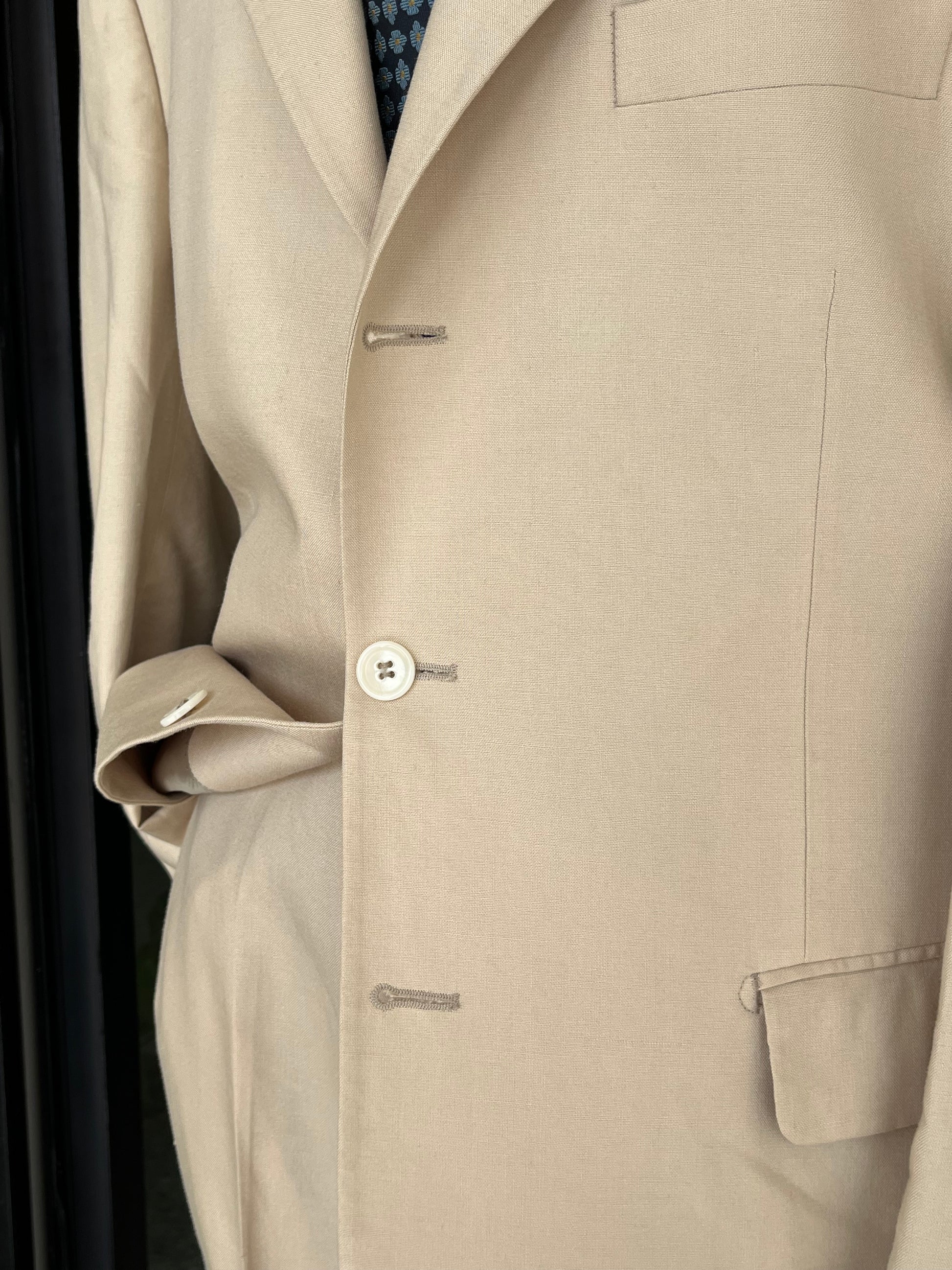 La giacca è un monopetto, tre bottoni, baveri a dente, tasche a pattina e doppio spacco sul retro.