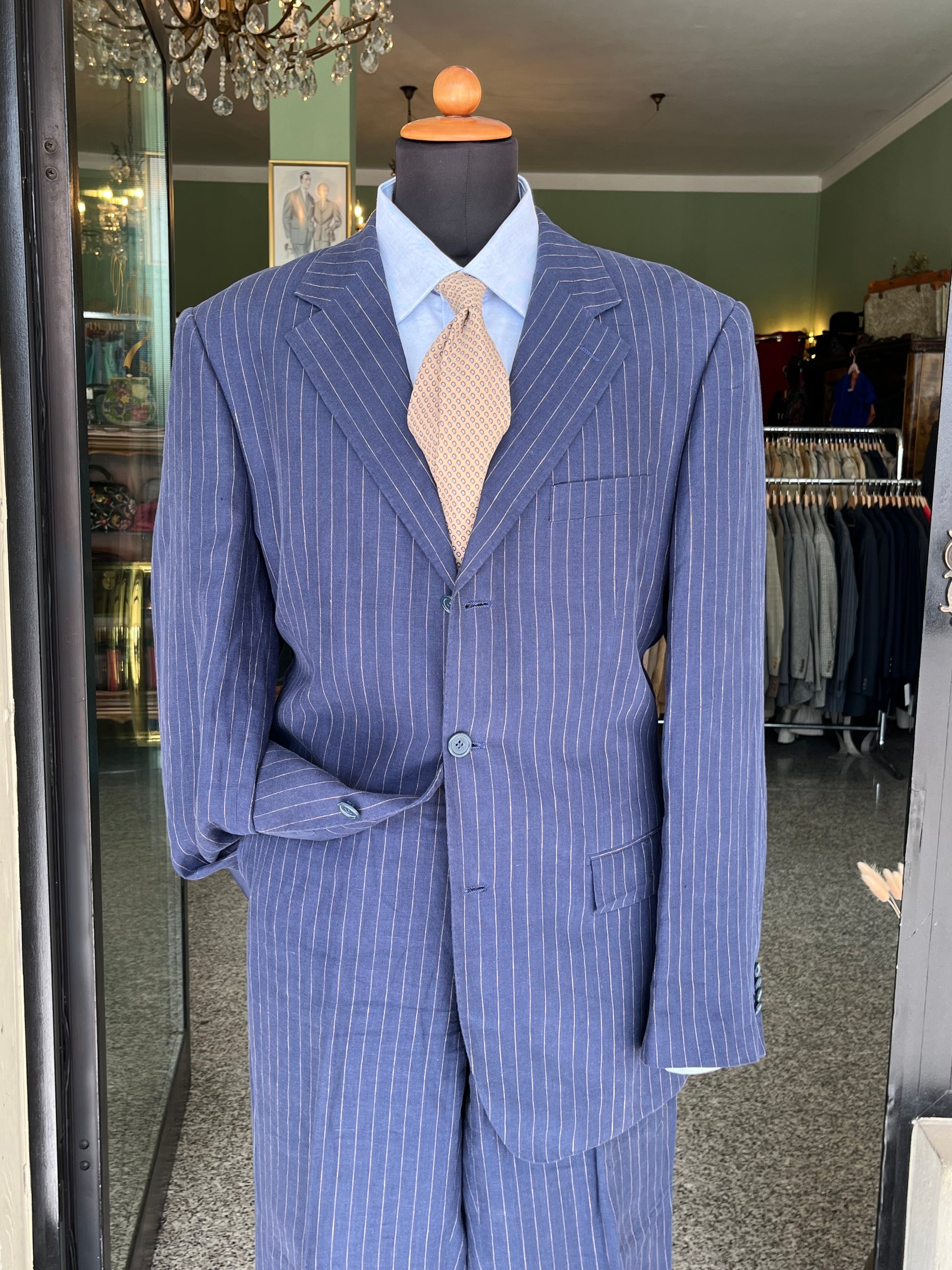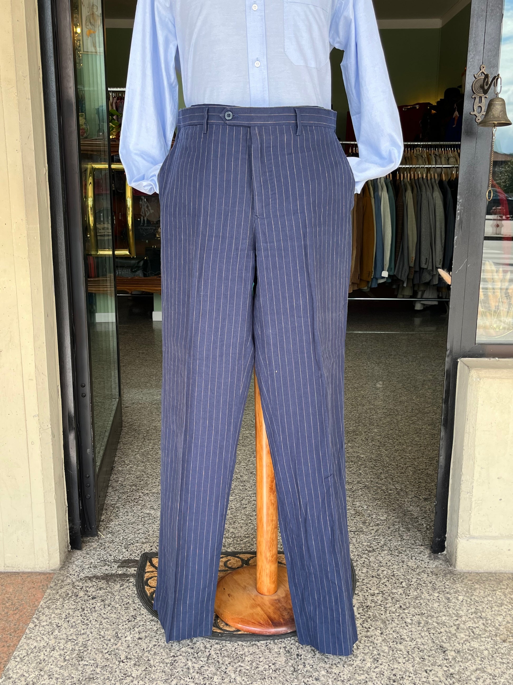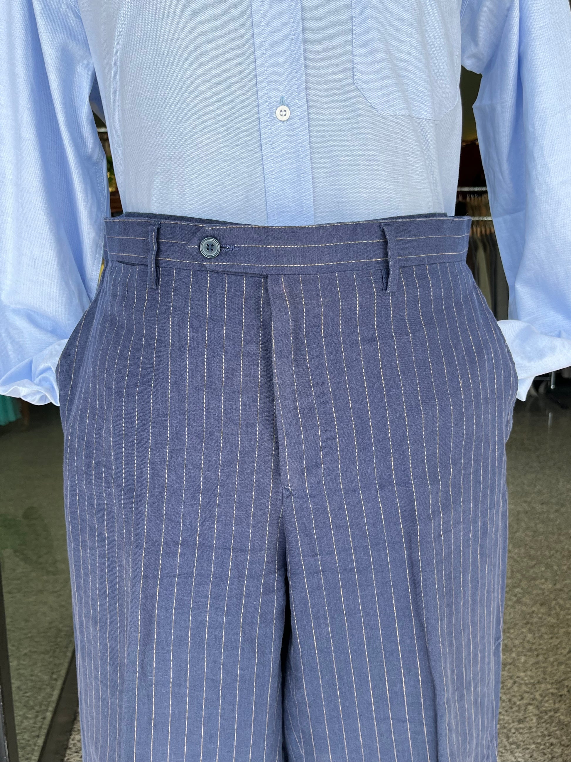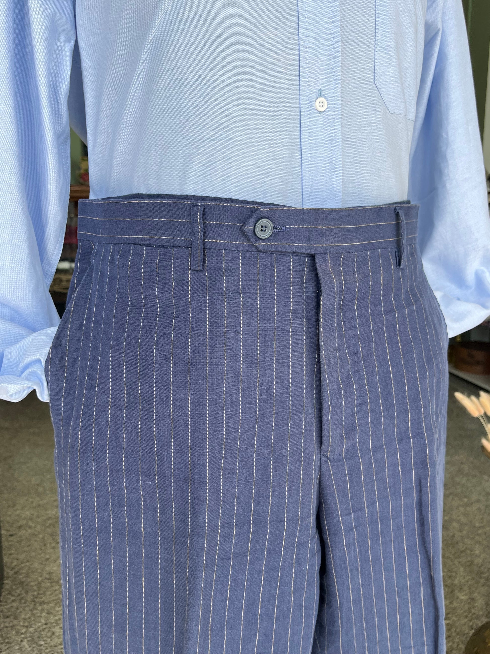 Il tessuto è un 100% puro lino, di color blu vivace gessato.