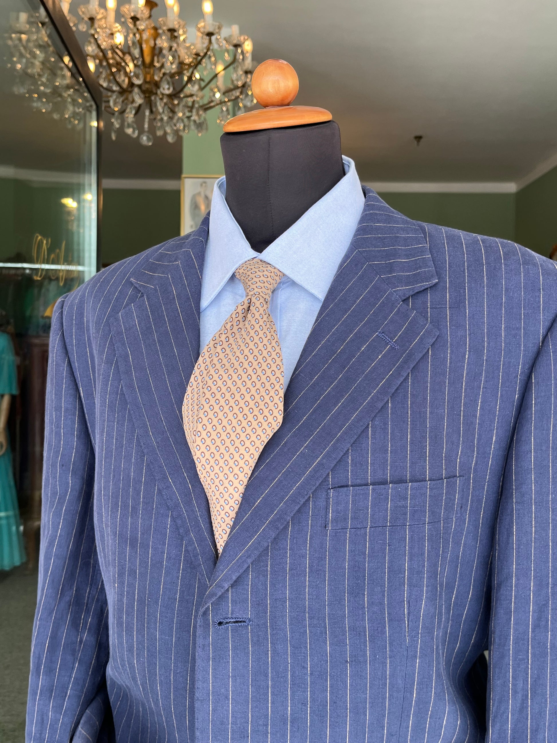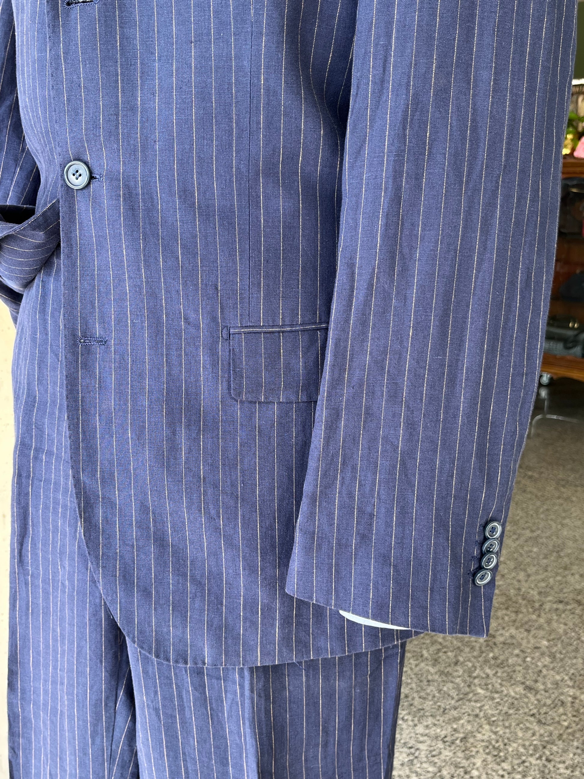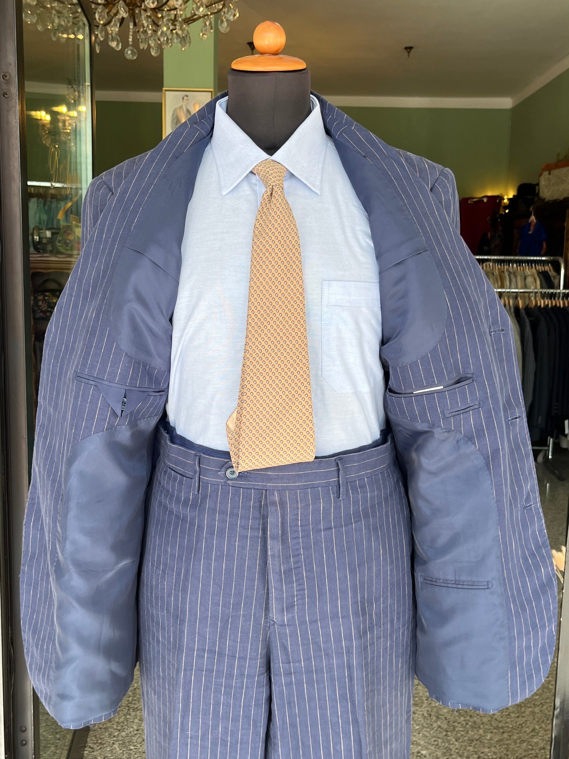 Il tessuto è un 100% puro lino, di color blu vivace gessato.