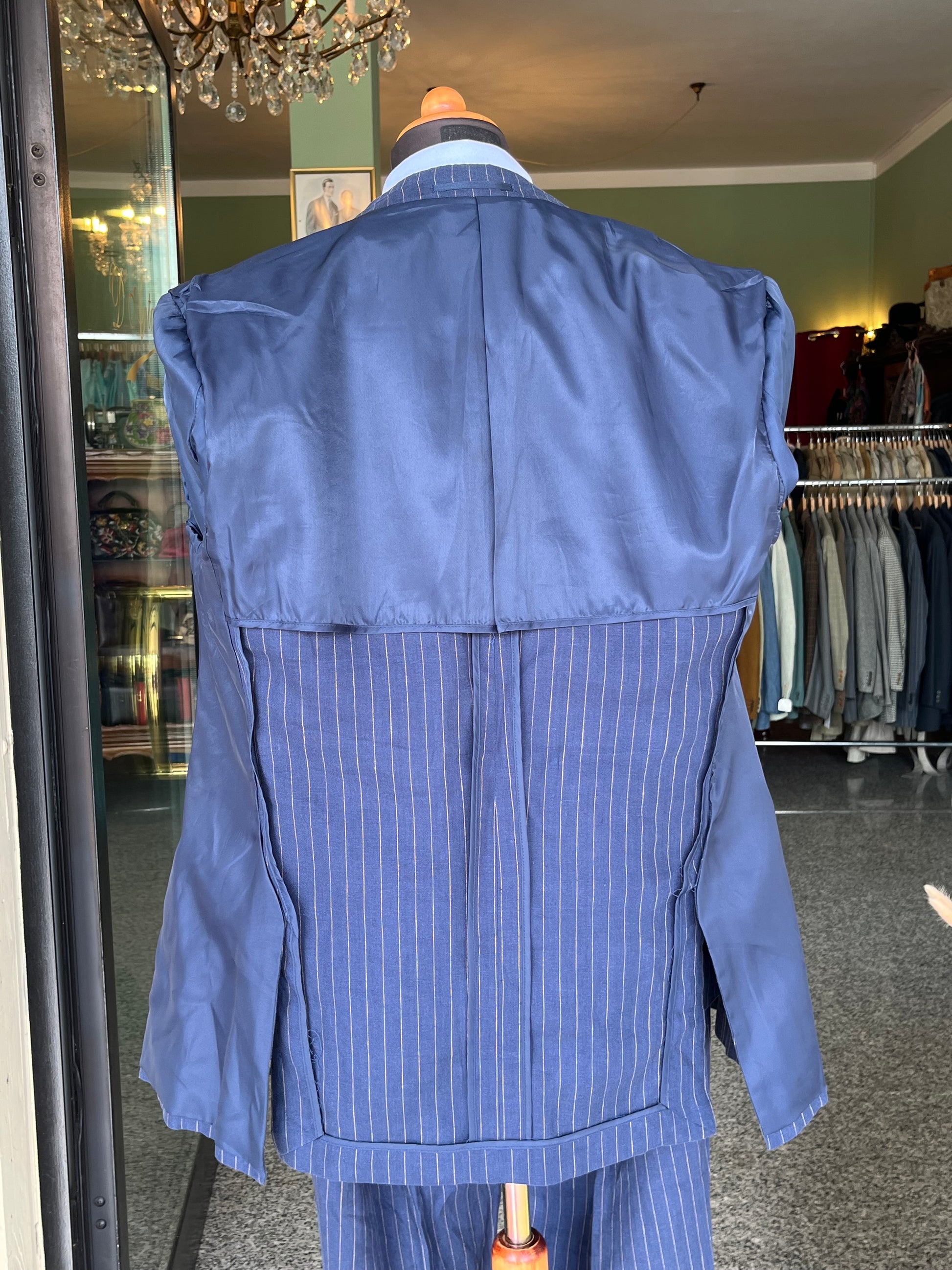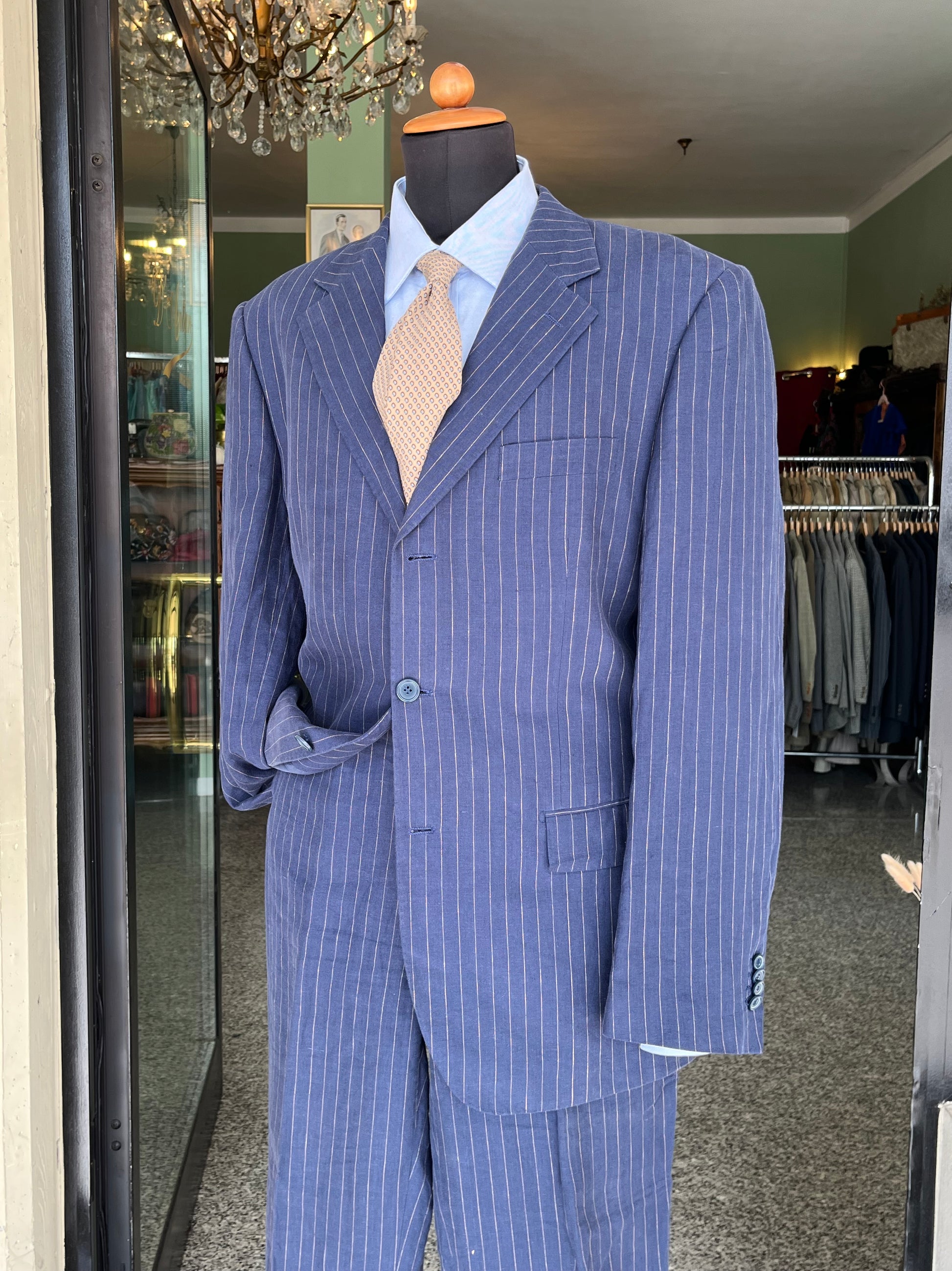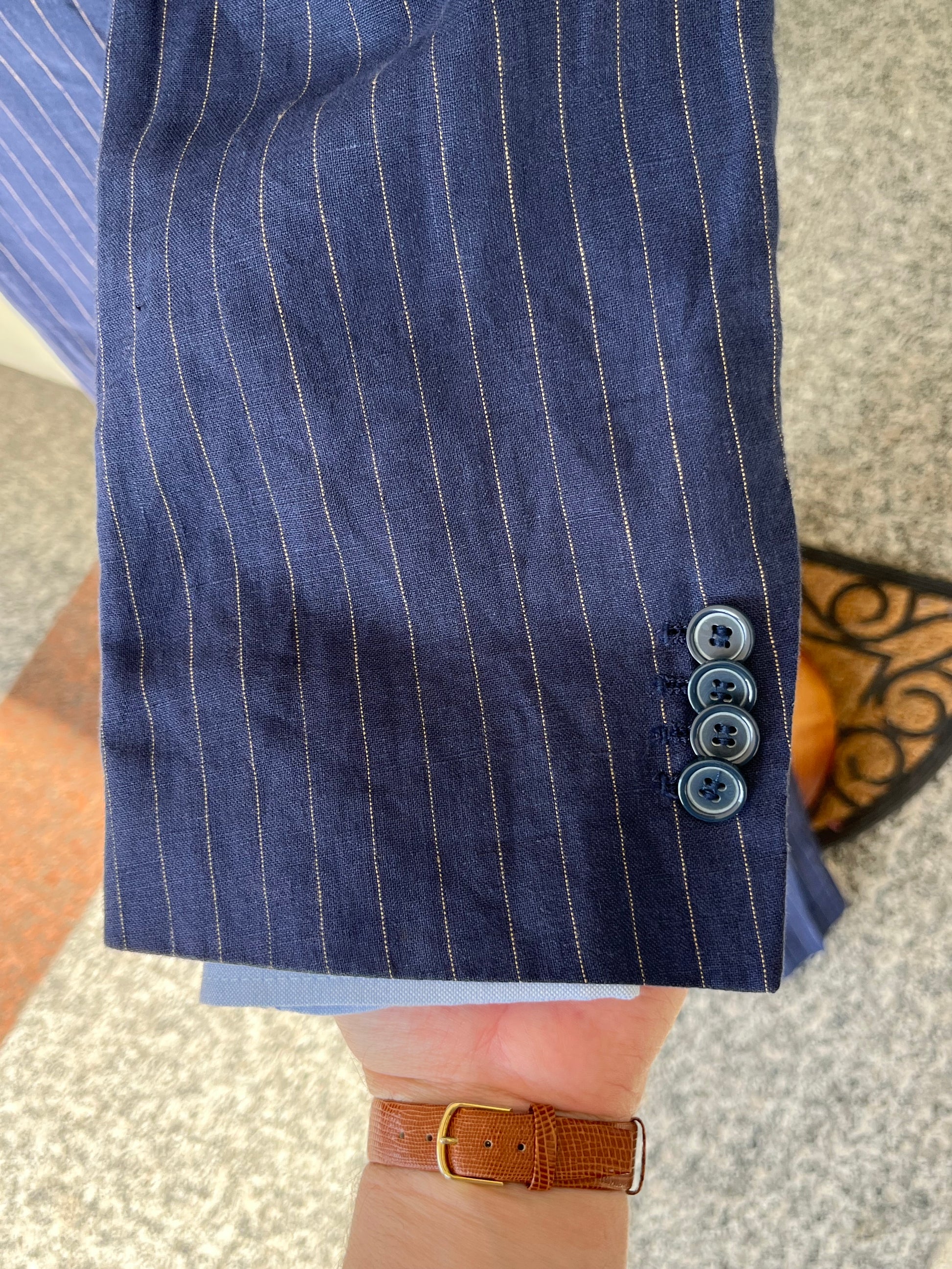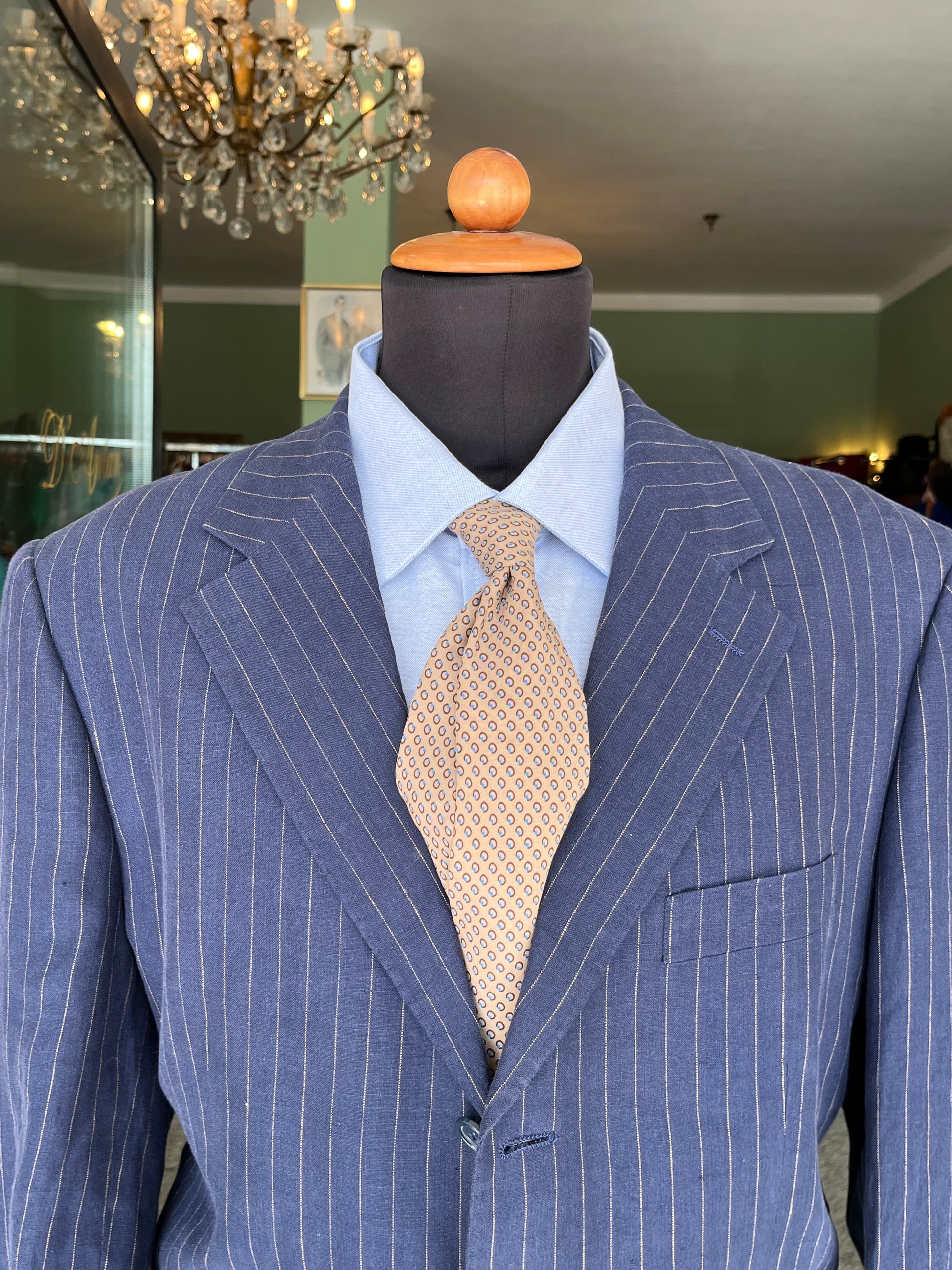 Il tessuto è un 100% puro lino, di color blu vivace gessato.