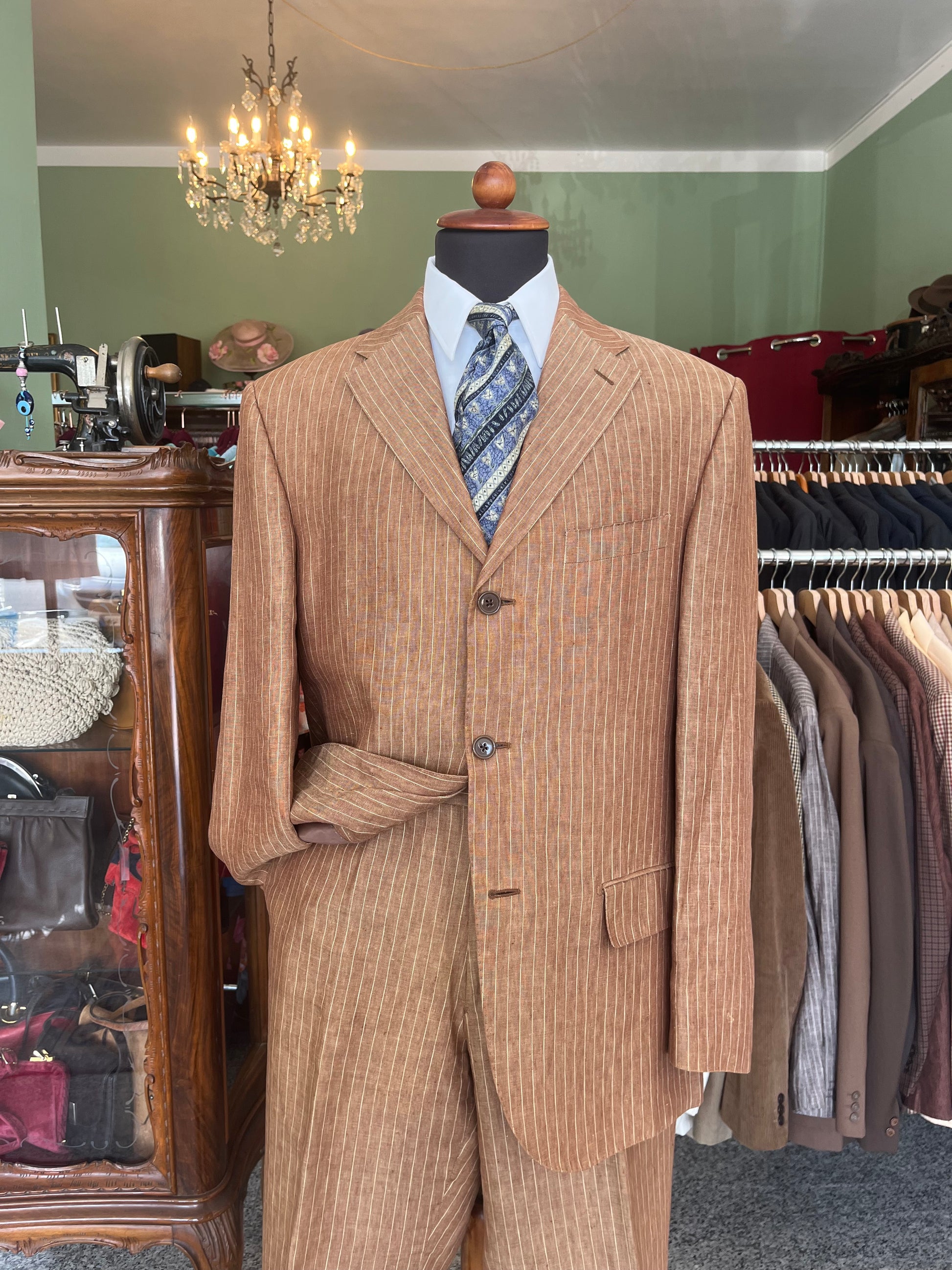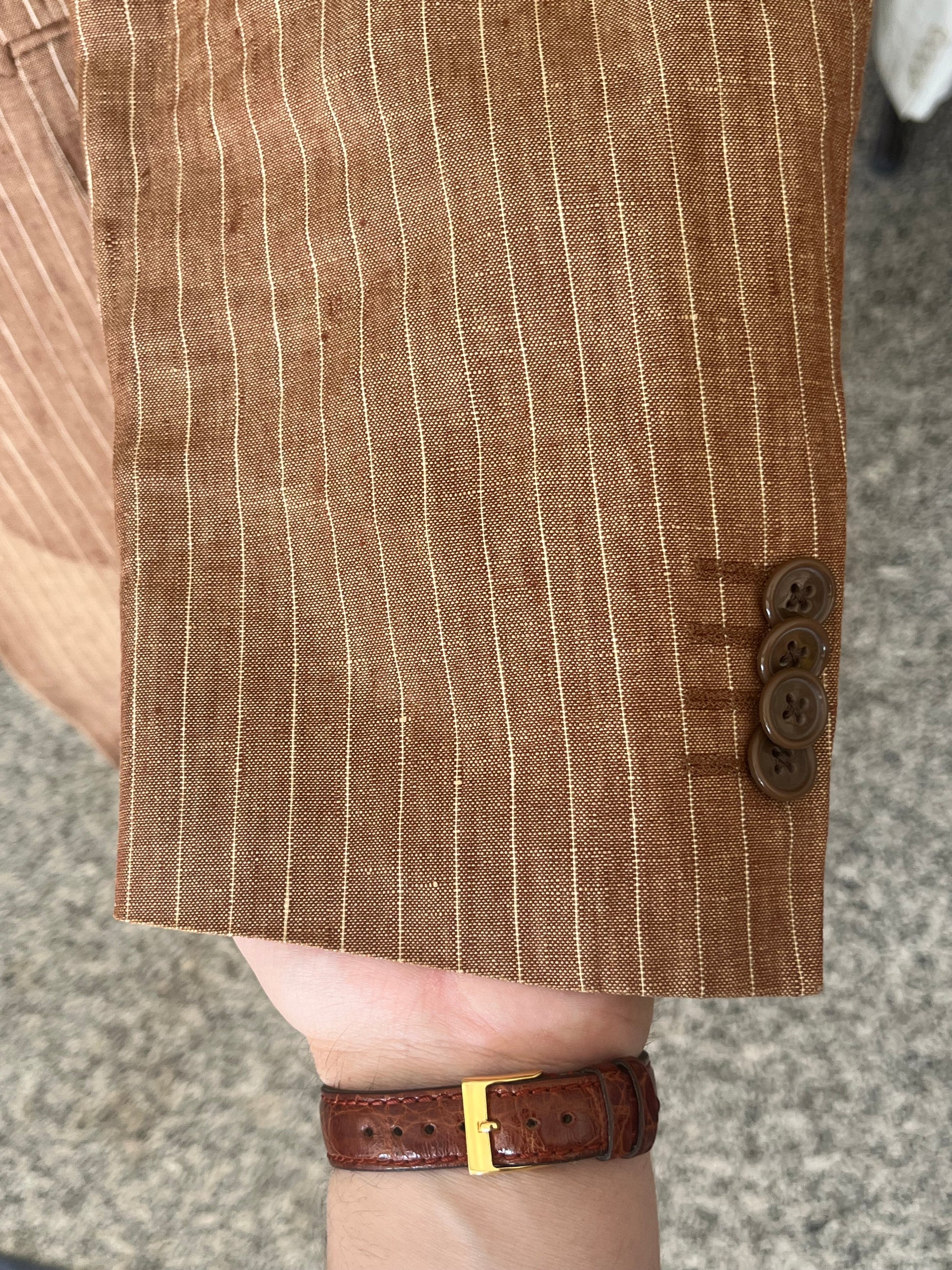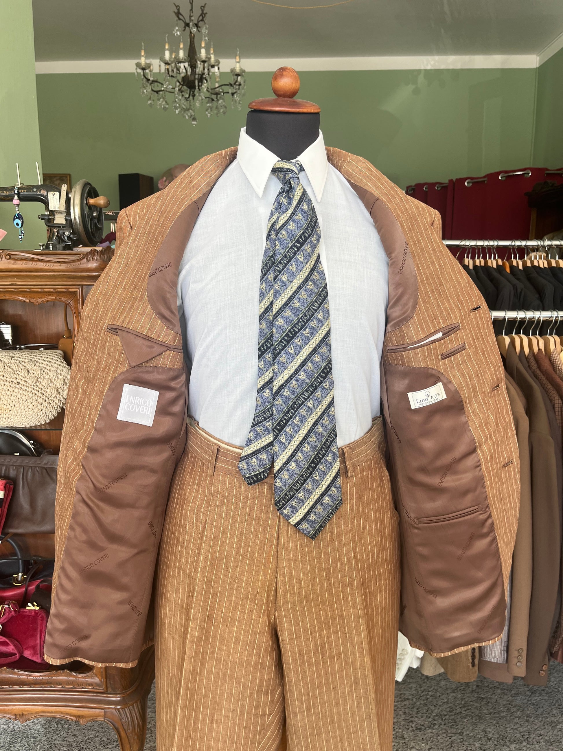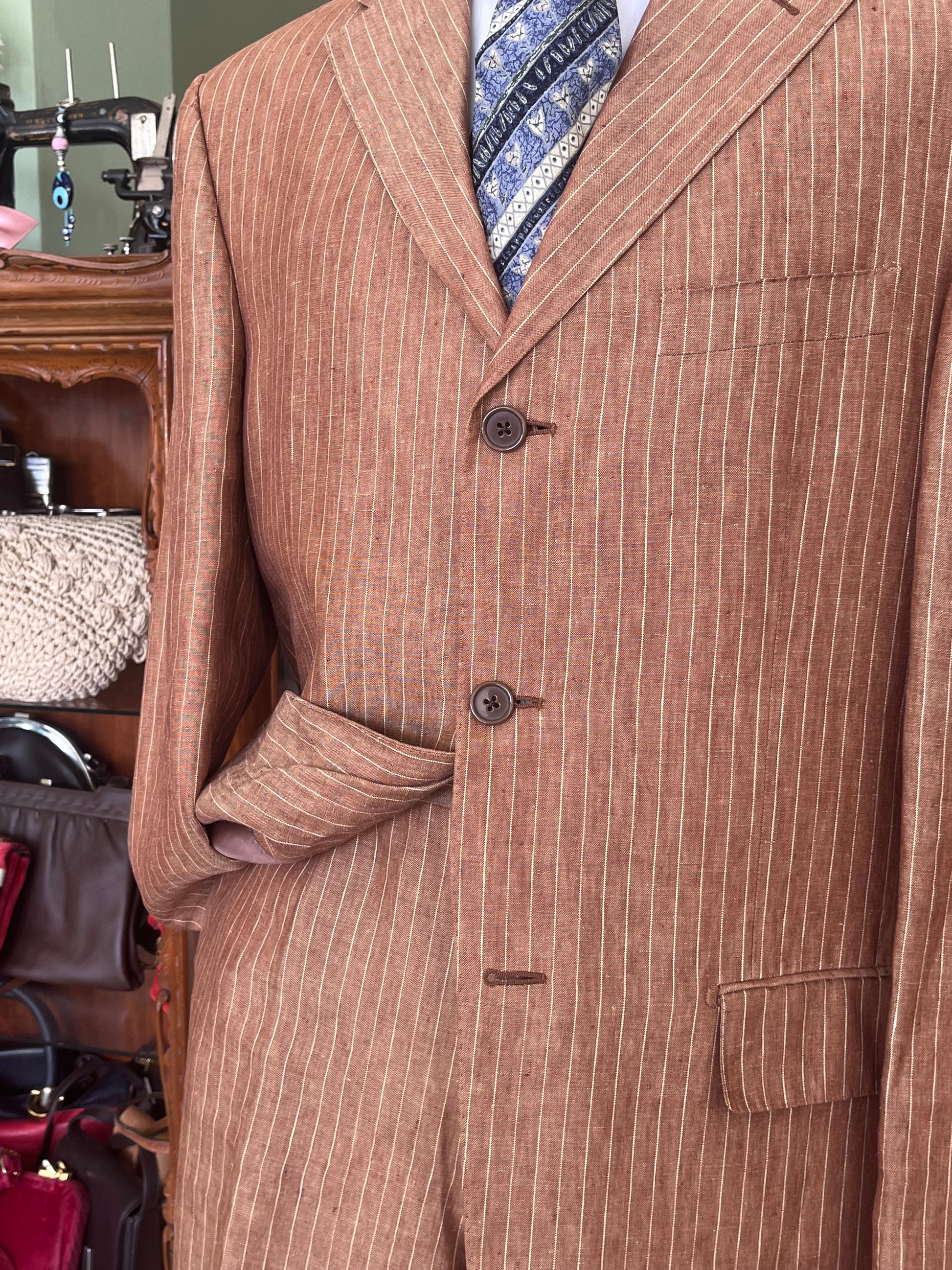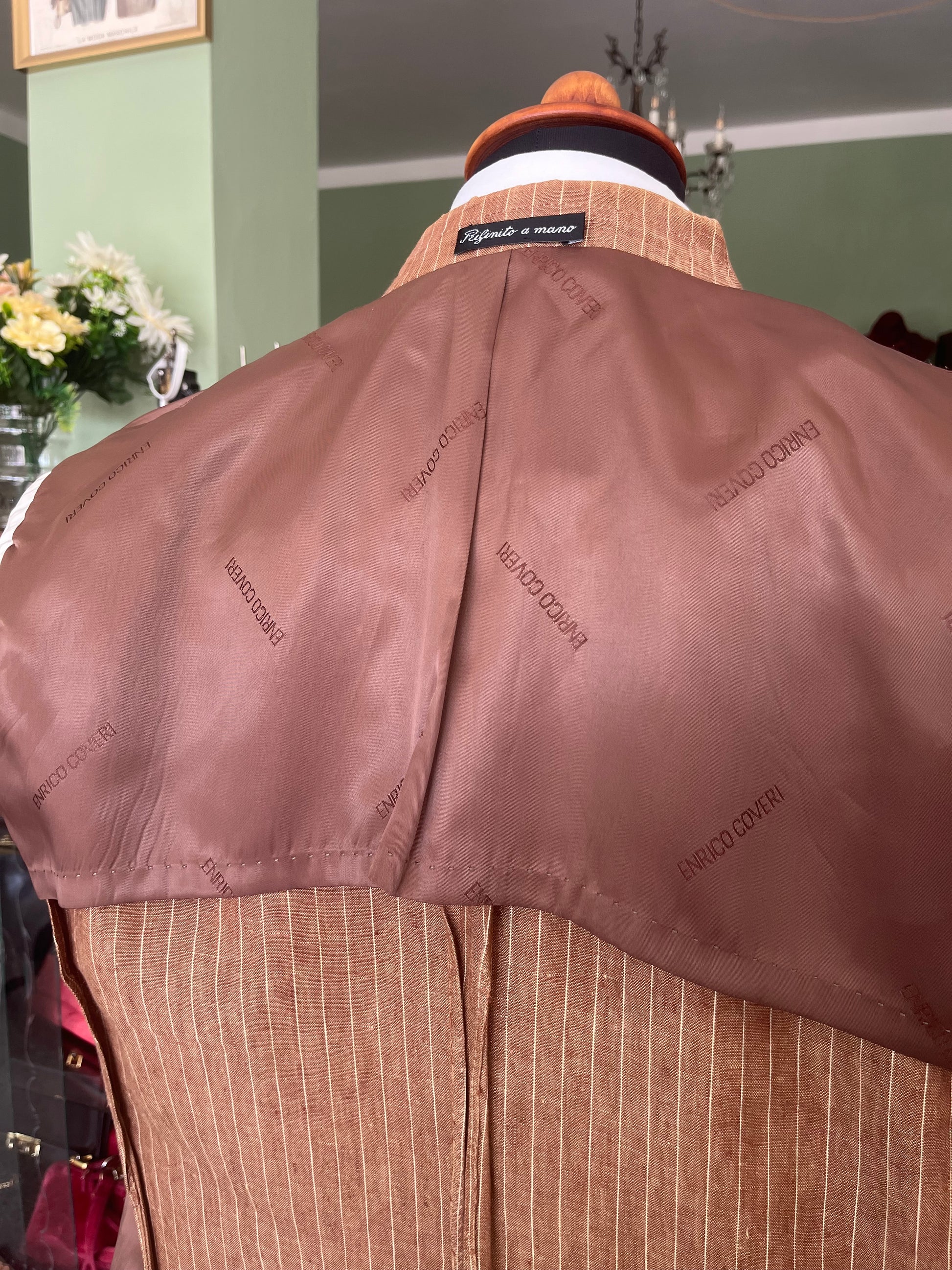 Il tessuto è un 100% puro lino, di colore terra di Siena gessato.