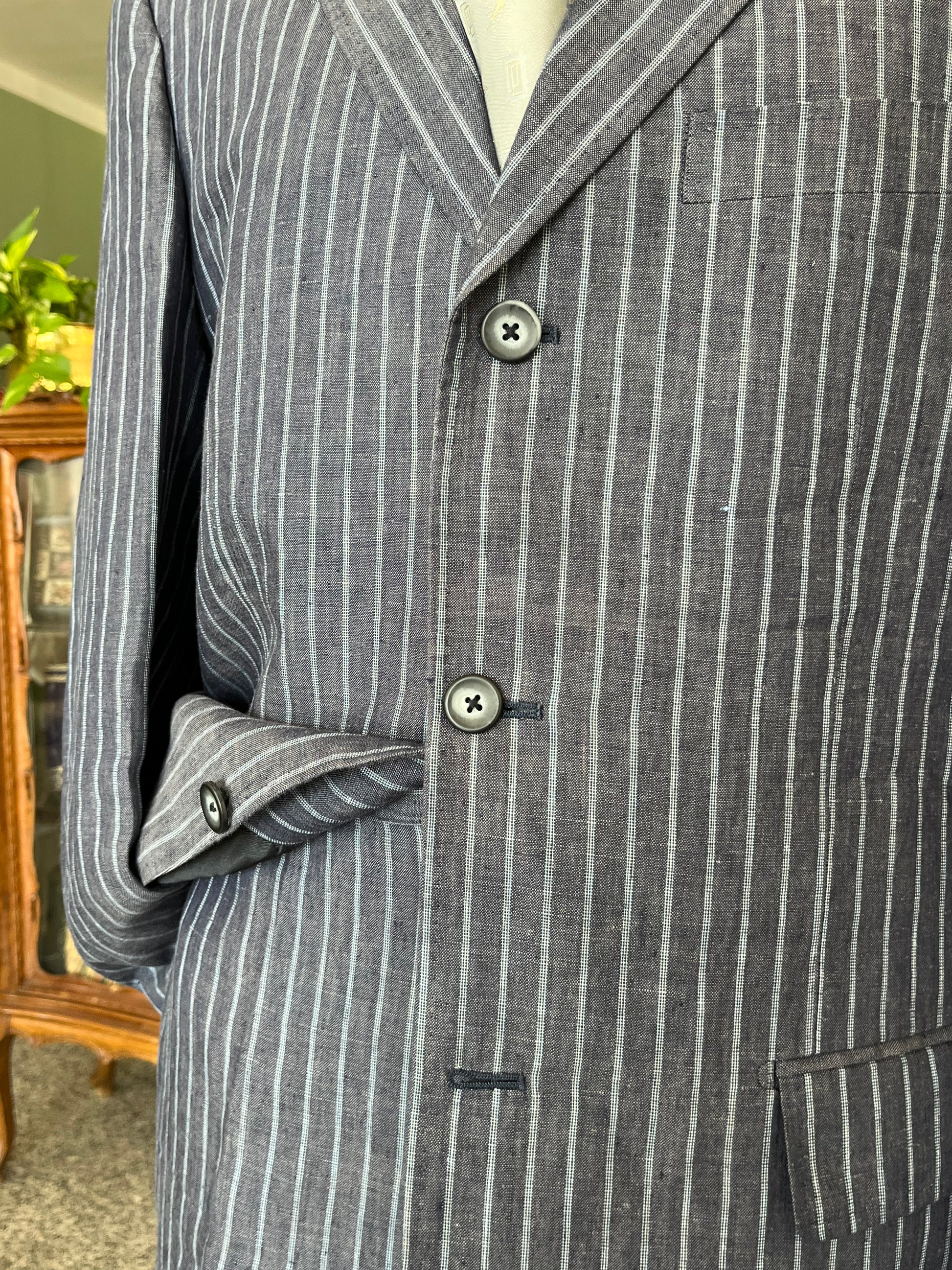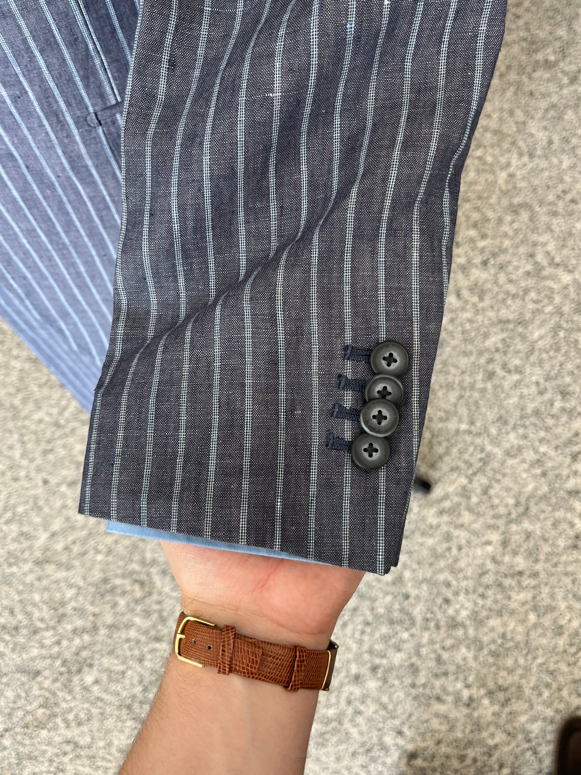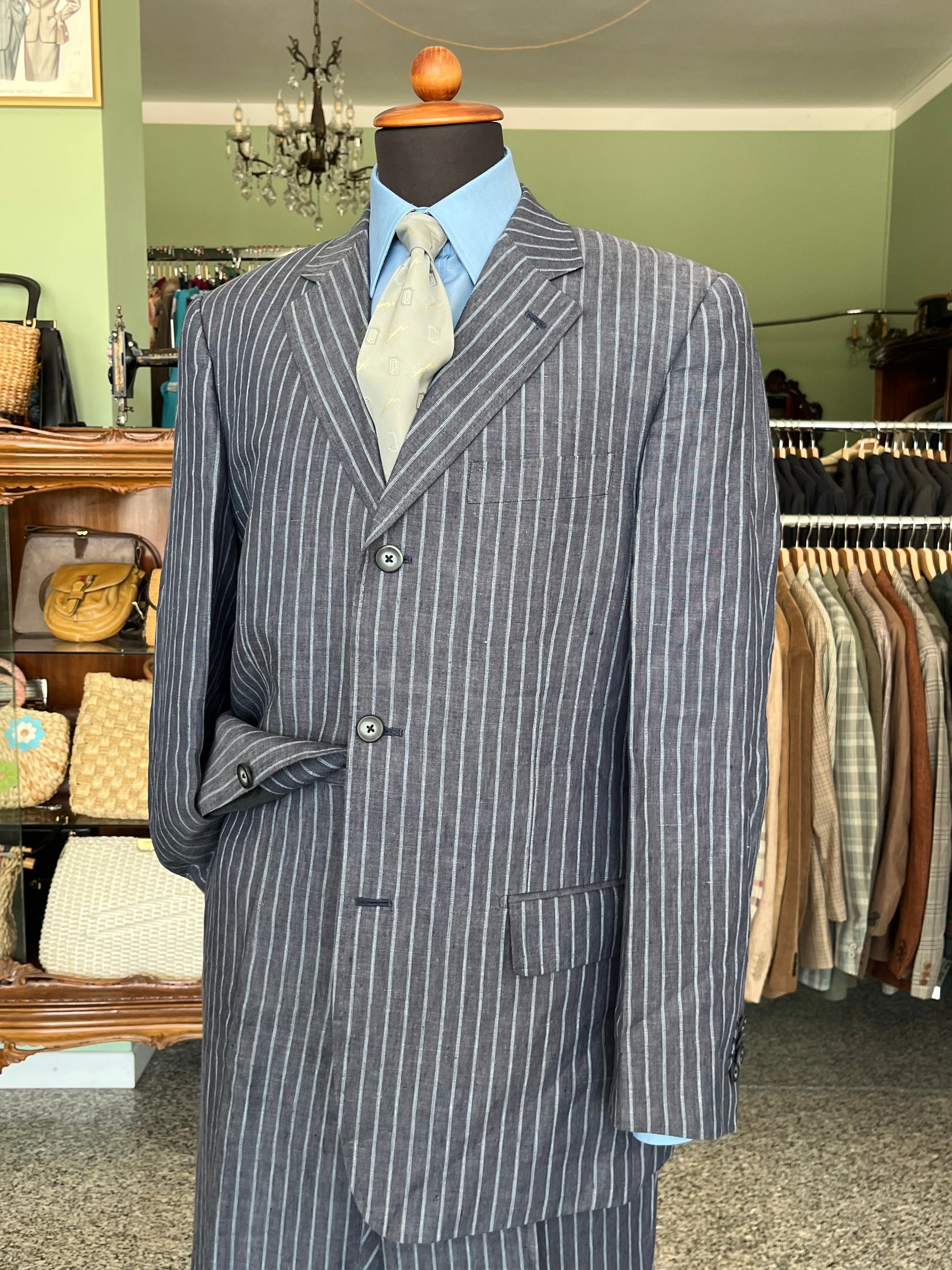 La giacca è un monopetto, tre bottoni, baveri a dente, tasche a pattina e doppio spacco sul retro.