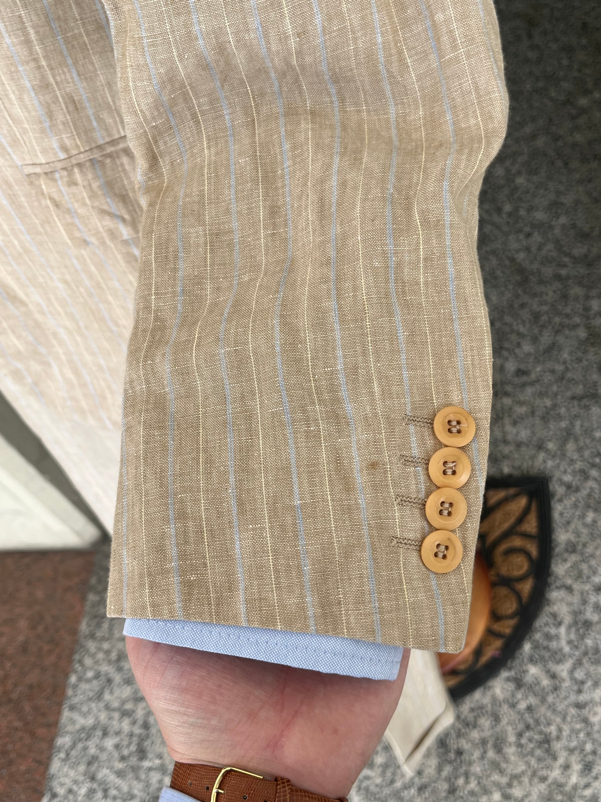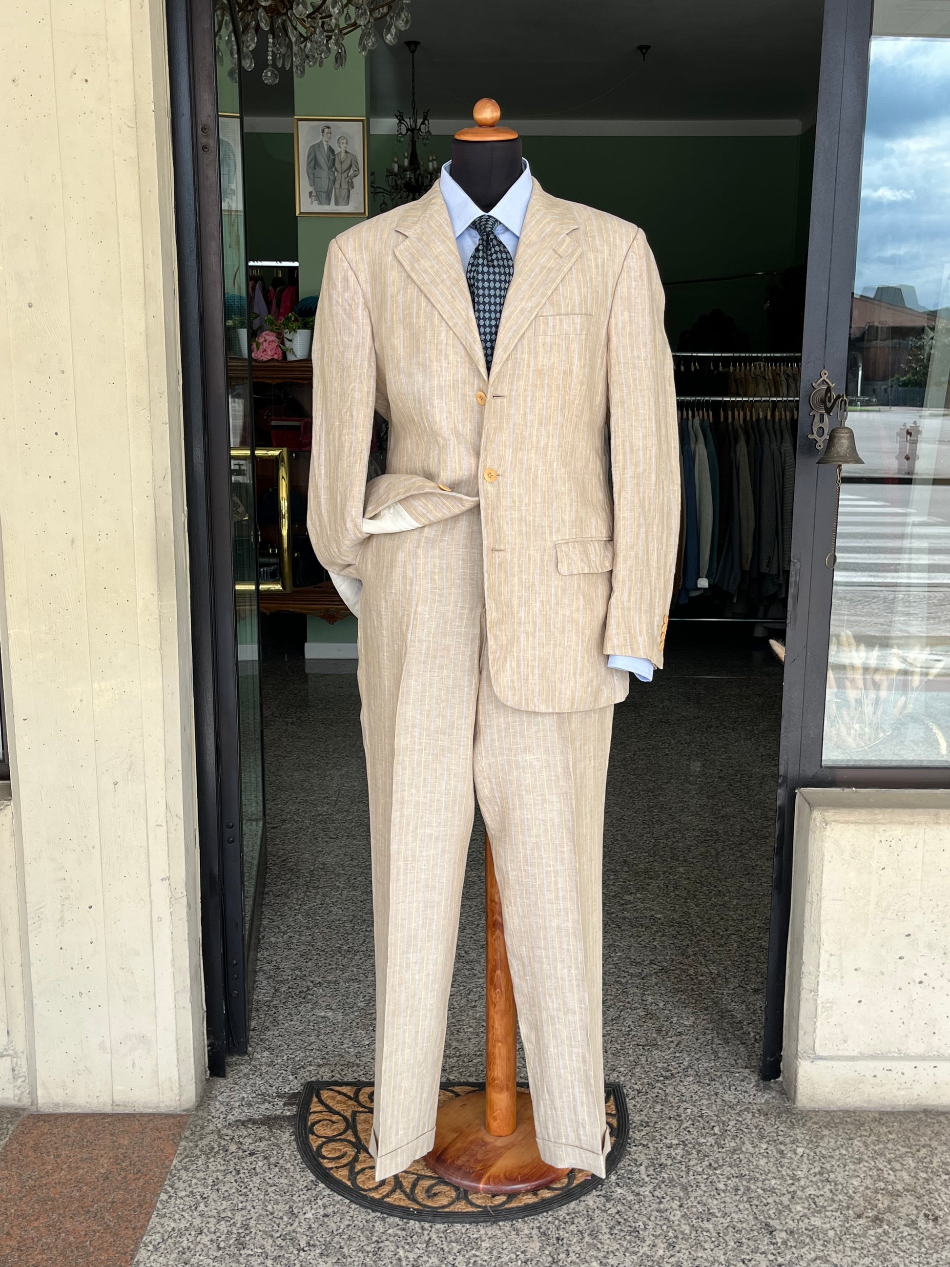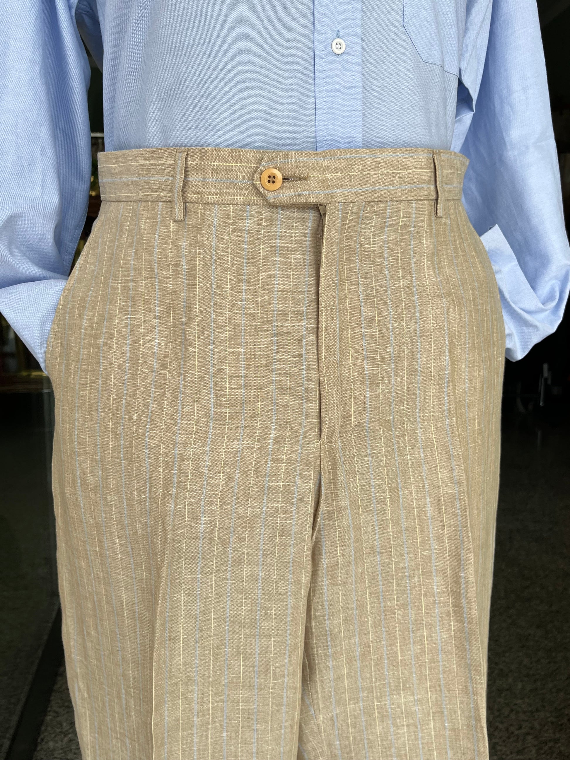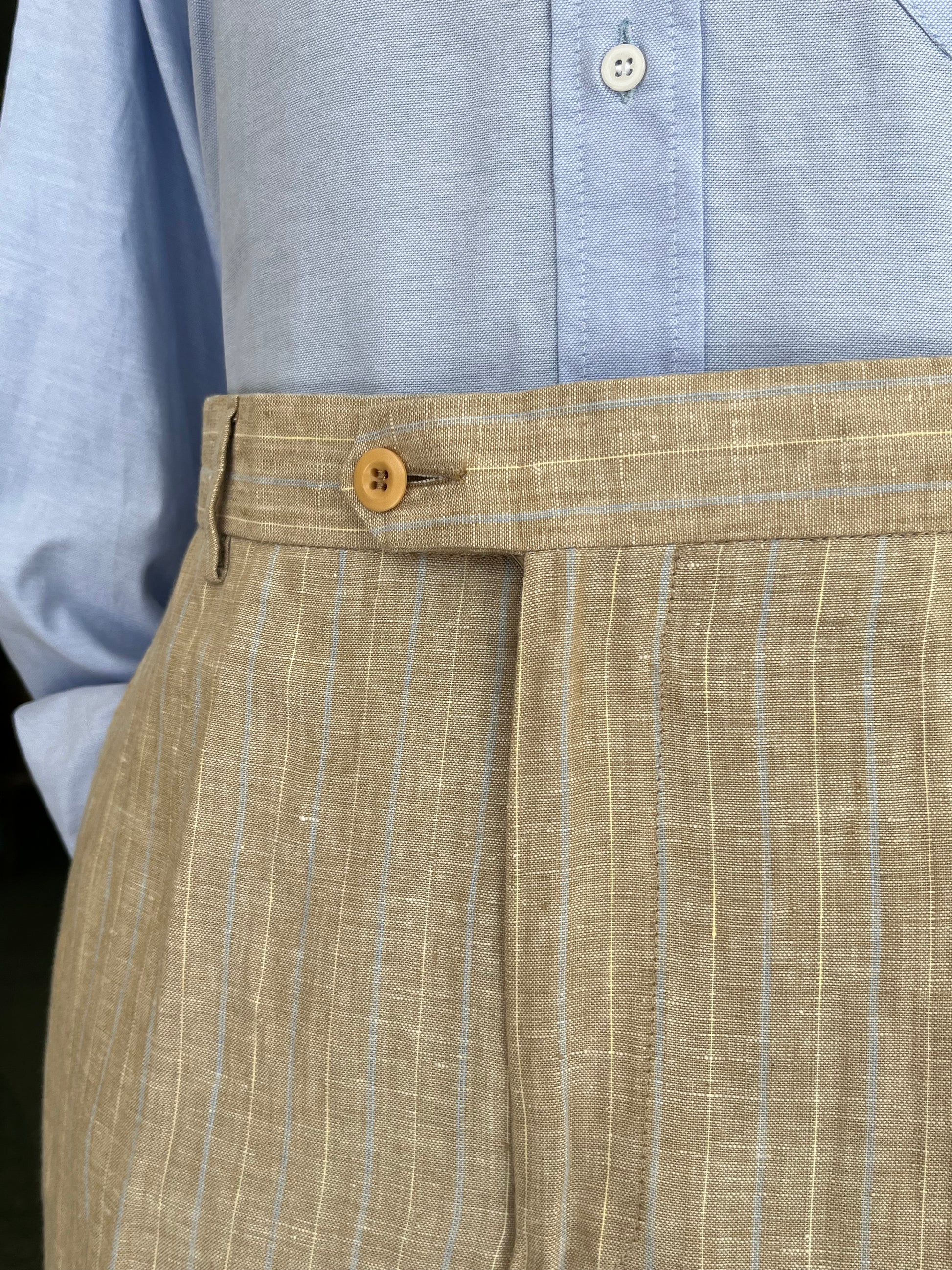 Il tessuto è un 100% puro lino, di colore beige gessato di celeste e bianco.