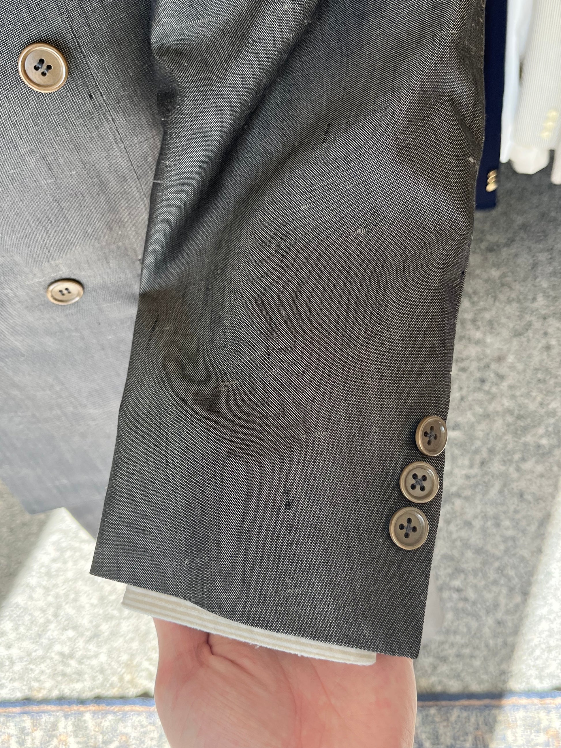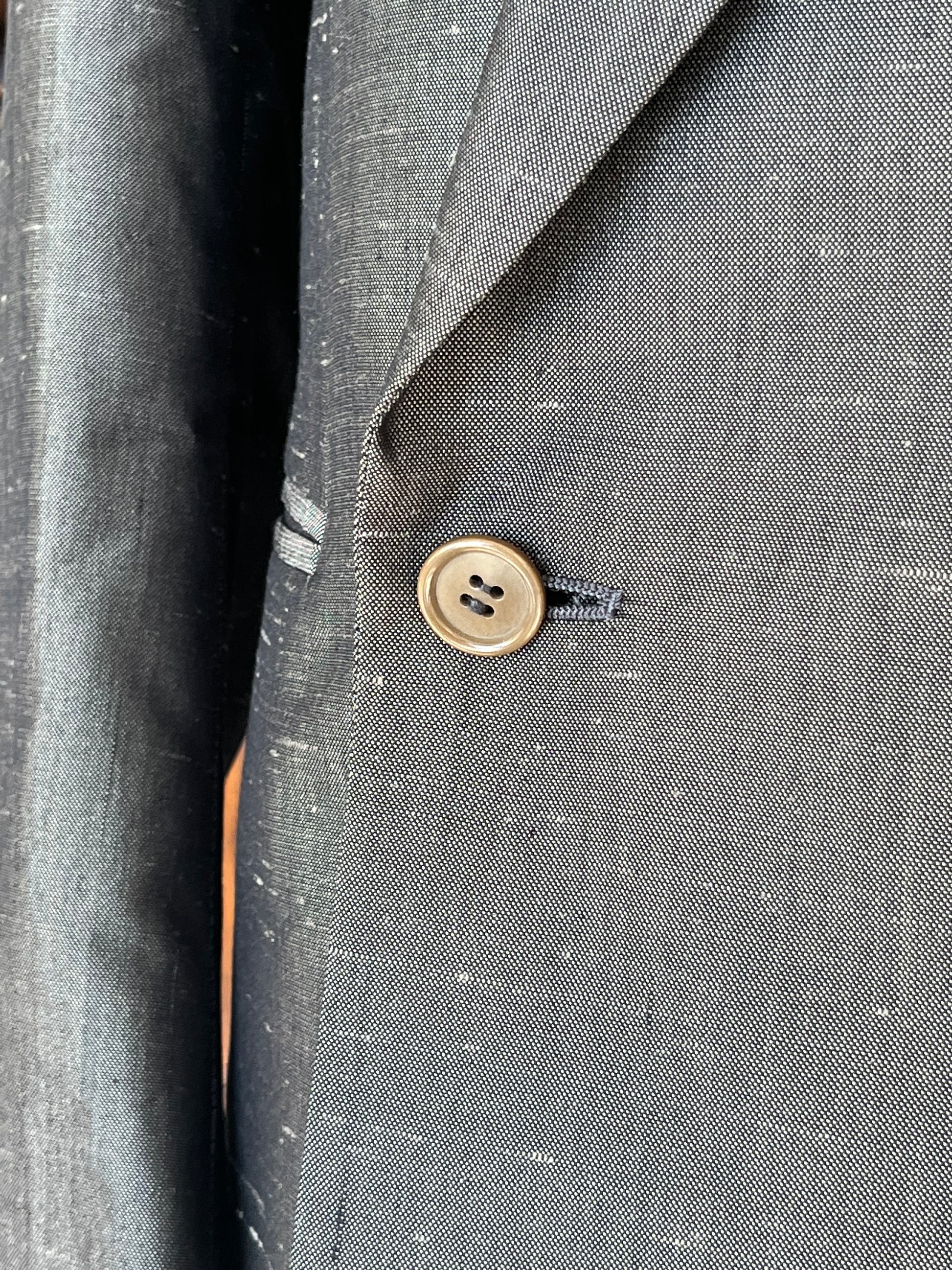 La giacca è un doppiopetto, abbottonatura 4x1, baveri a lancia, tasche a filetto.
