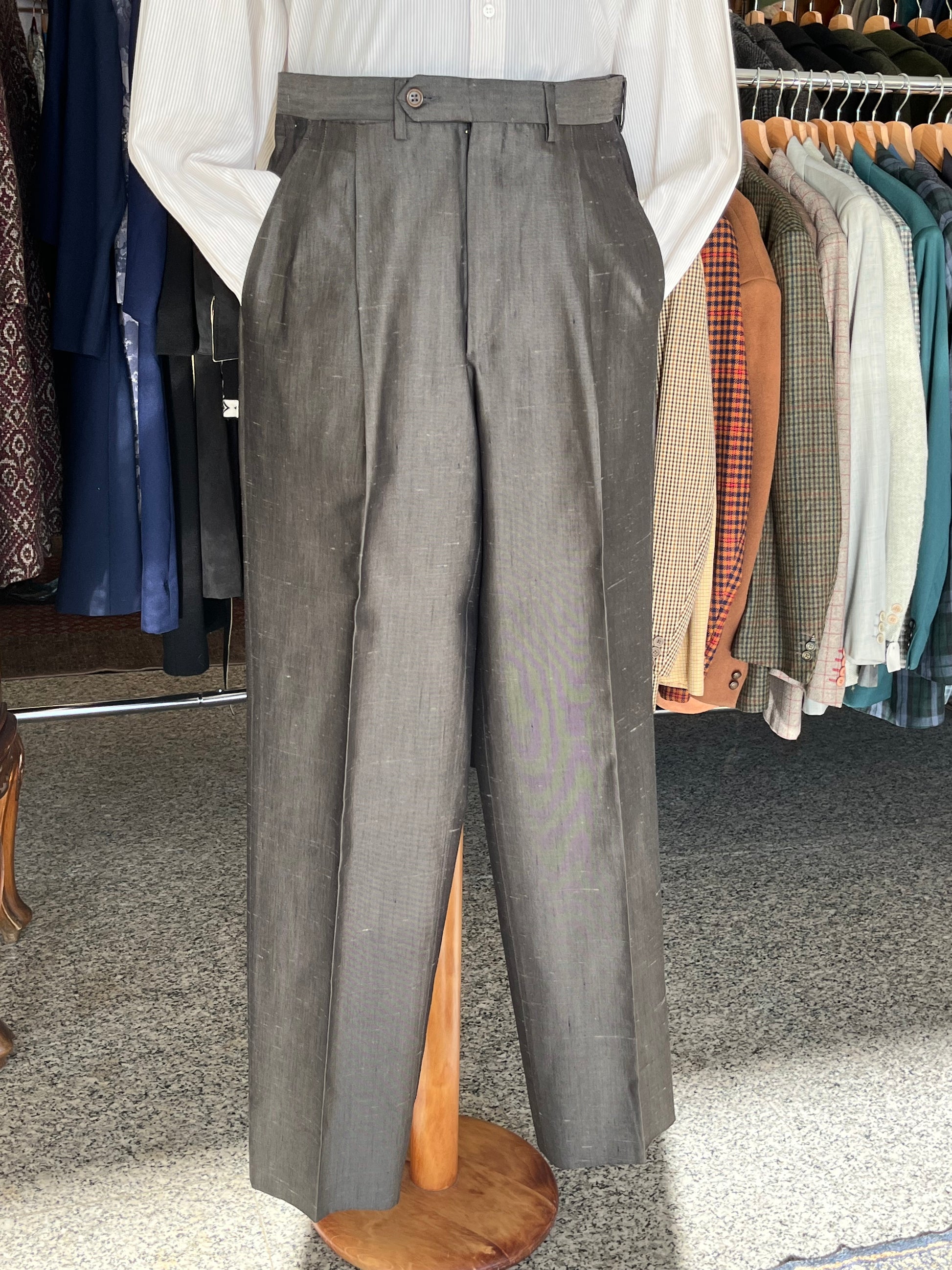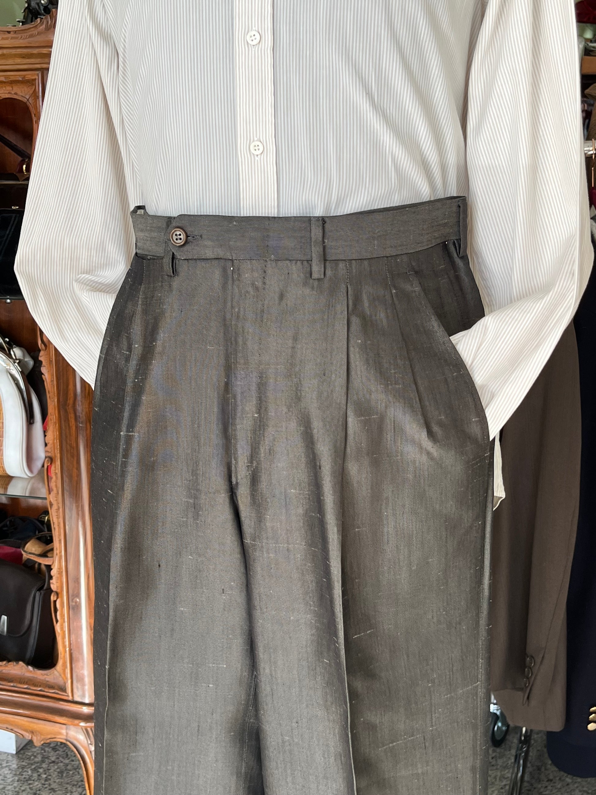 I calzoni hanno un taglio classico, con vita alta, doppia piega in vita ed un taglio dritto.