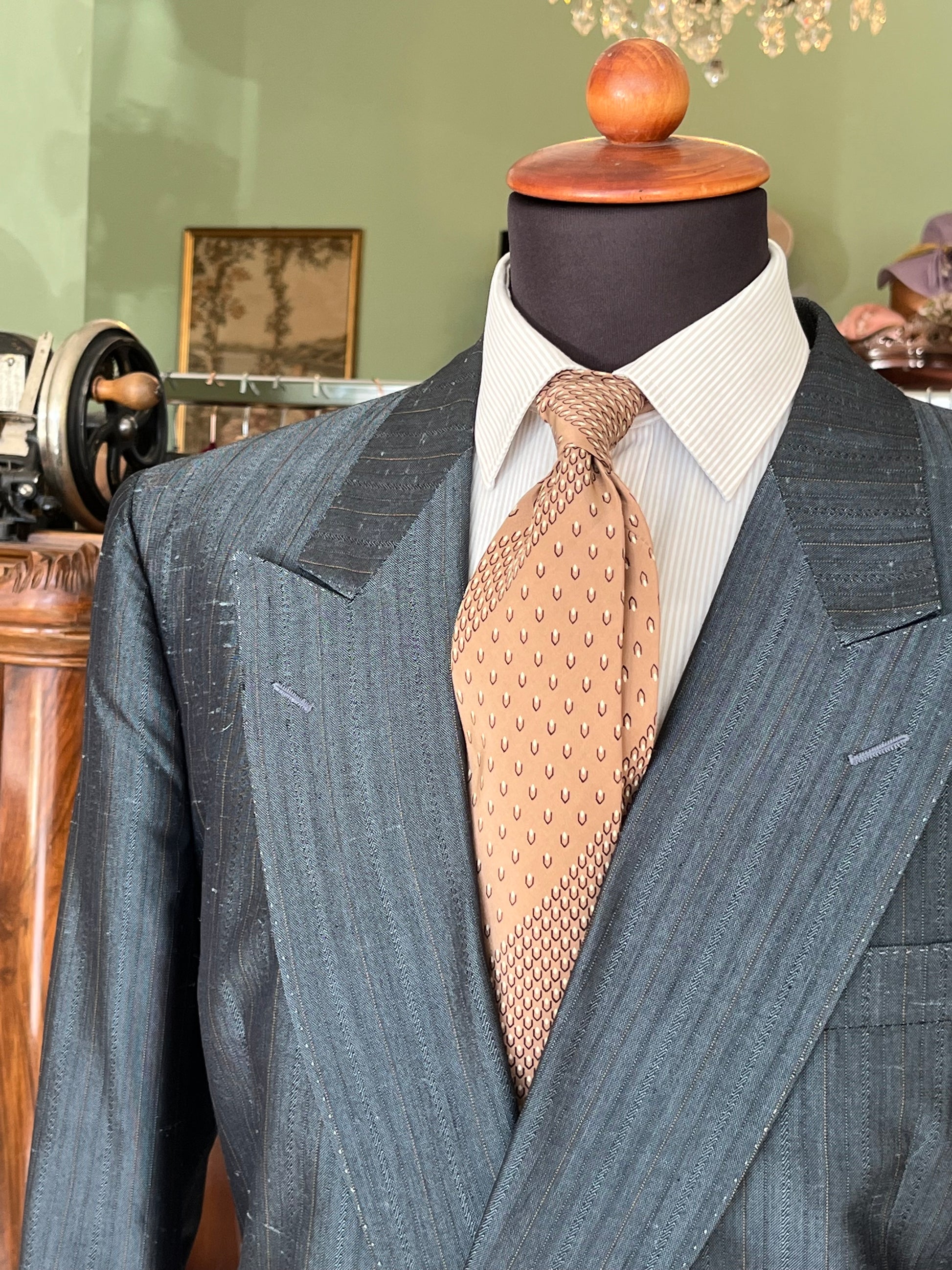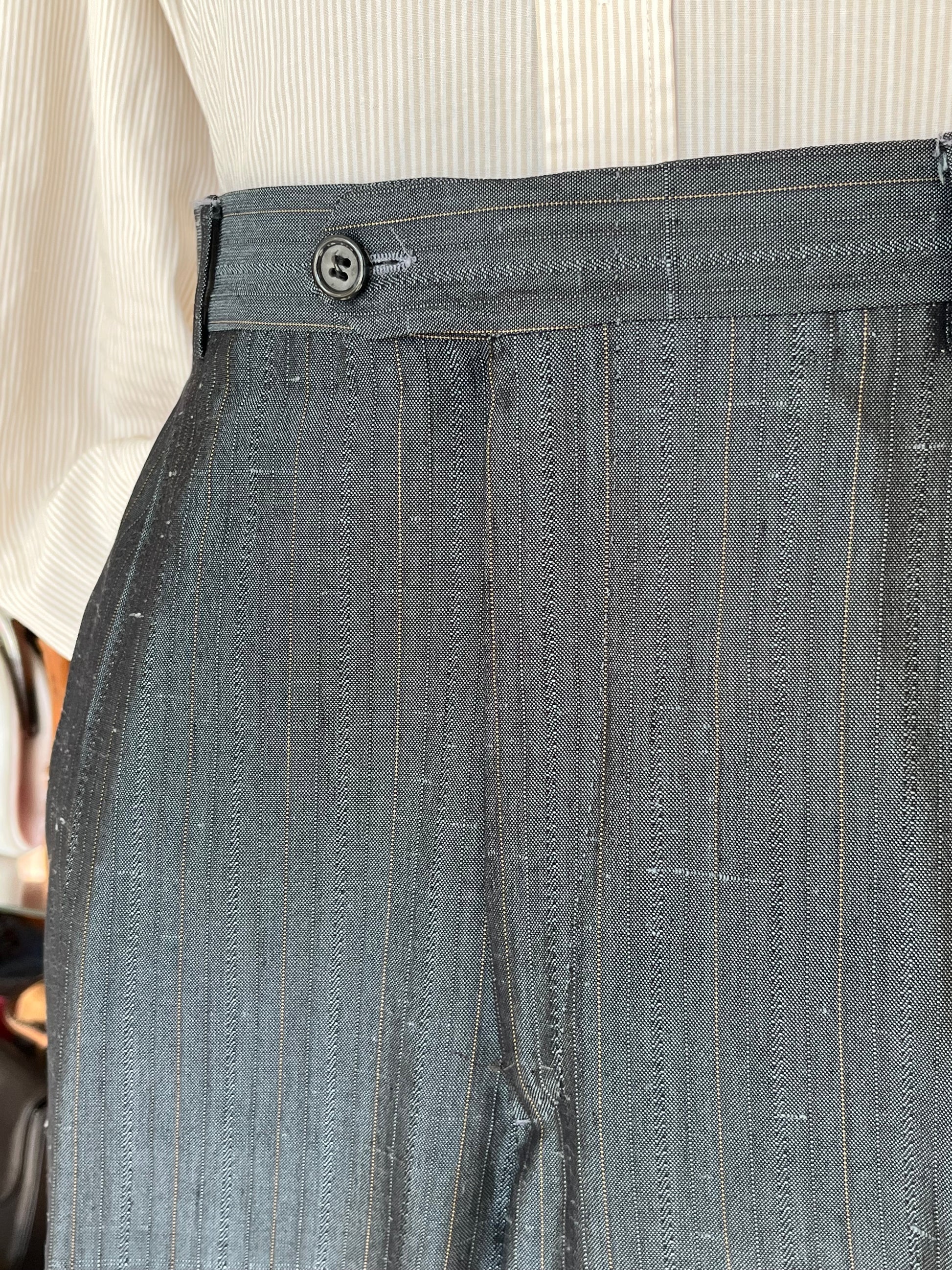 Il tessuto è un 100% puro shantung di seta, di colore bluette con gessatura marrone.