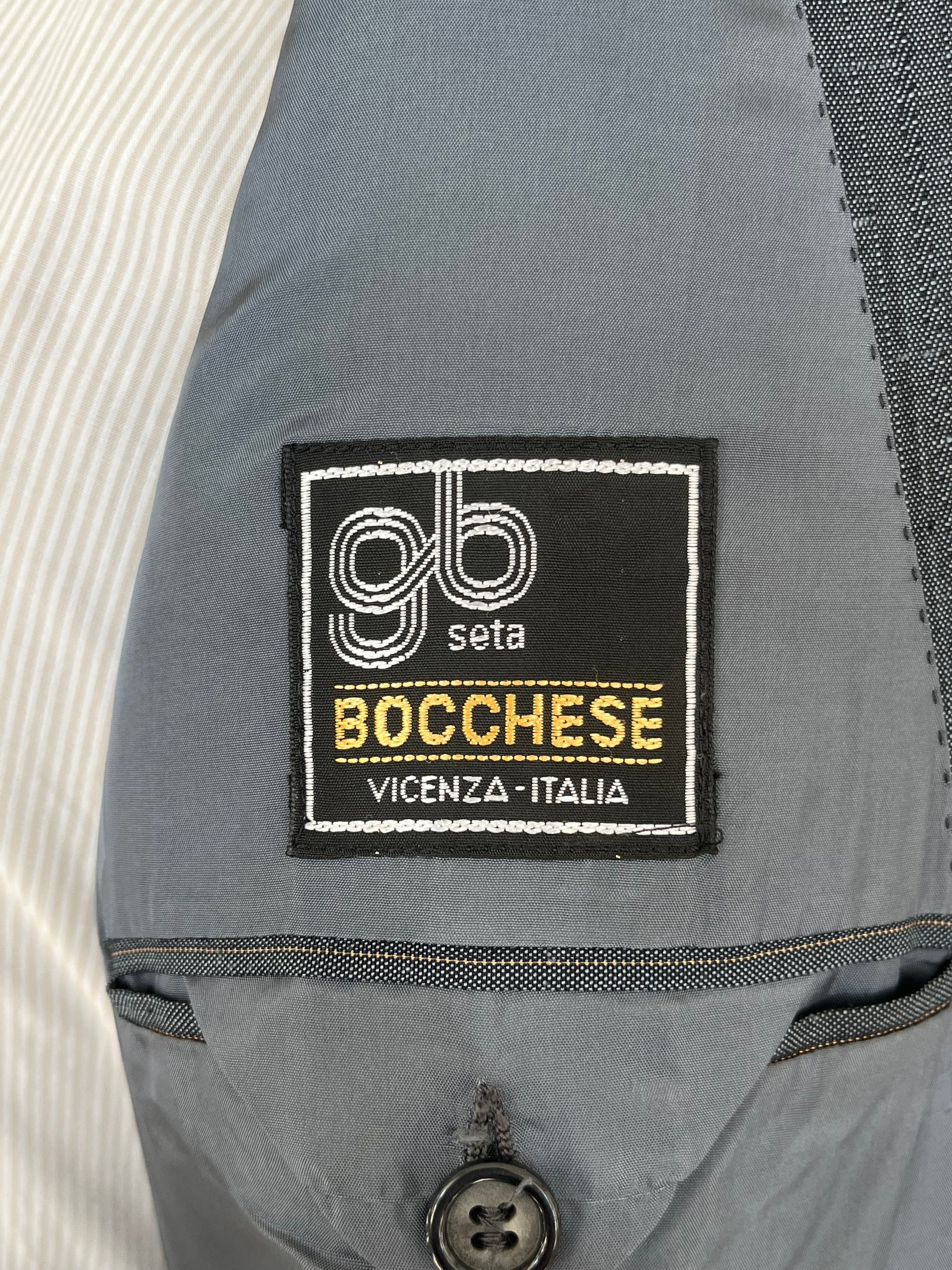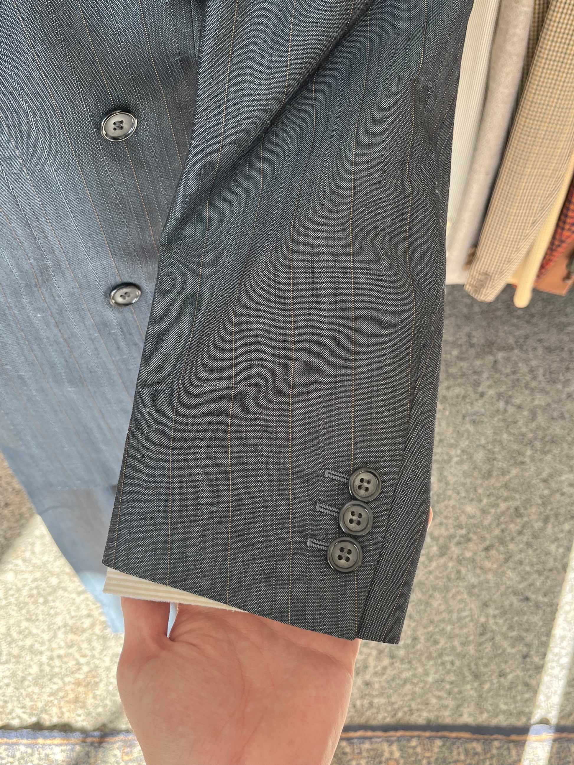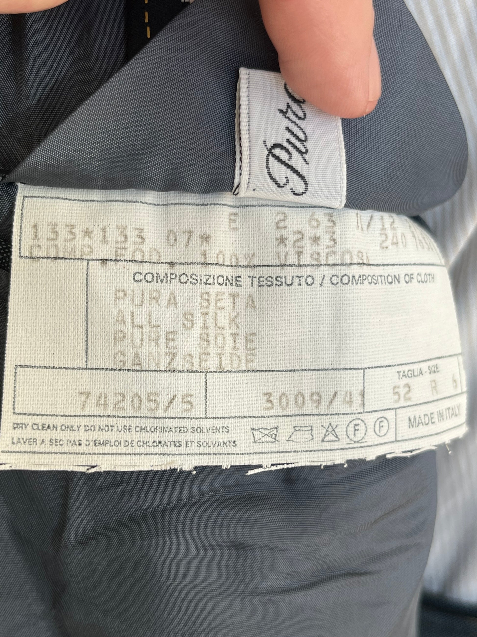 La giacca è un doppiopetto, abbottonatura 4x1, baveri a lancia, tasche a filetto.