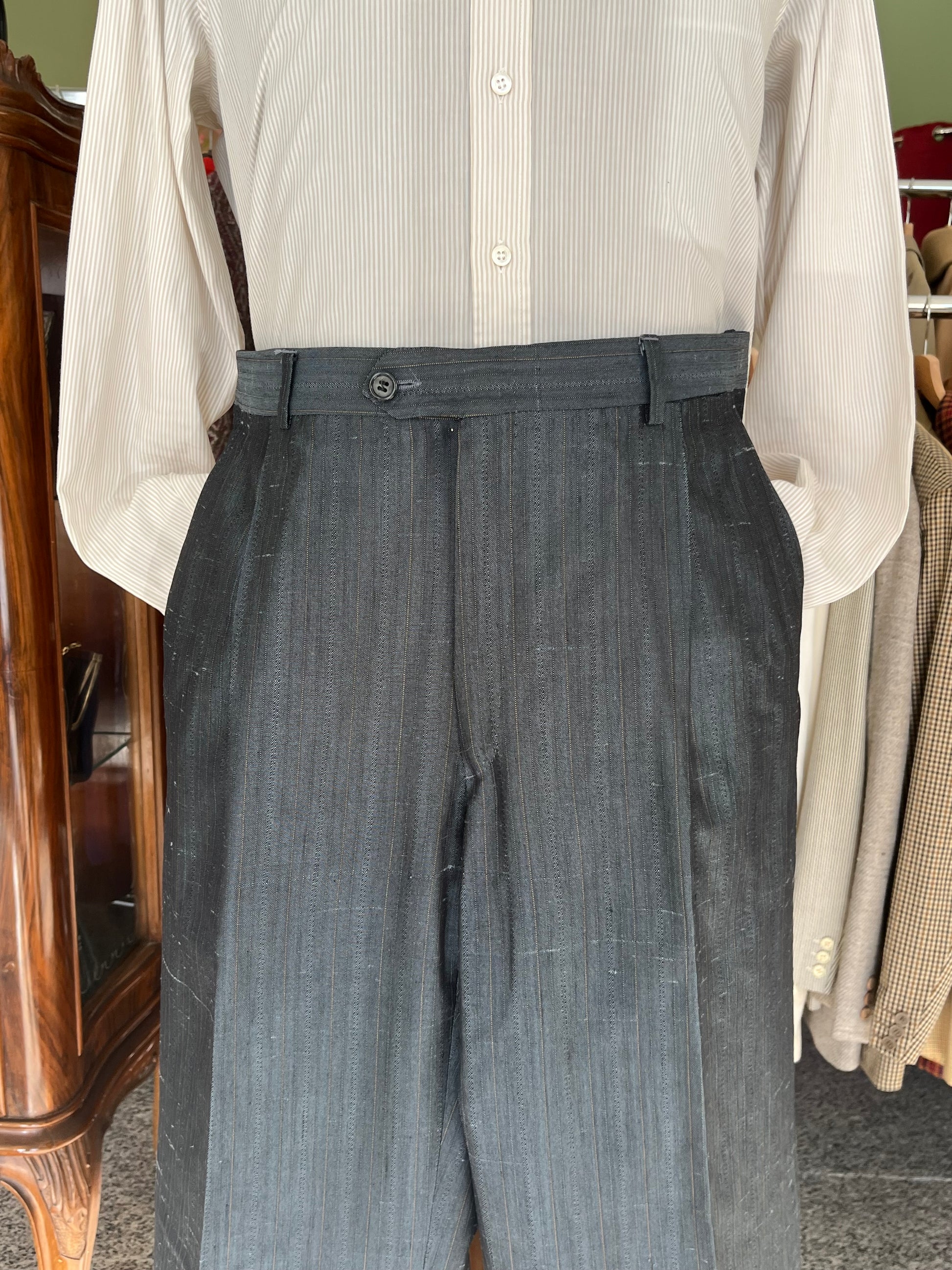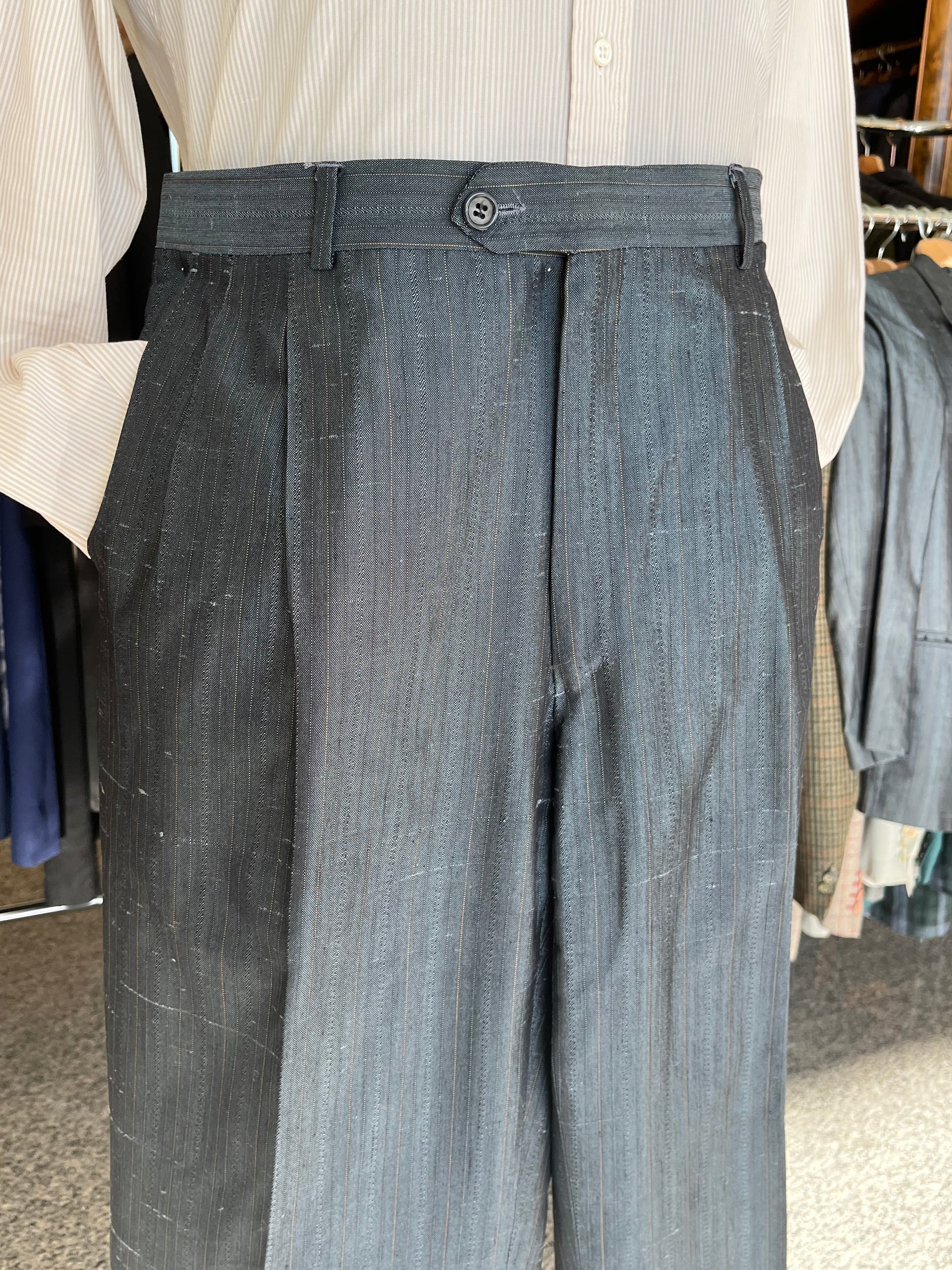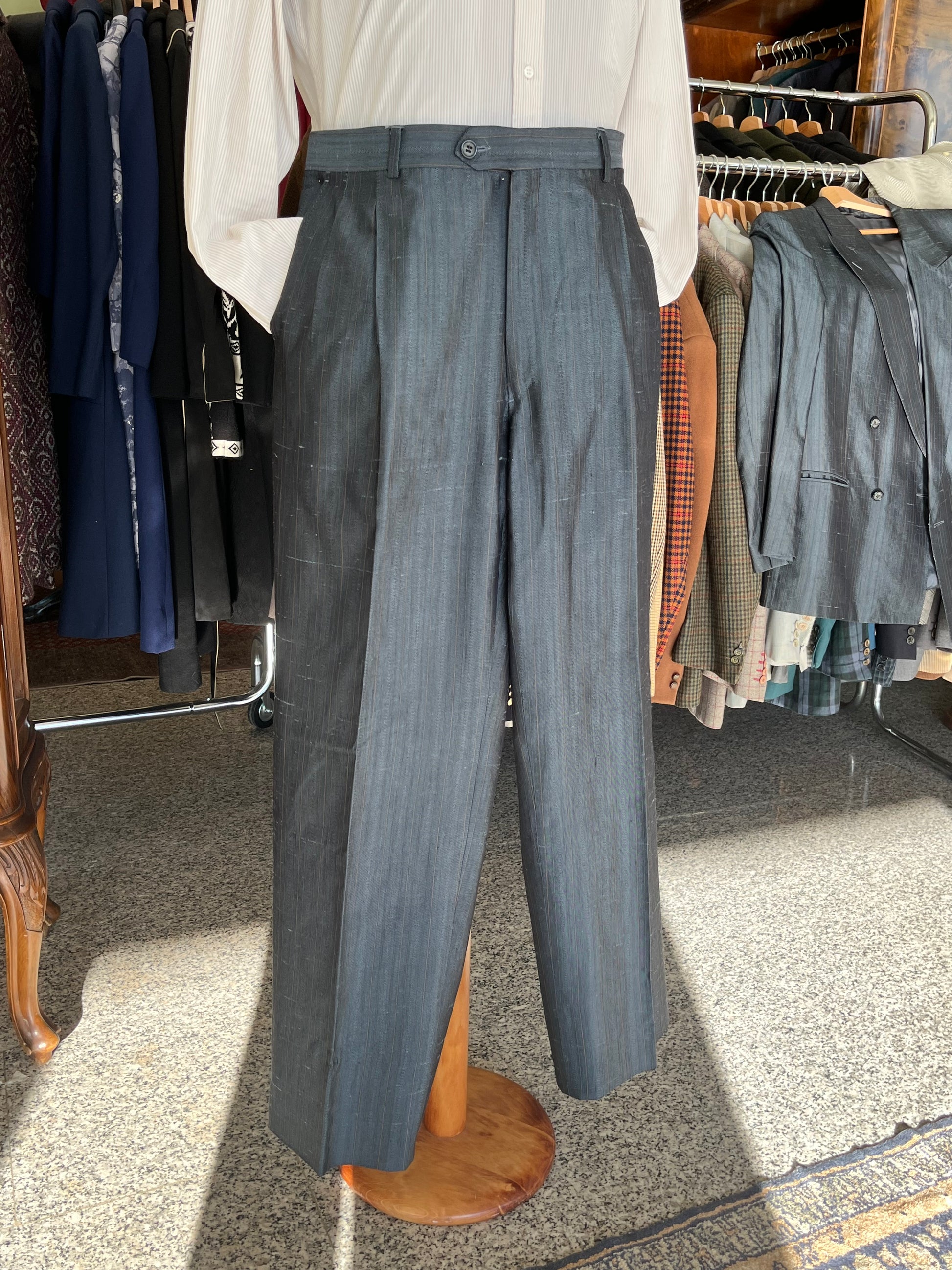 I calzoni hanno un taglio classico, con vita alta, doppia piega in vita ed un taglio dritto.