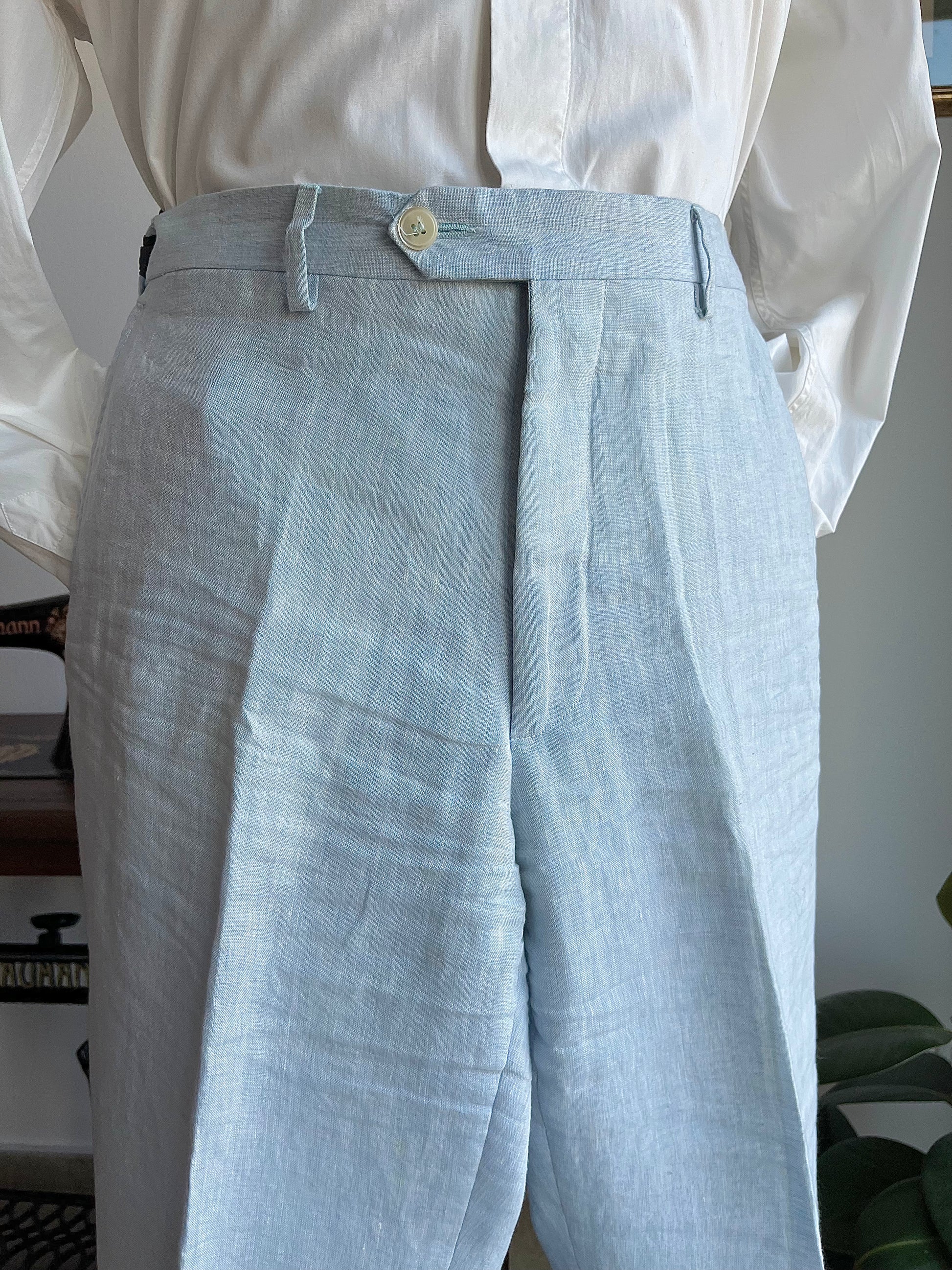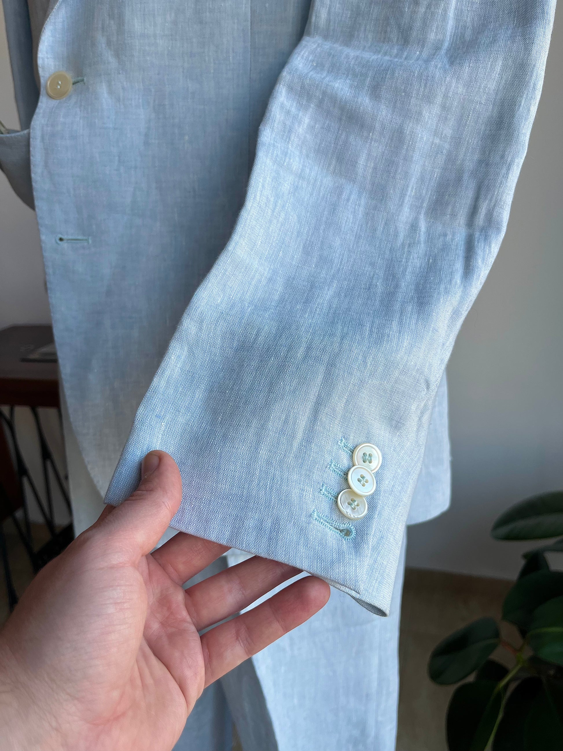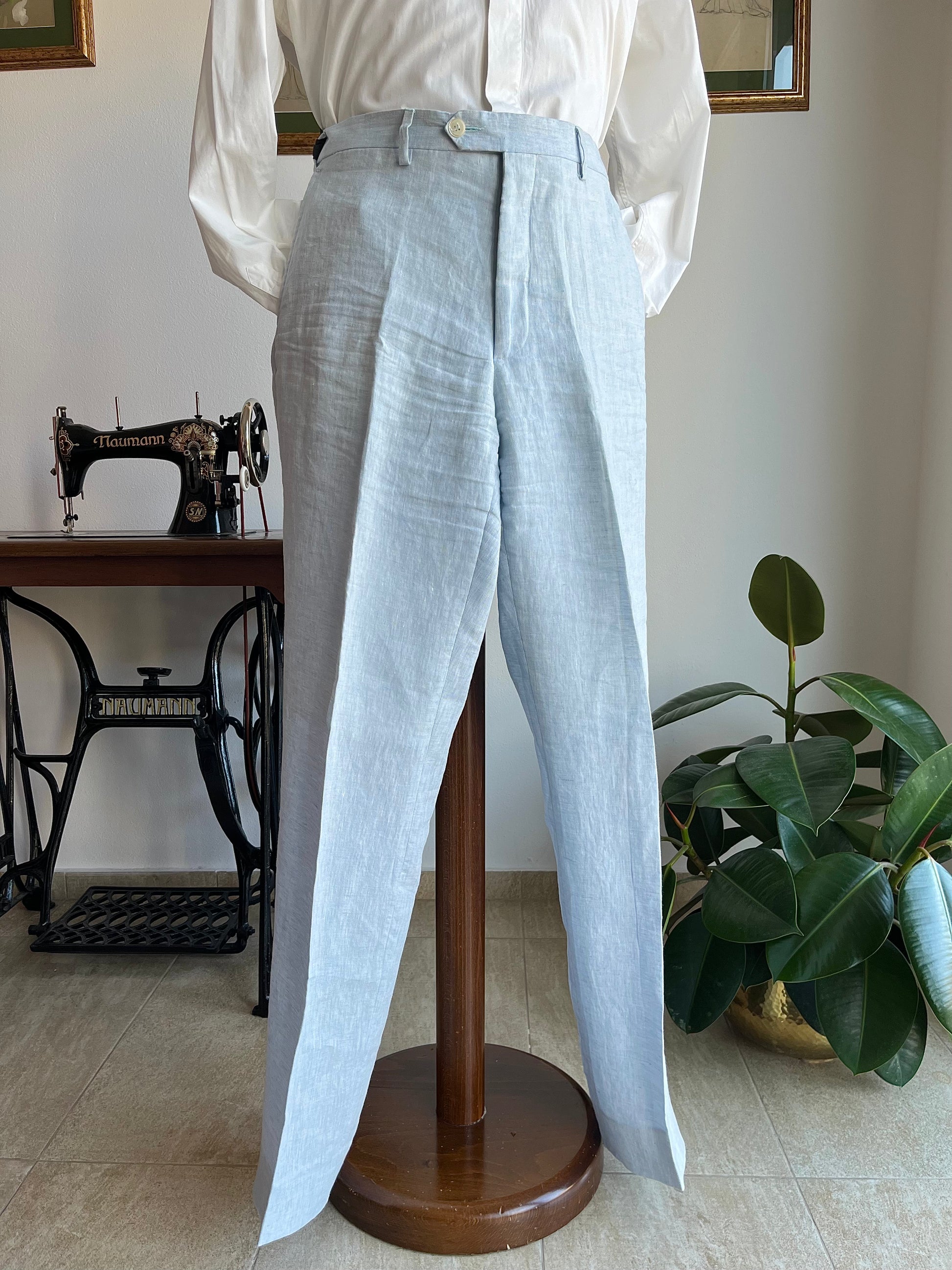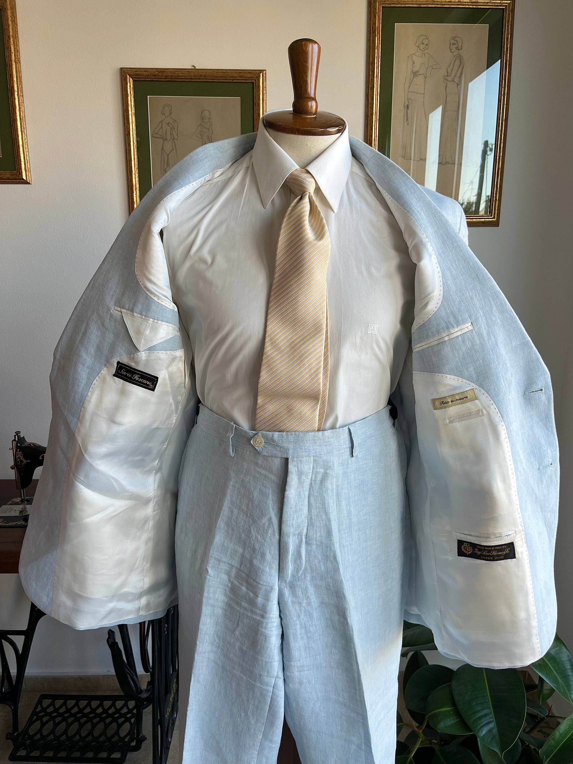 Il tessuto è 100% puro lino di Loro Piana di colore celeste.