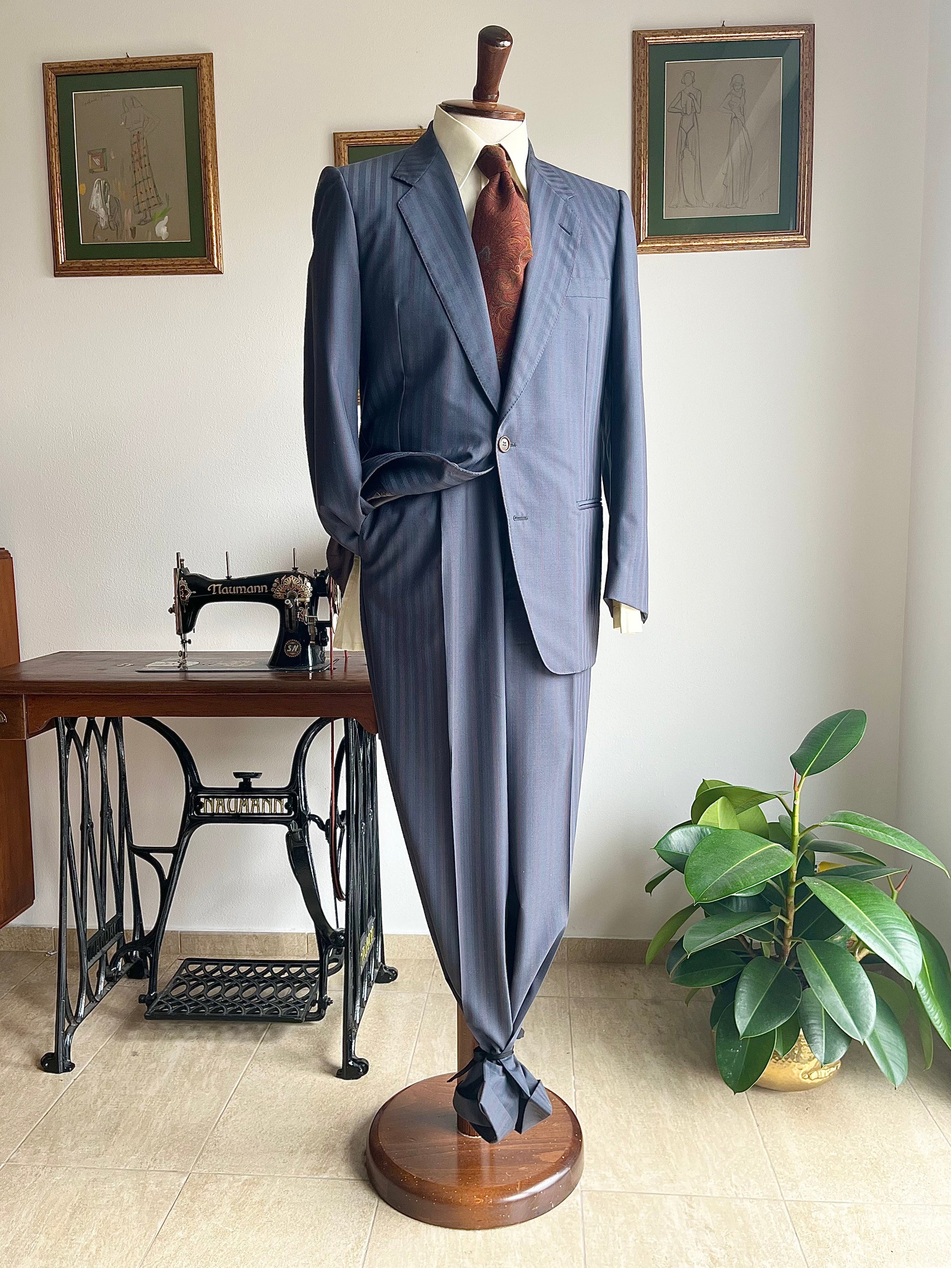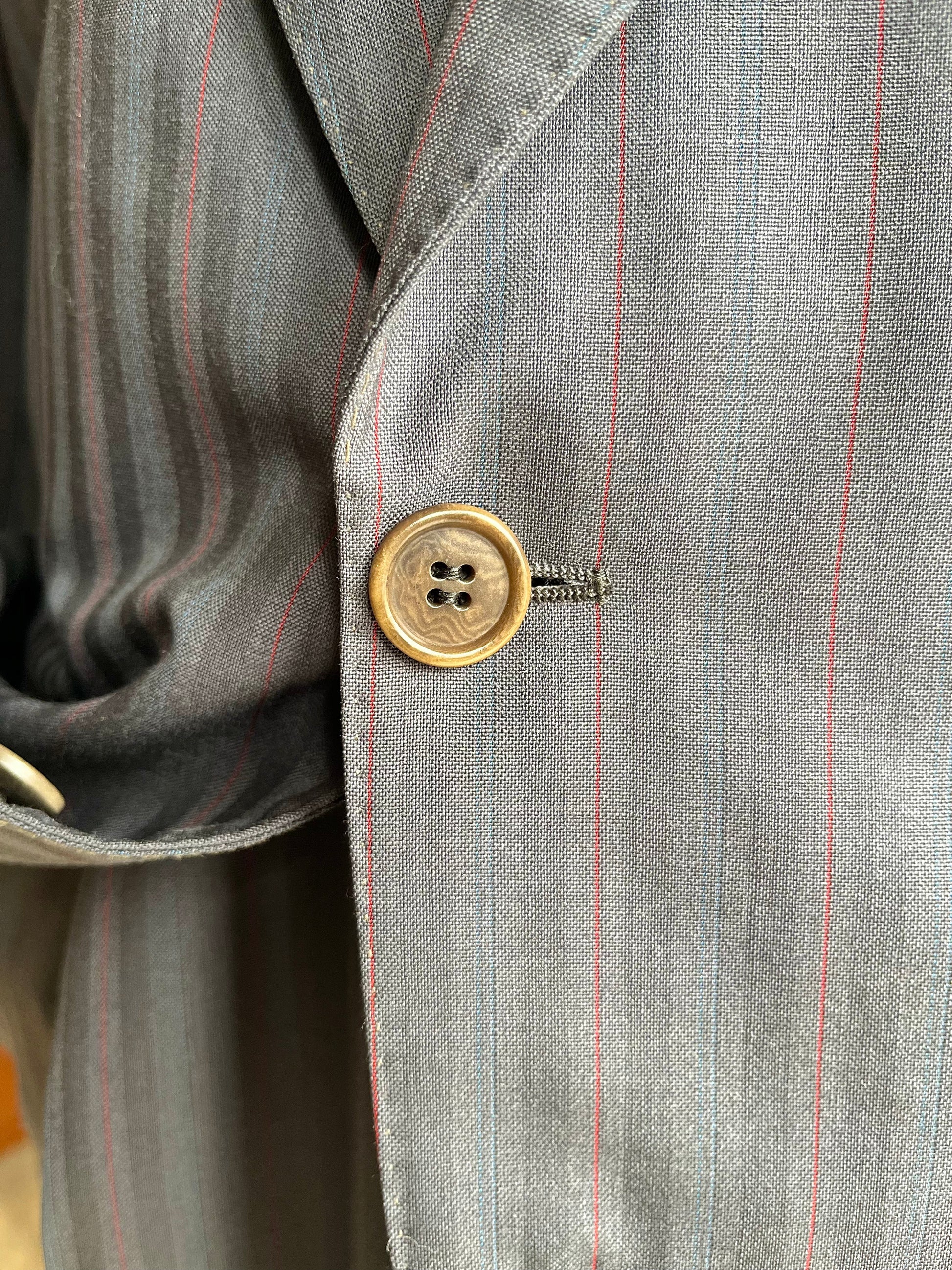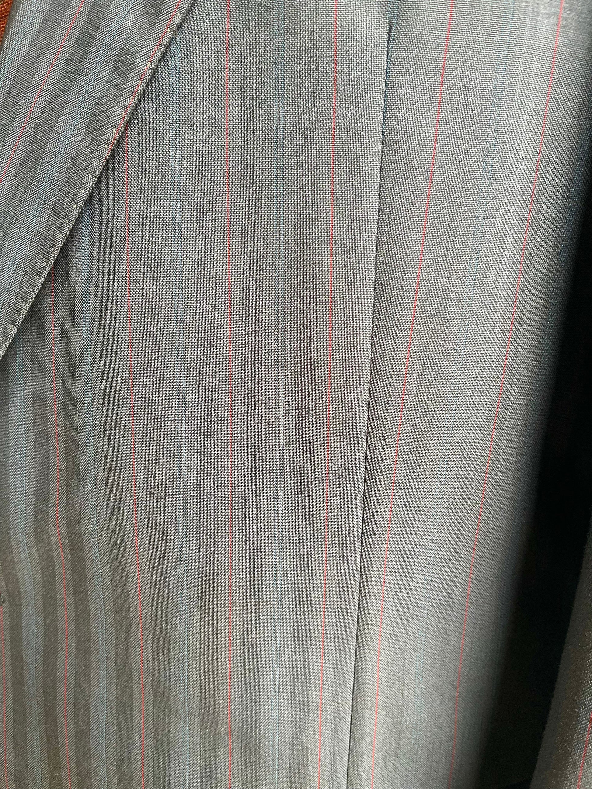 Il tessuto è 100% pura lana di pesantezza medio-pesante, di colore grigio (con sottotono blu) con leggera gessatura di colore blu e rosso.