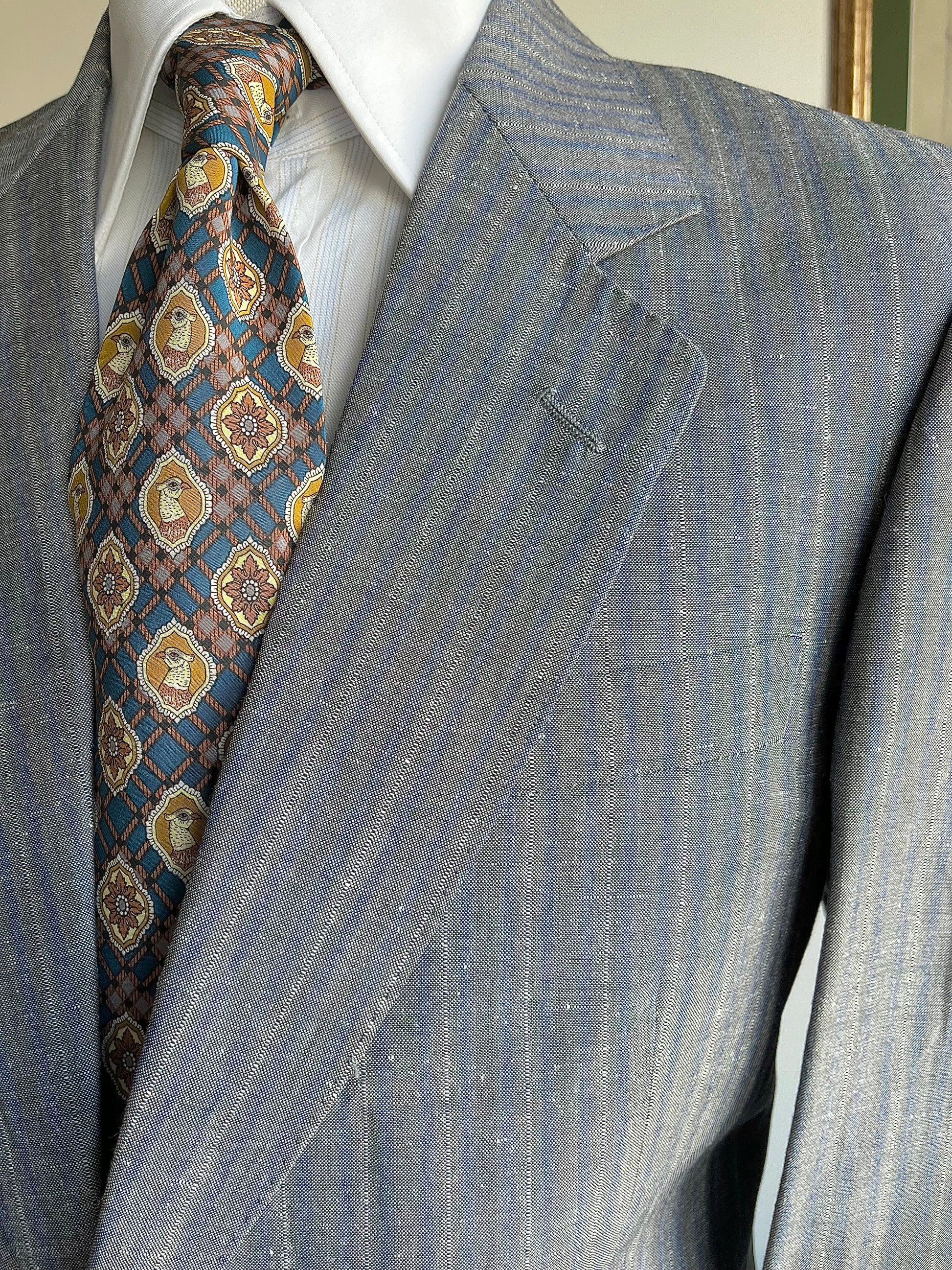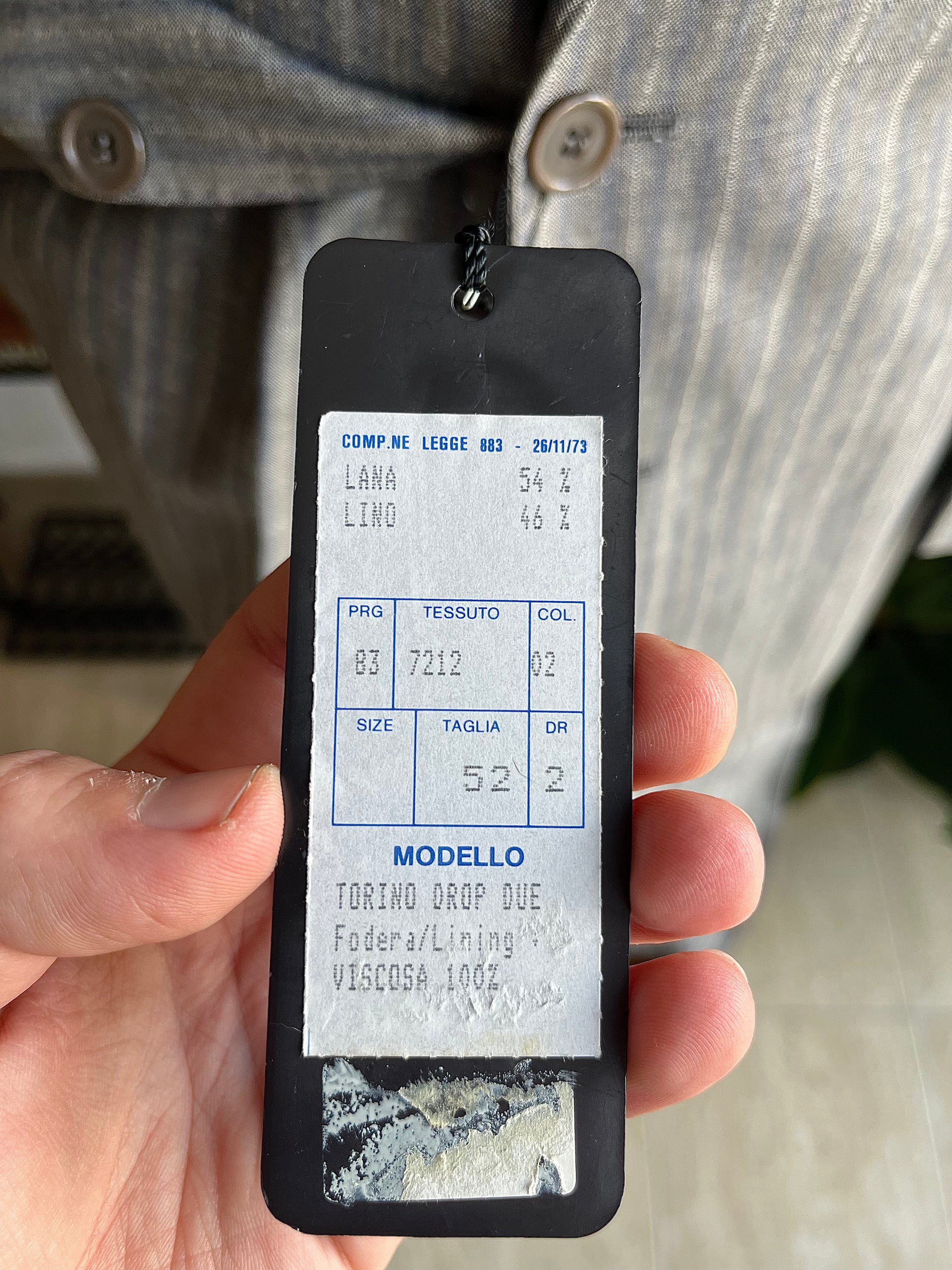 Il tessuto è 54% lana e 46% lino. Il che lo rende freschissimo, grazie al lino, ma si stropiccia meno del puro lino. Il completo è un fondo di magazzino, mai utilizzato, con ancora tutte le sue etichette originali dell'epoca.