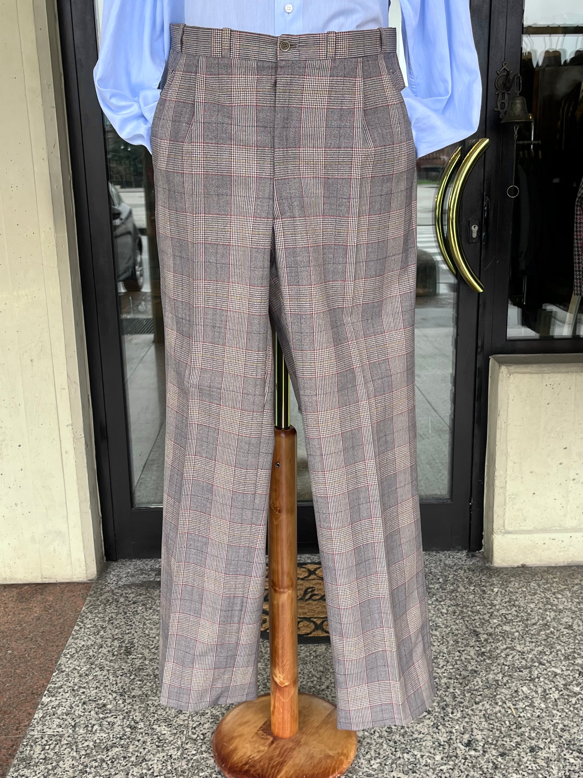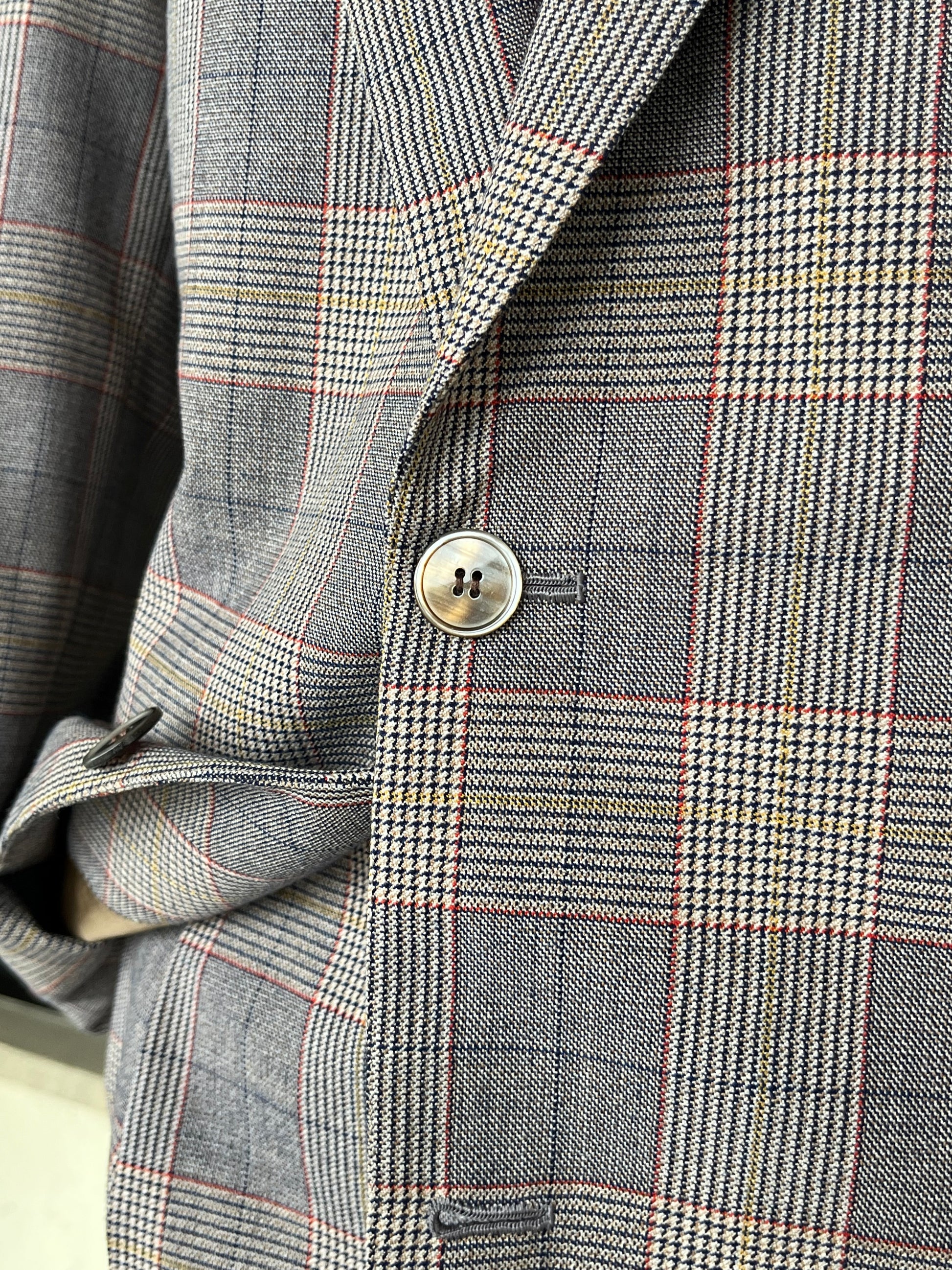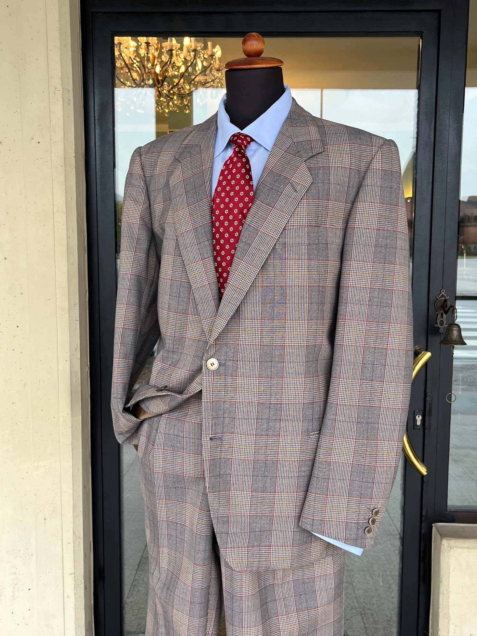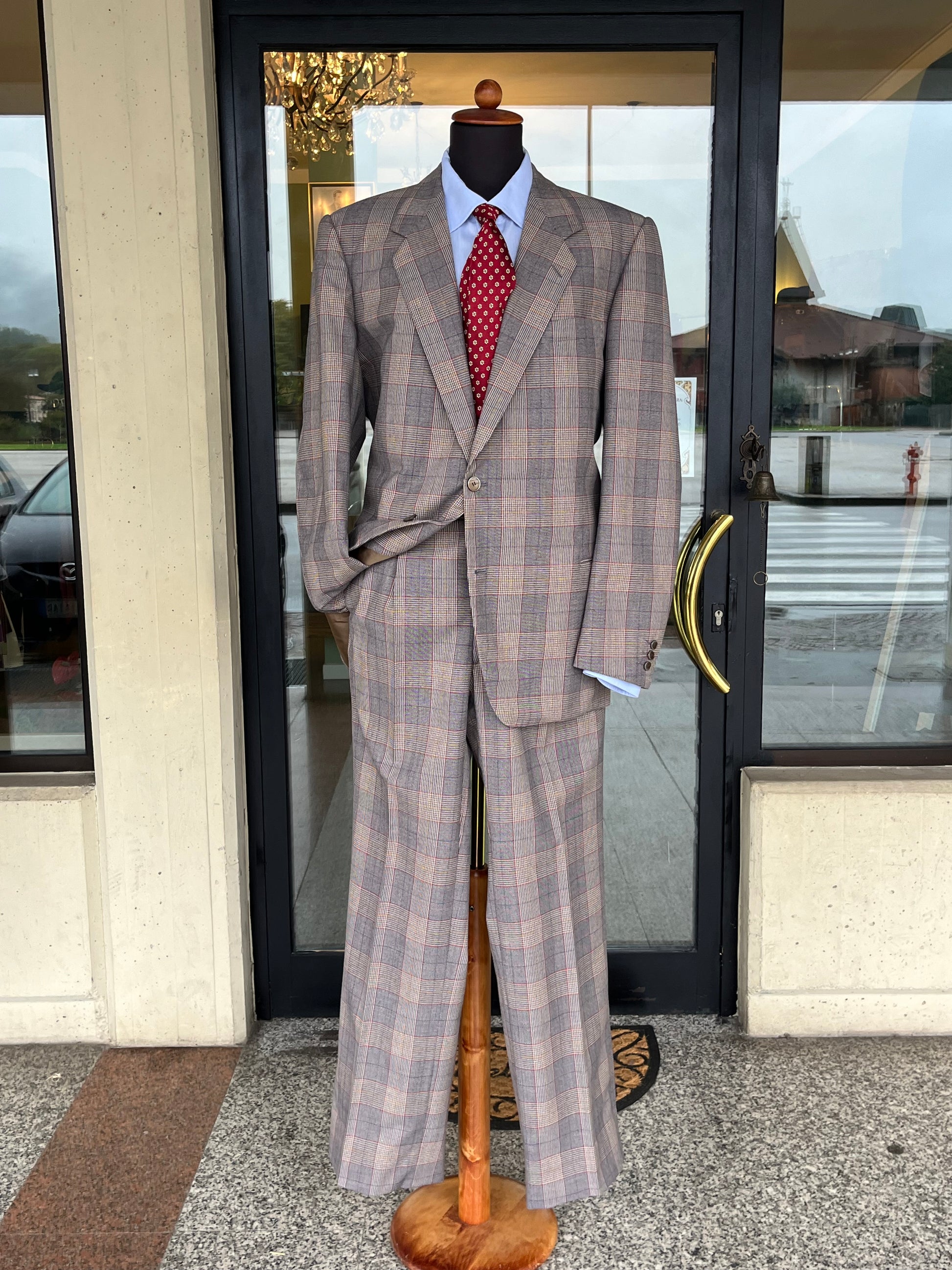 Completo sartoriale anni ‘80 in 100% lana principe di Galles sui toni del grigio/celeste e rosso.