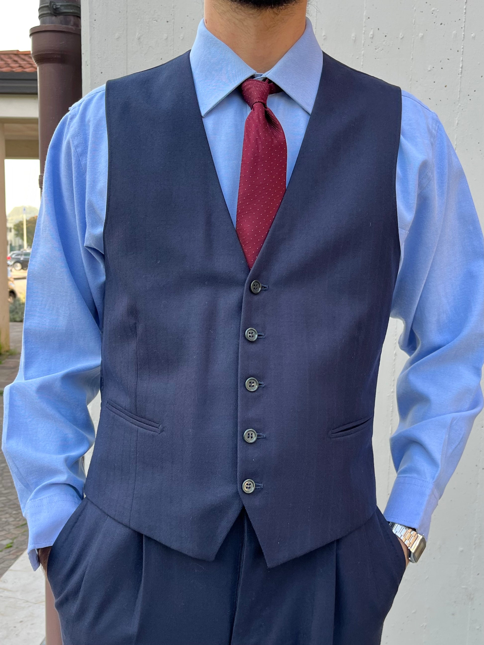 Il panciotto presenta due taschini a filetto e cinque bottoni.