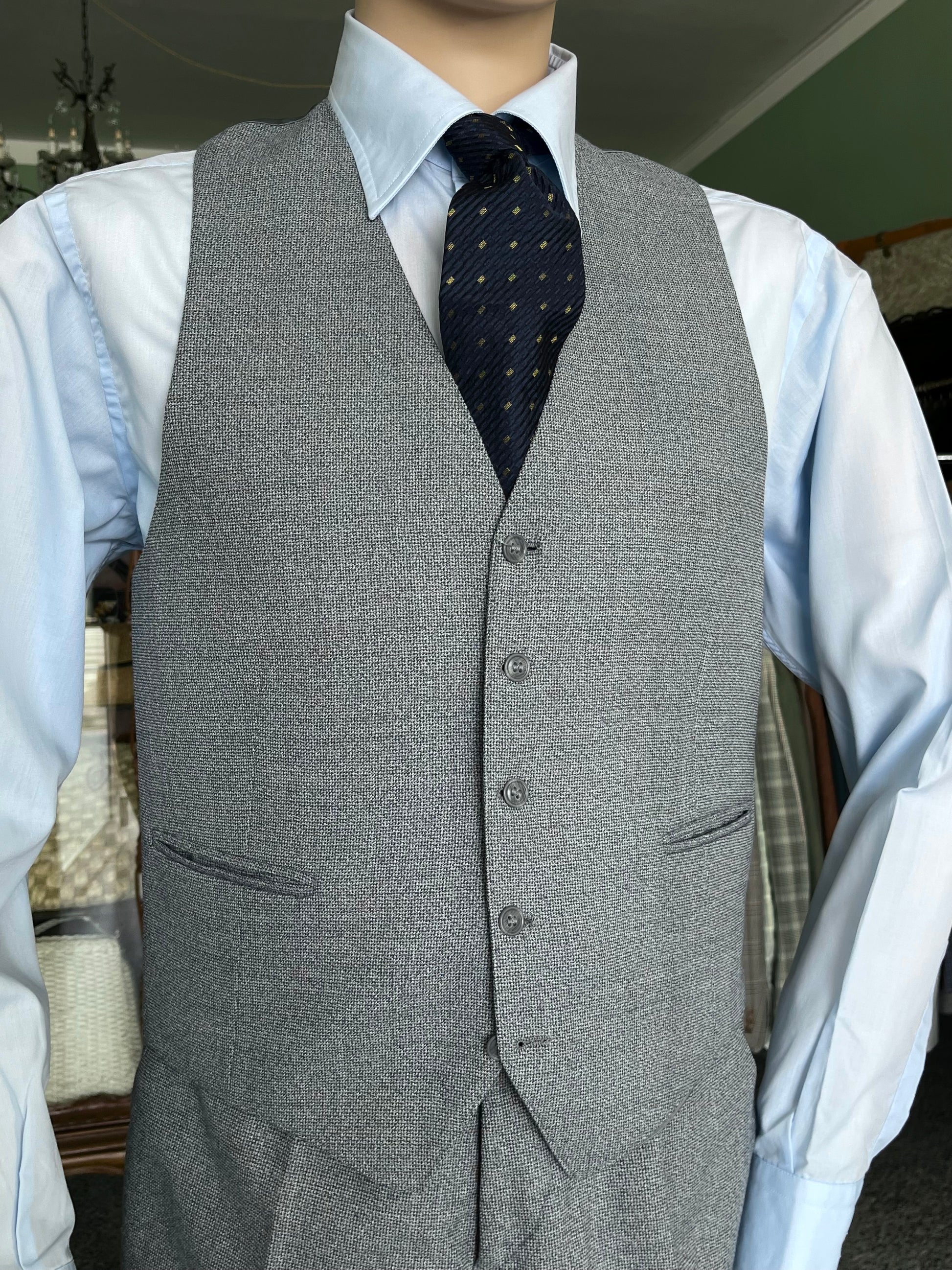 Il panciotto presenta due taschini a filetto e cinque bottoni.