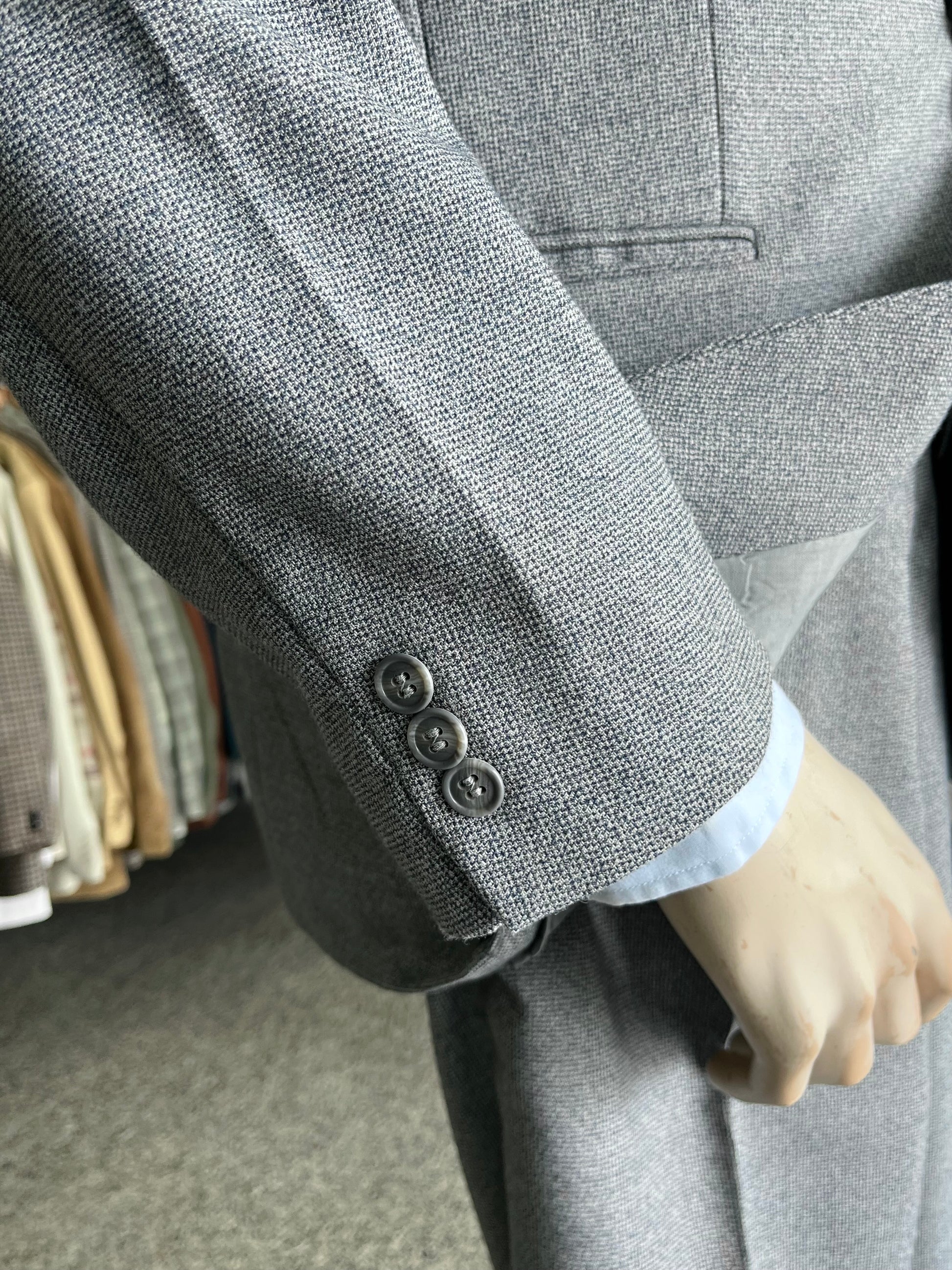 La giacca è un monopetto, due bottoni, baveri a dente, tasche a filetto e spacco sul retro.