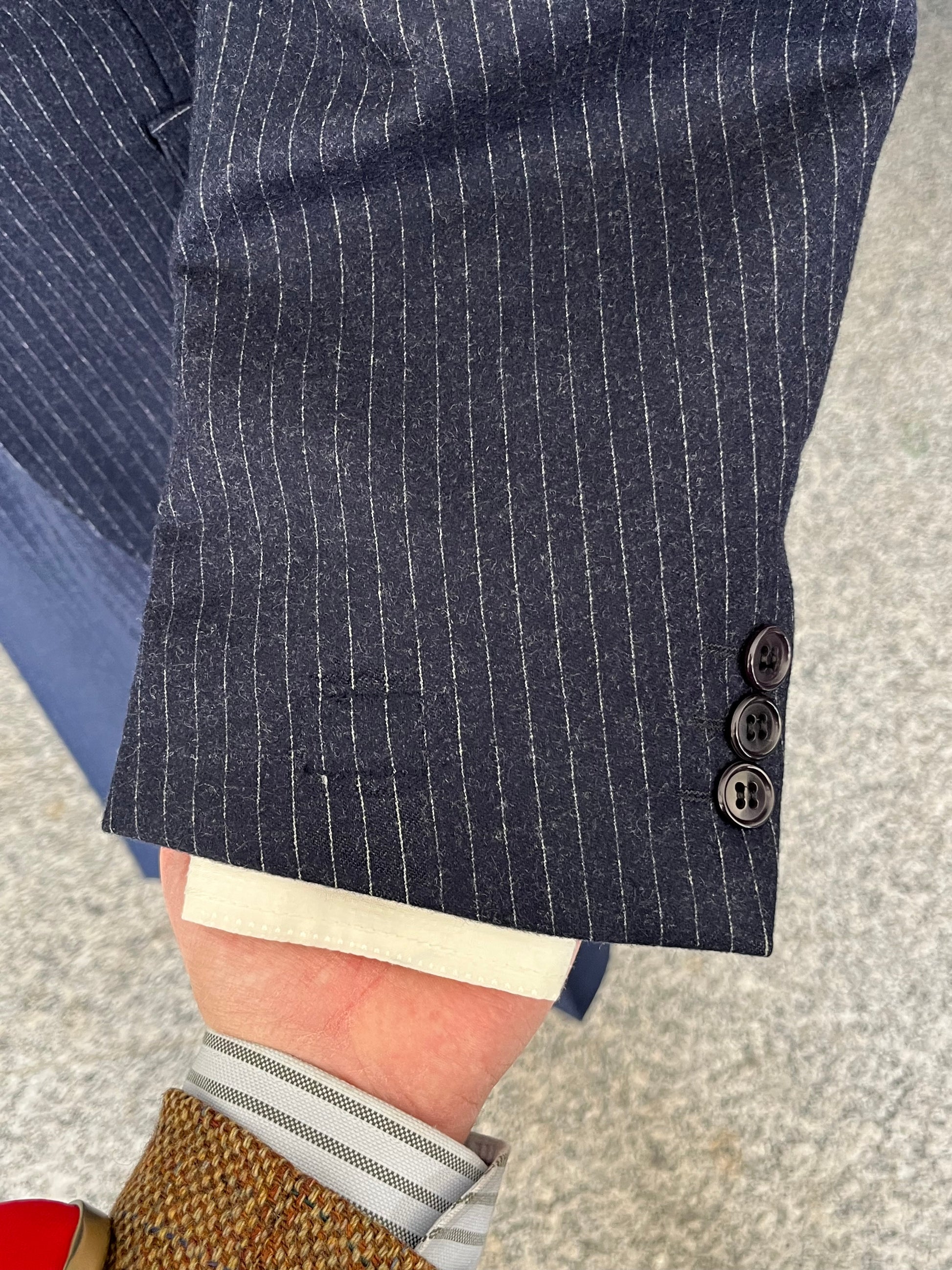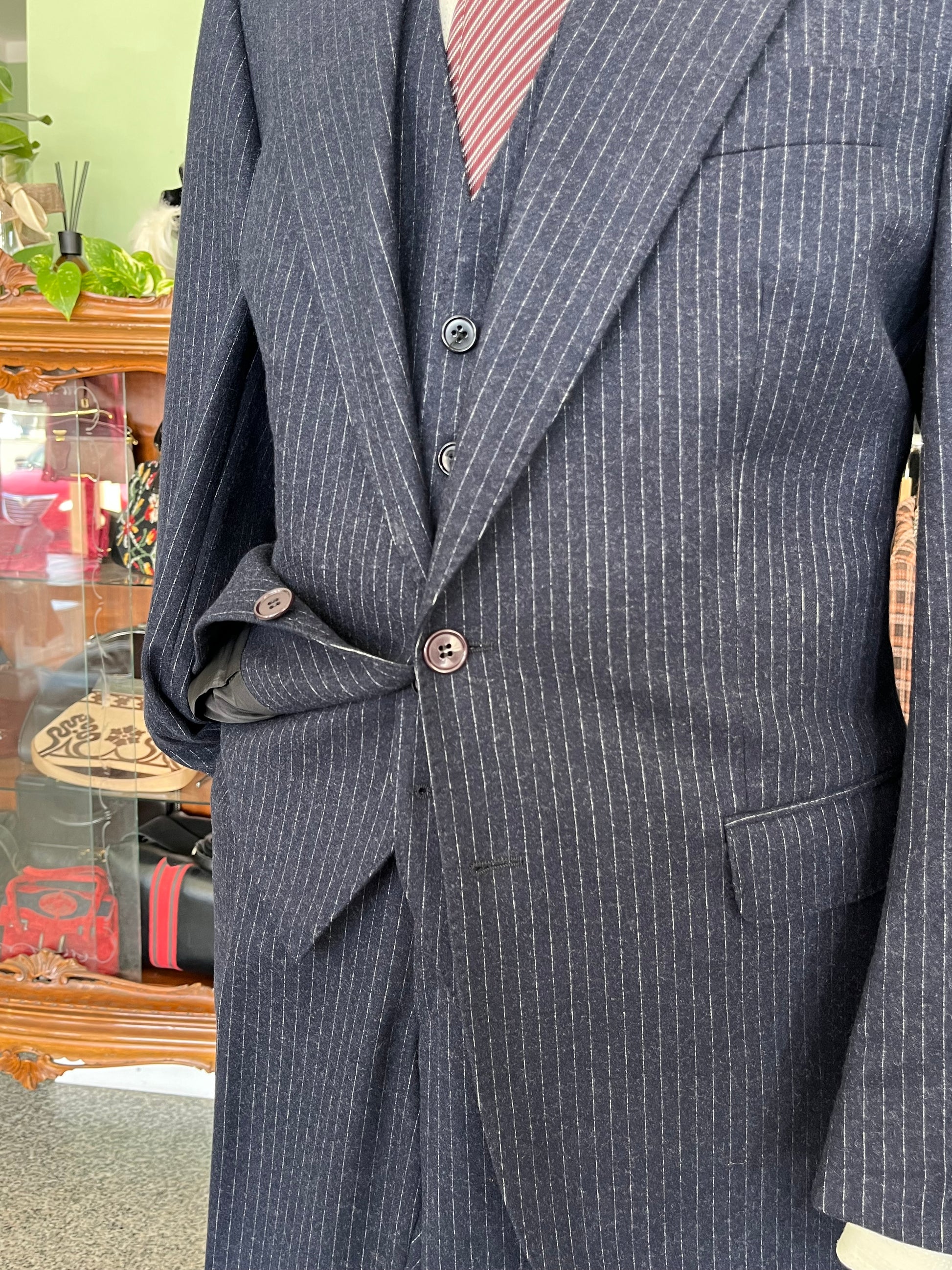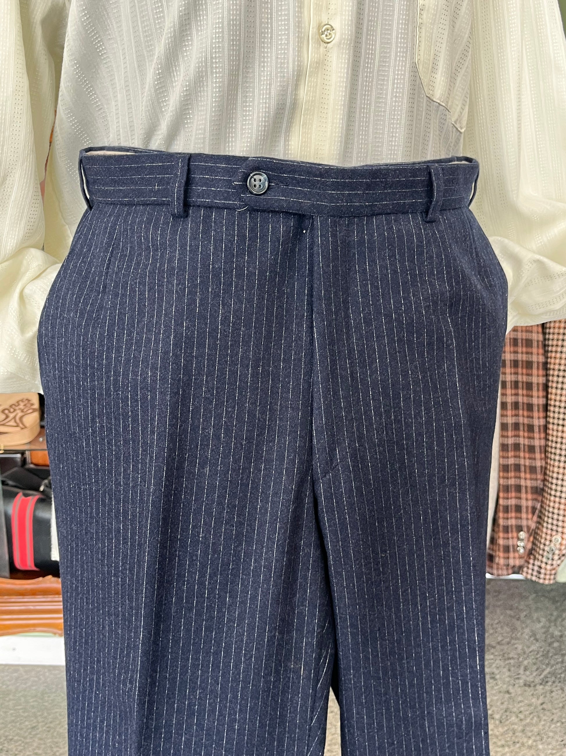 Il tessuto è 100% flanella di lana (morbidissima), di colore blu scuro gessato.