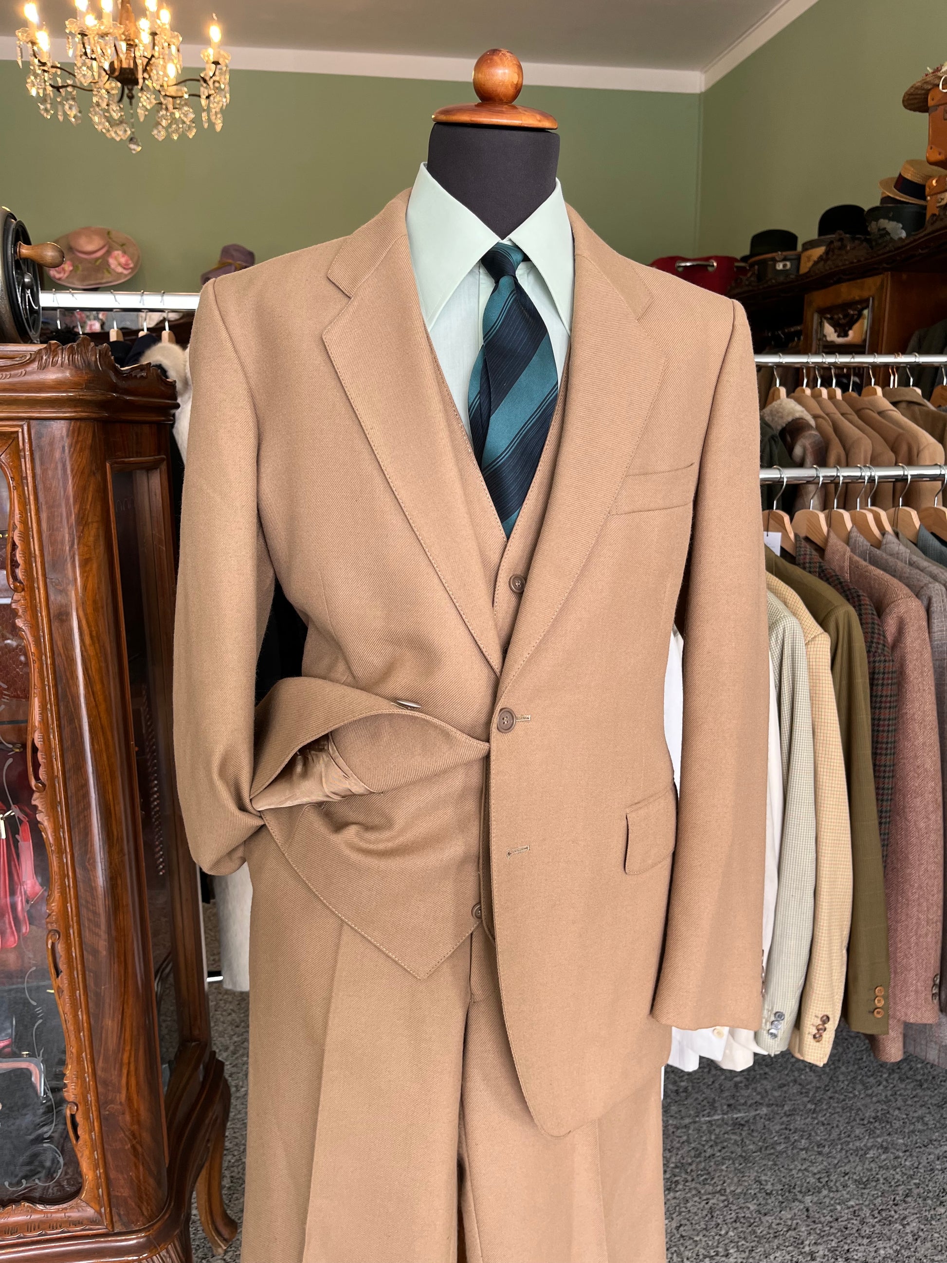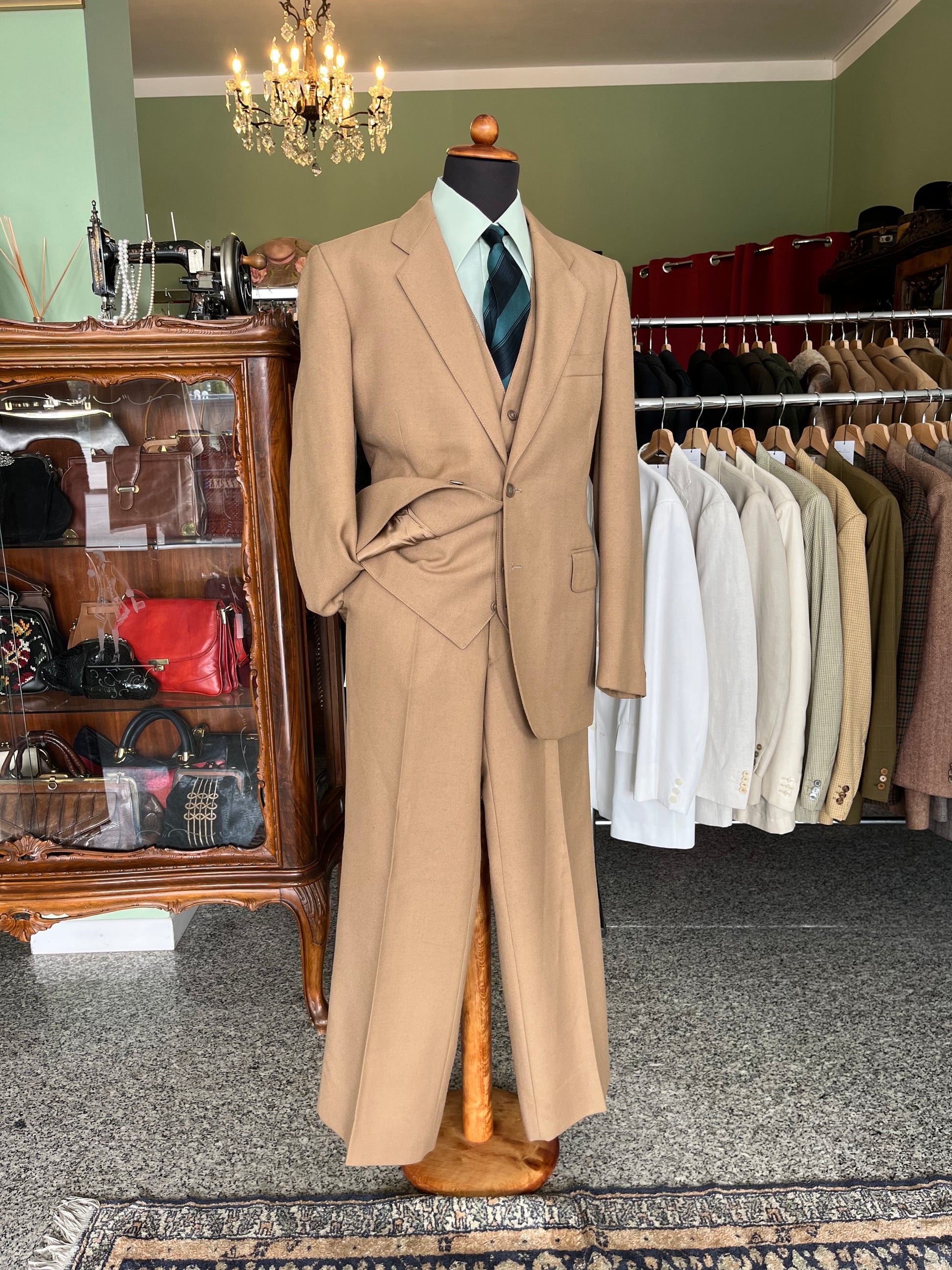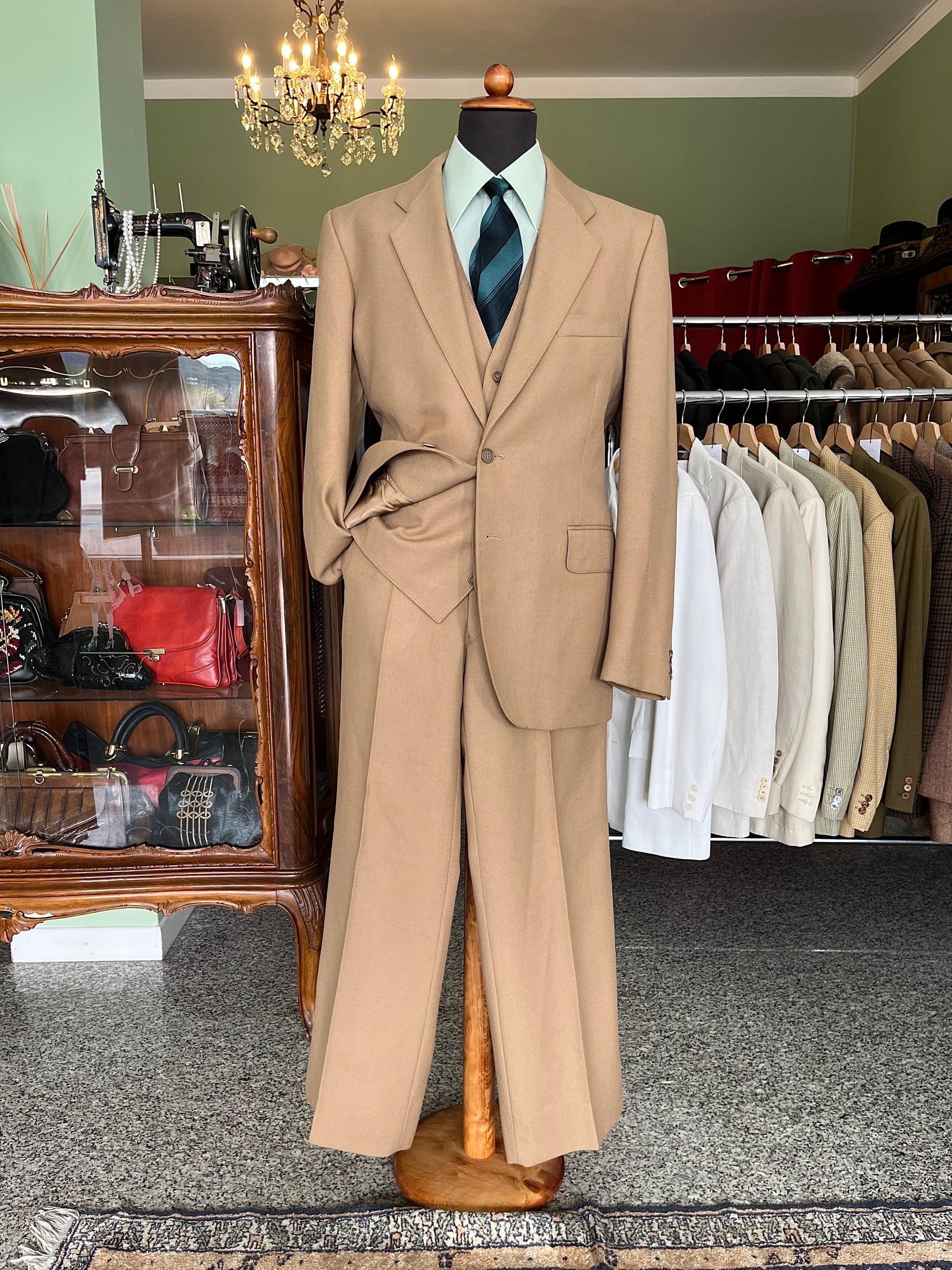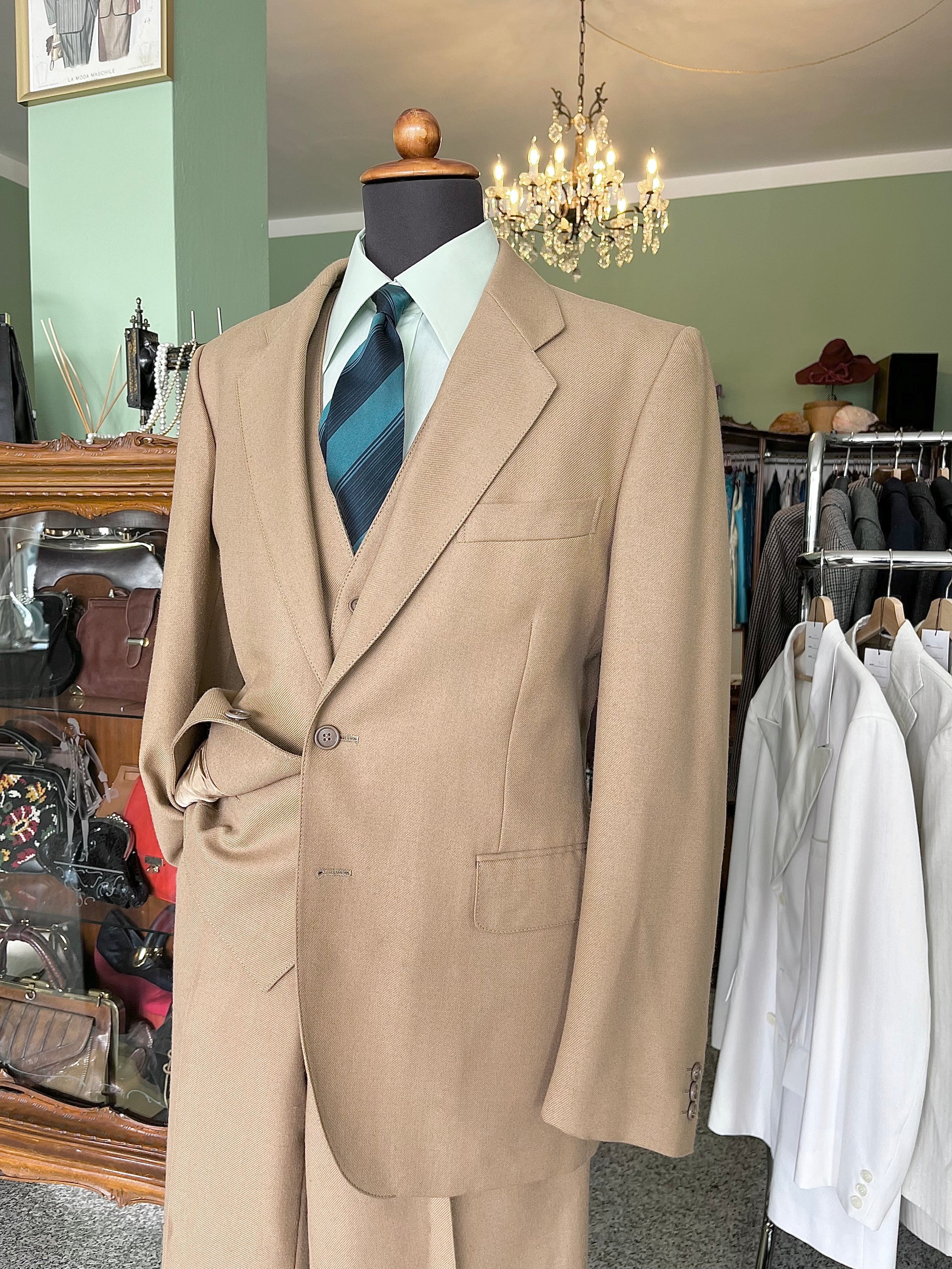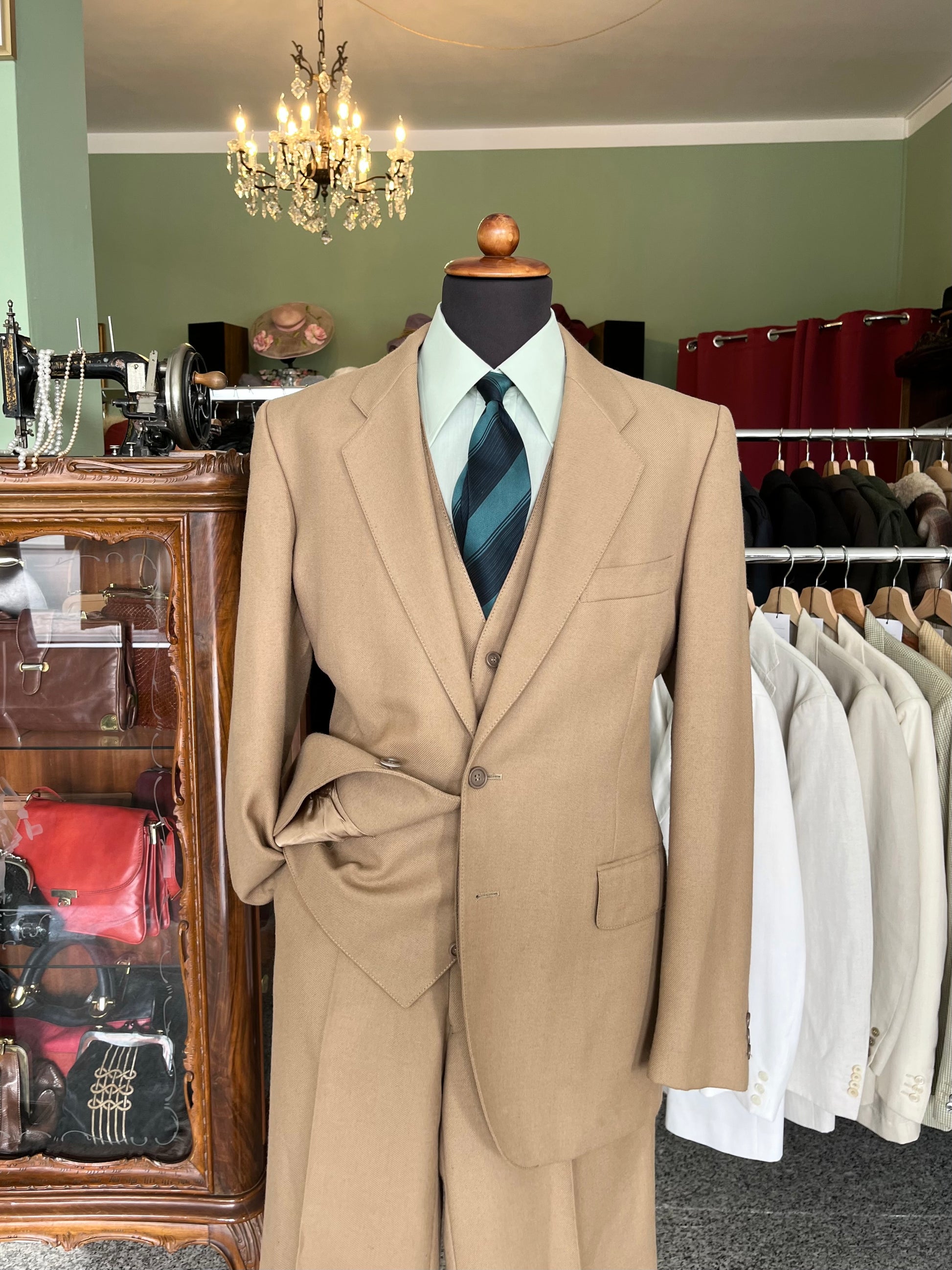 La giacca è un monopetto, due bottoni, baveri a dente, tasche a pattina e spacco singolo sul retro.