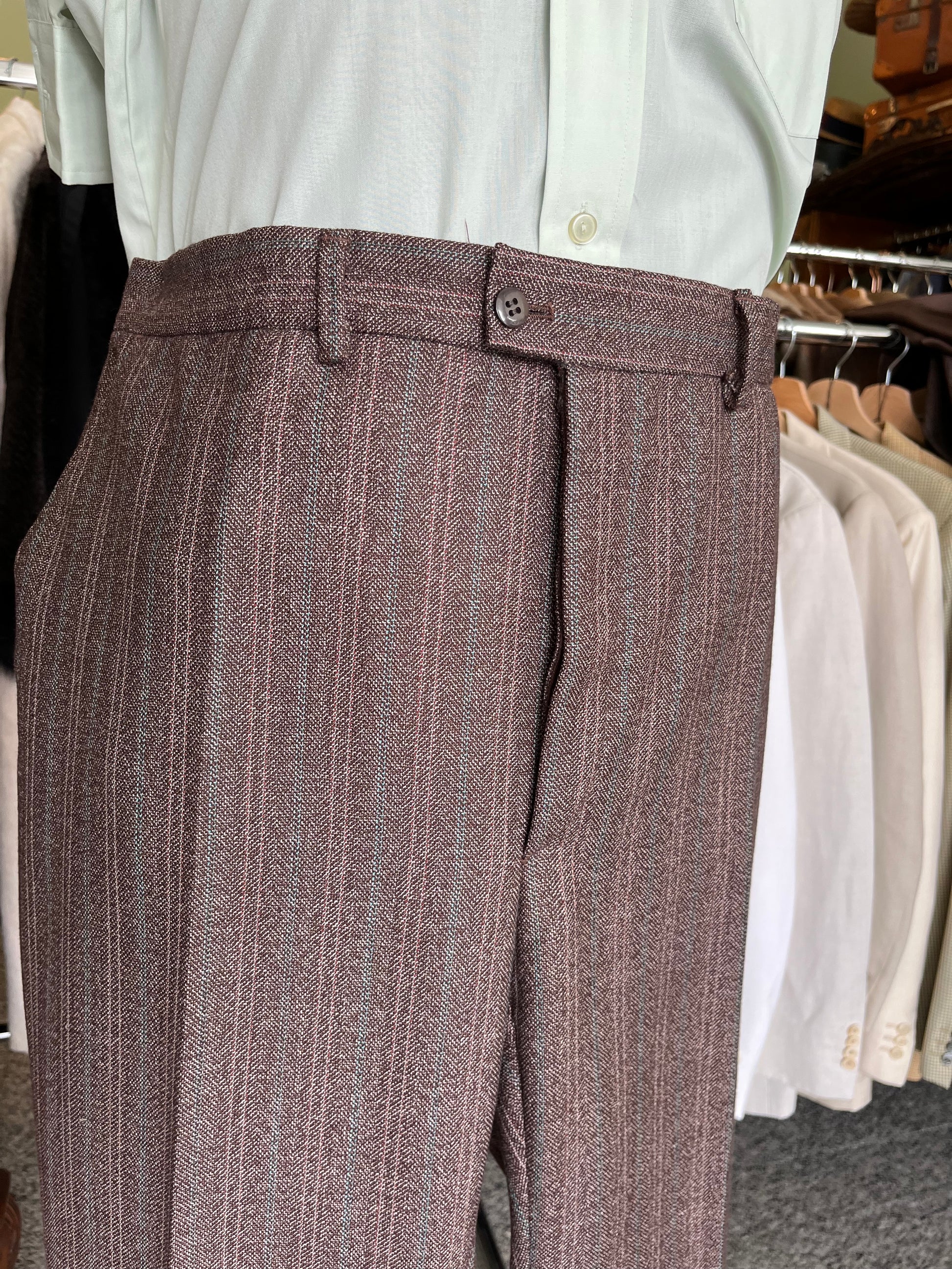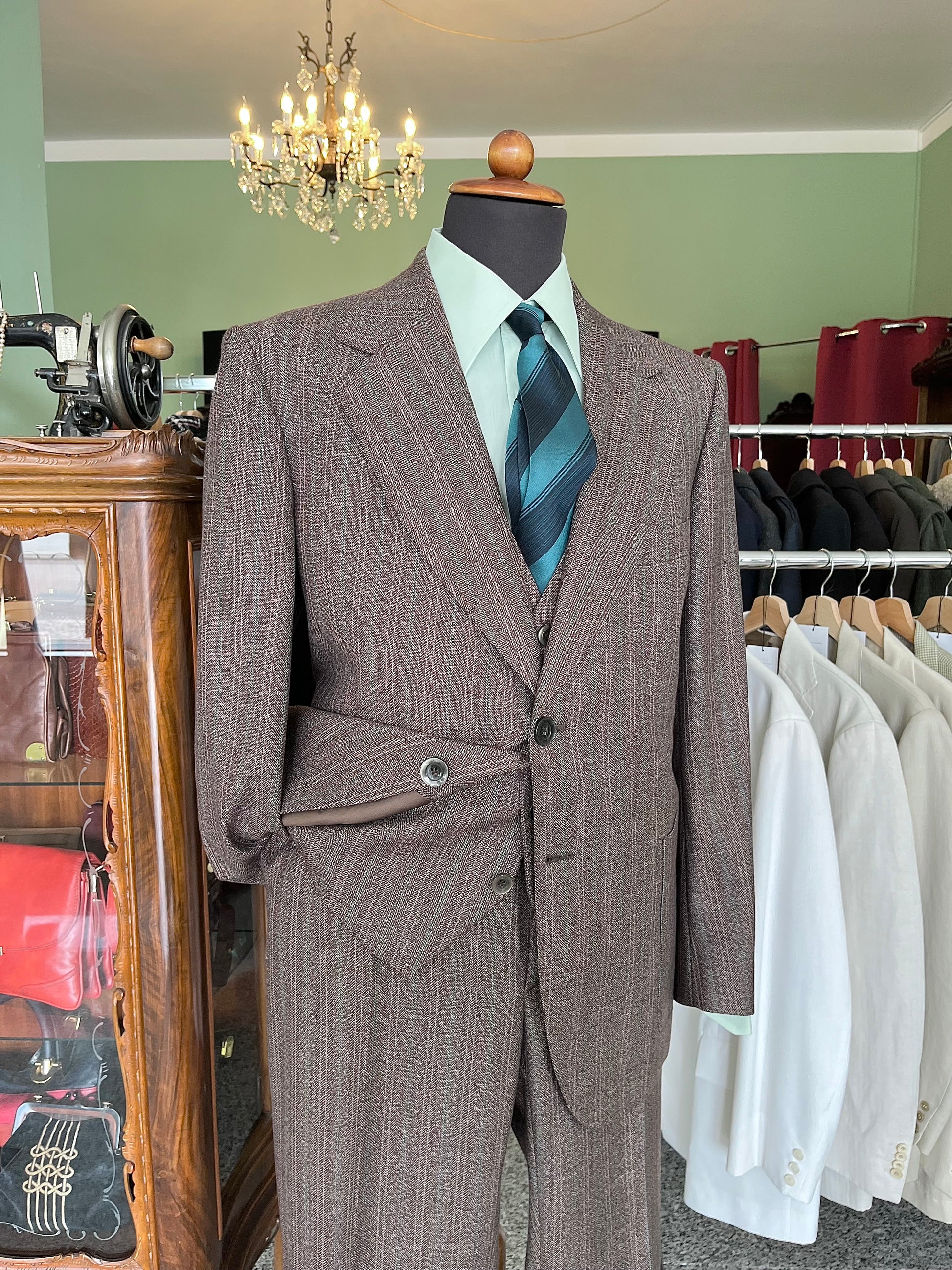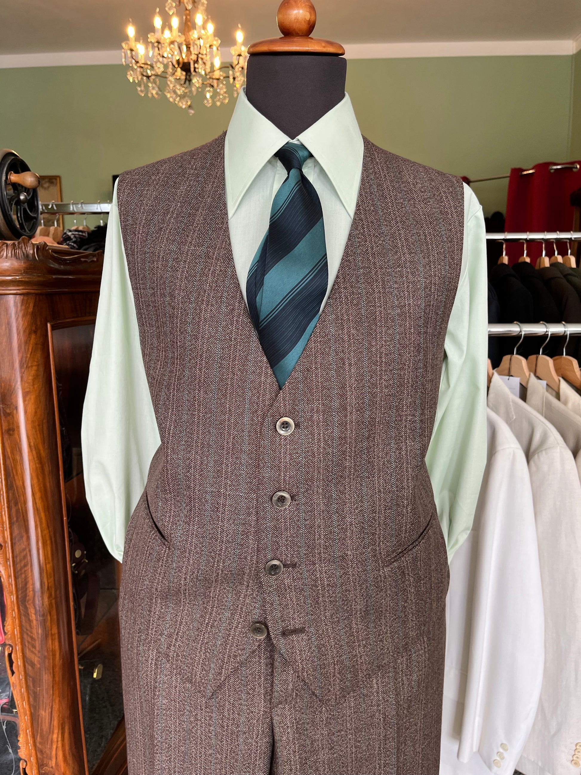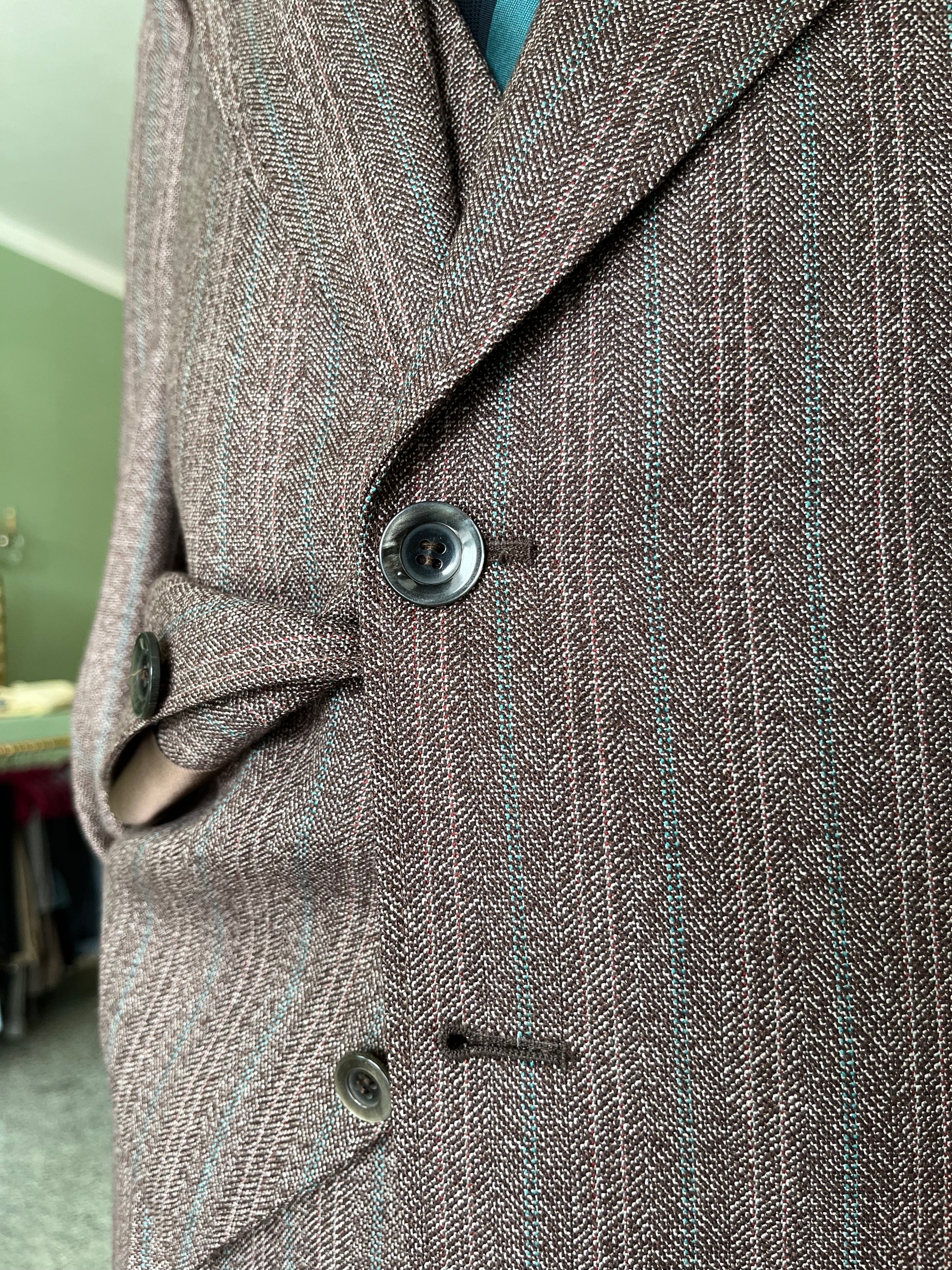 Il tessuto è 100% lana di colore marrone, con leggera riga verde e rossa.