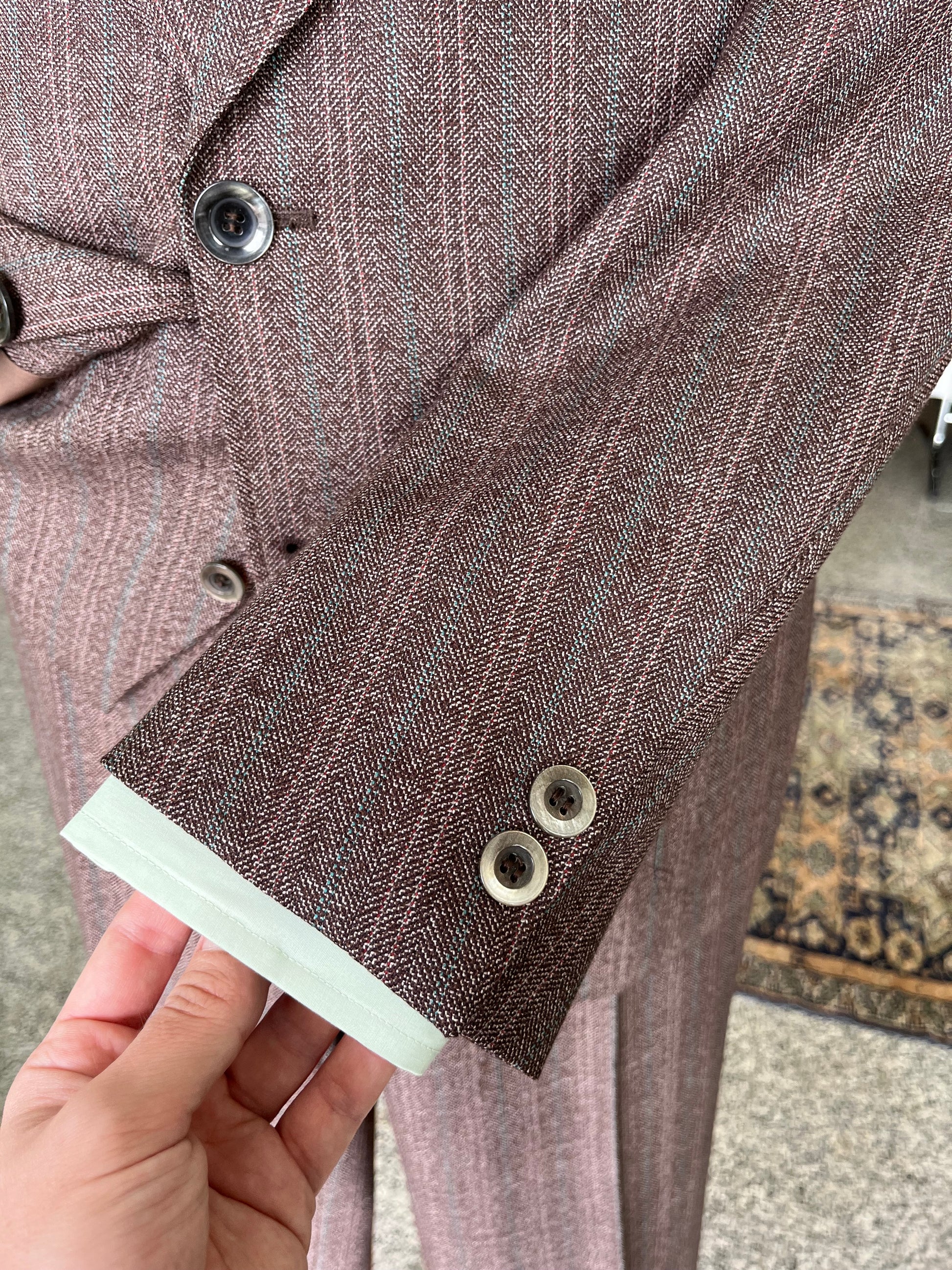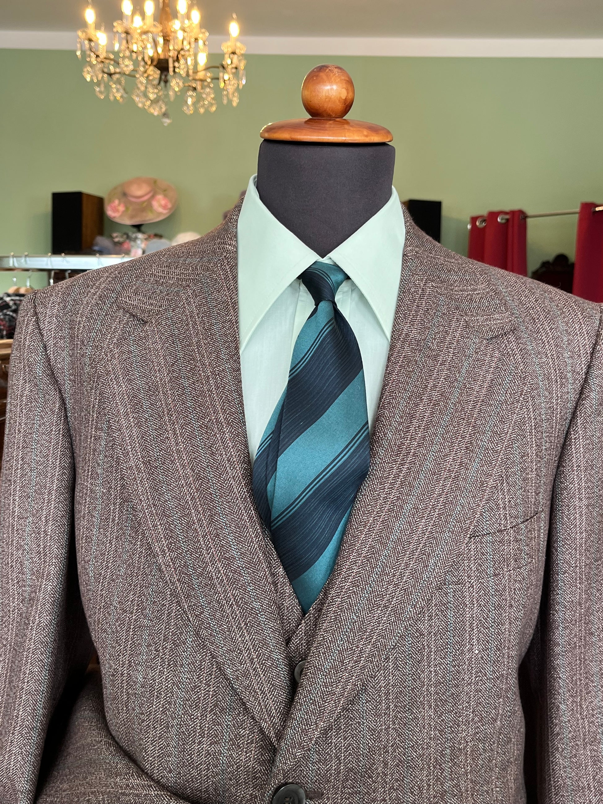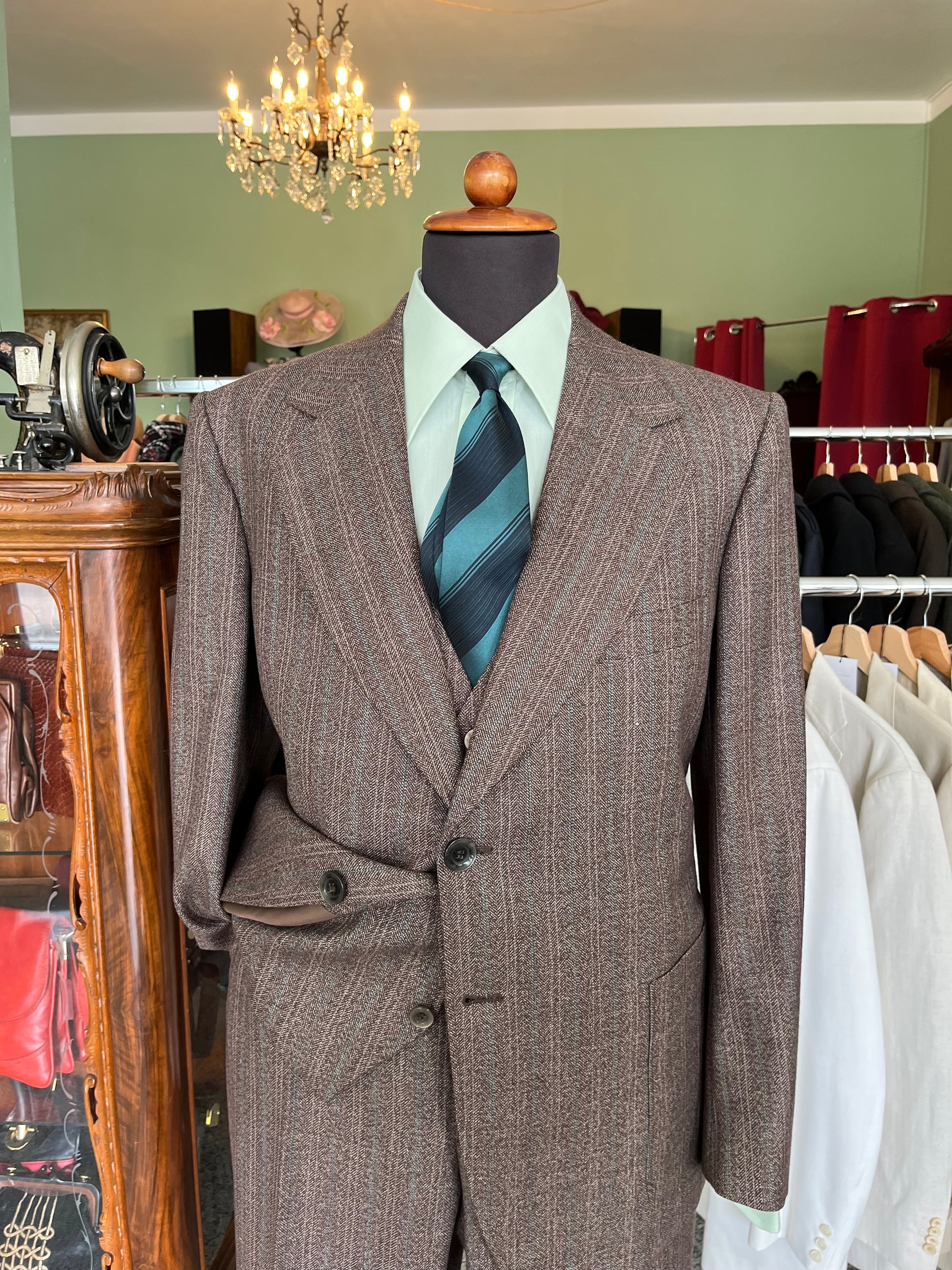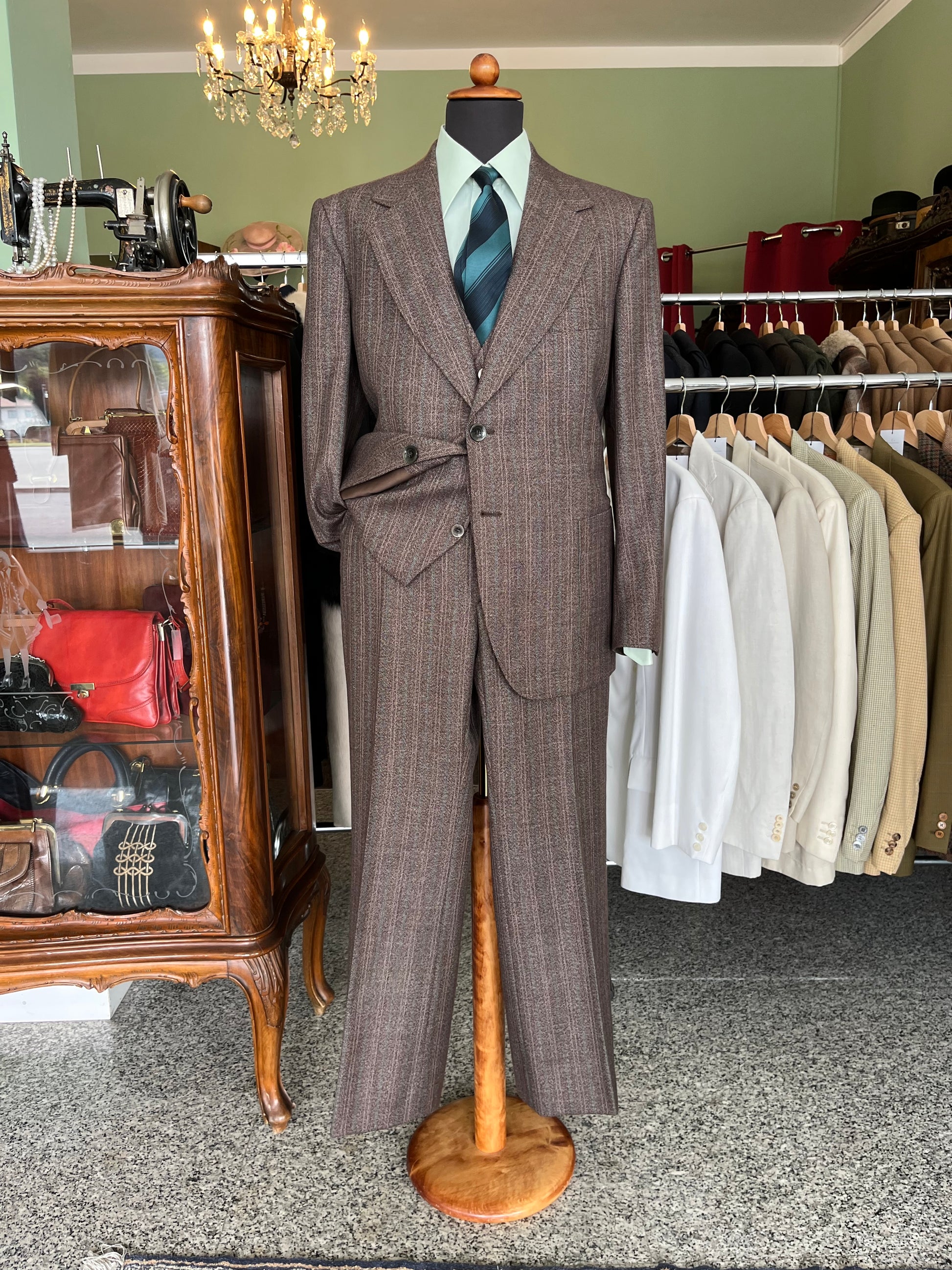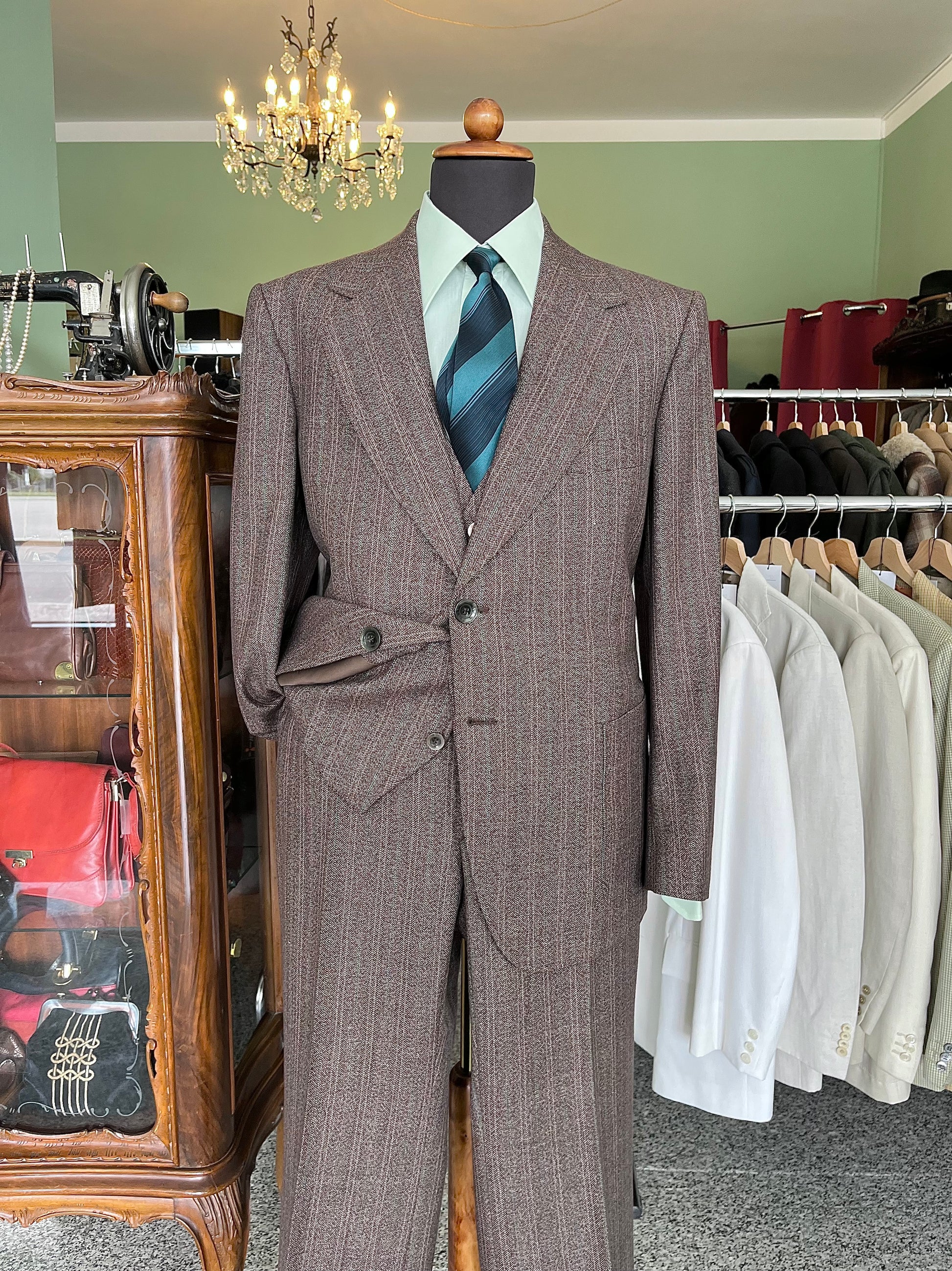 Il tessuto è 100% lana di colore marrone, con leggera riga verde e rossa.