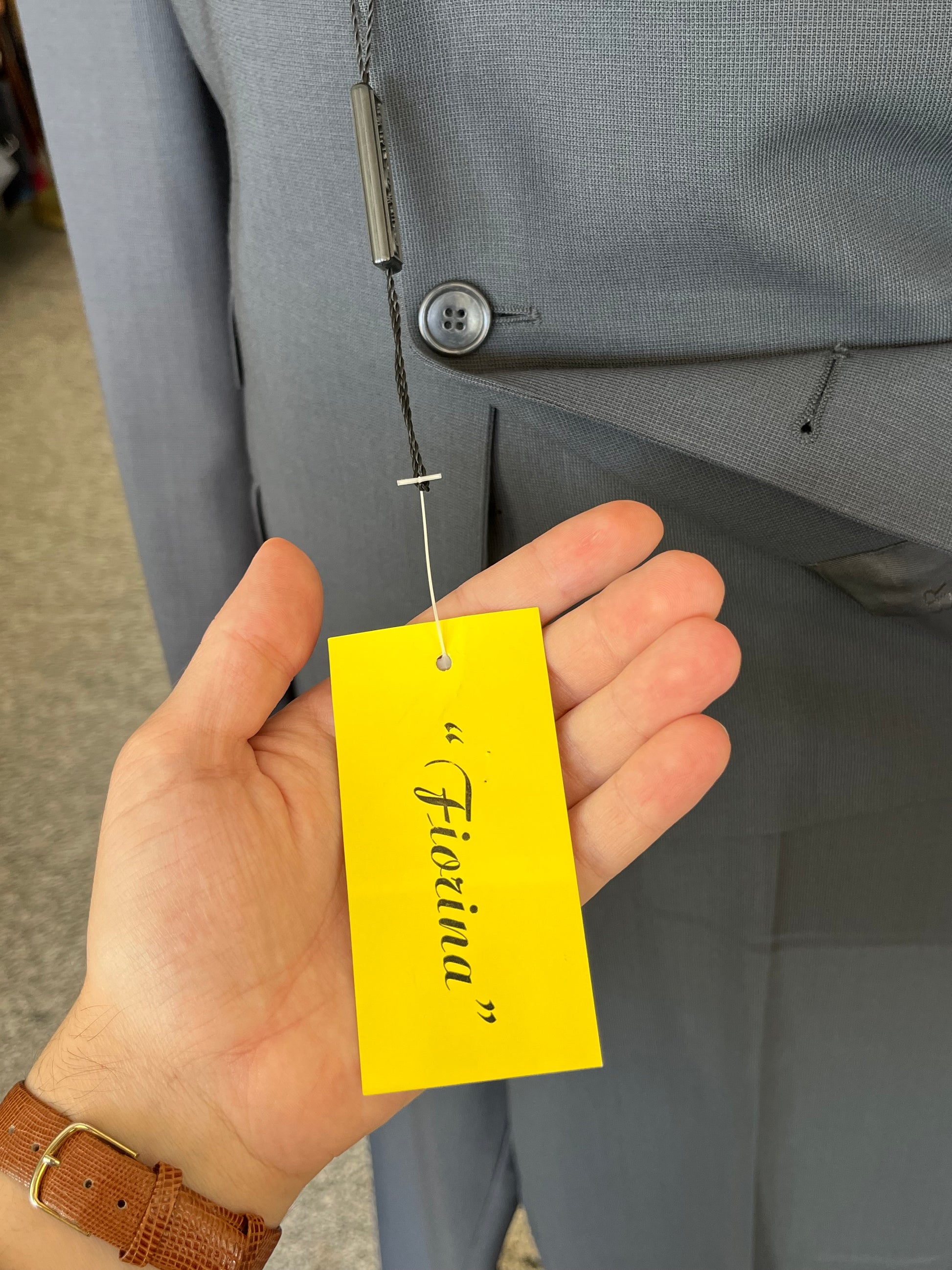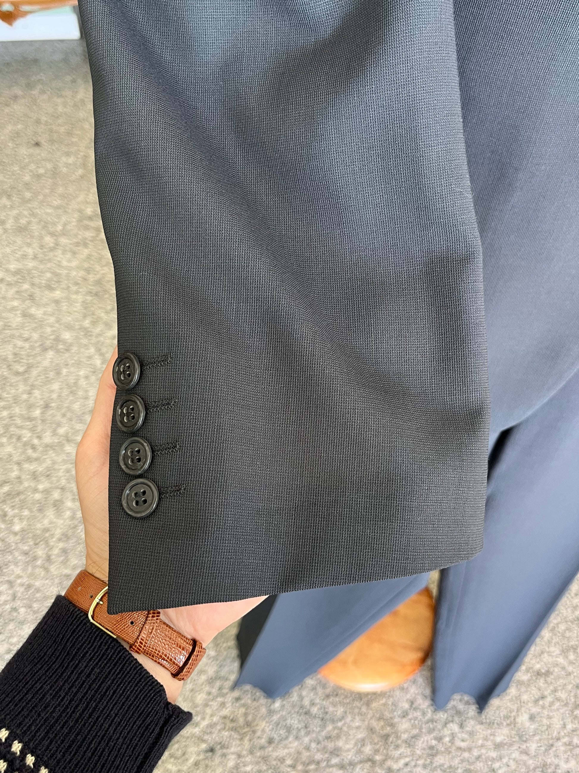 La giacca è un monopetto, tre bottoni, baveri a dente, tasche a pattina, ticket pocket e spacco sul retro.