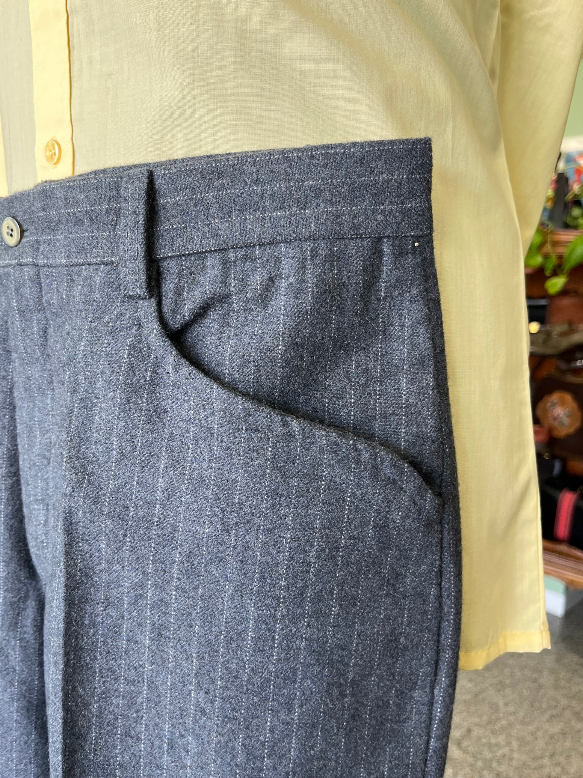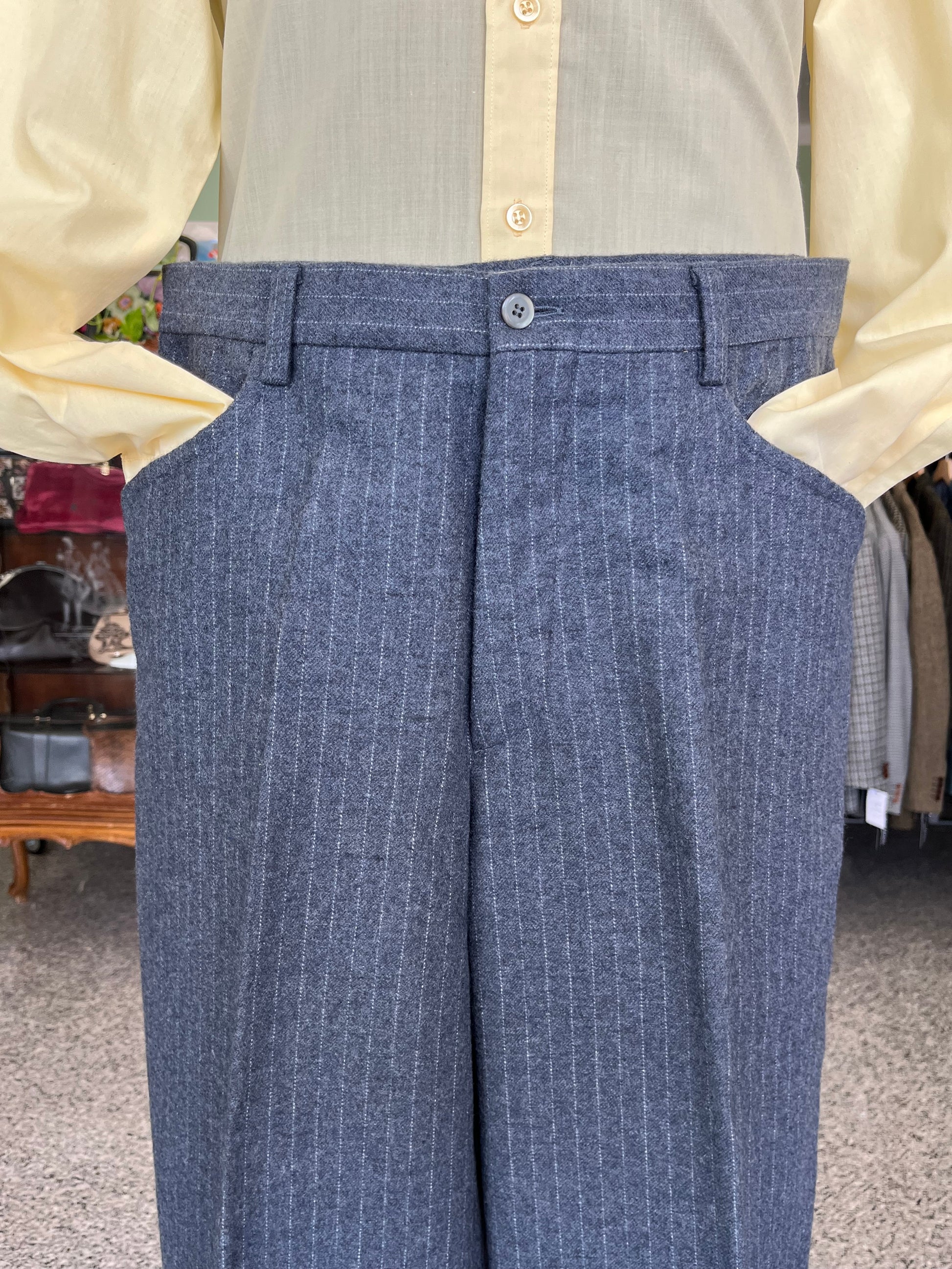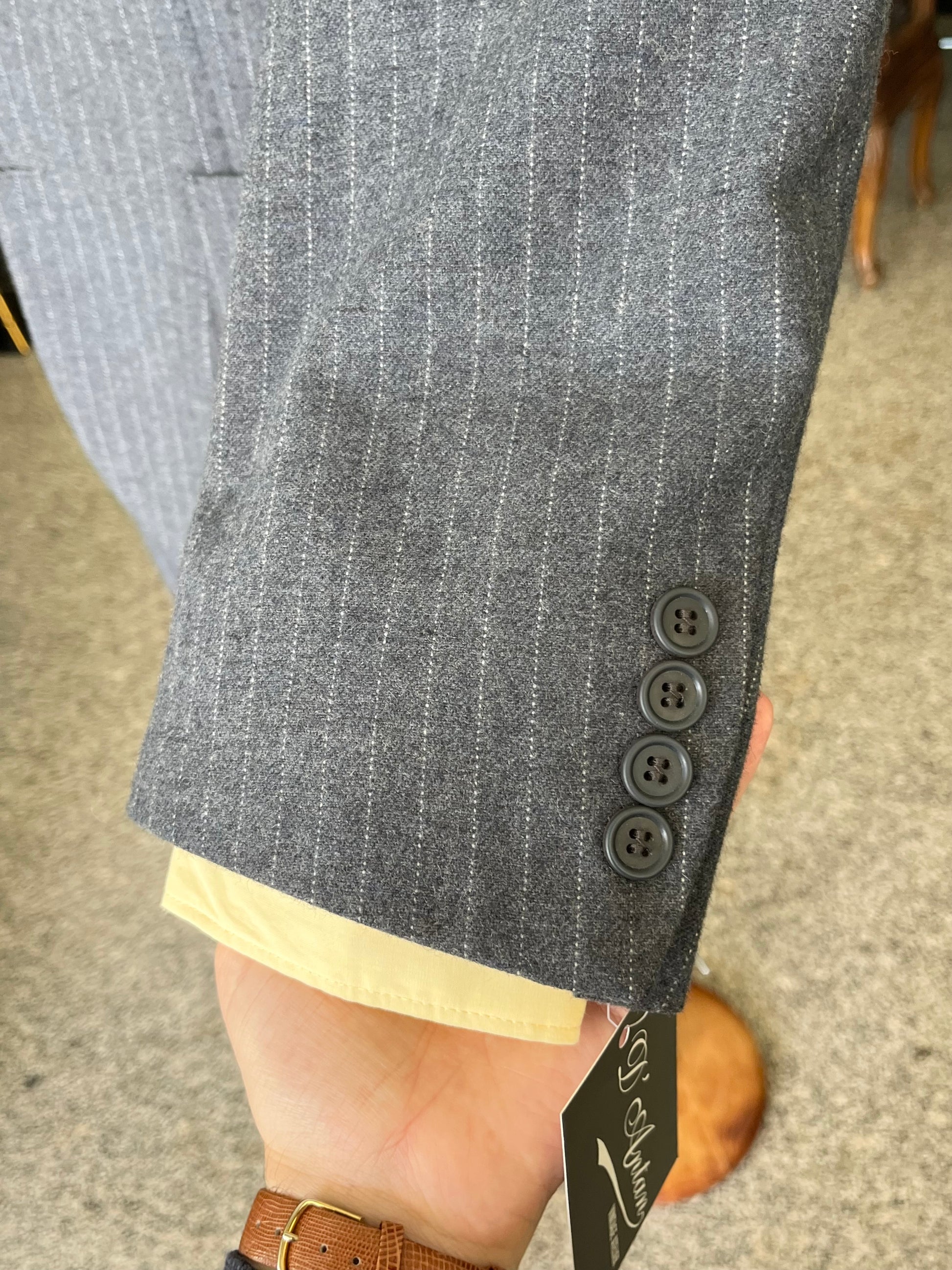 Il tessuto è 100% pura flanella di lana, di colore grigio medio gessato.