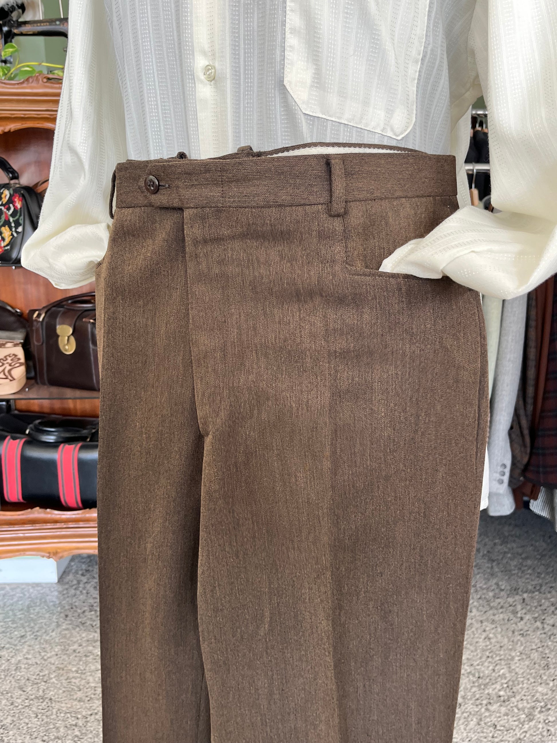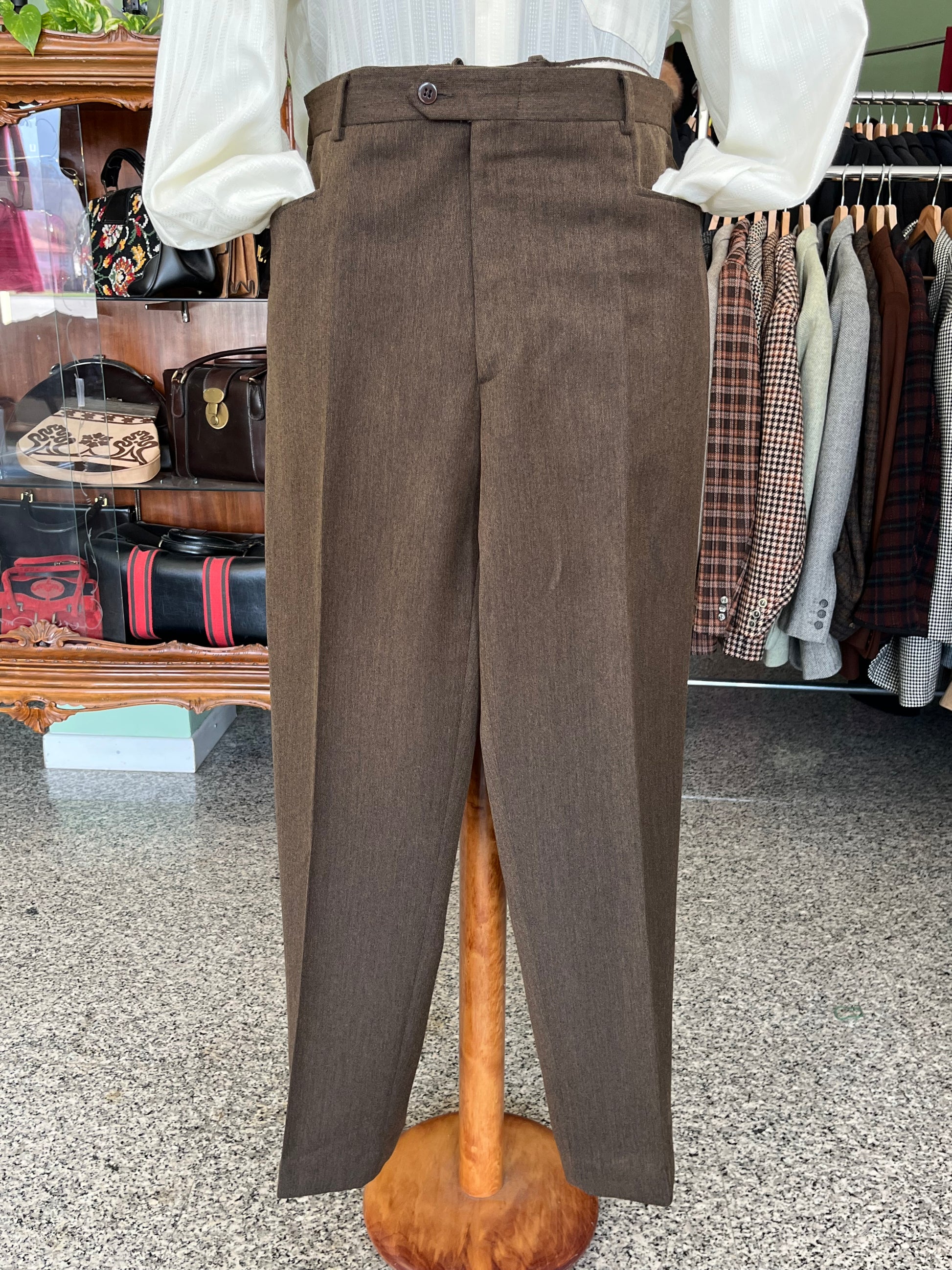 I calzoni hanno un taglio classico, a vita alta, tasche alla carrettiera e gamba dritta. Presentano una aggiunta di tessuto sul retro, applicata per allargarli (visibile in foto).