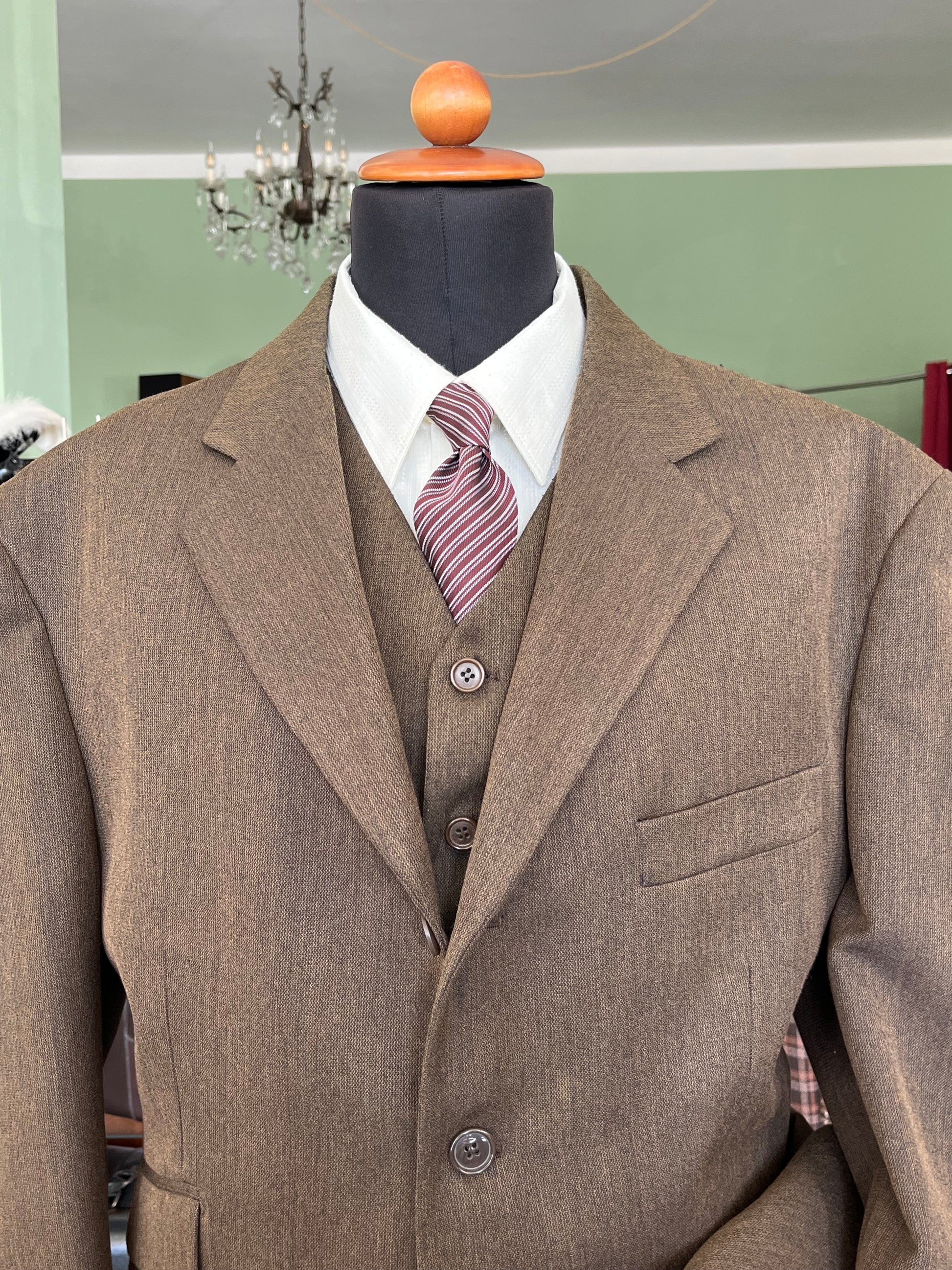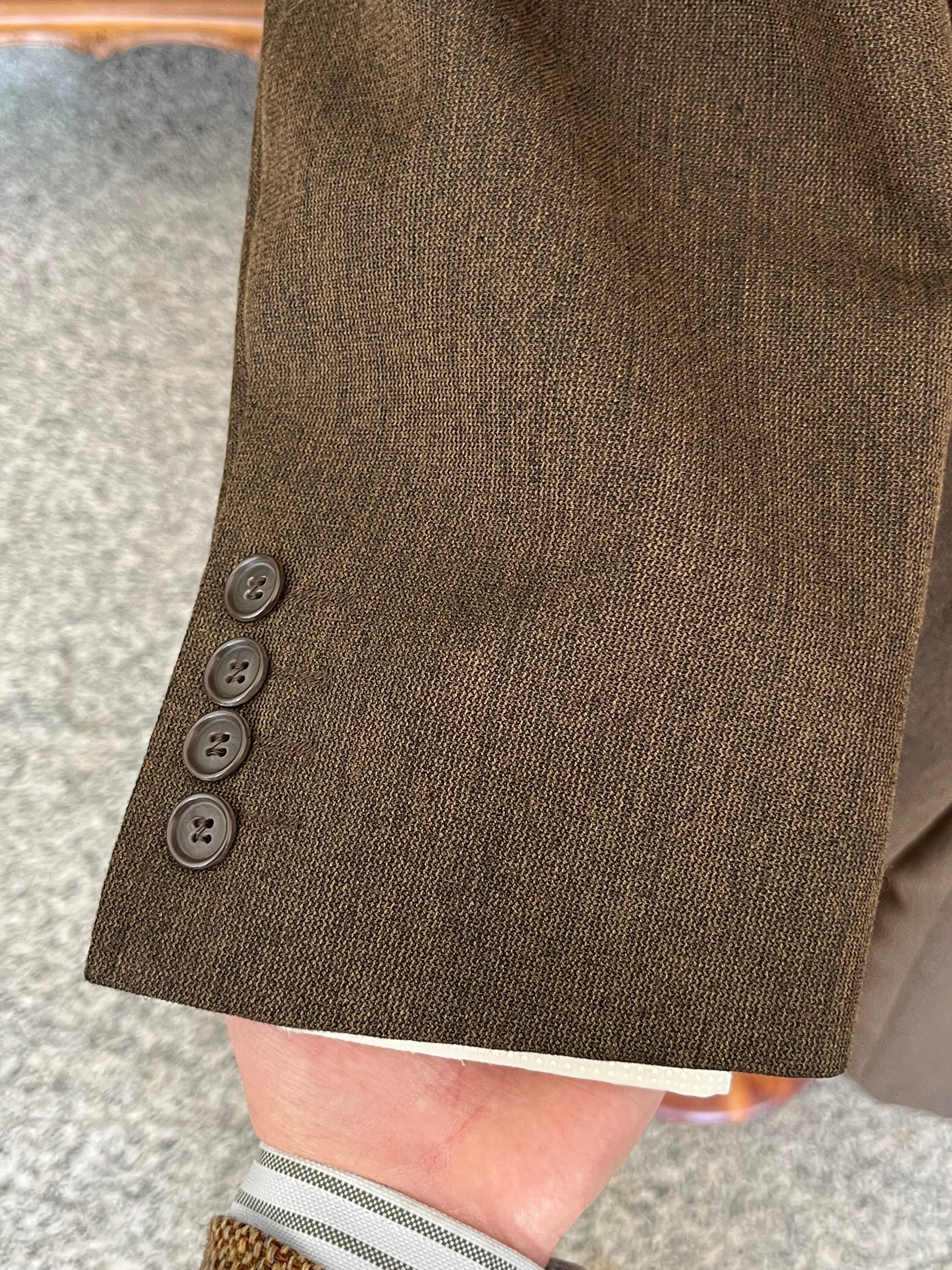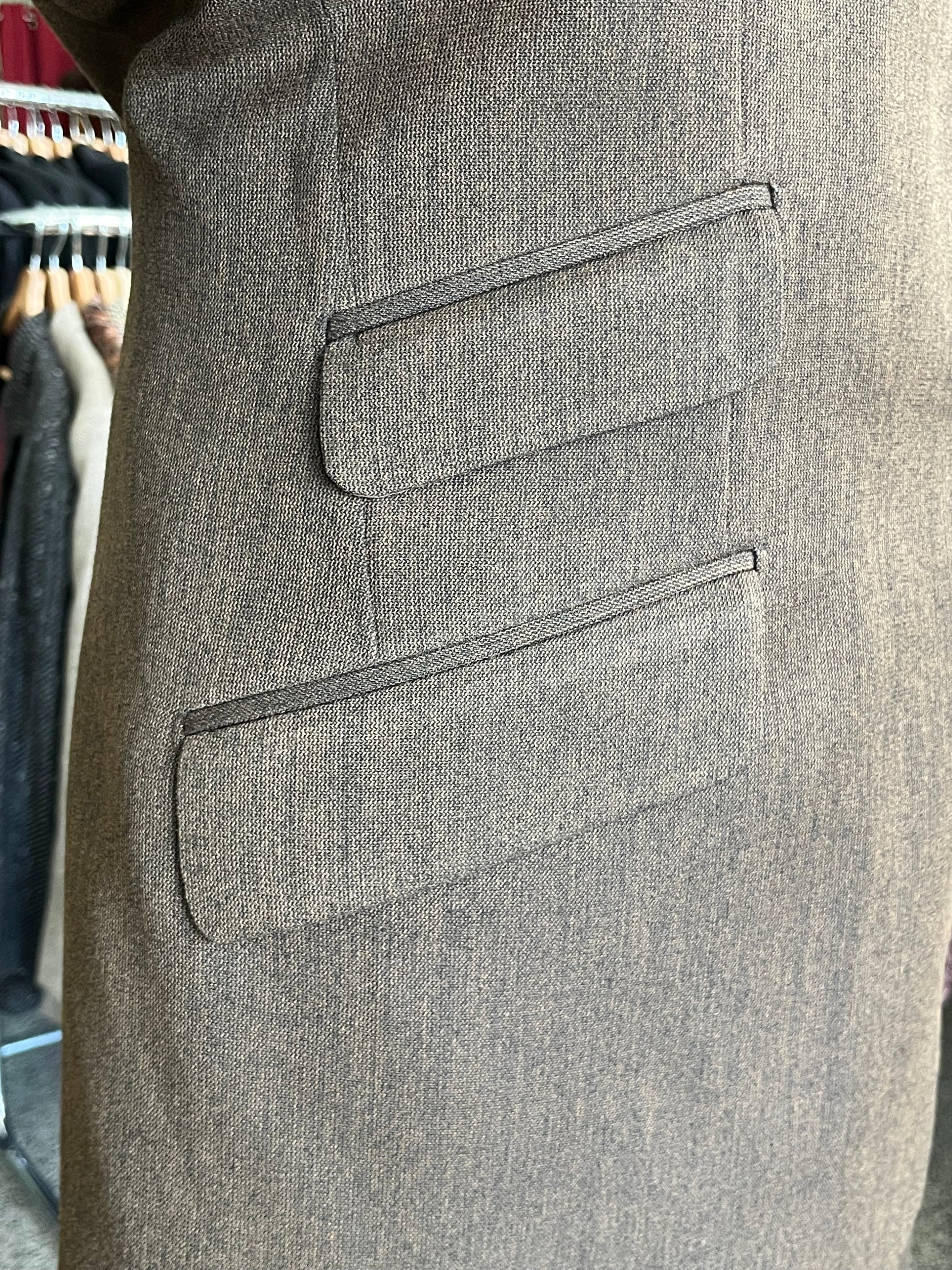 La giacca è un monopetto, quattro bottoni, baveri a dente, tasche a pattina di sbieco e spacco singolo sul retro.