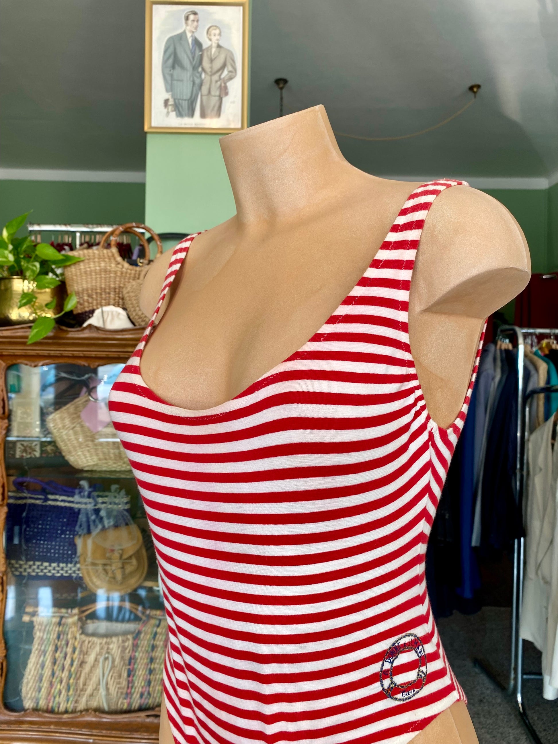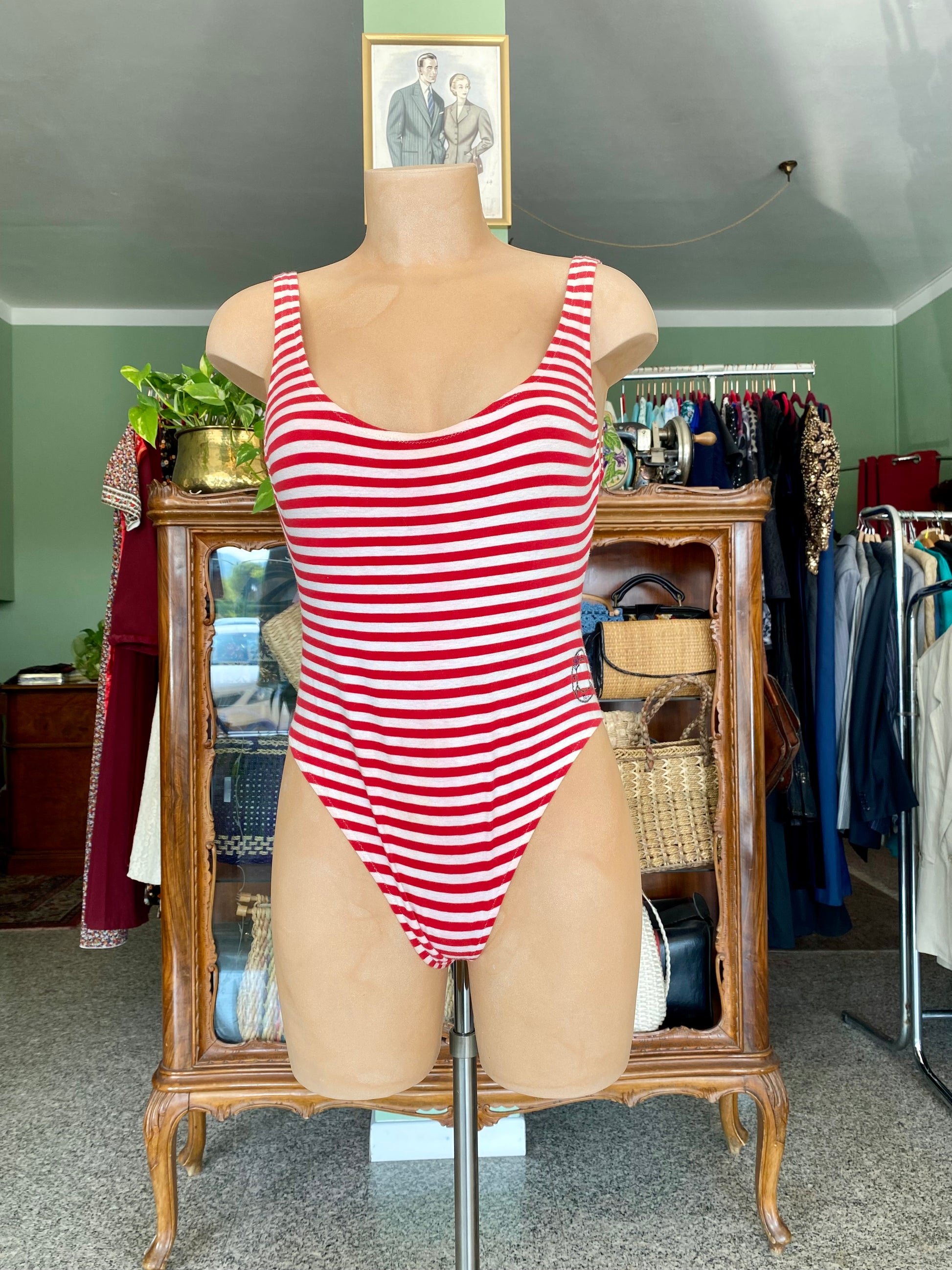 Costume da bagno anni ‘80 a righe rosse e bianche