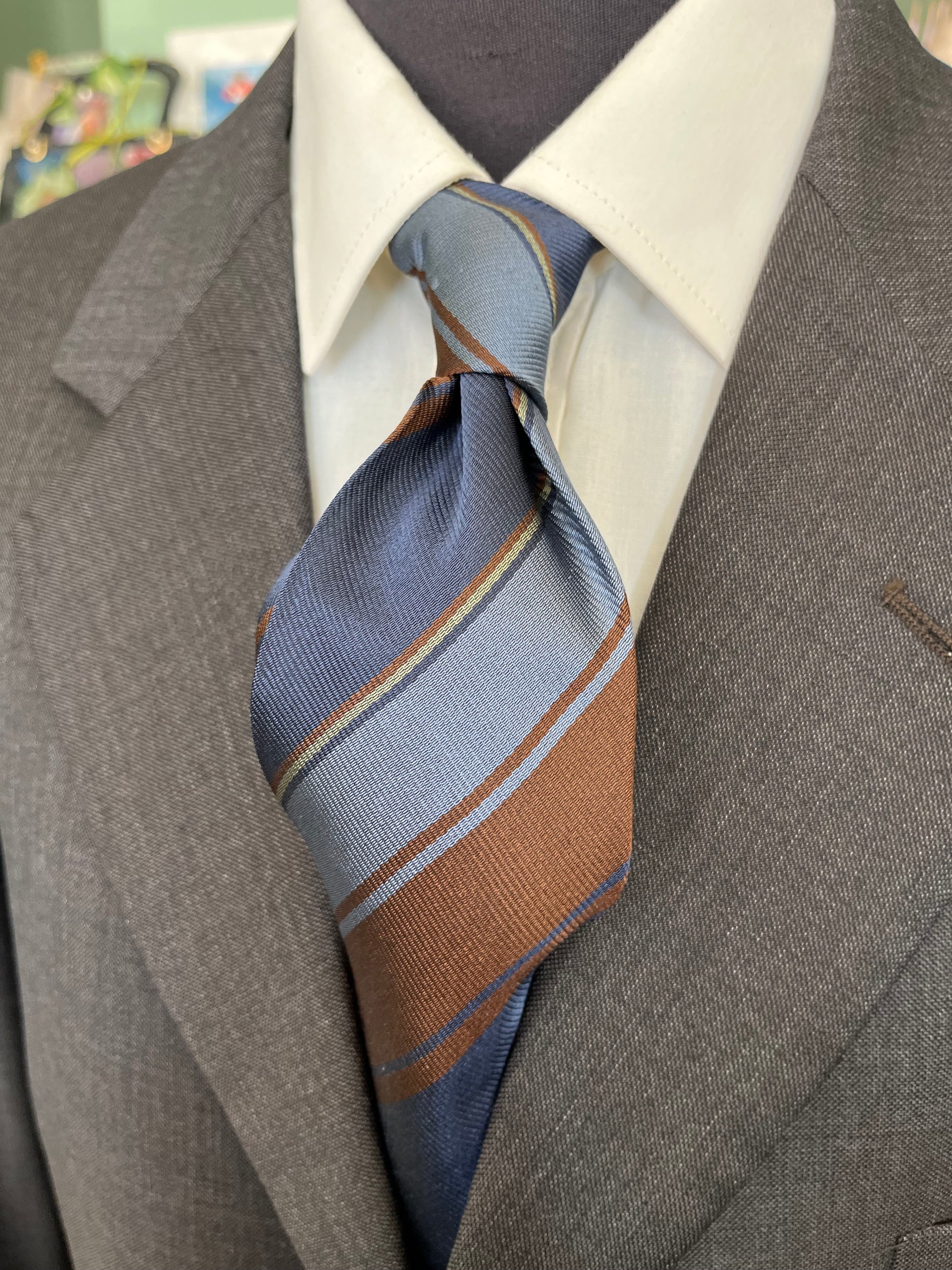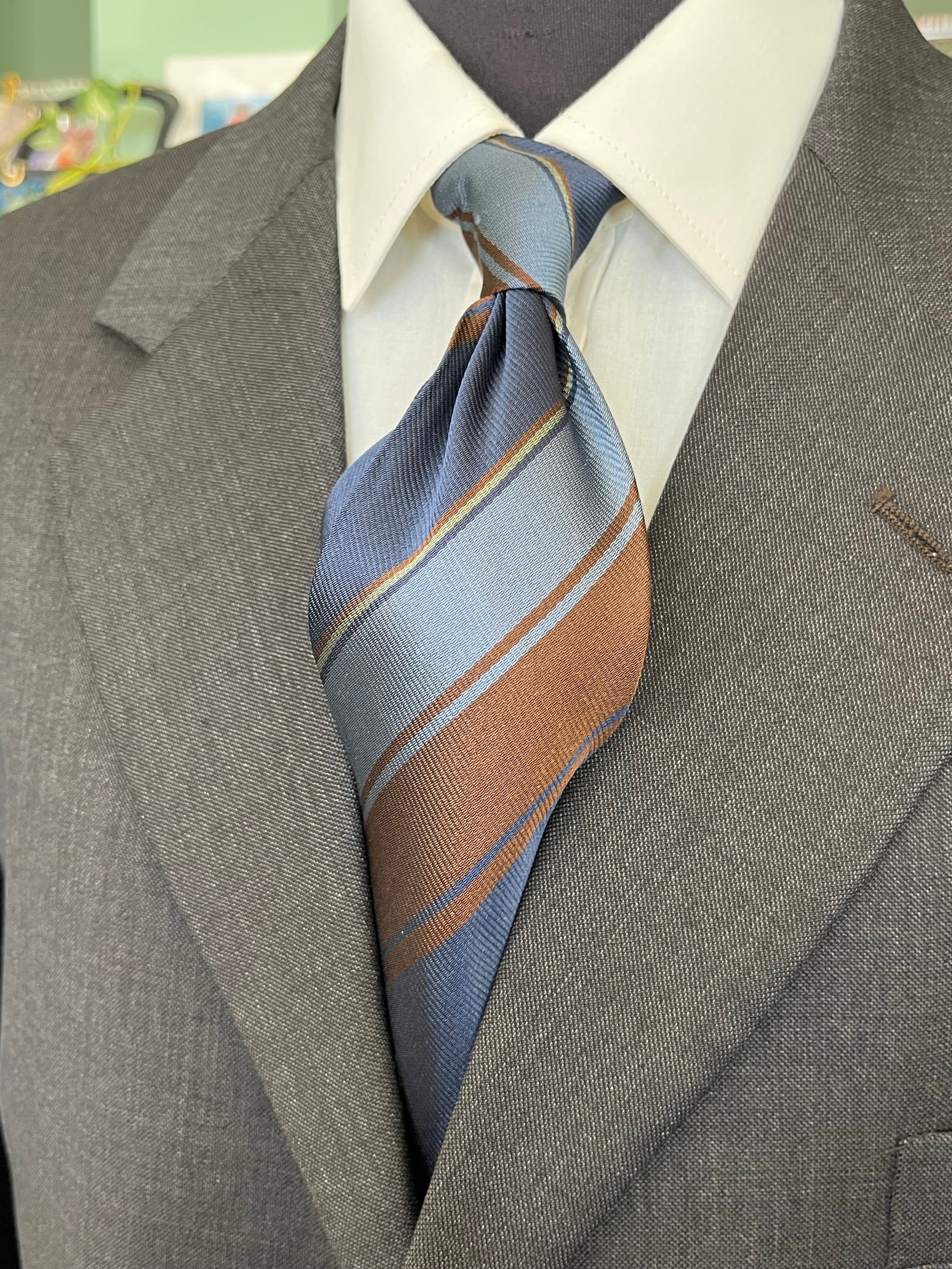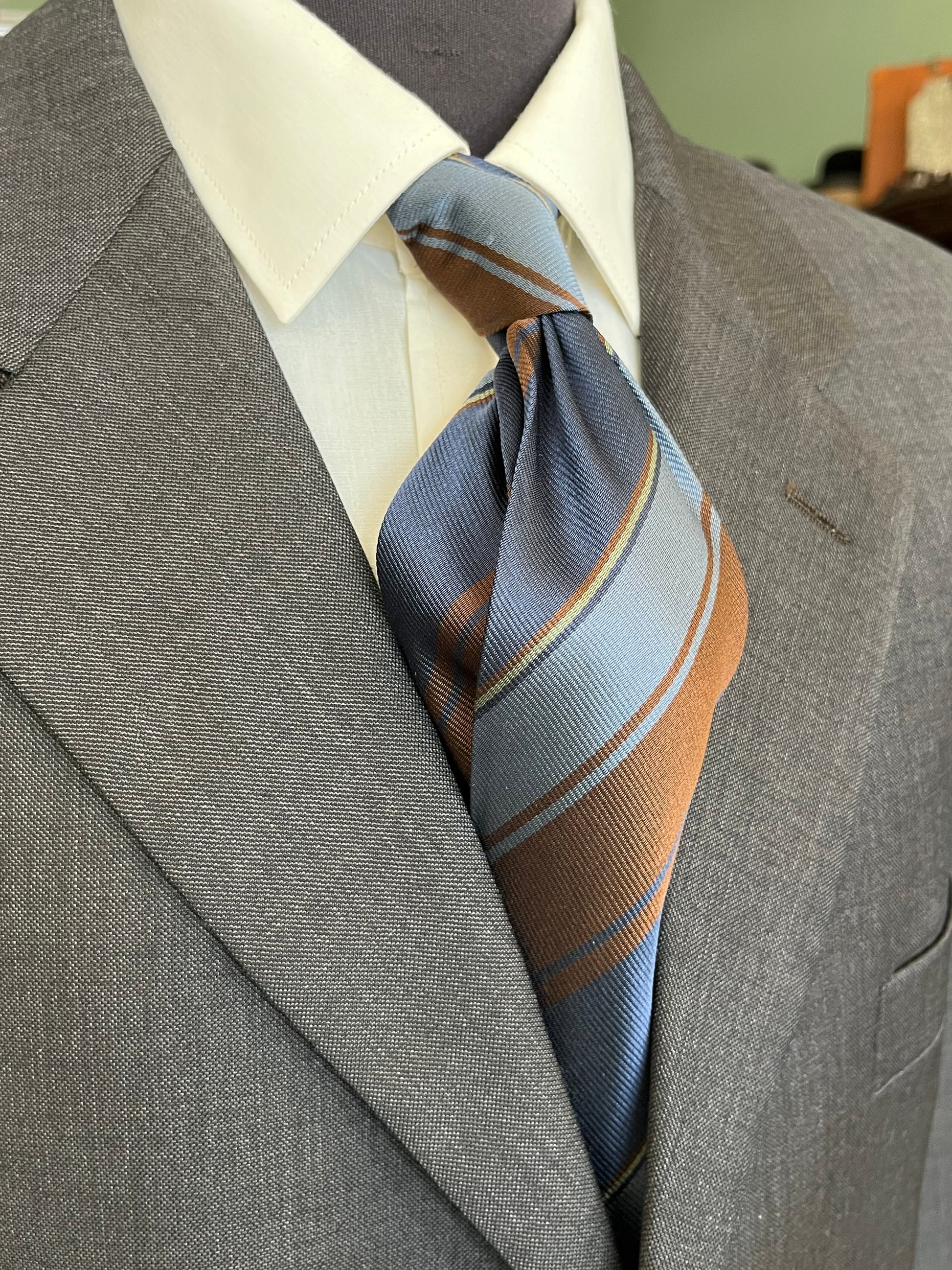 La cravatta presenta una fantasia a righe sui toni del blu, celeste e marrone.