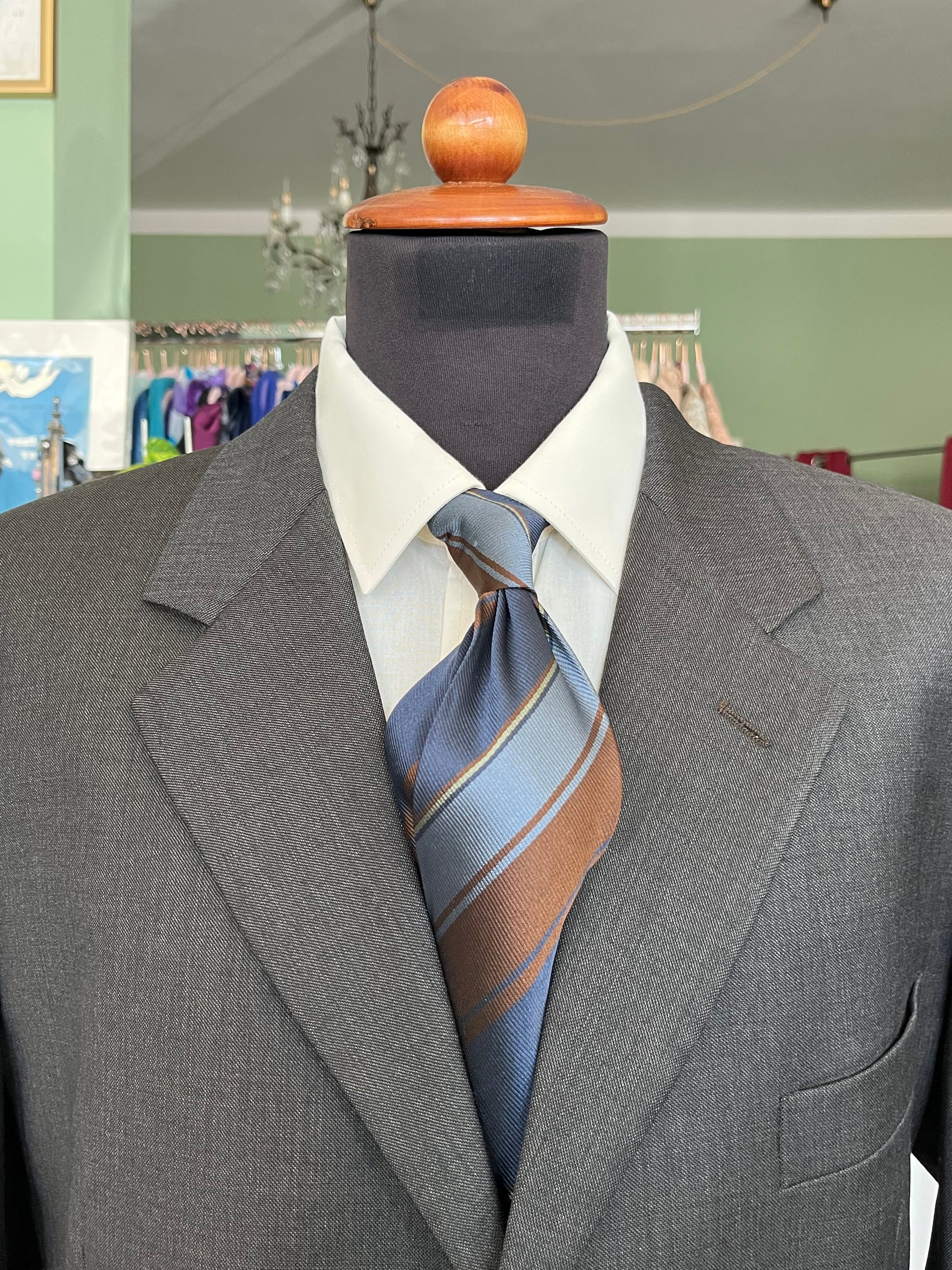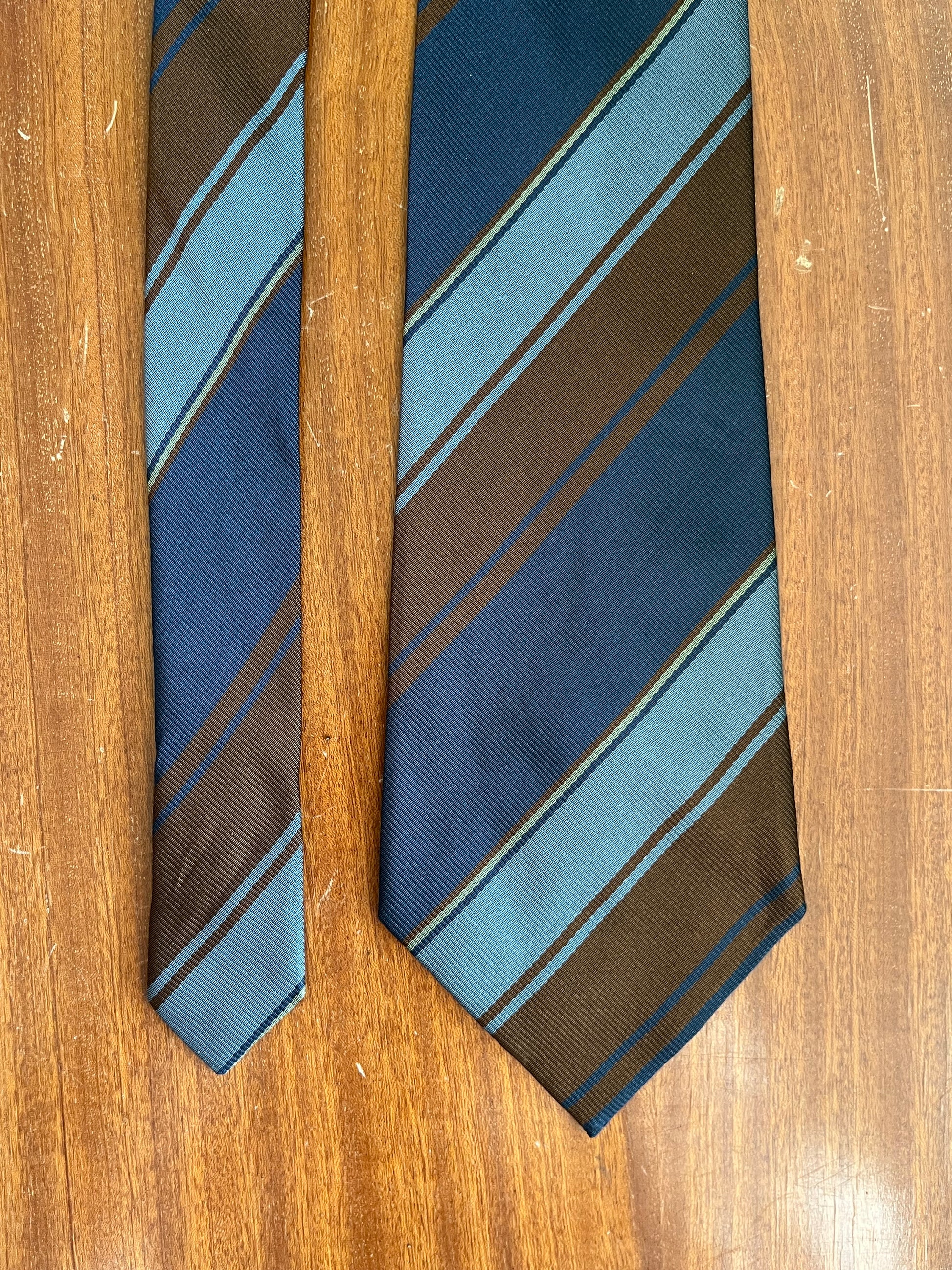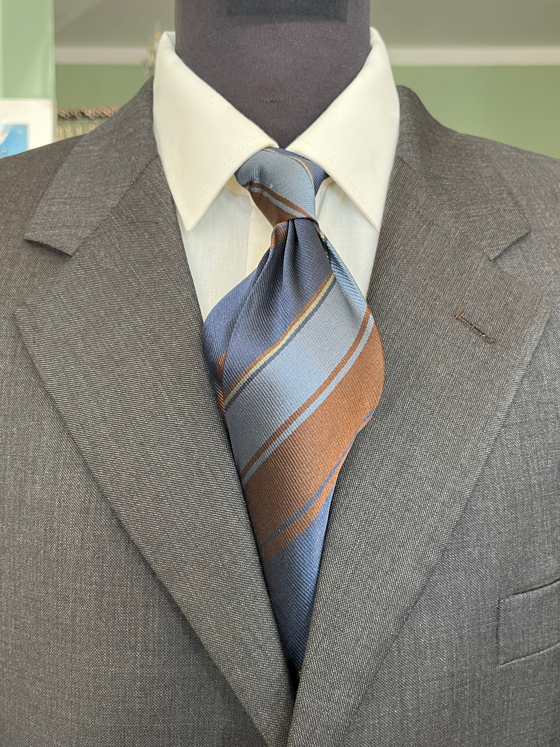 La cravatta presenta una fantasia a righe sui toni del blu, celeste e marrone.