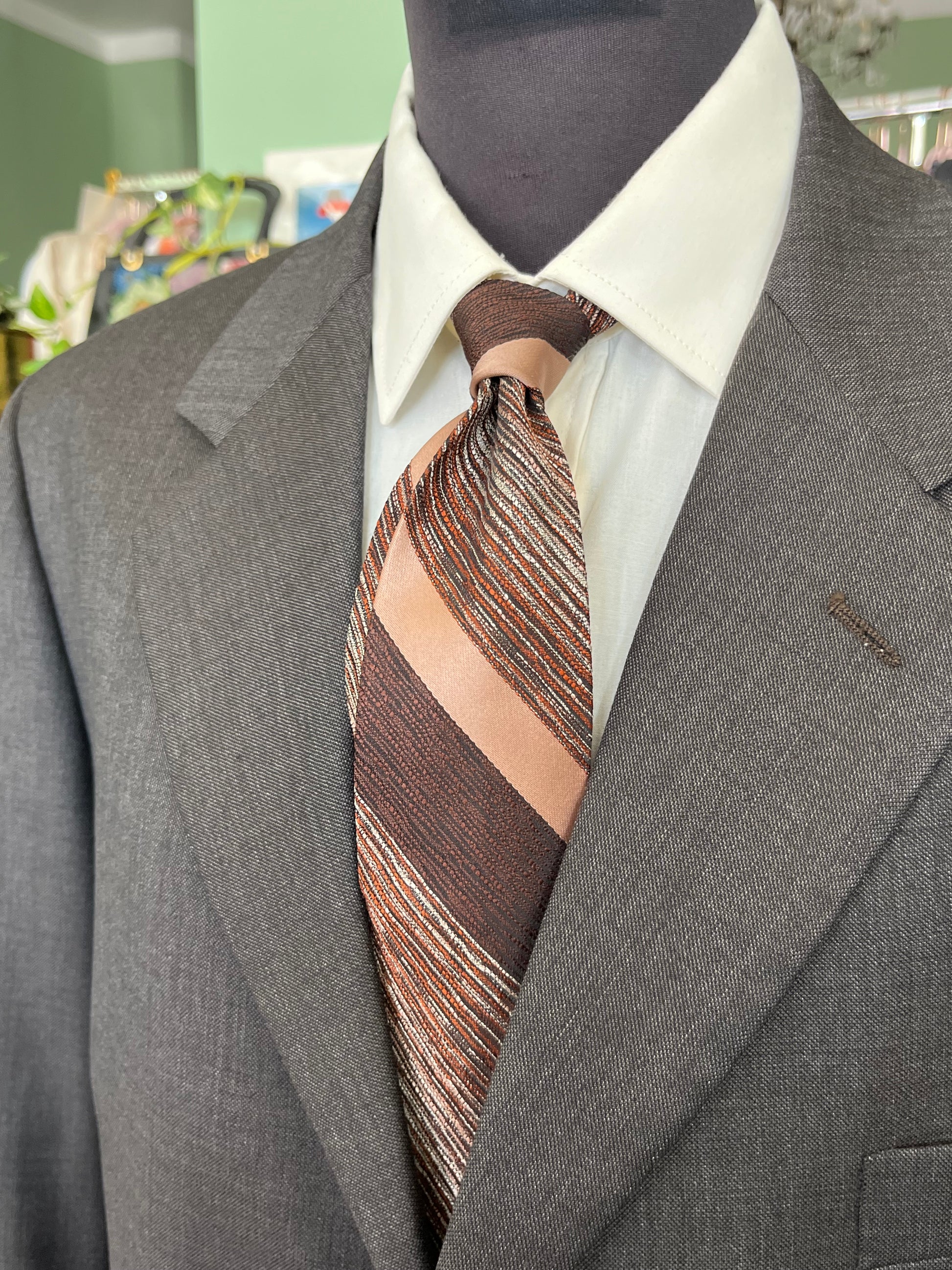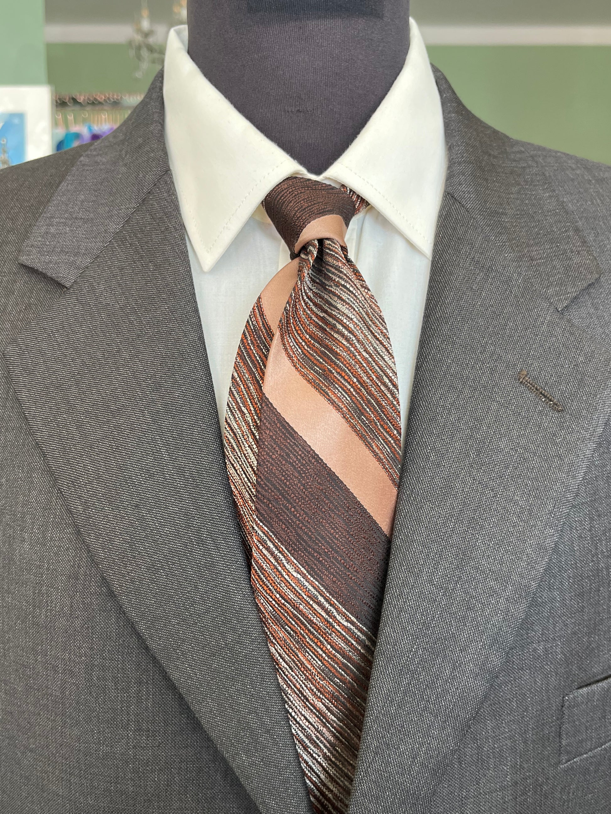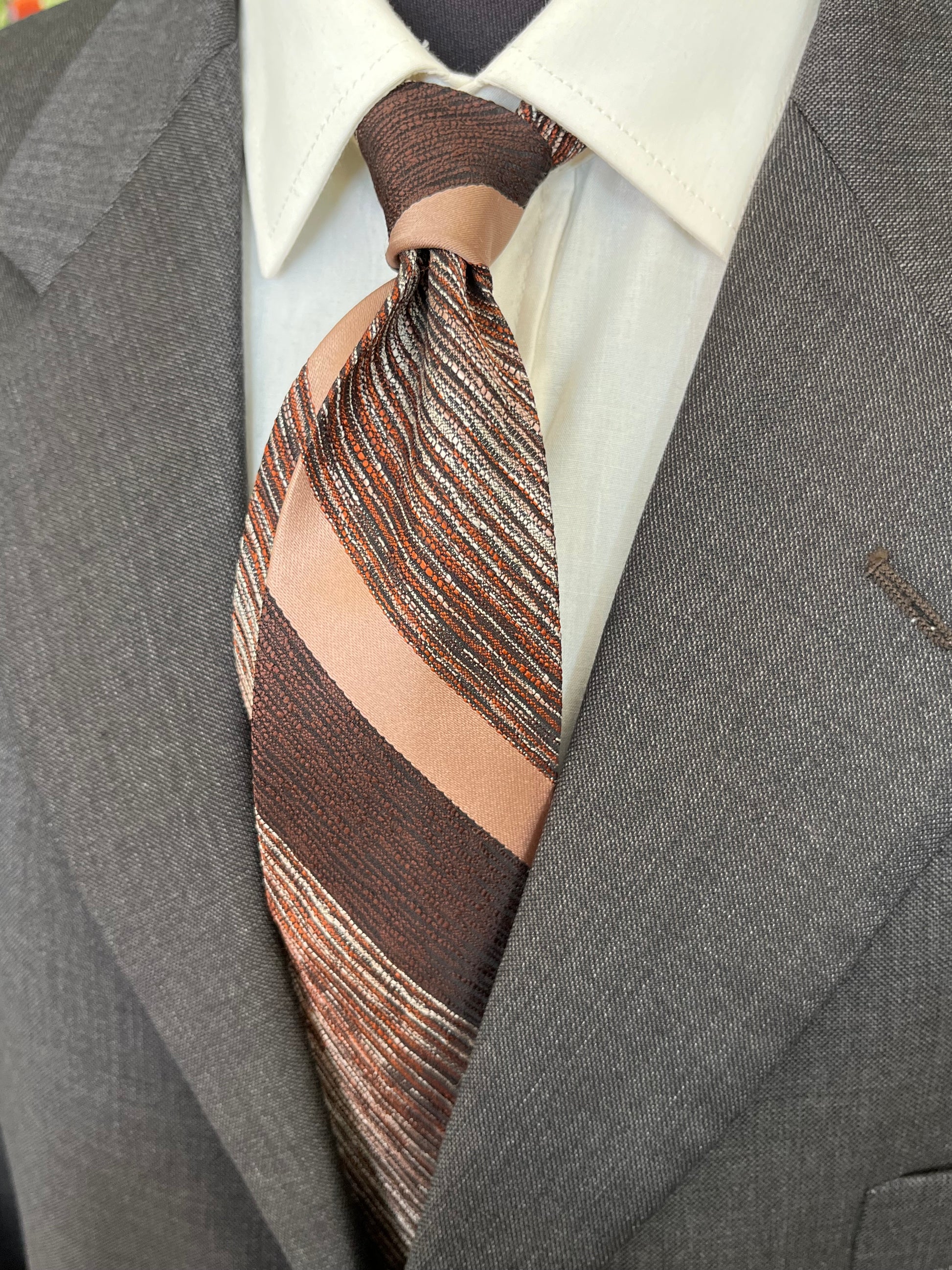 La cravatta presenta una fantasia a righe sui toni del marrone e del salmone.