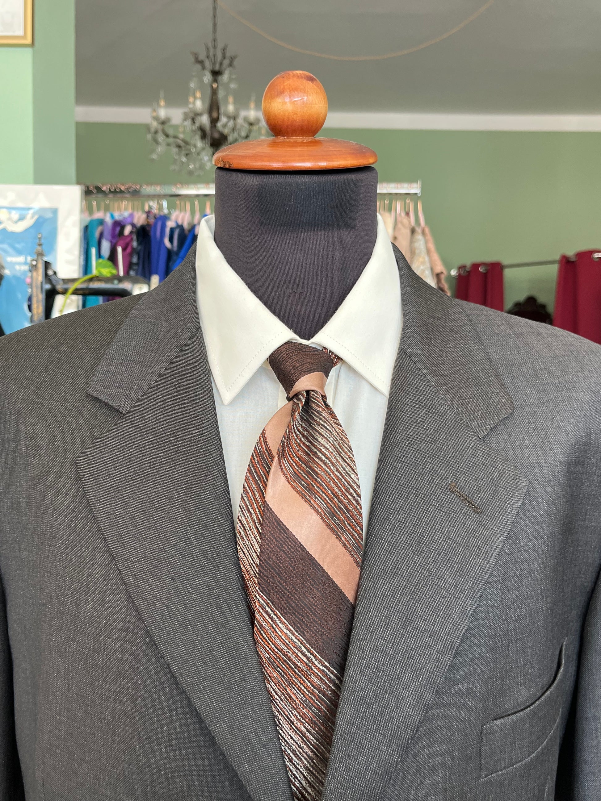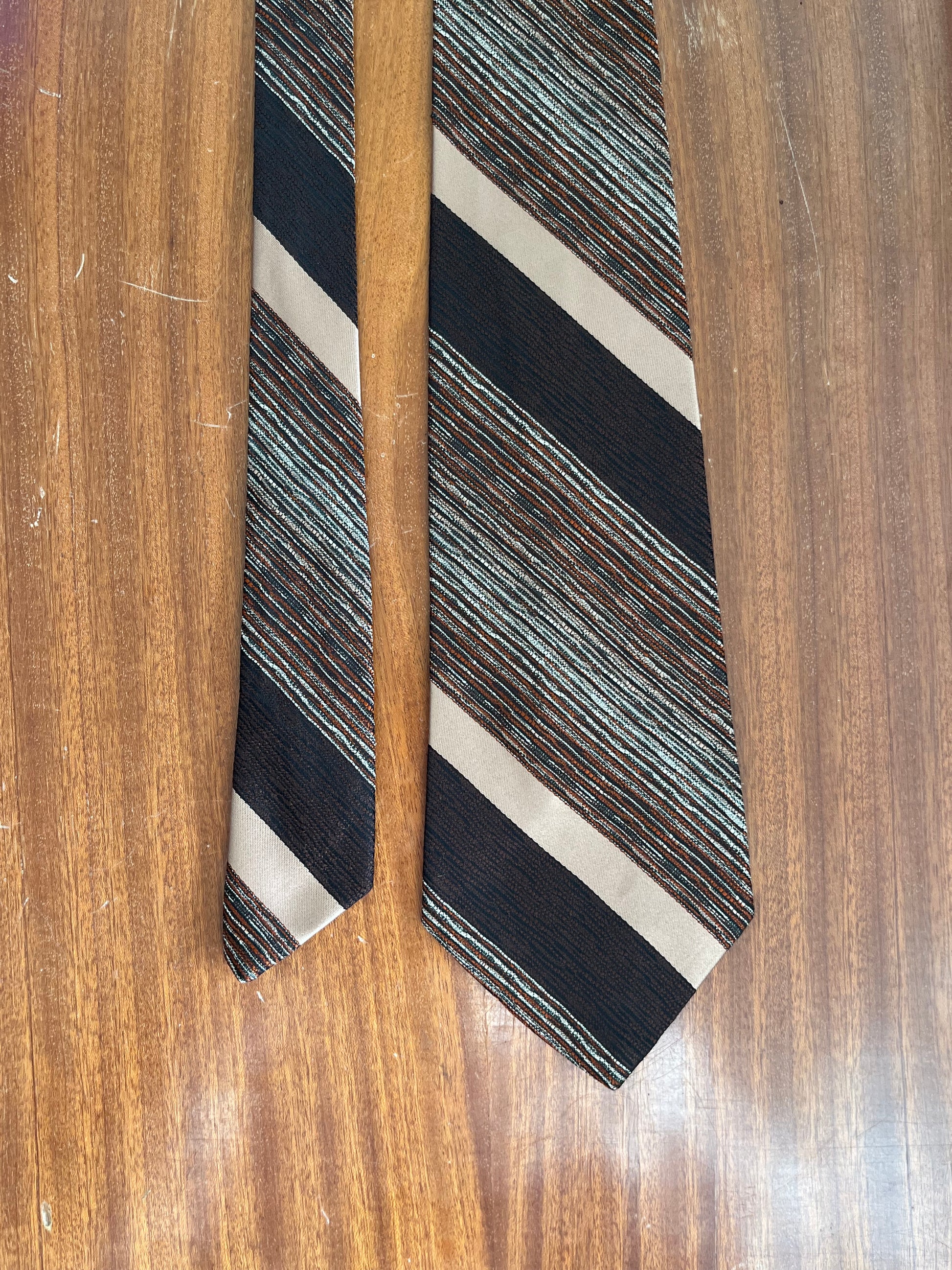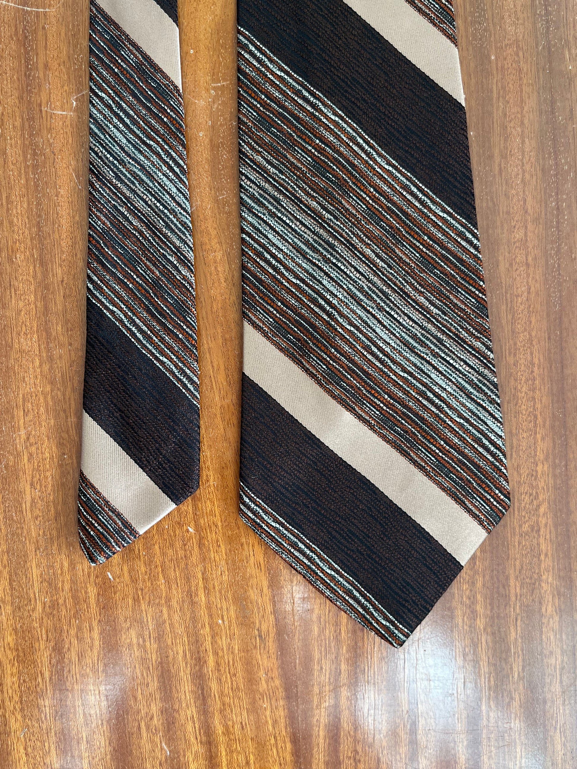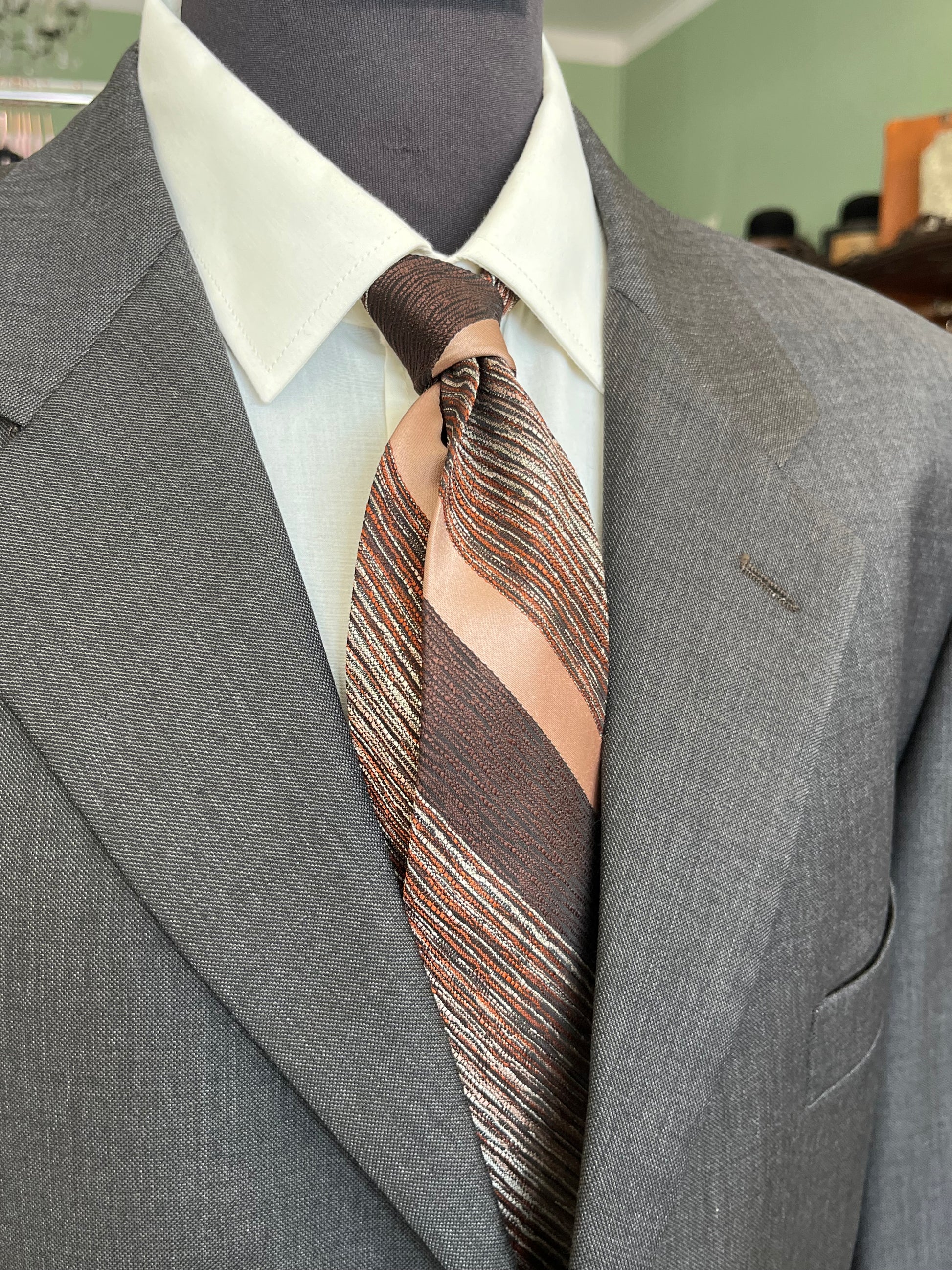 La cravatta presenta una fantasia a righe sui toni del marrone e del salmone.