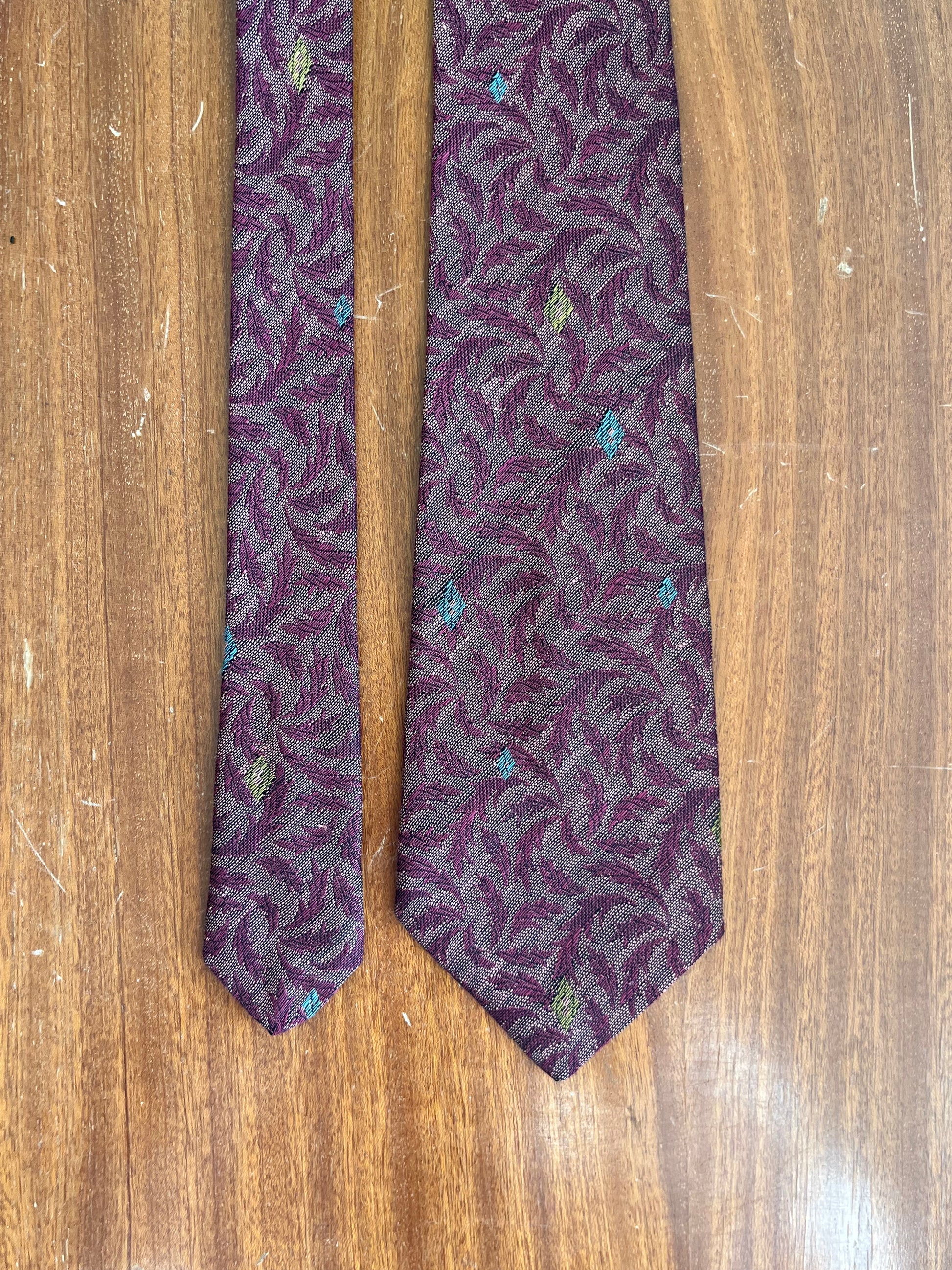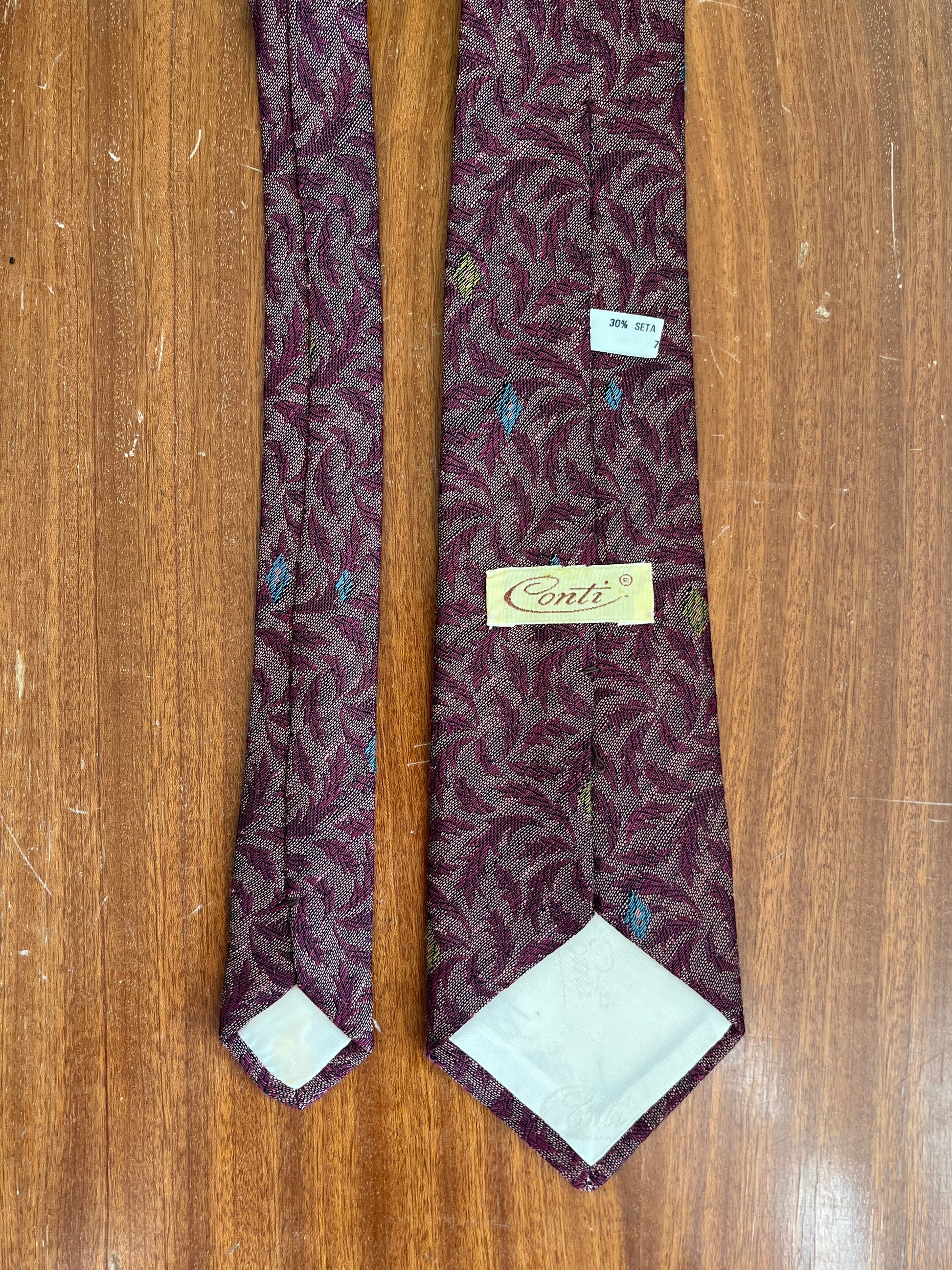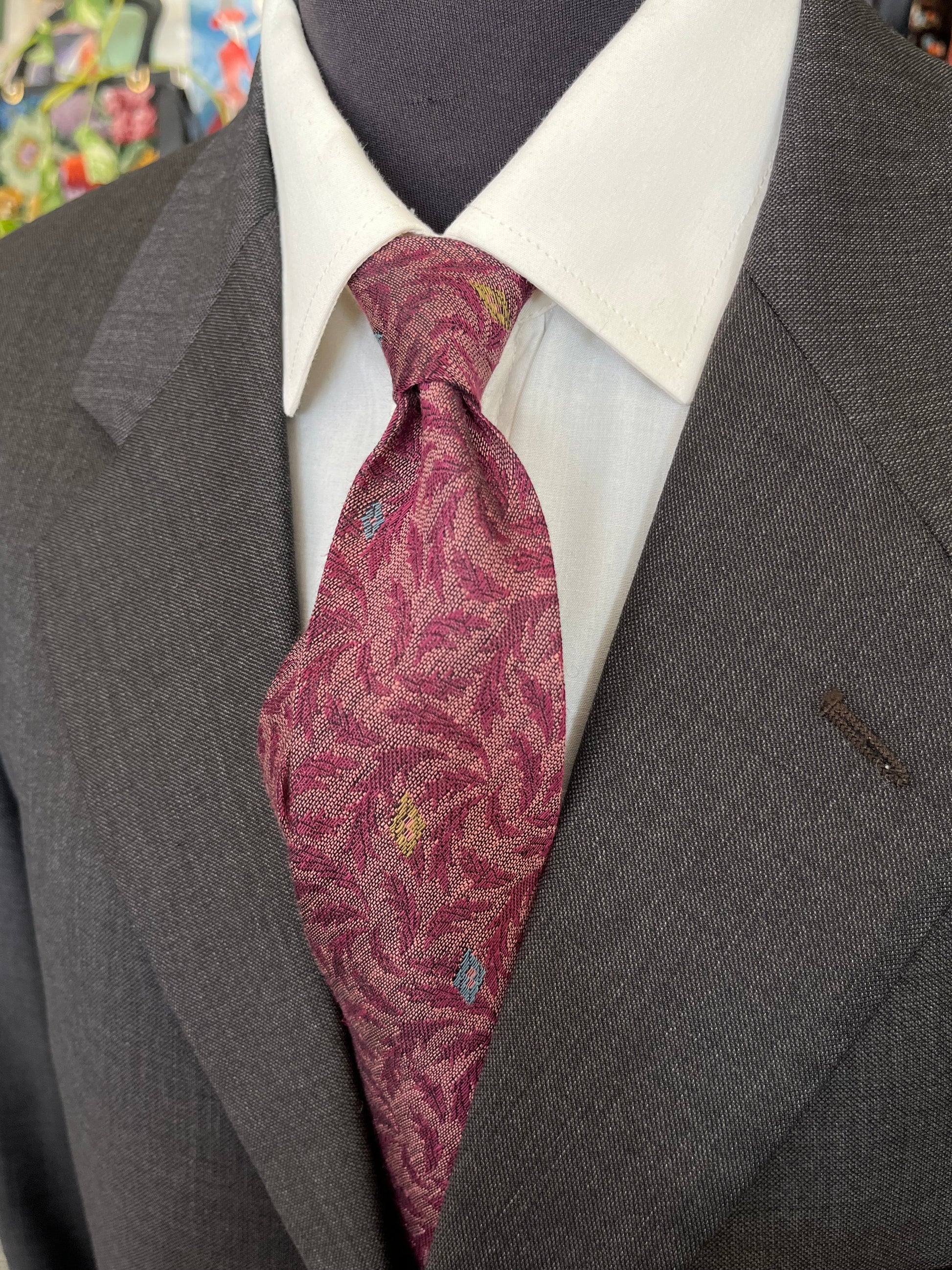 La cravatta presenta una fantasia a foglie sui toni del ciclamino. Si tratta della classica cravatta slim degli anni ‘60.