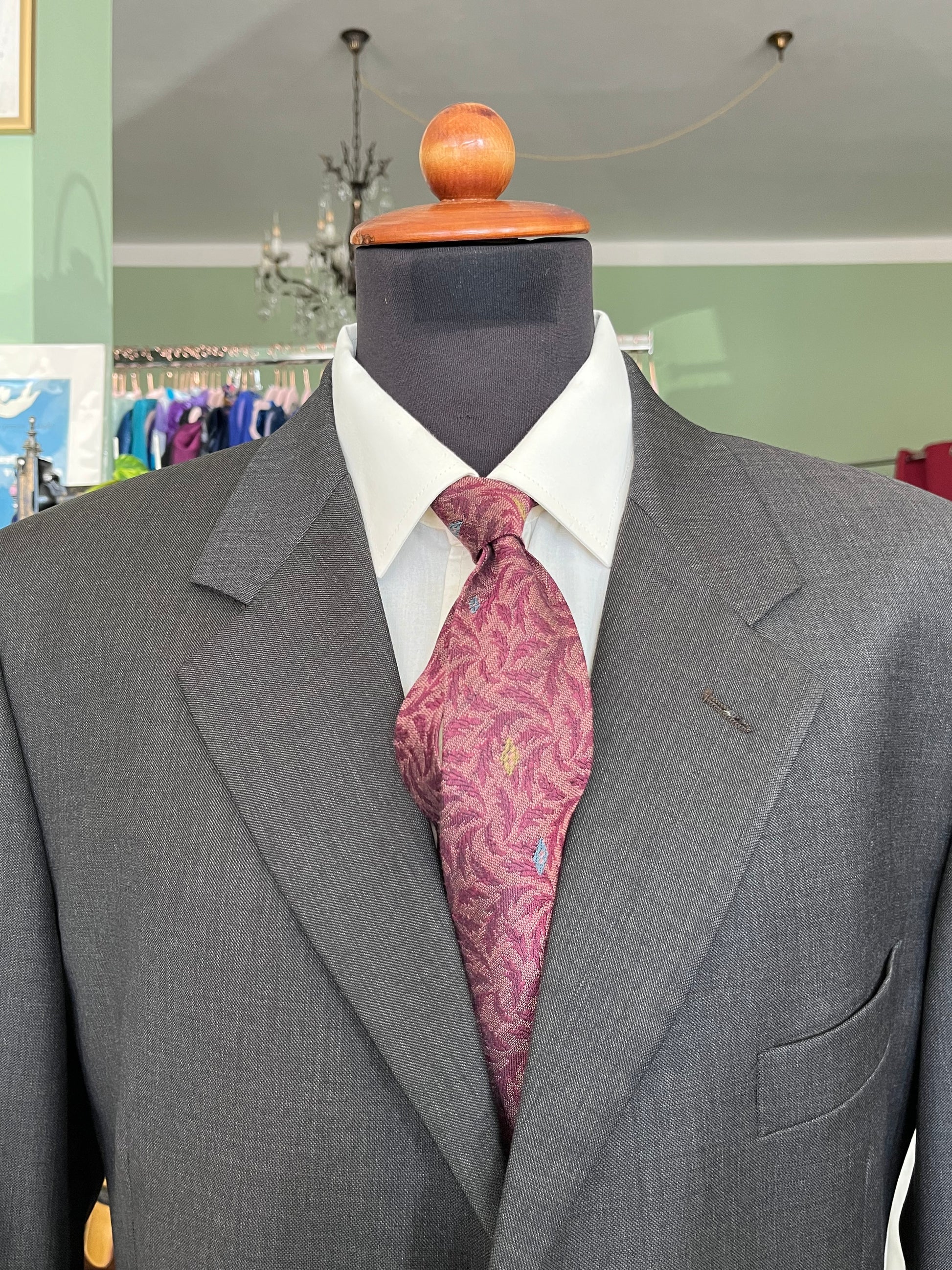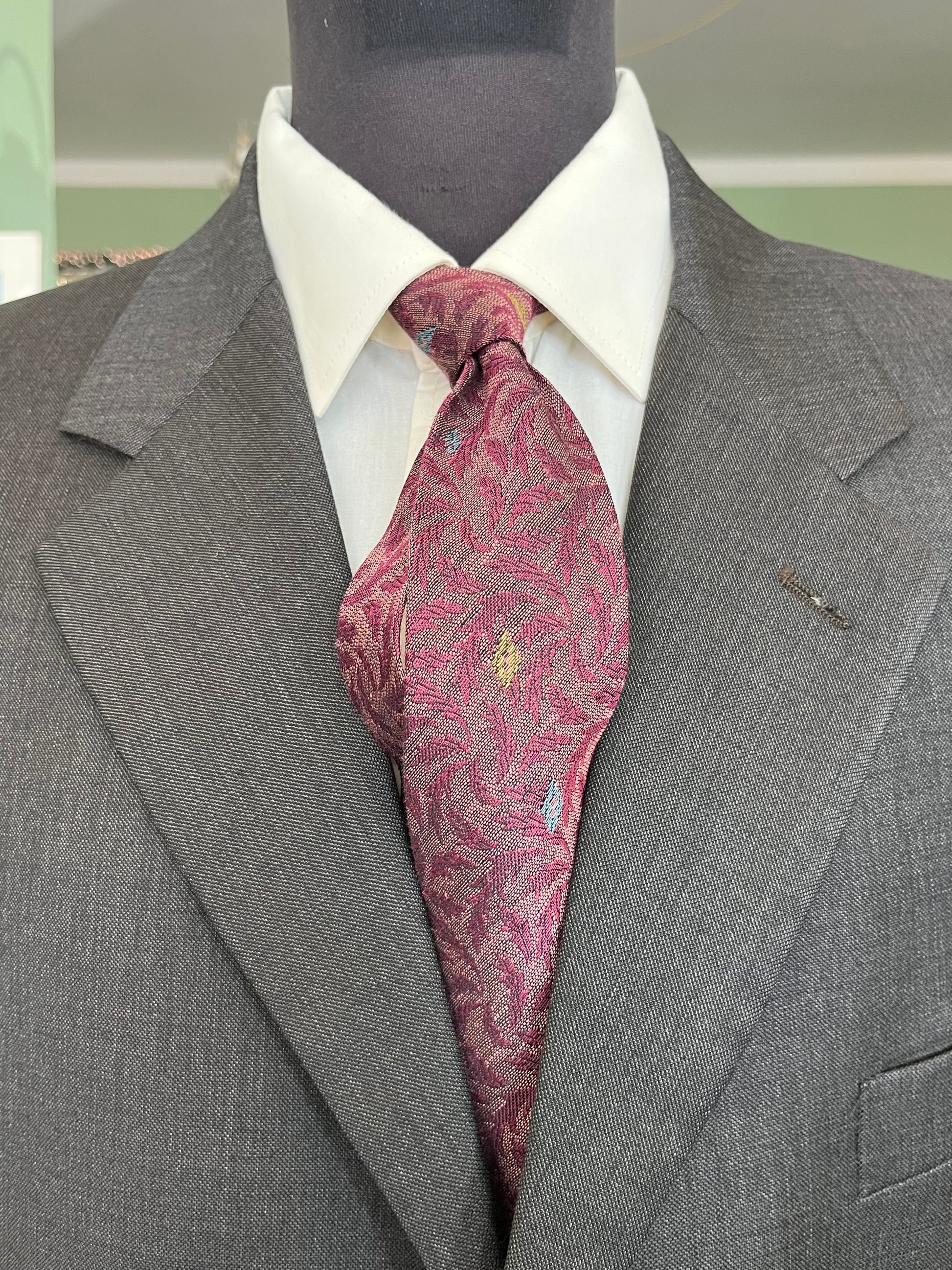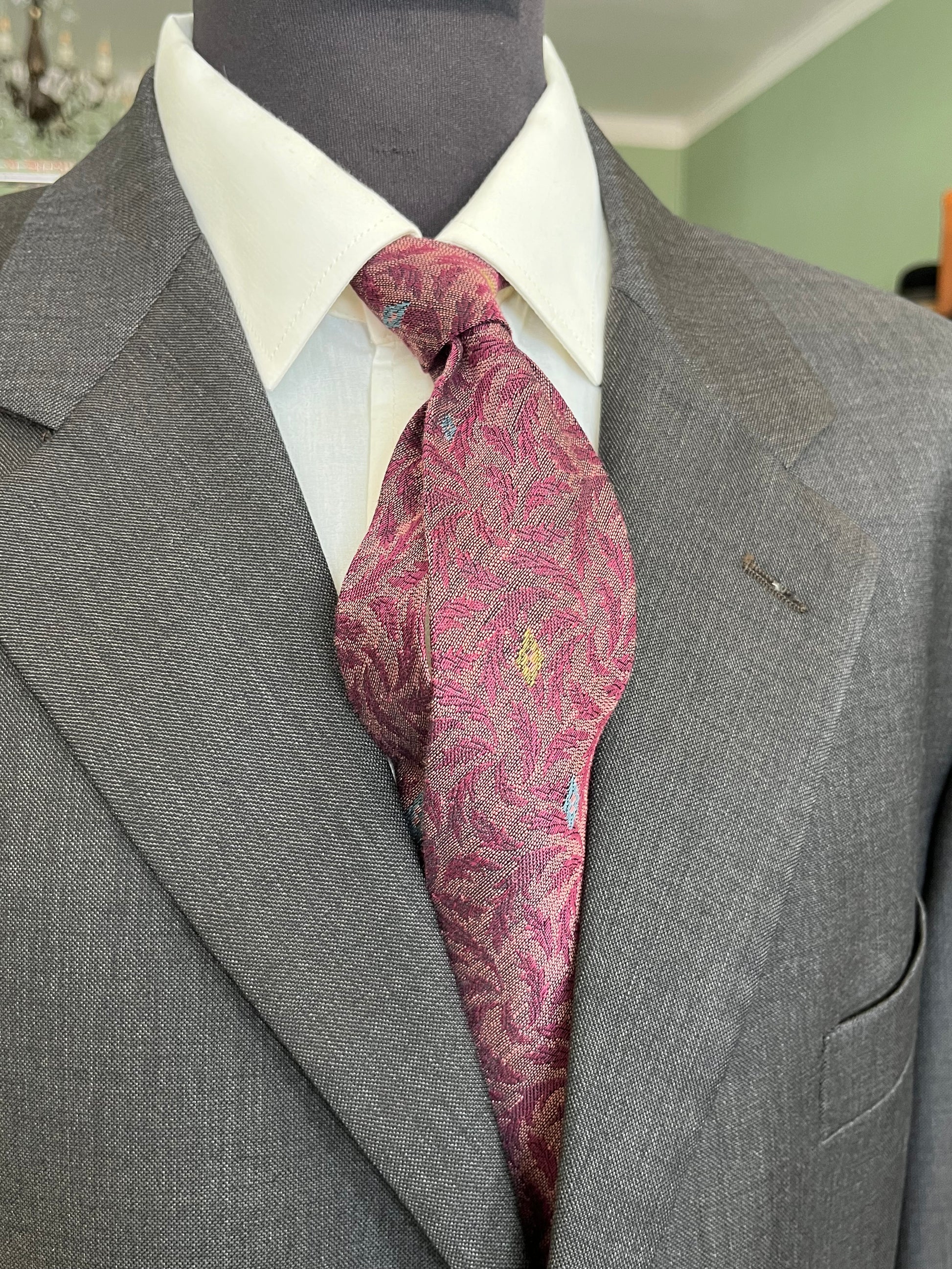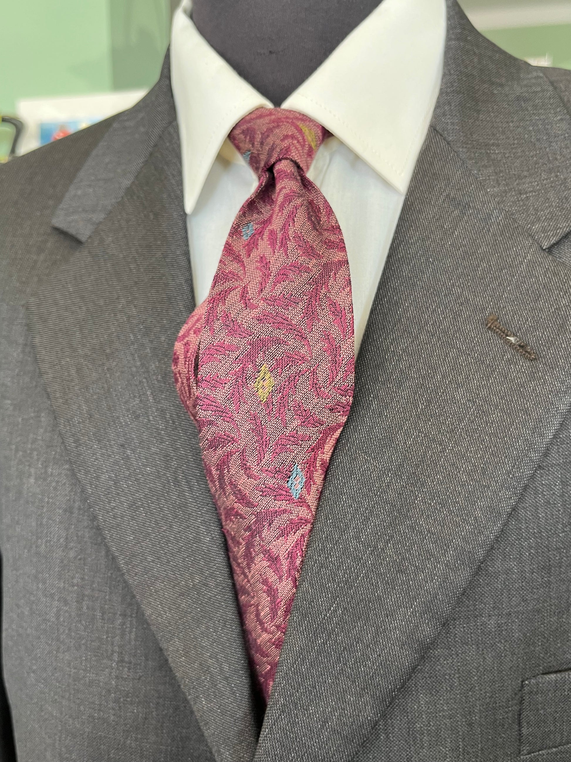 La cravatta presenta una fantasia a foglie sui toni del ciclamino. Si tratta della classica cravatta slim degli anni ‘60.