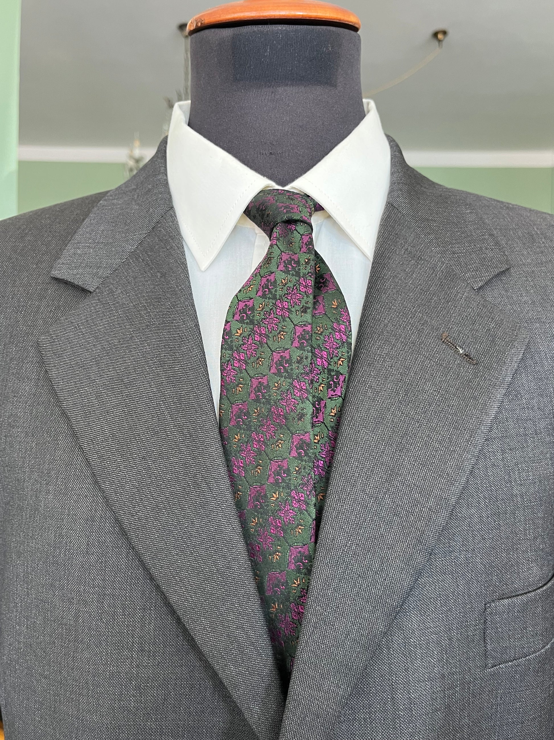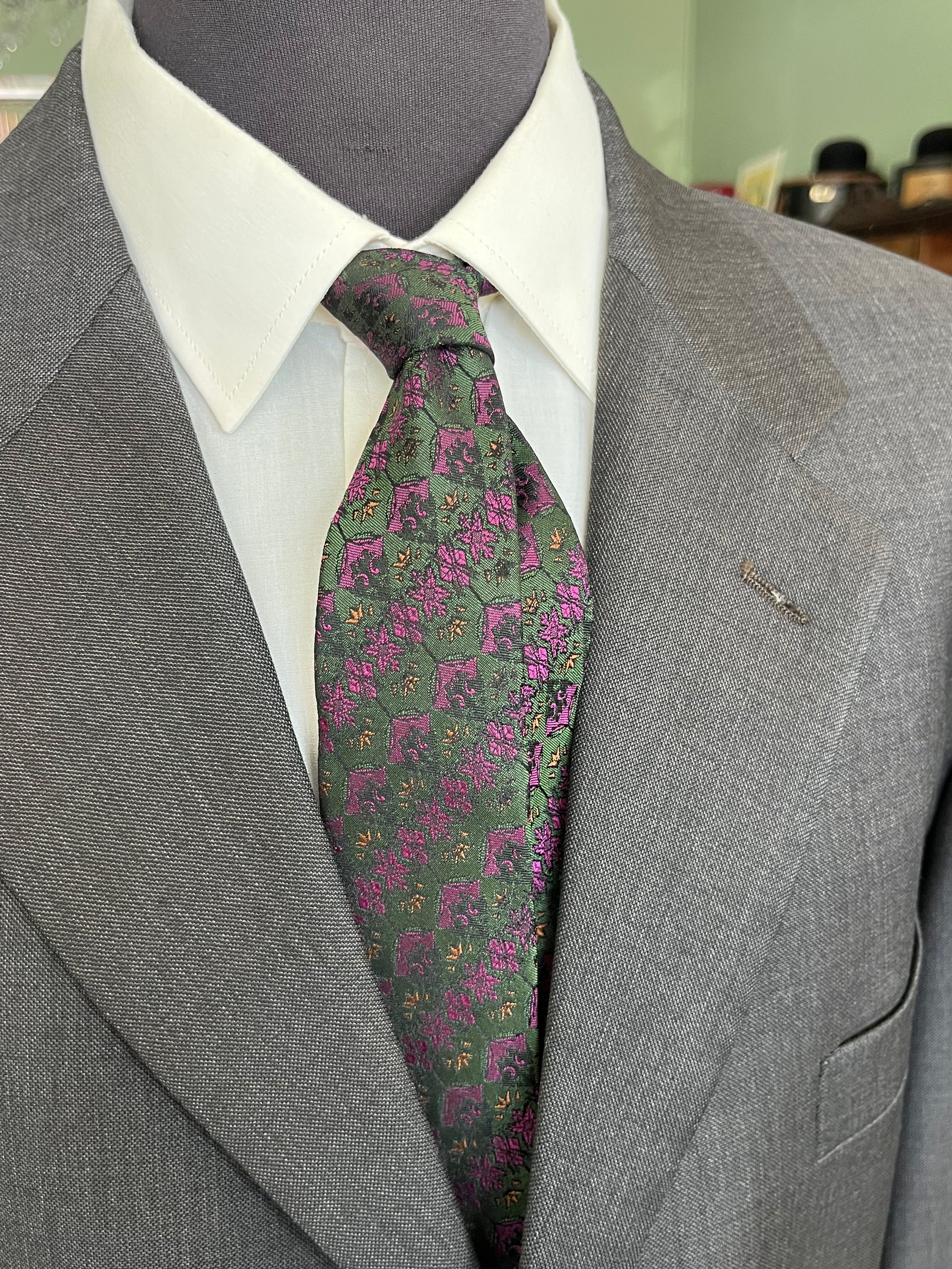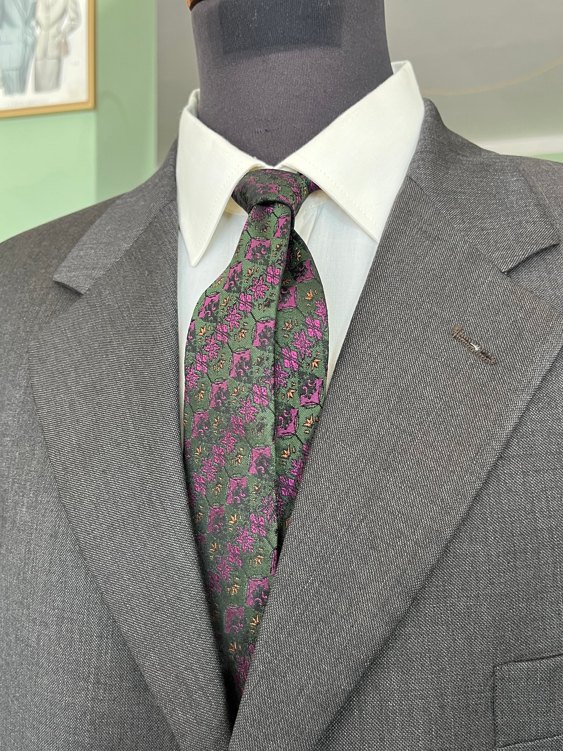 La cravatta presenta una fantasia a fiori astratti sui toni verde e fucsia. Presenta inoltre pala e codino squadrati.