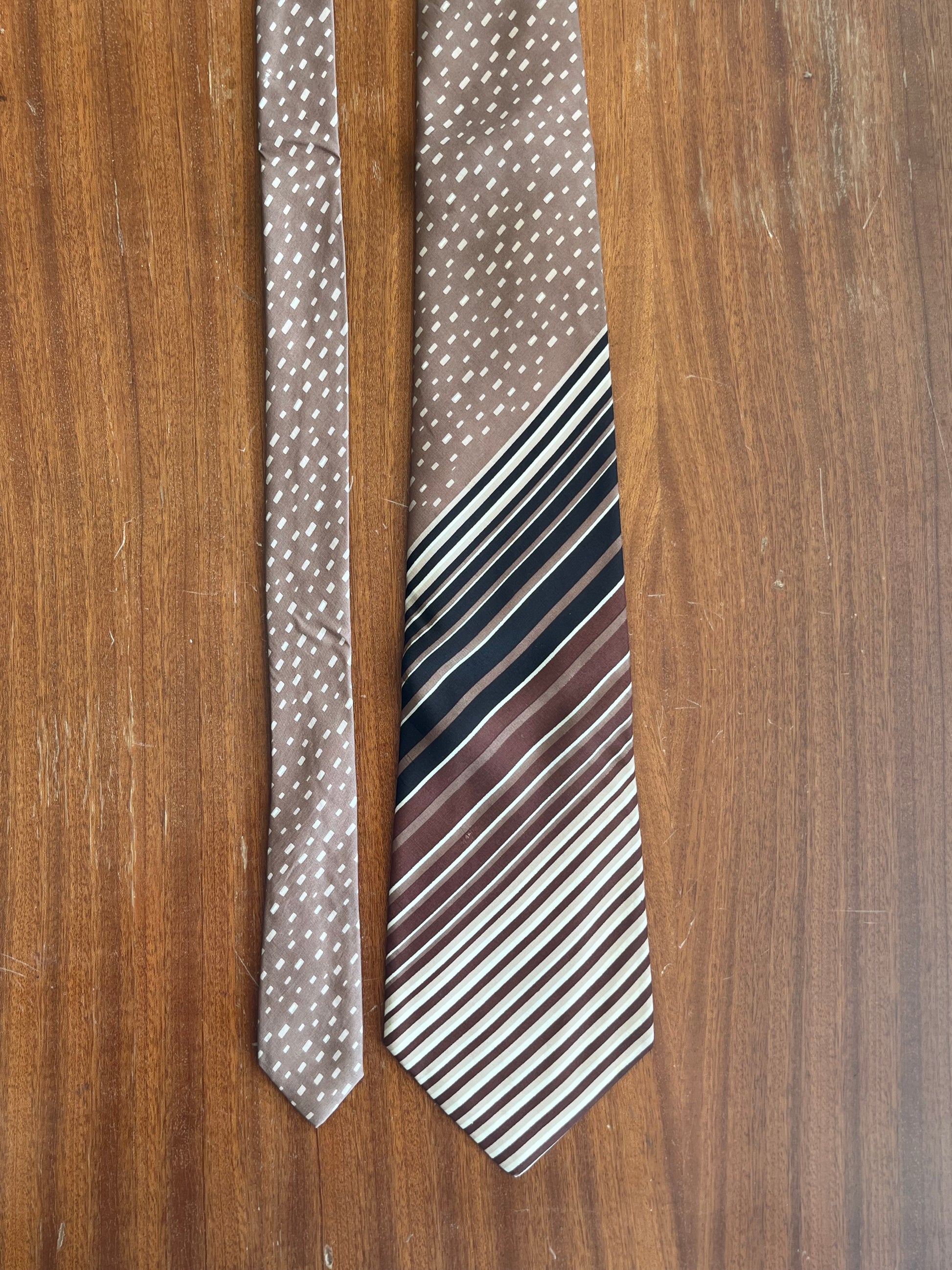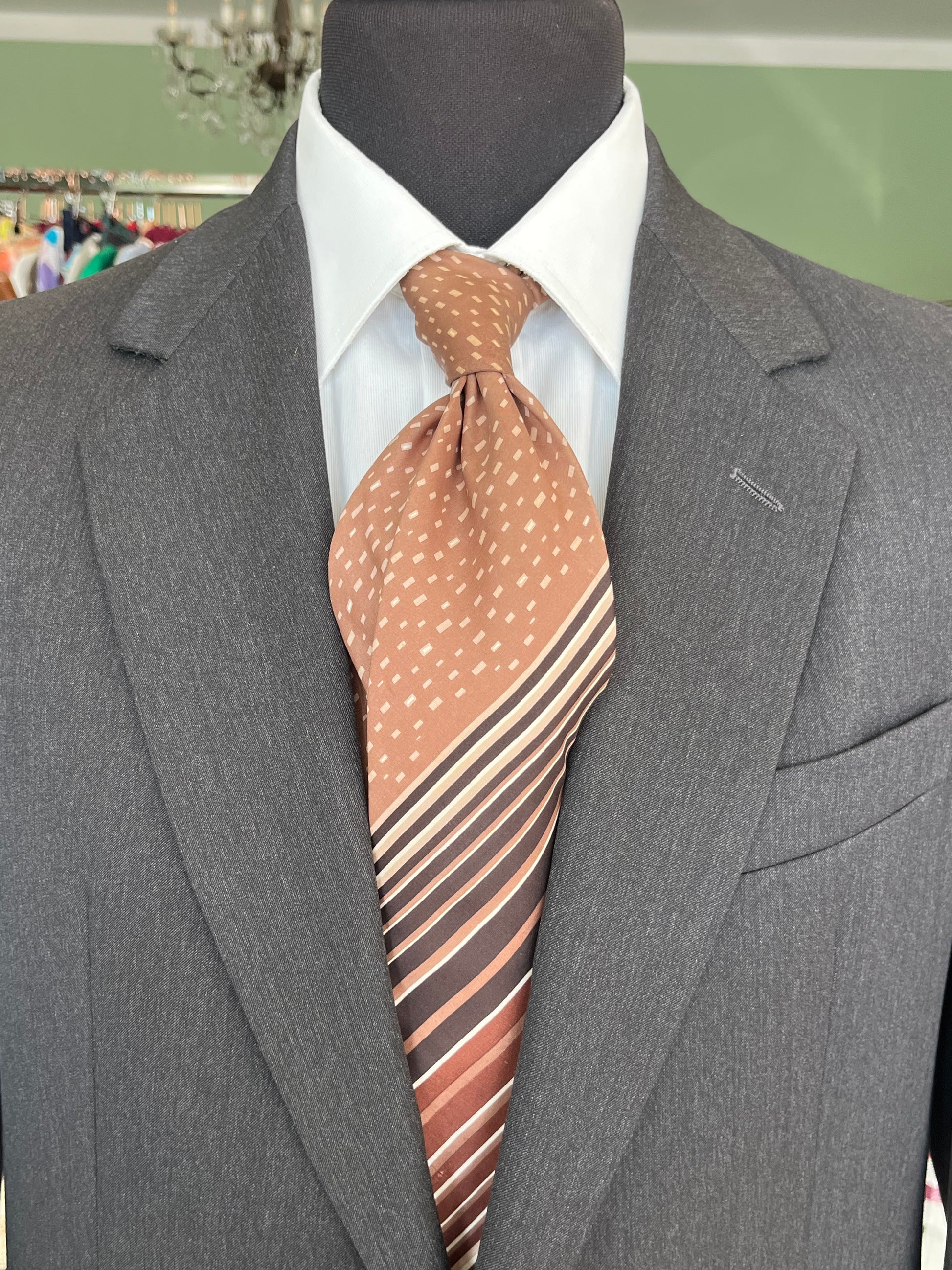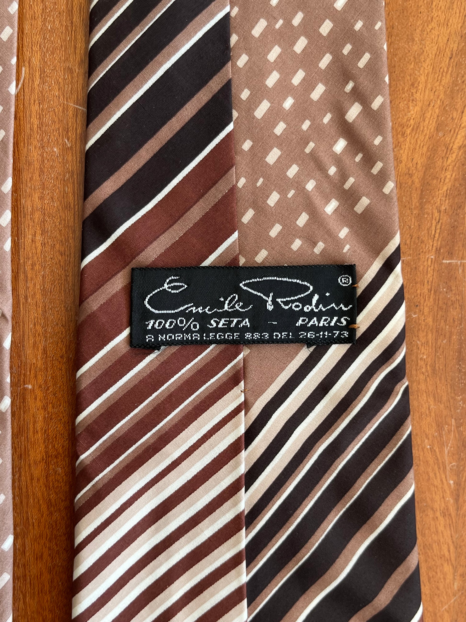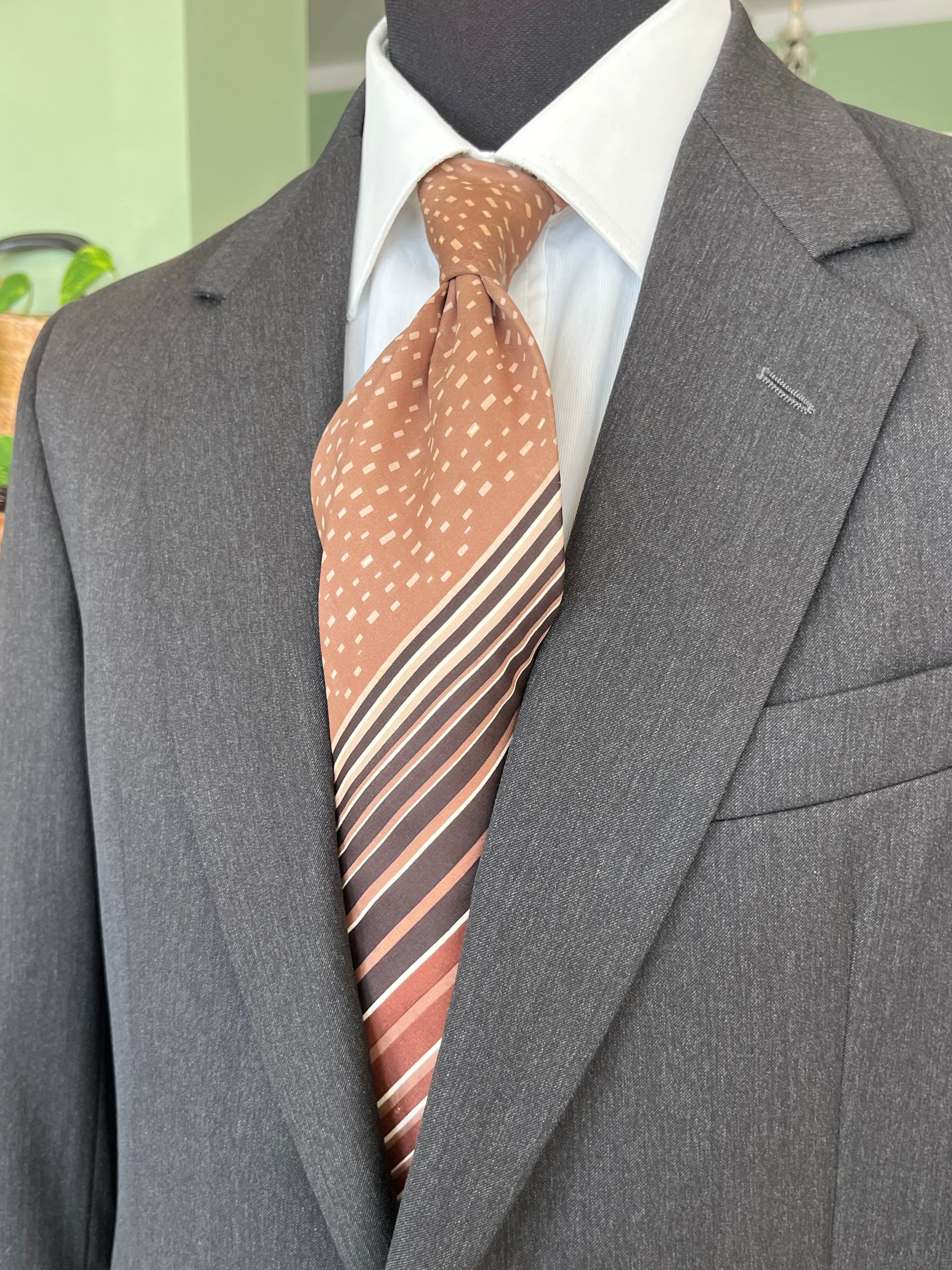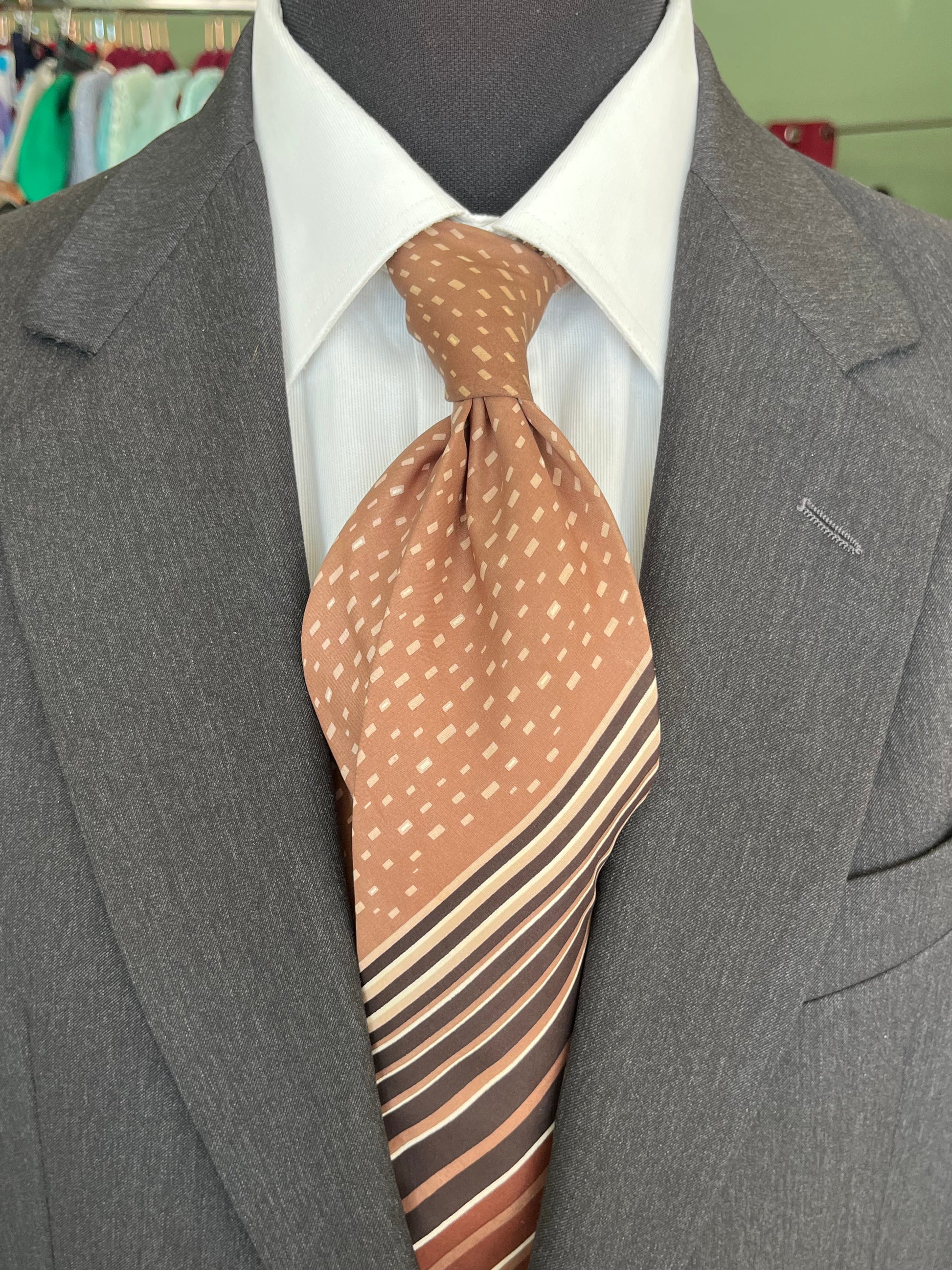 La cravatta presenta una fantasia a righe e trattini sui toni del marrone, nocciola e crema.