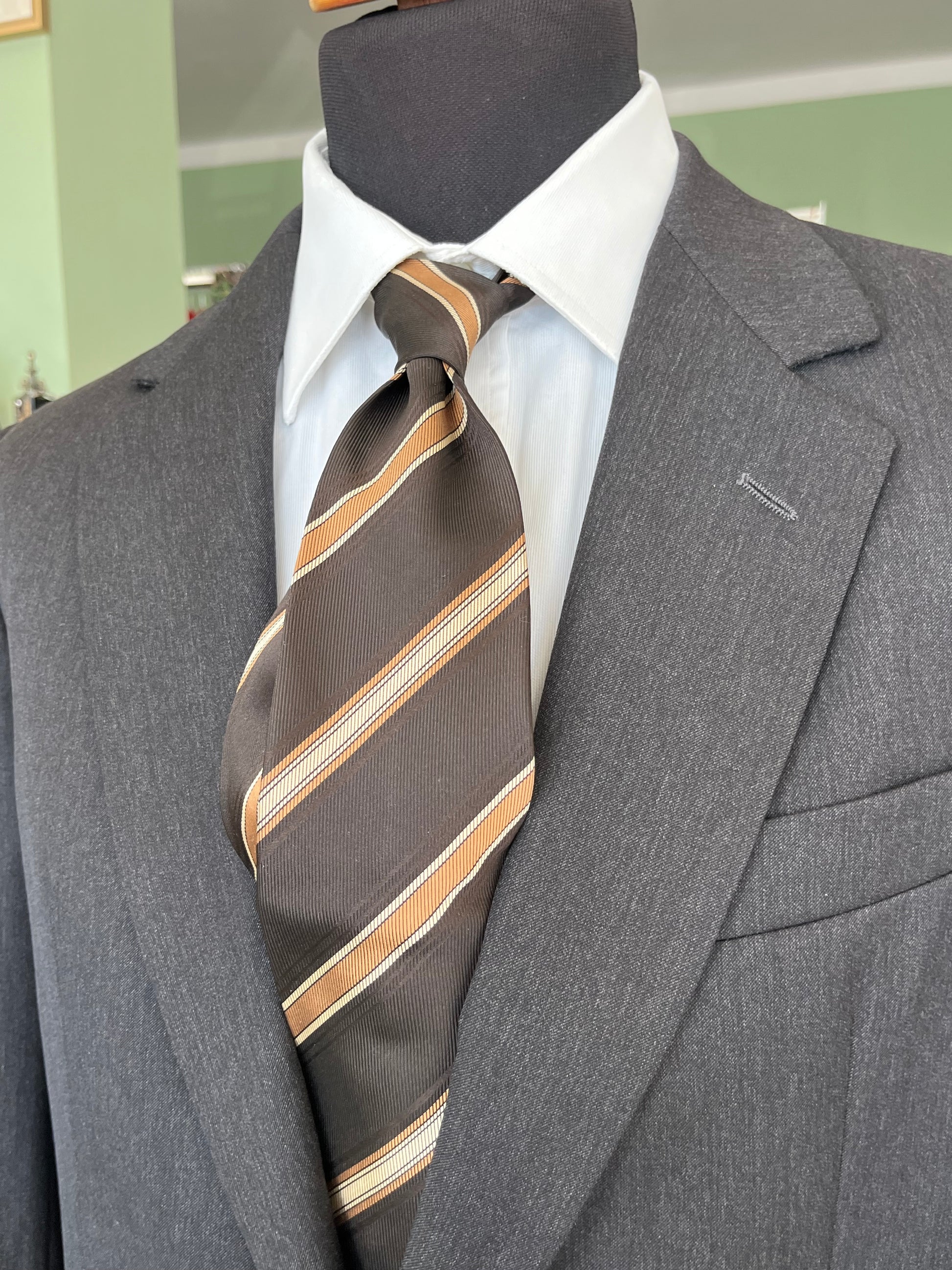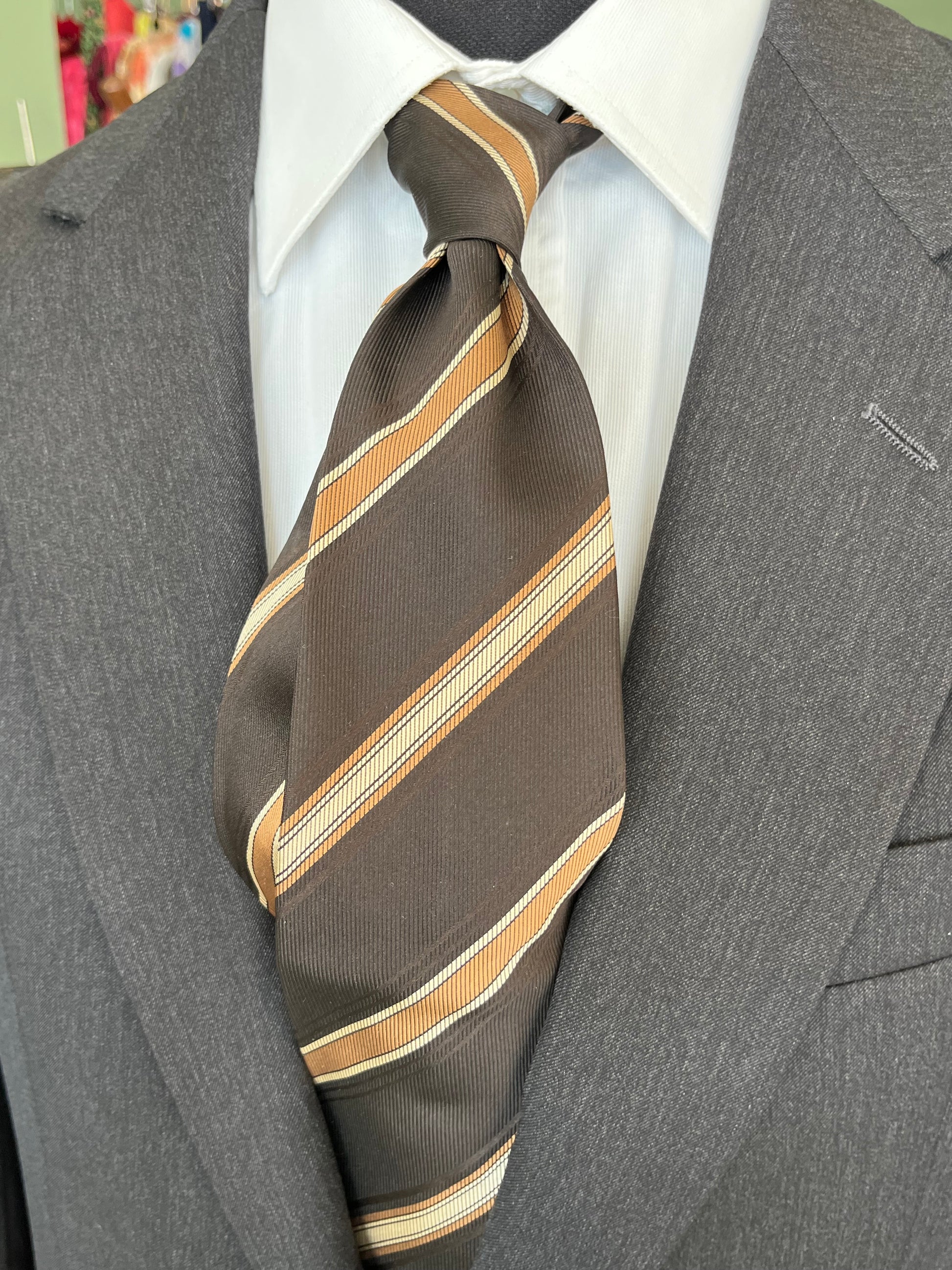 La cravatta presenta una fantasia a righe sui toni del marrone, nocciola e crema.