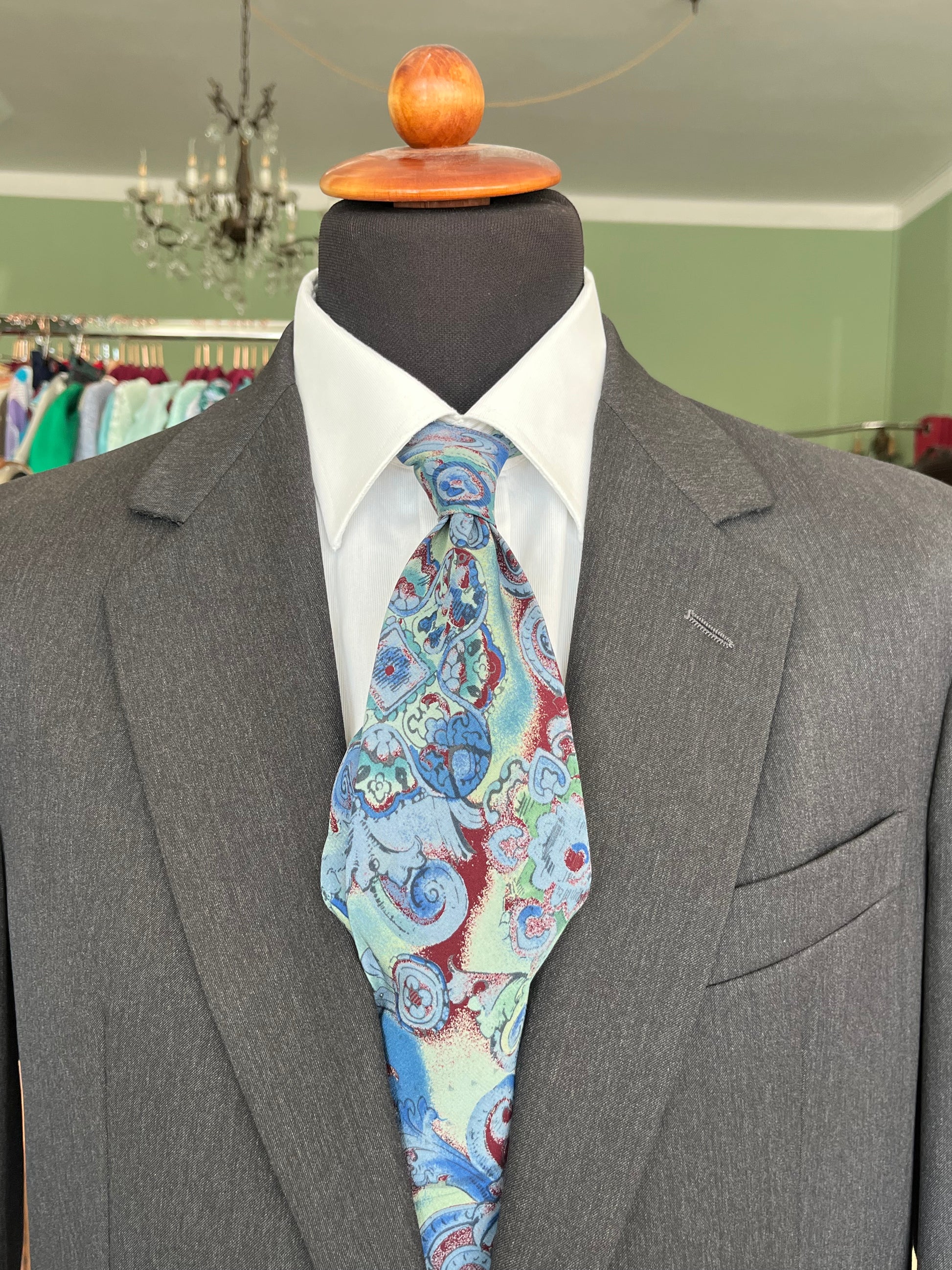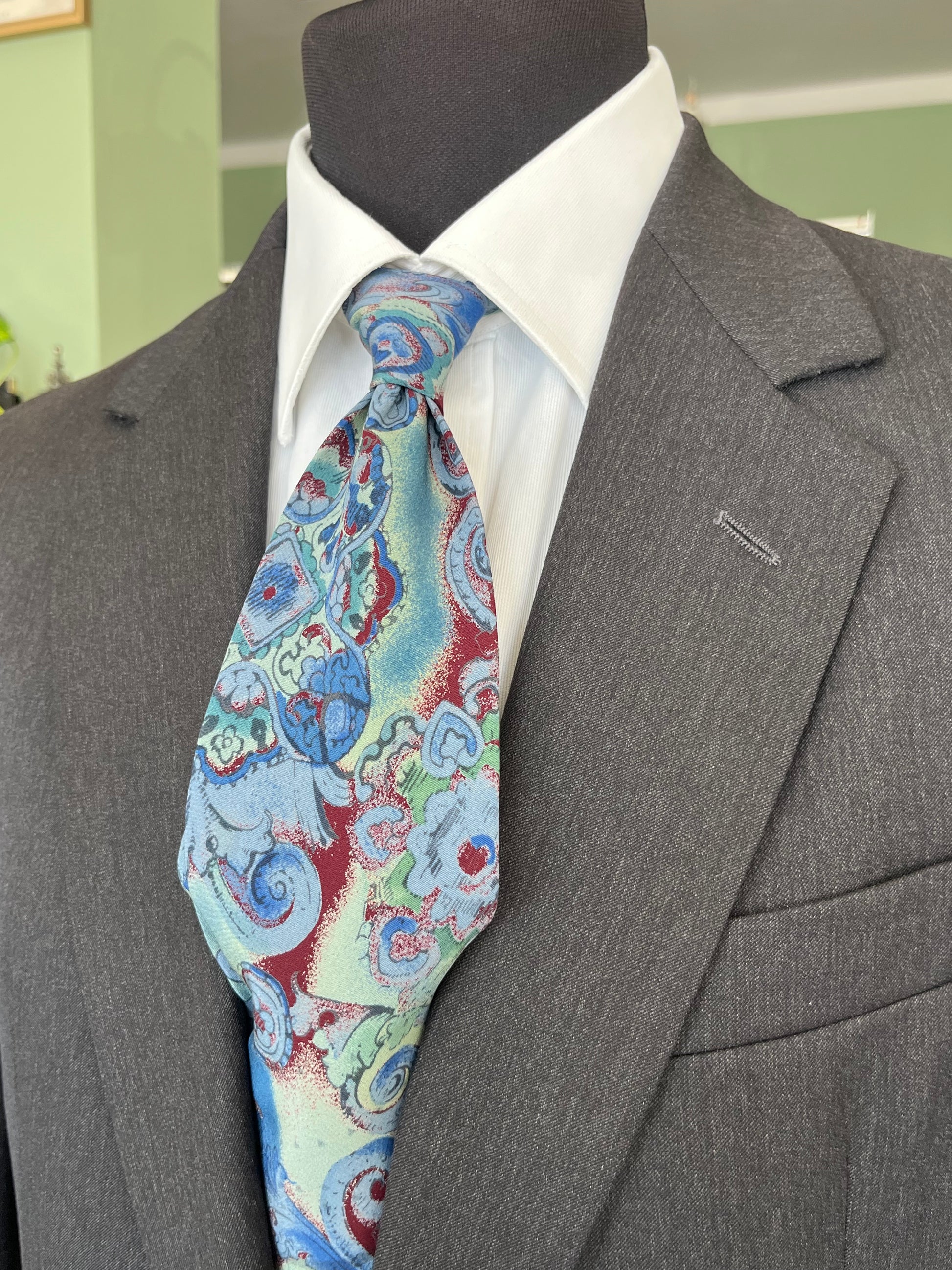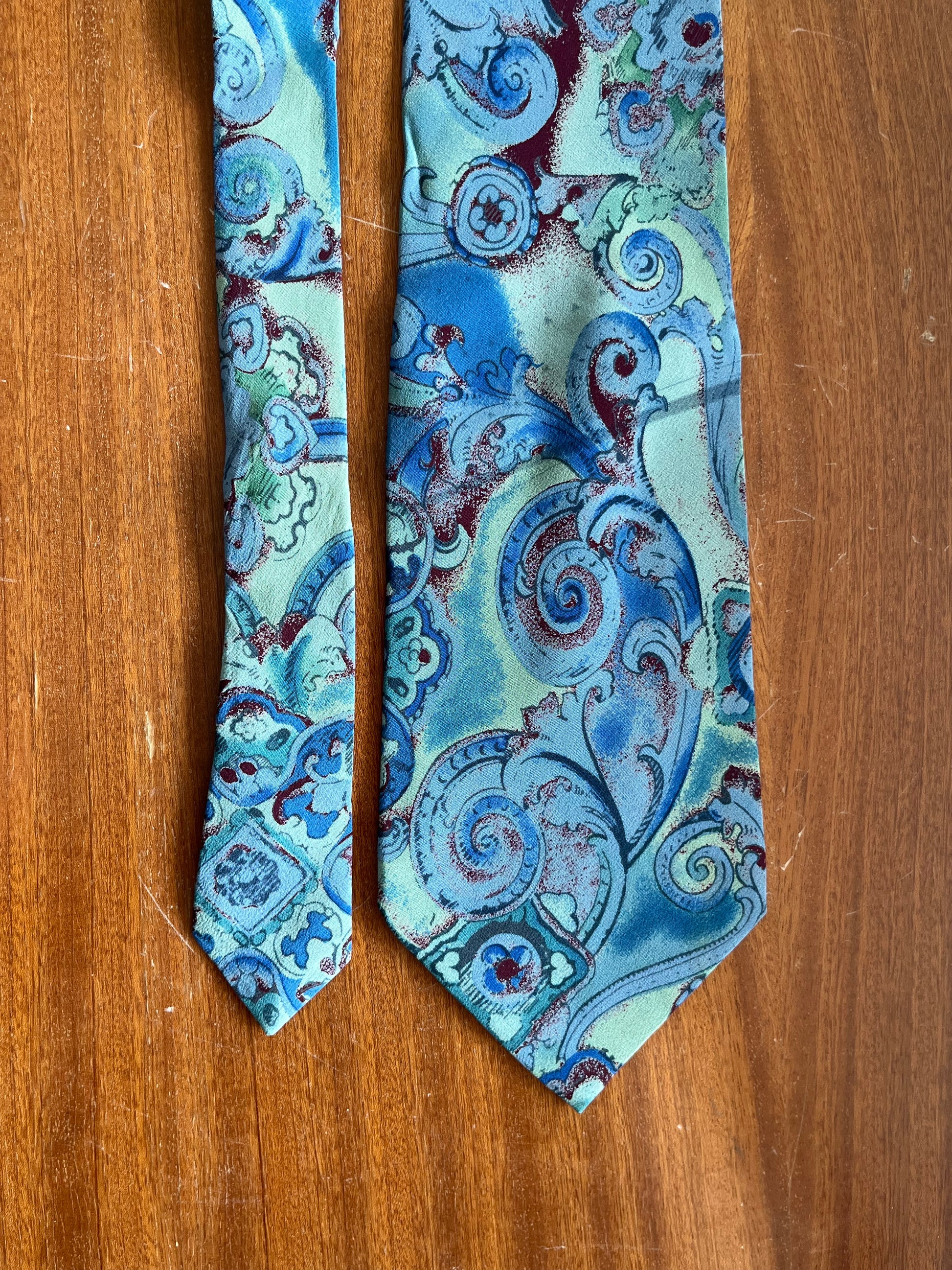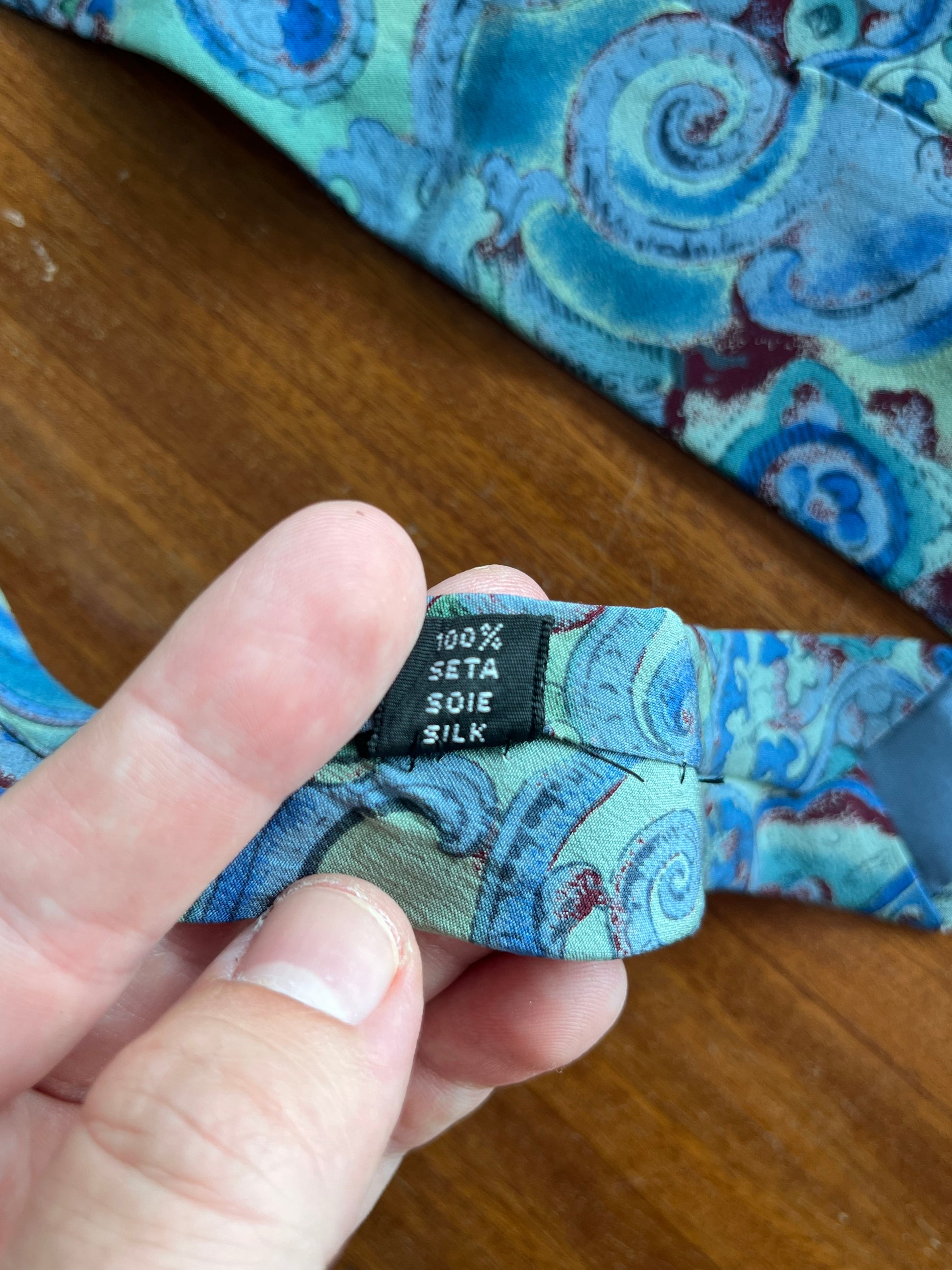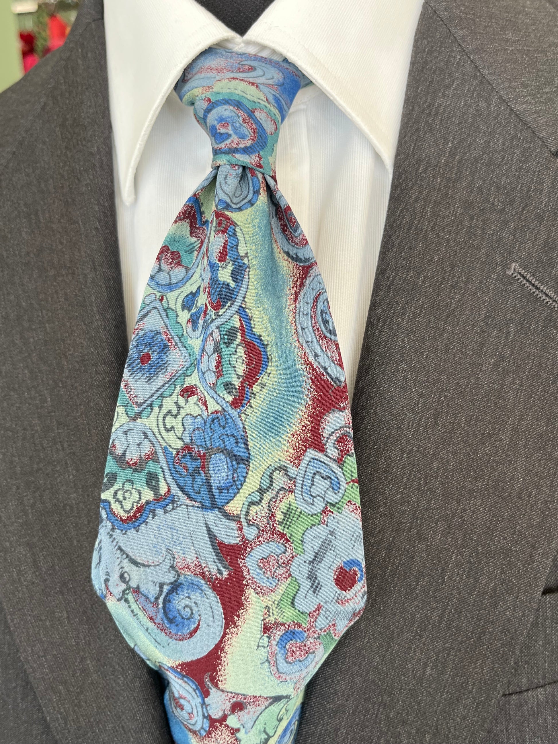 La cravatta presenta una fantasia astratta su sfondo color celeste e blu.