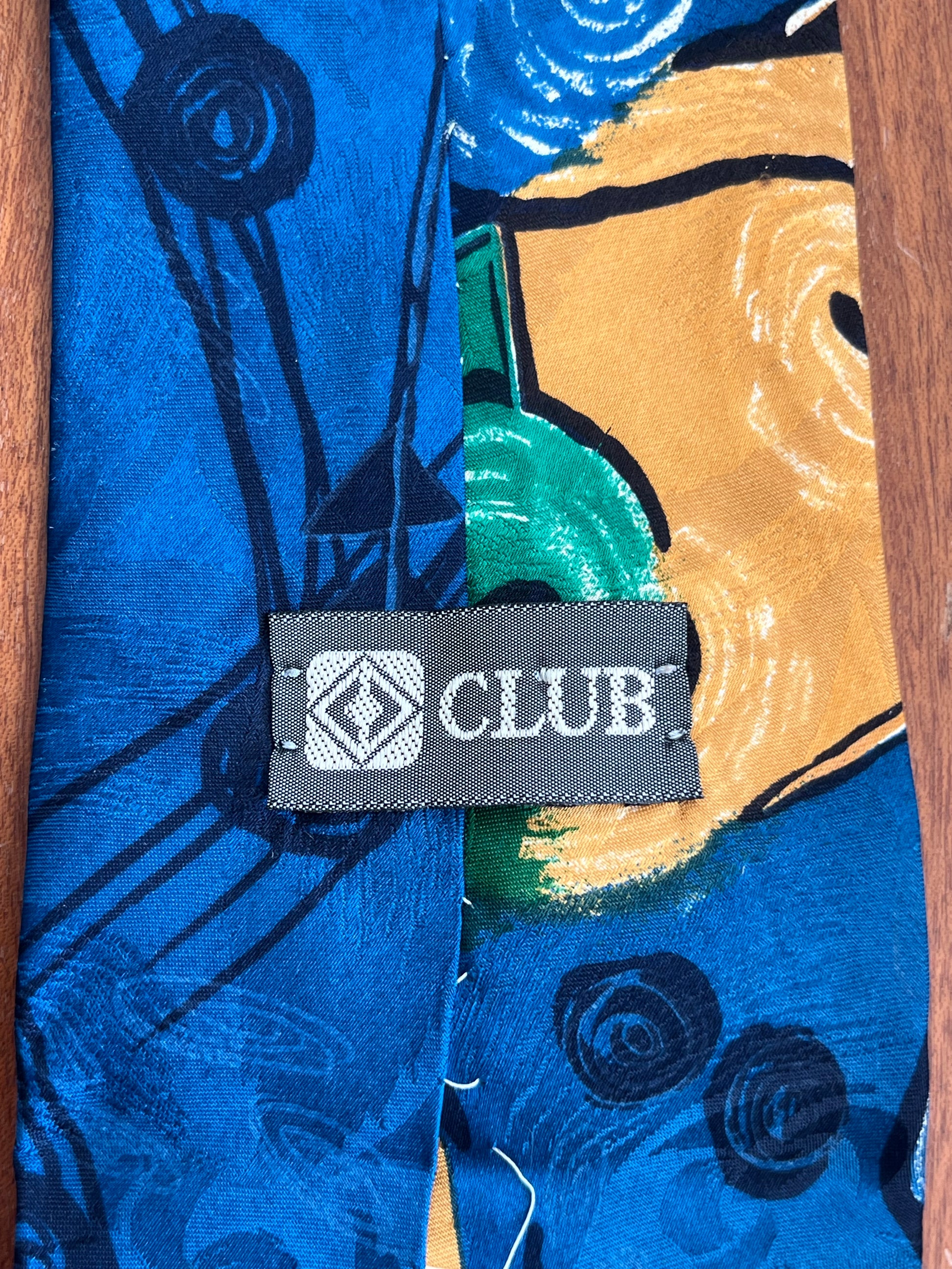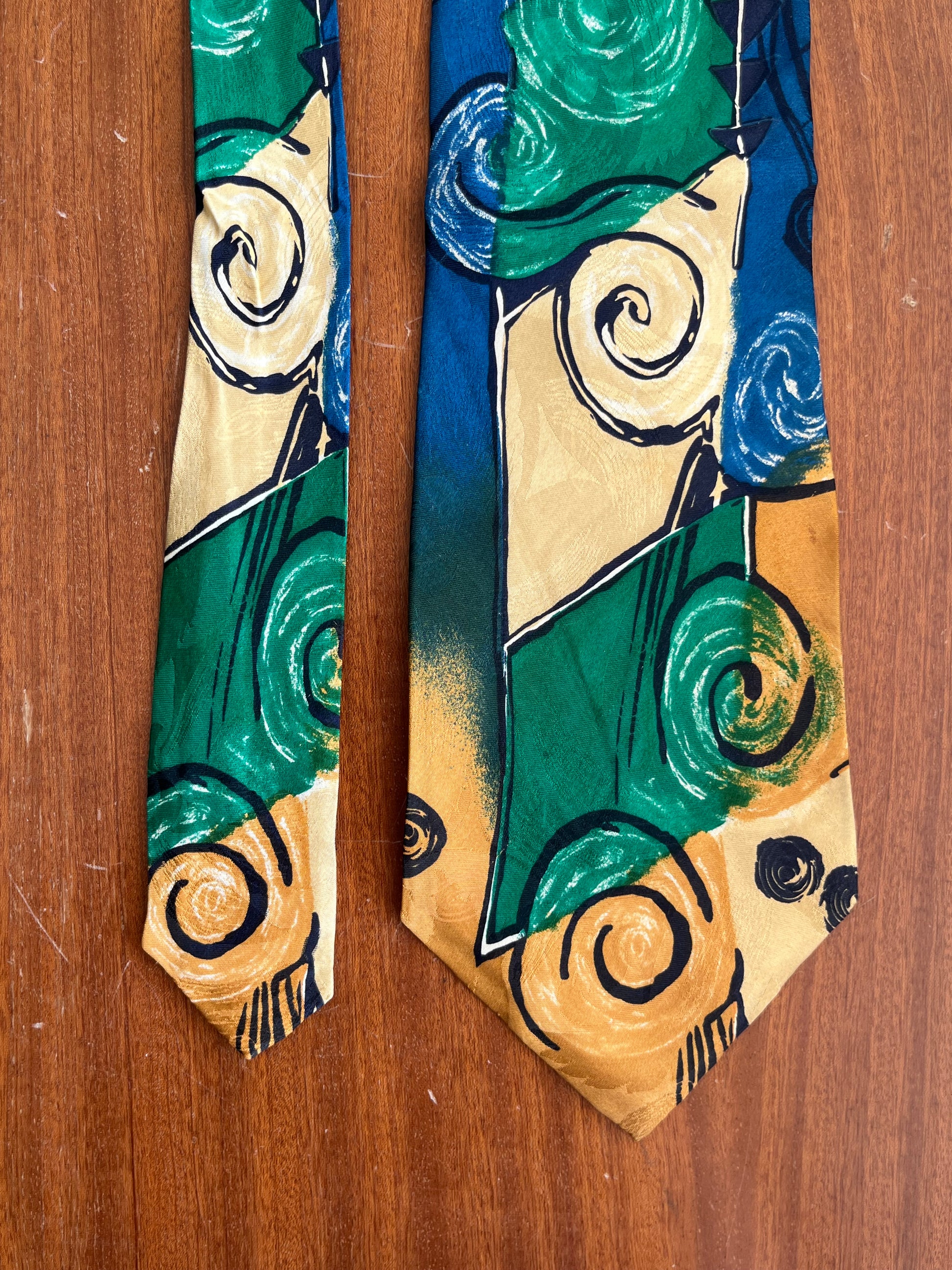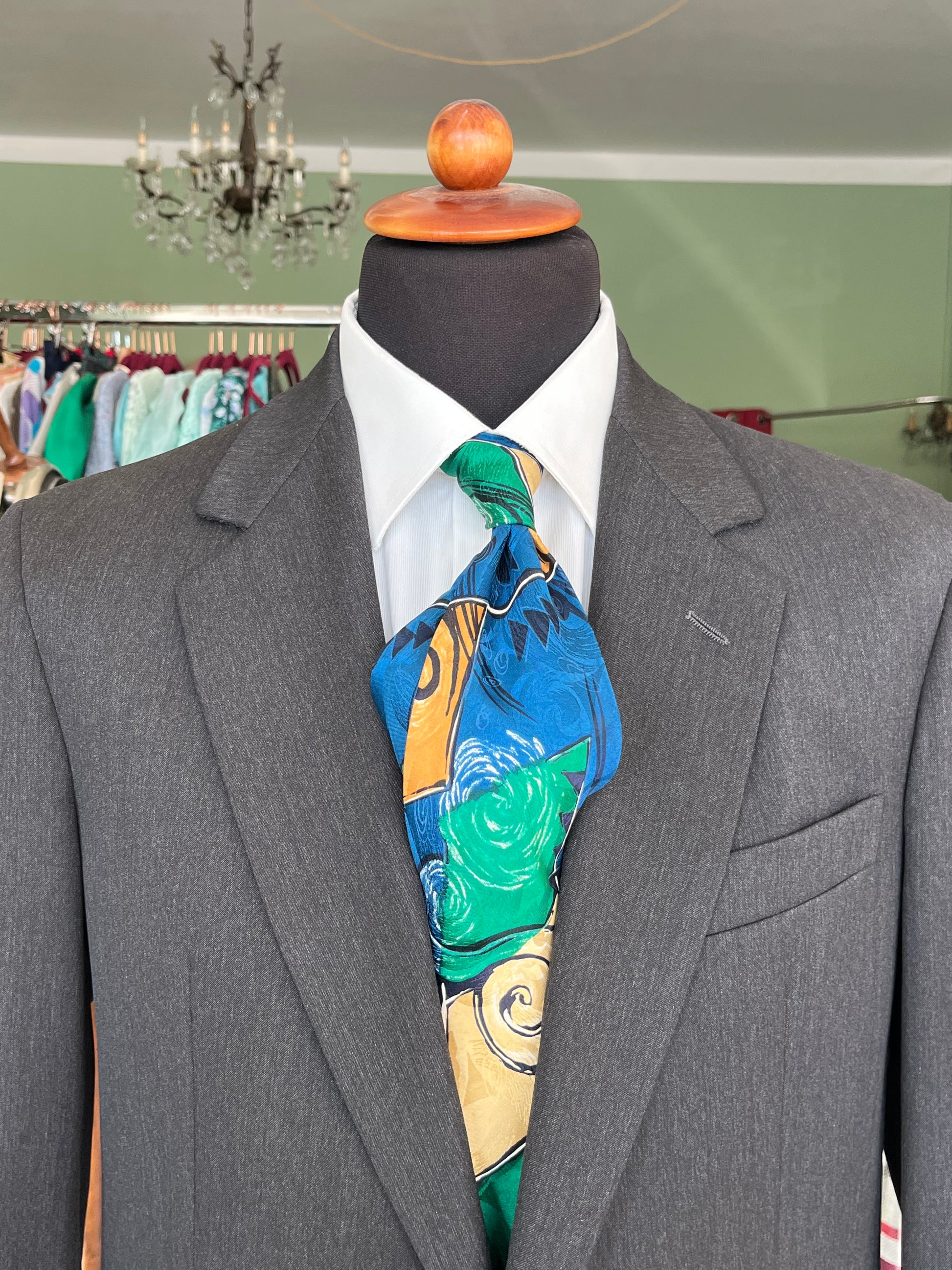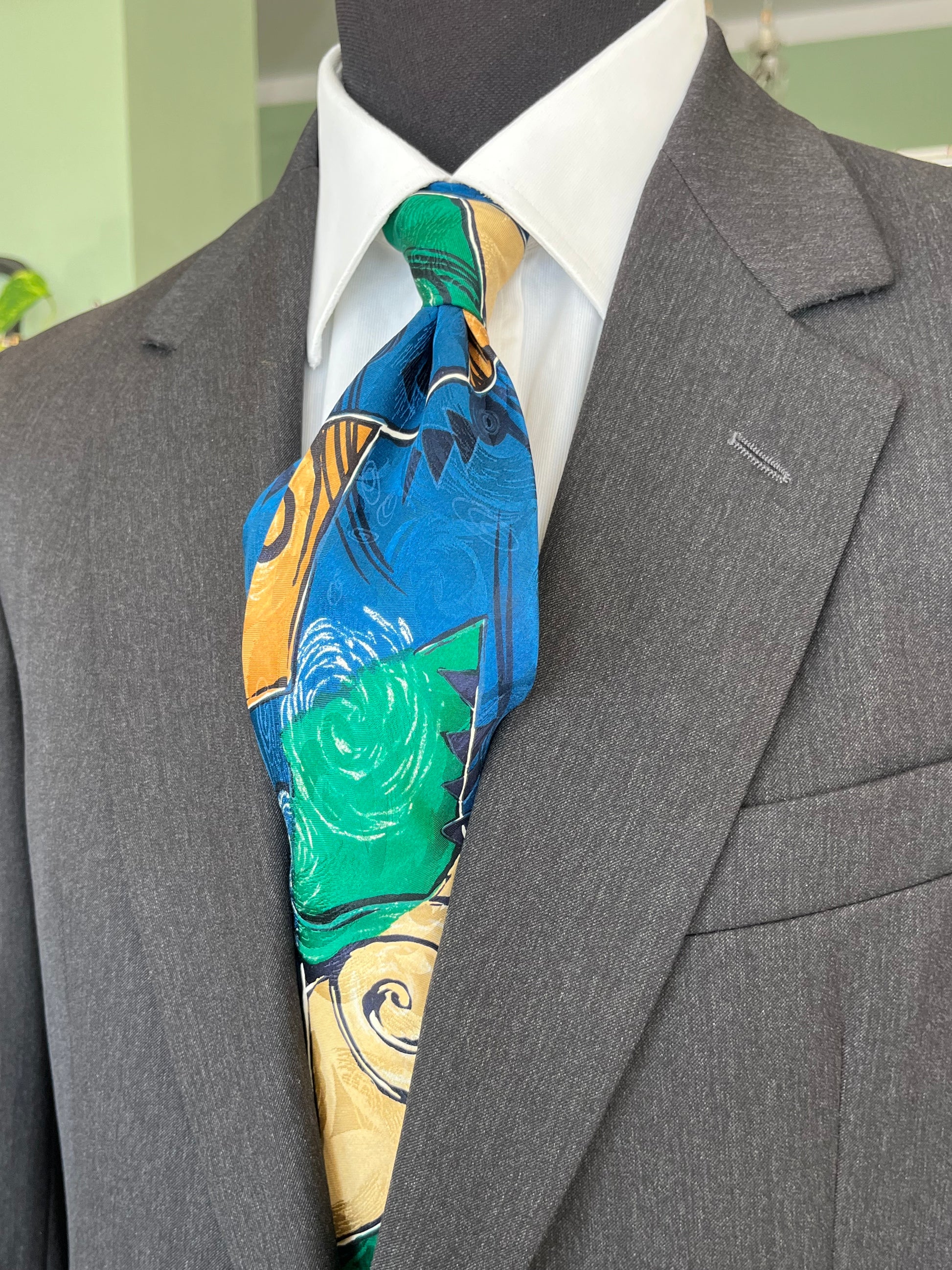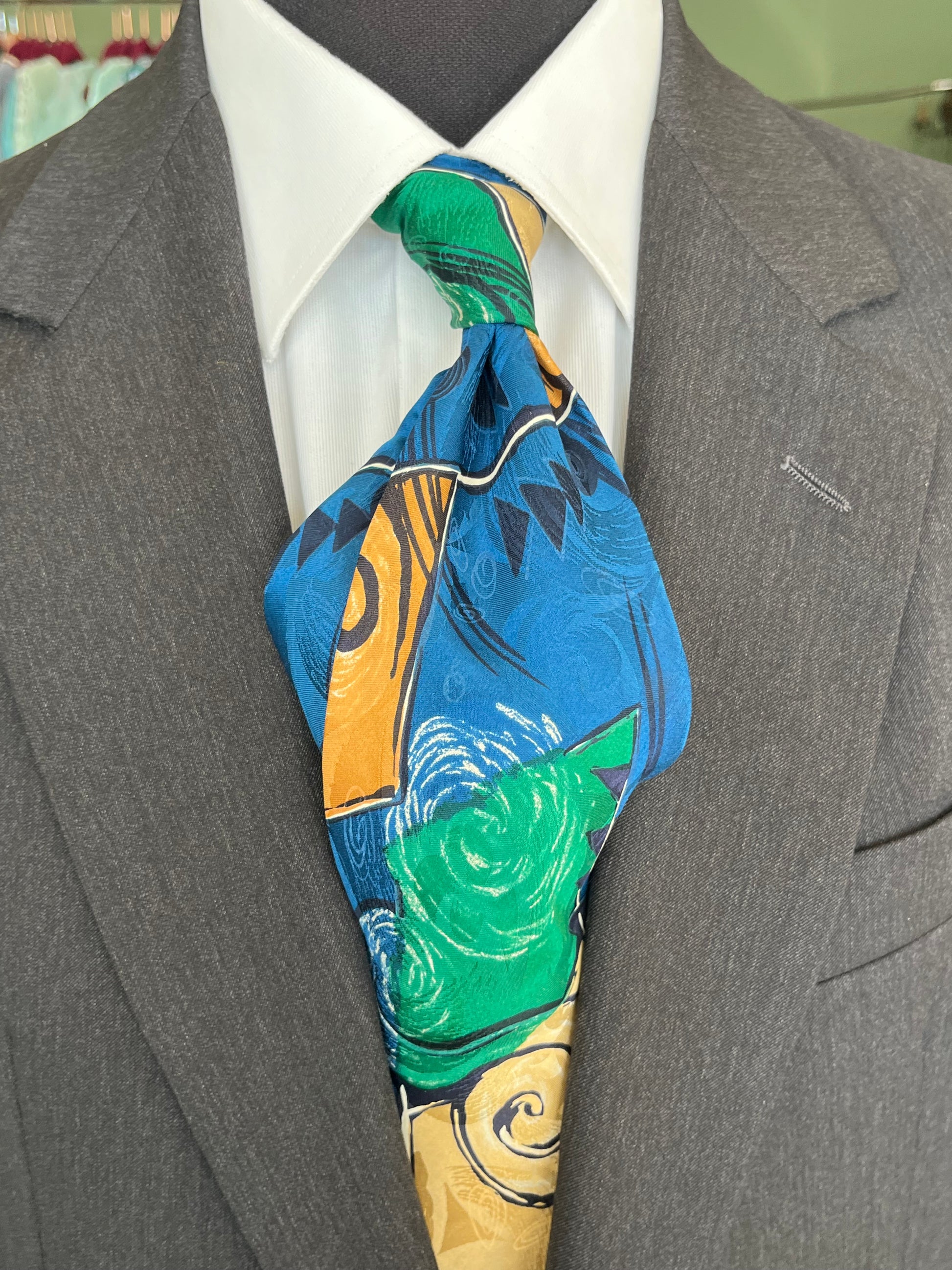 La cravatta presenta una fantasia astratta su sfondo color verde, blu e arancio.