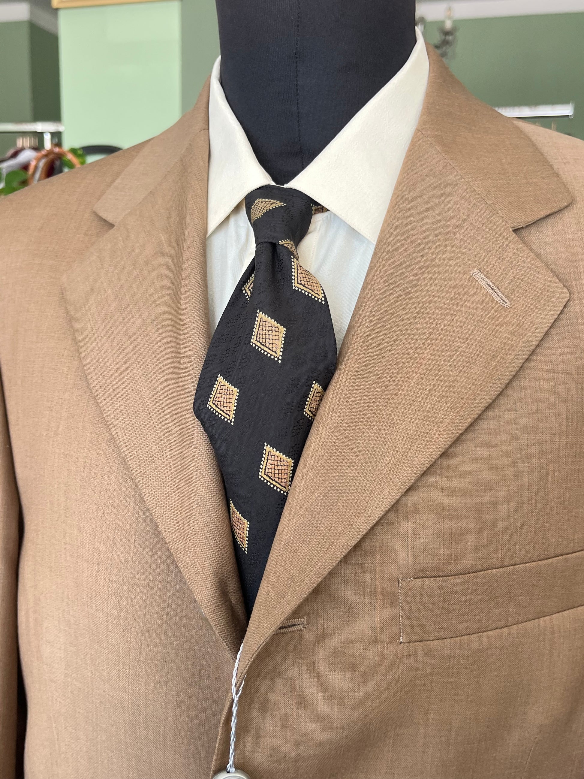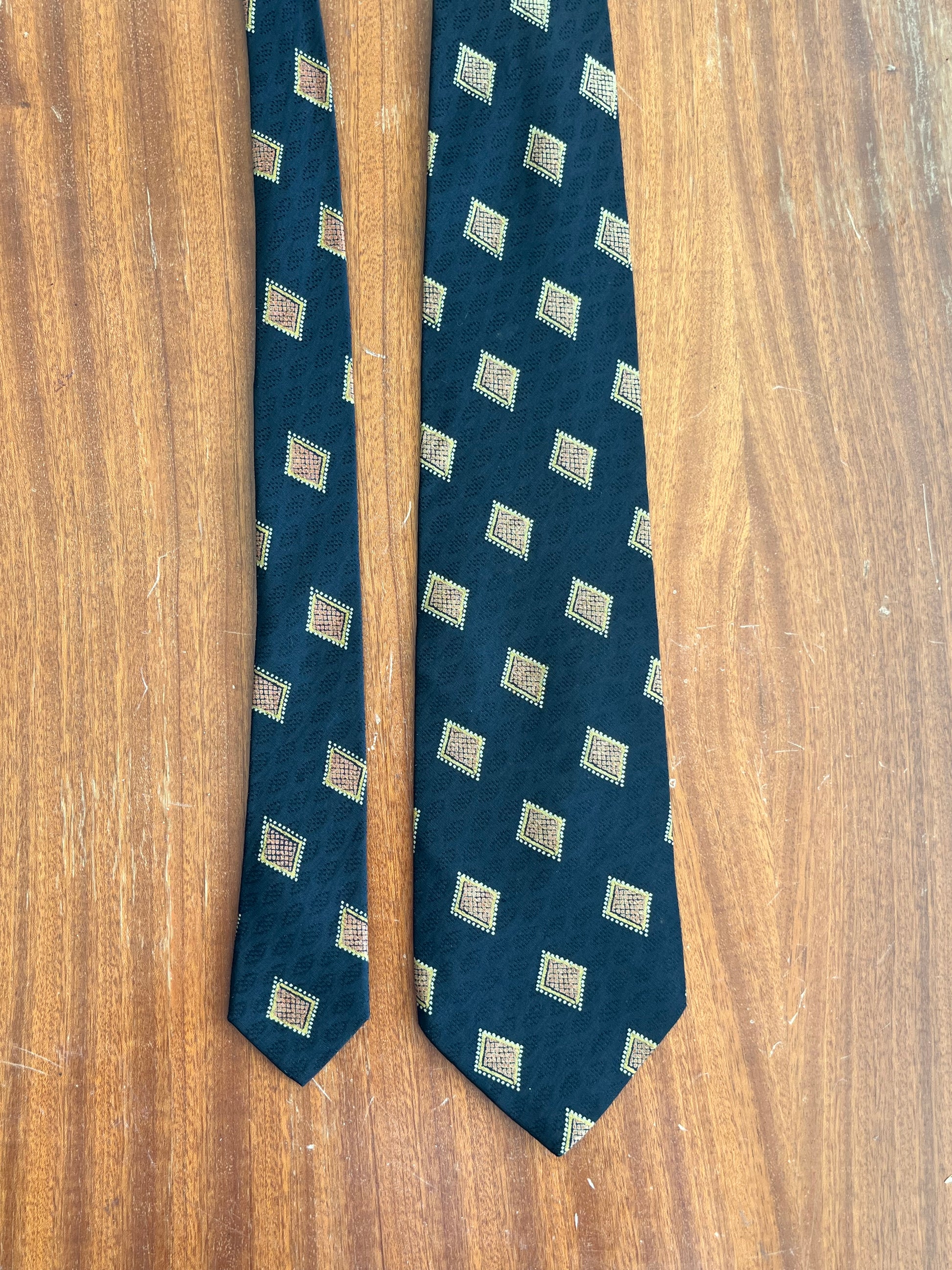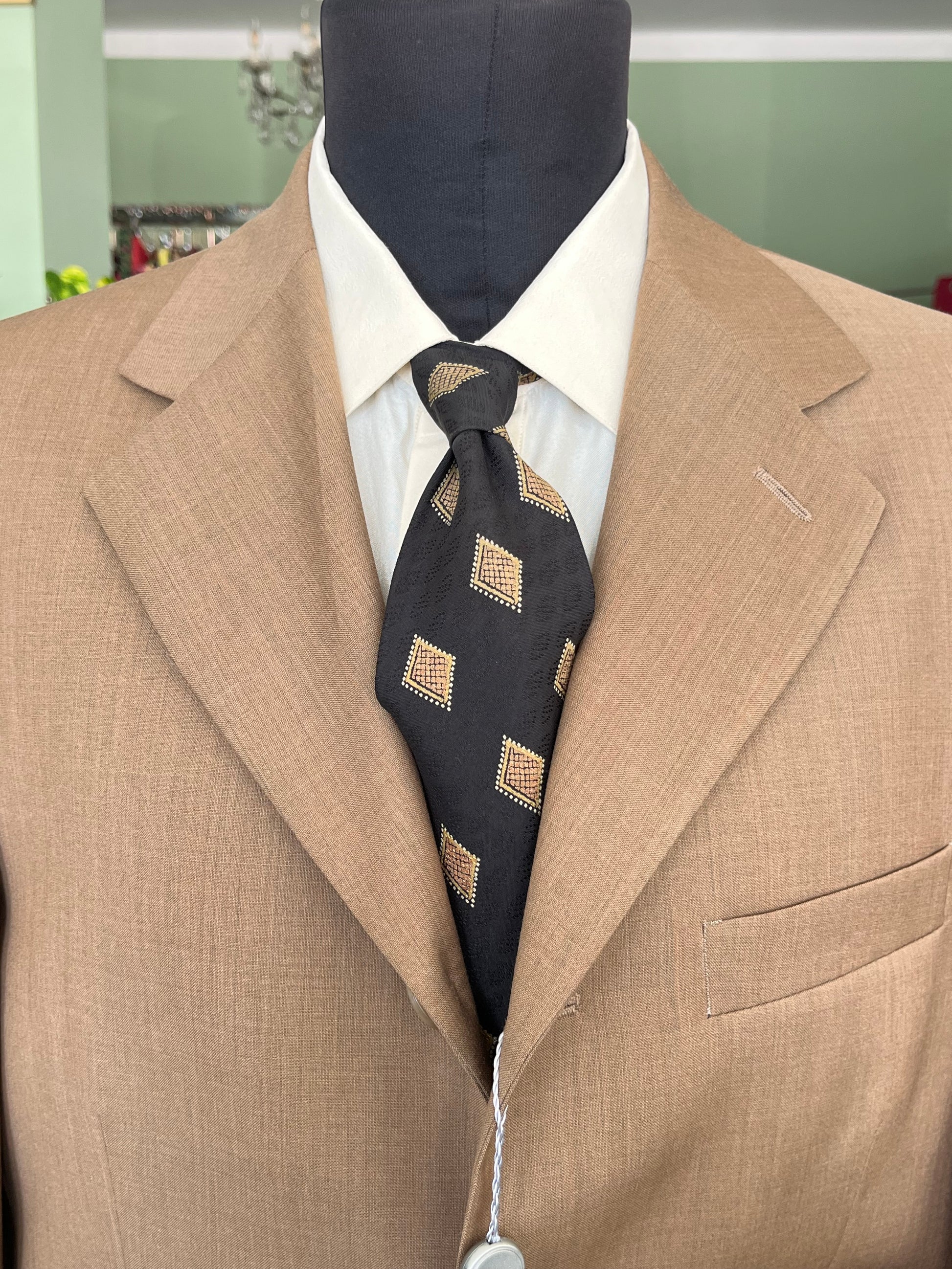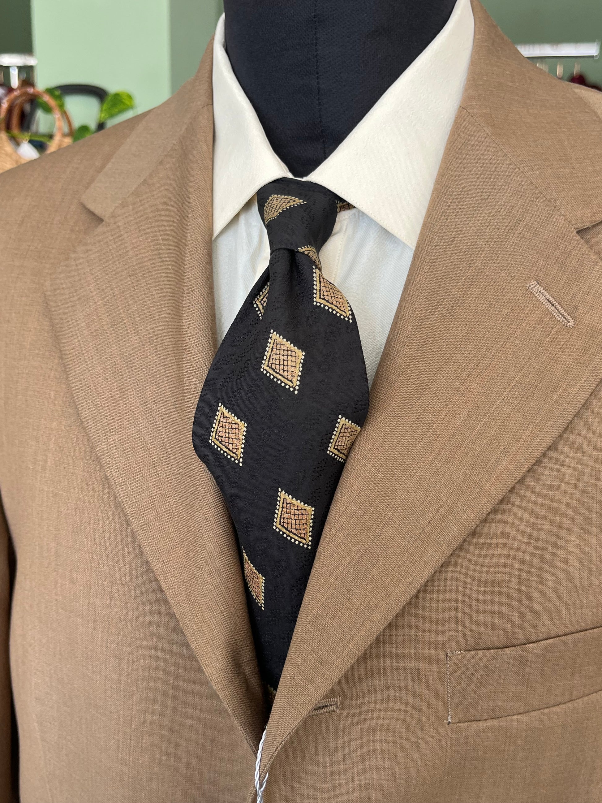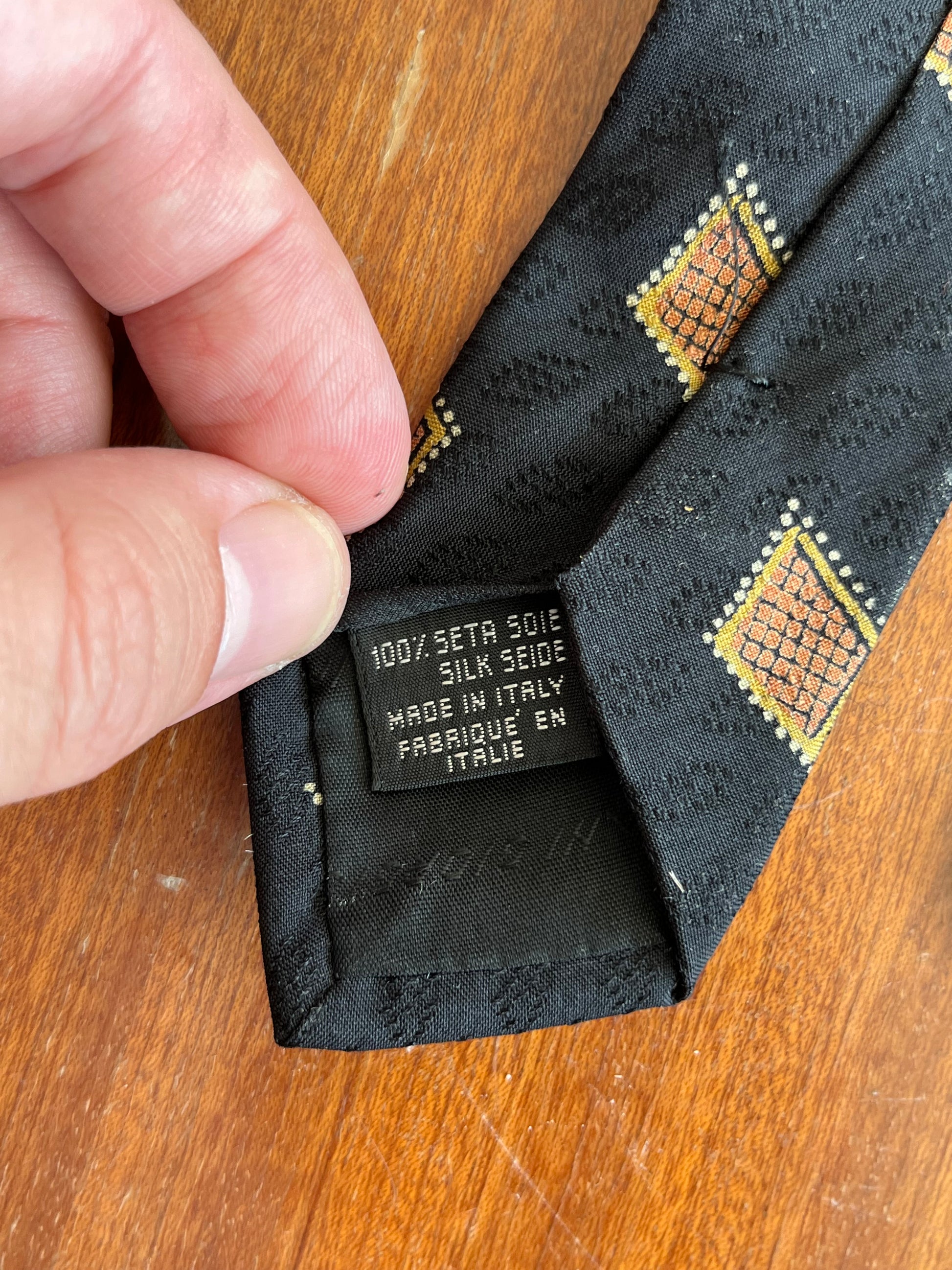 La cravatta presenta una fantasia a rombi sui toni del ruggine e del giallo su sfondo nero.