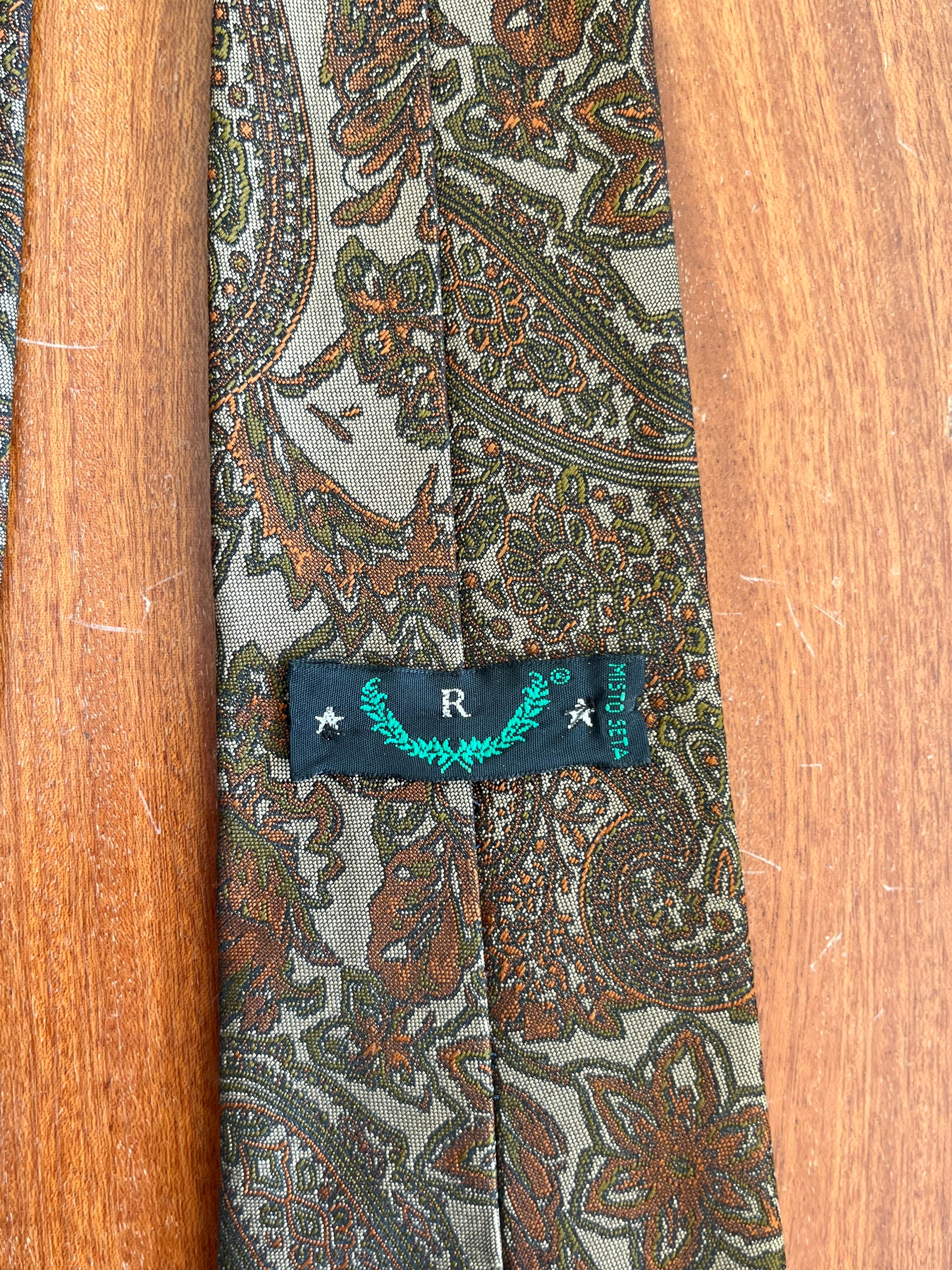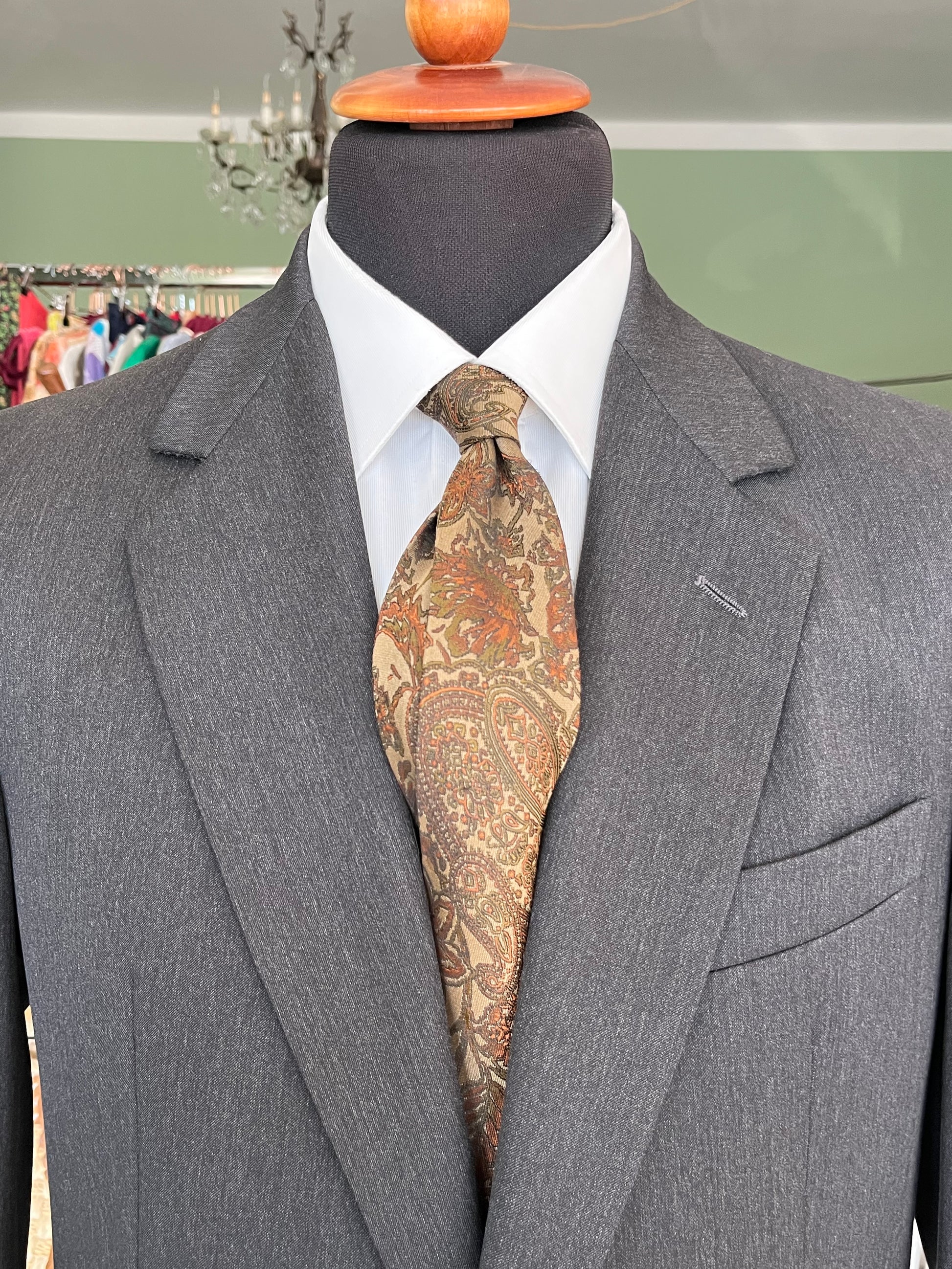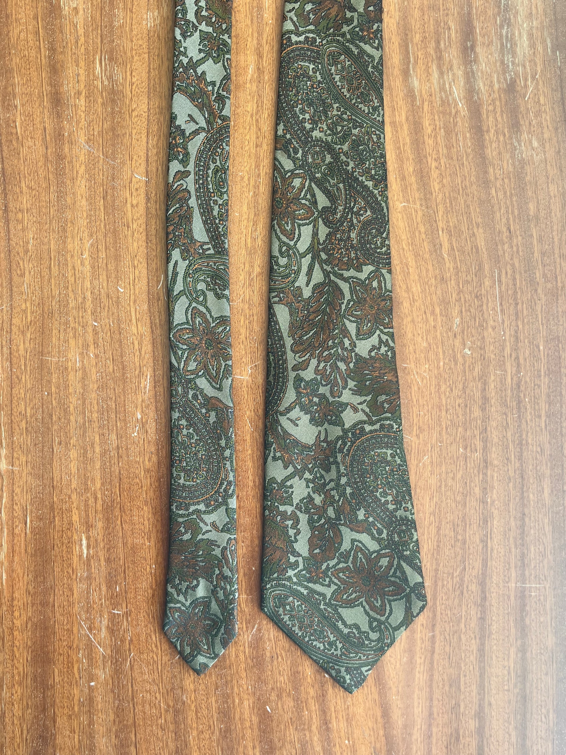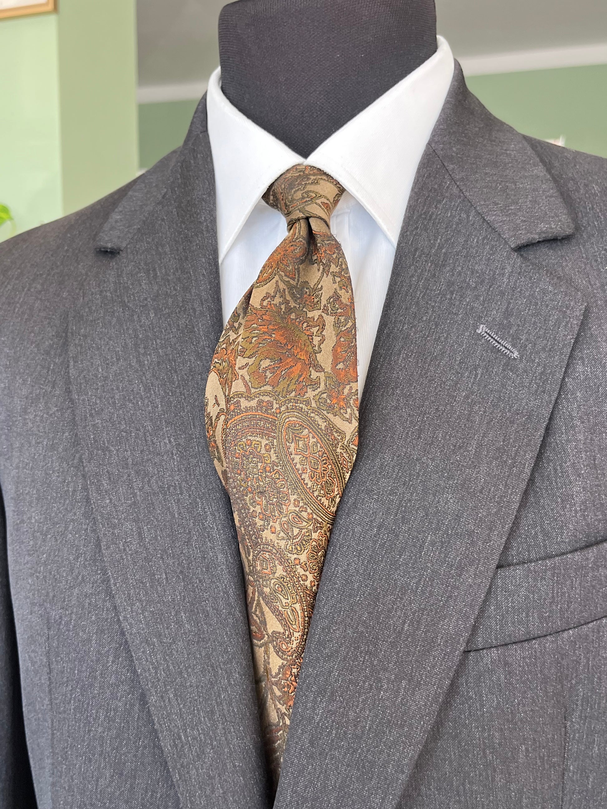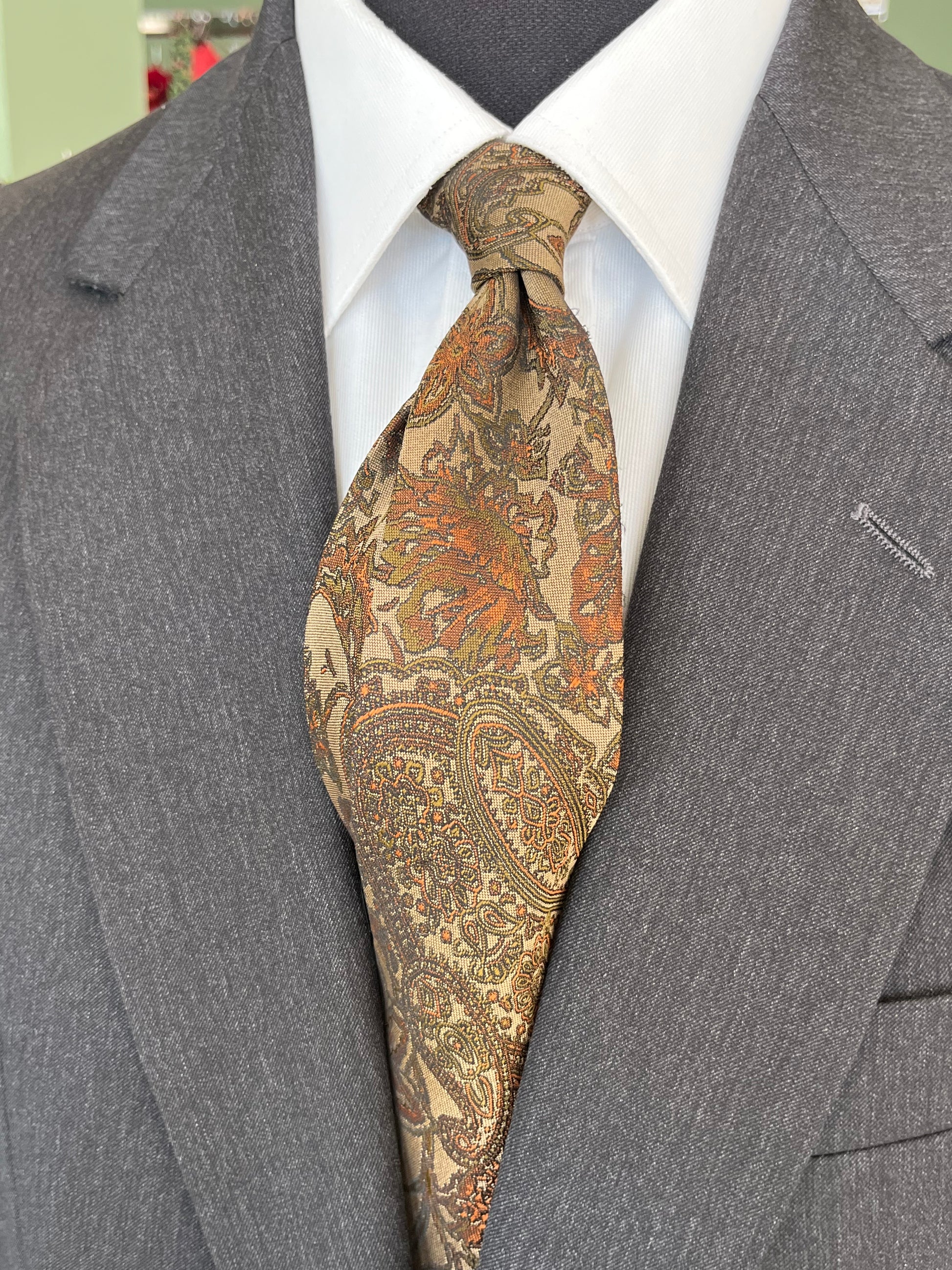 La cravatta presenta una fantasia floreale sui toni del sabbia e marrone.