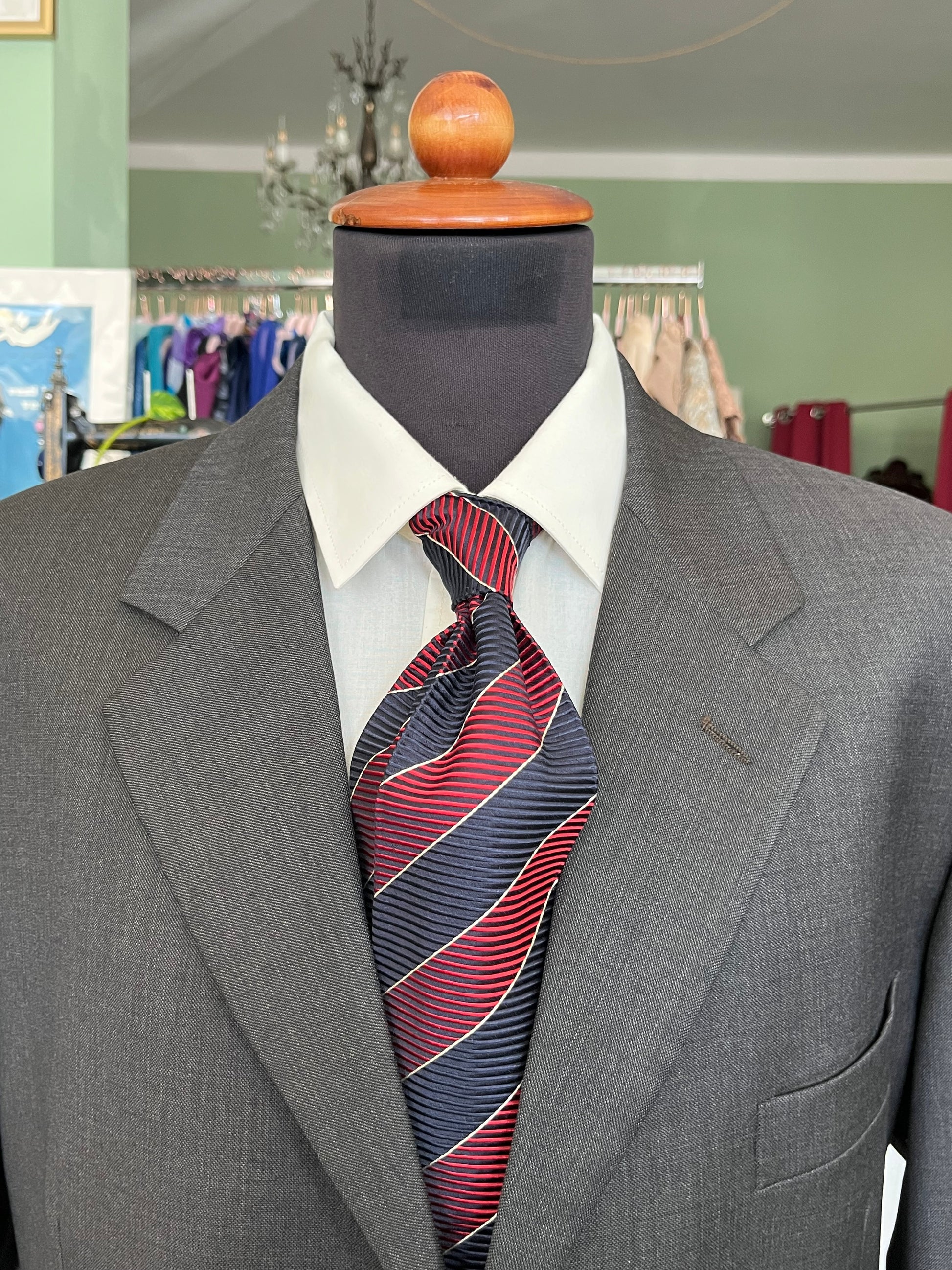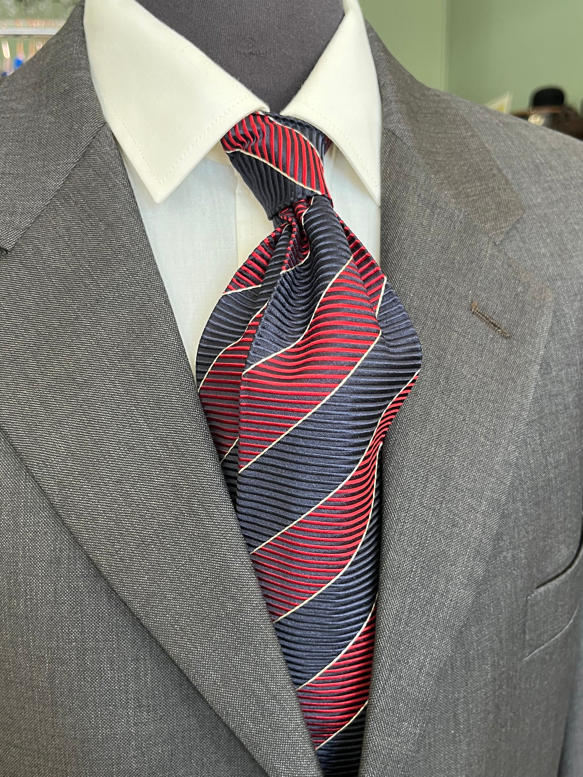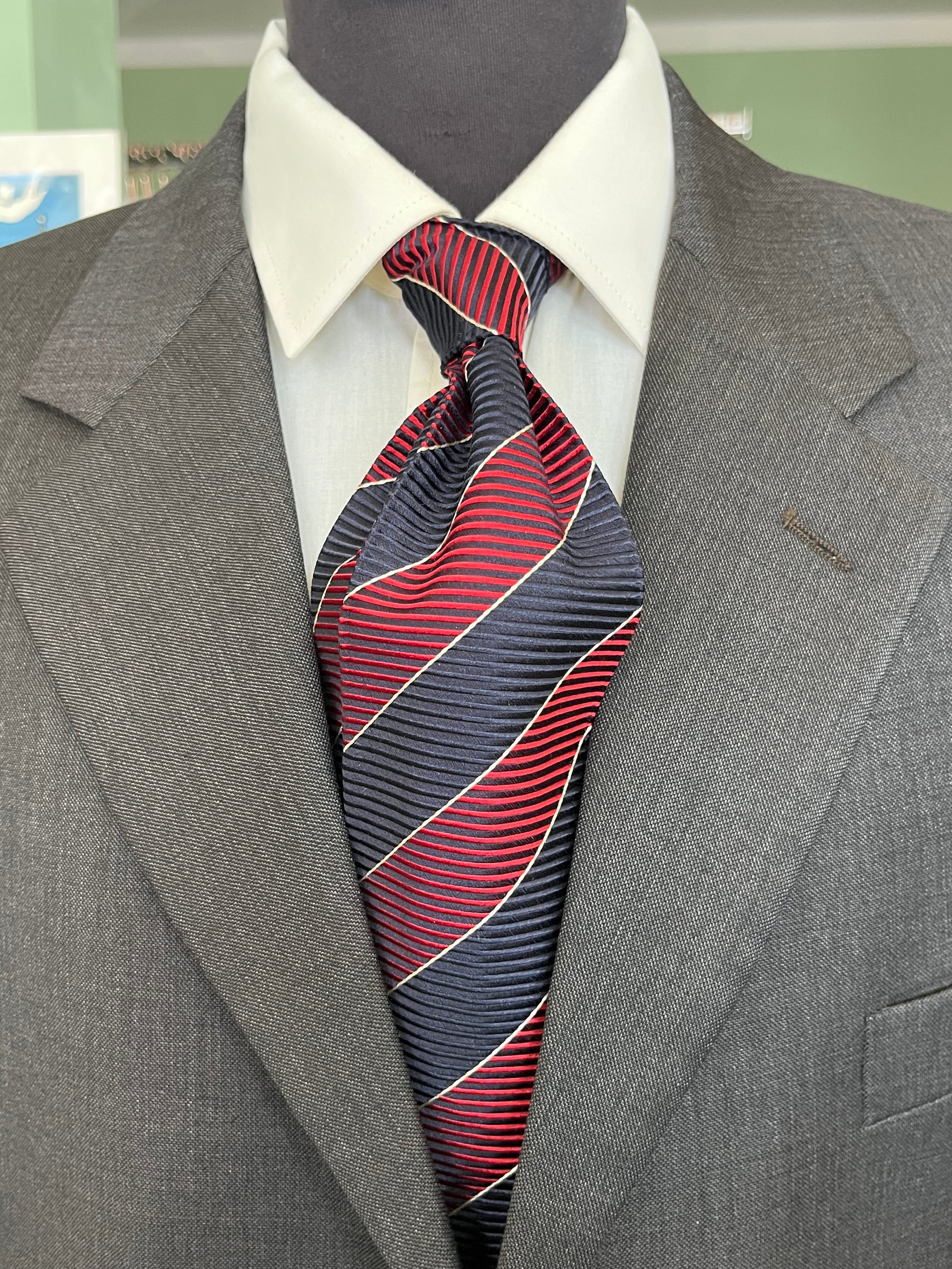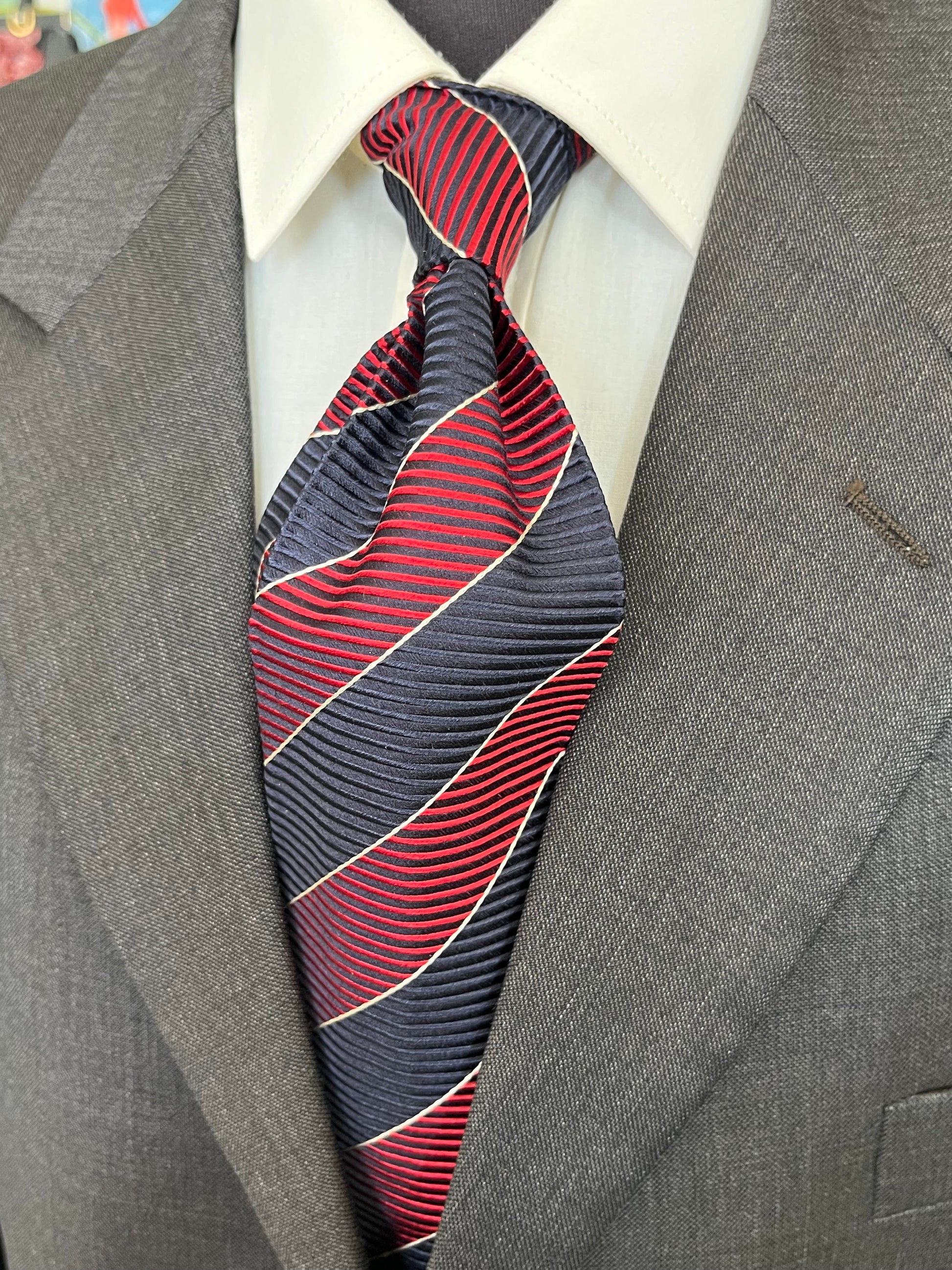 La cravatta presenta una fantasia a righe sui toni del blu e del borgogna.